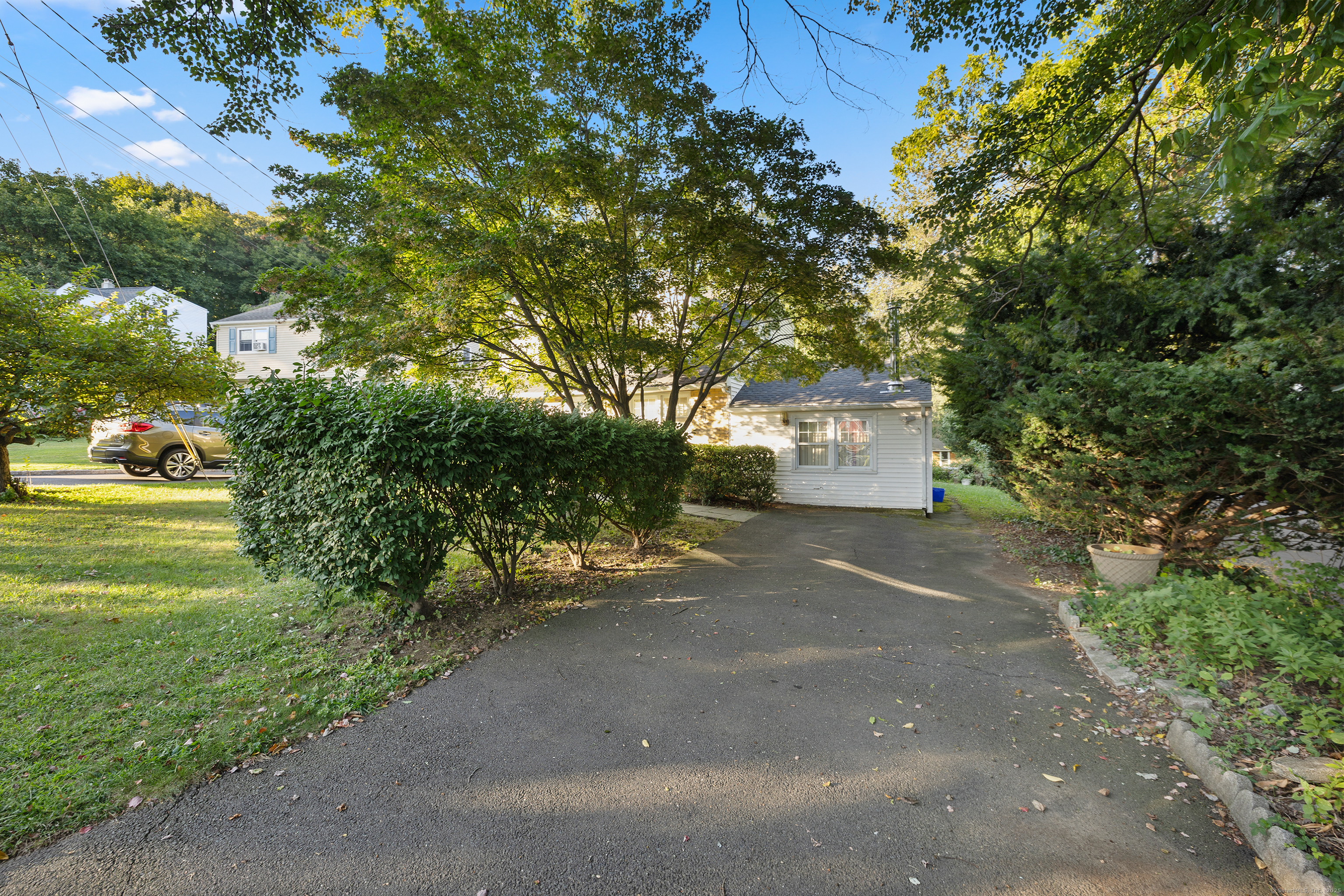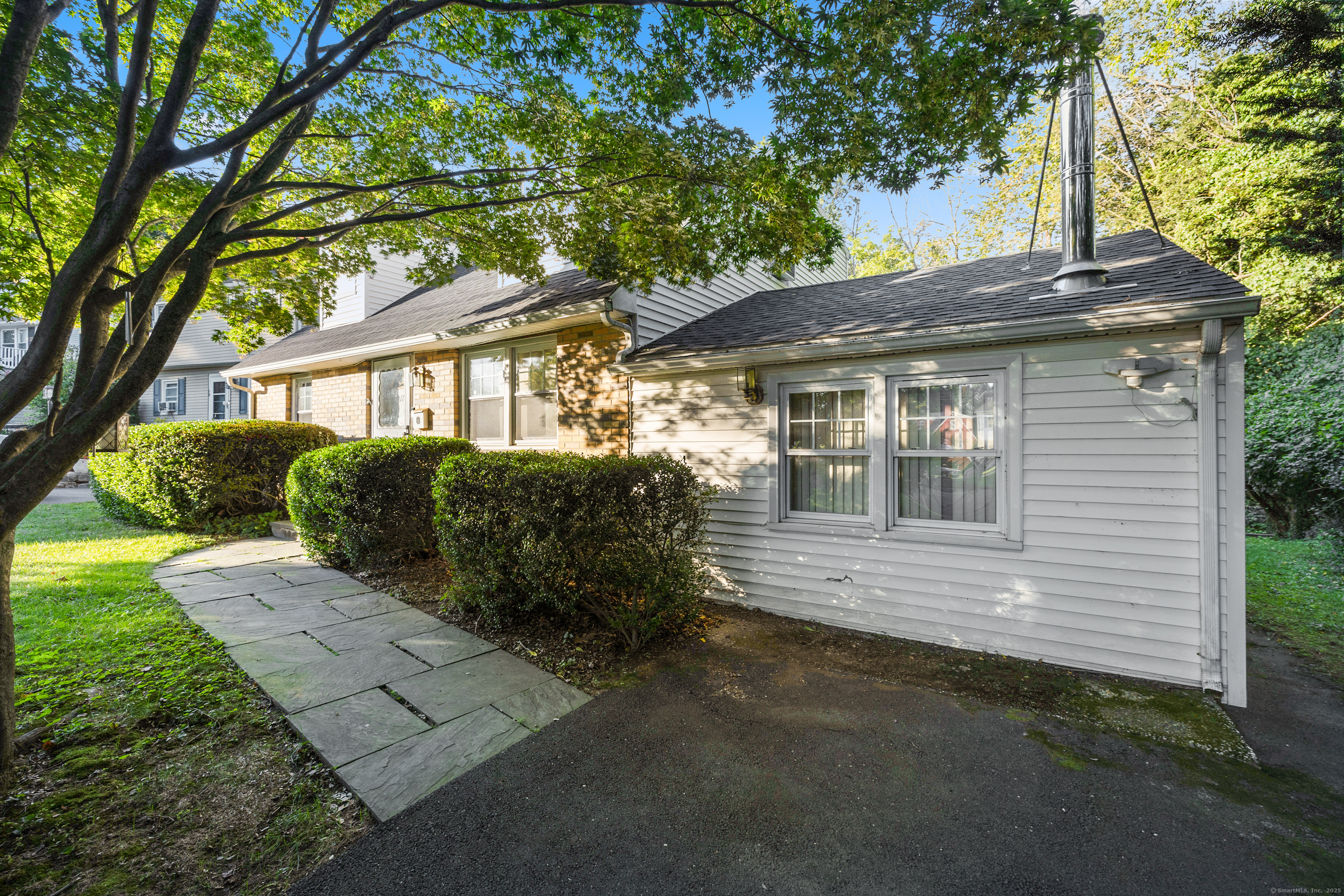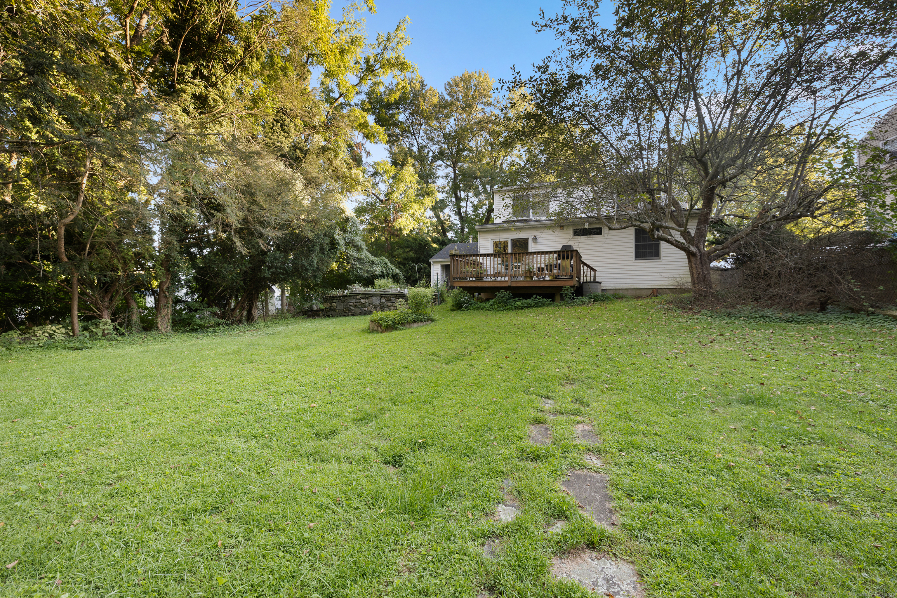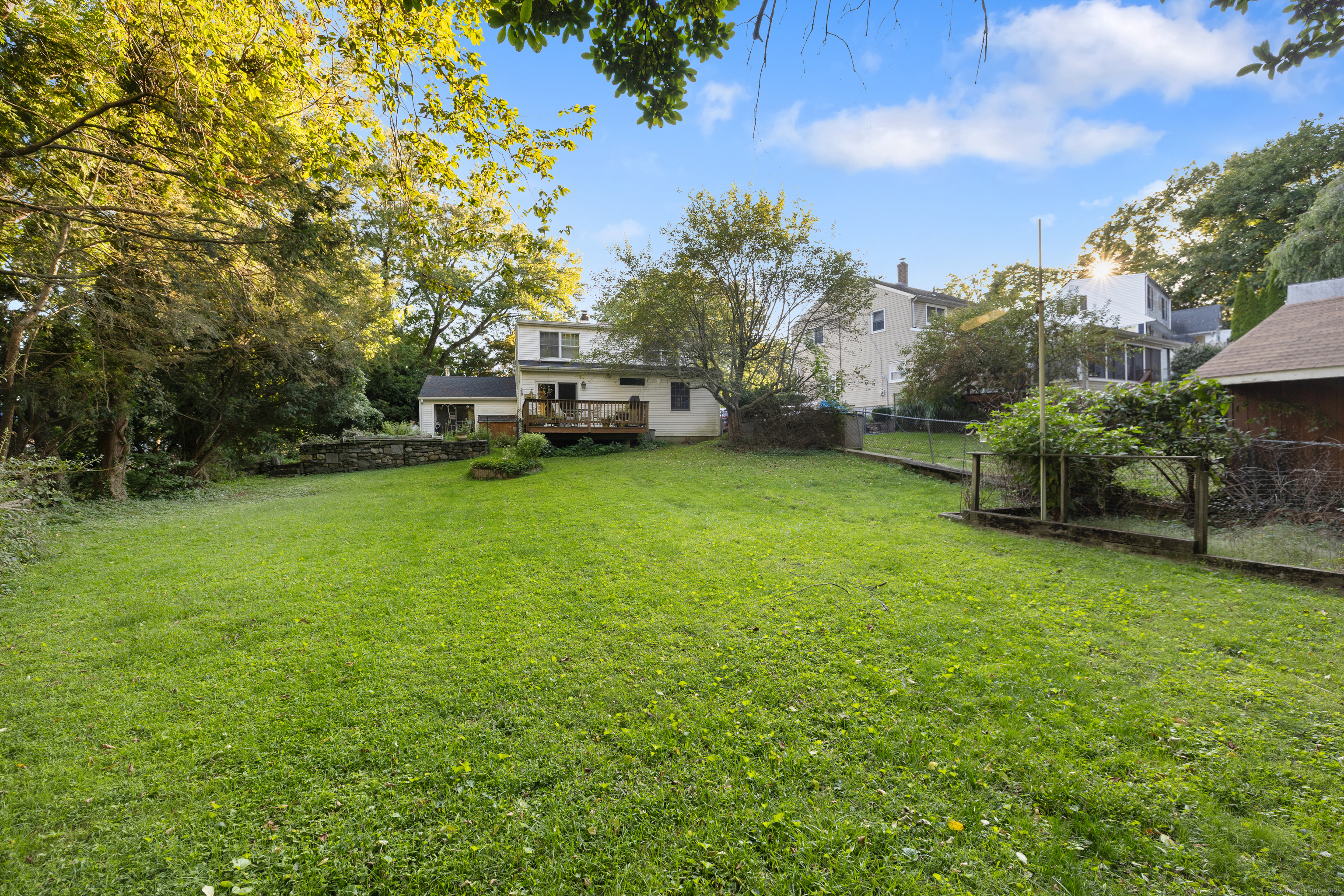 Welcome to your outdoor oasis at 17 Old Barn Road South! This charming Bull's Head Cape offers a serene retreat with exceptional outdoor living space, yet only minutes from all that downtown Stamford has to offer. The three-bedroom home has been lovingly cared for by the same owner for over 50 years. The front yard presents desirable curb appeal with its manicured lawn, mature plantings and location opposite trees & greenery. Step through the front door and into a living room or dining room, depending on one's needs, with a parquet floor and recessed lighting. A step down family room provides a quiet sanctuary with a wood burning stove and sliders overlooking the spacious backyard. The kitchen features a terra-cotta tile floor, all stainless-steel appliances, loads of counter space, a large skylight and plenty of room for a kitchen table or breakfast nook set. Sliders to the wooden deck provide a lovely view of the backyard and mature McIntosh apple tree. The convenience of a newer washer & dryer, tucked away behind bi-fold doors, completes the kitchen. The main level primary bedroom is large and boasts an ensuite bath, hardwood floor and ample closet space. There's also an additional room, which could serve as a possible guest bedroom or home office. A second full bath completes the main level floor plan. Ascend the carpeted staircase, and there's another full bath, with bedrooms on either side, both featuring hardwood floors, providing both privacy and convenience.