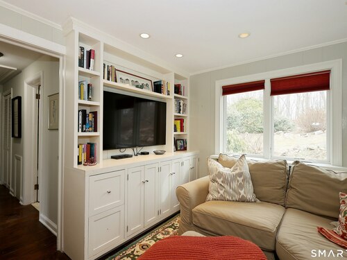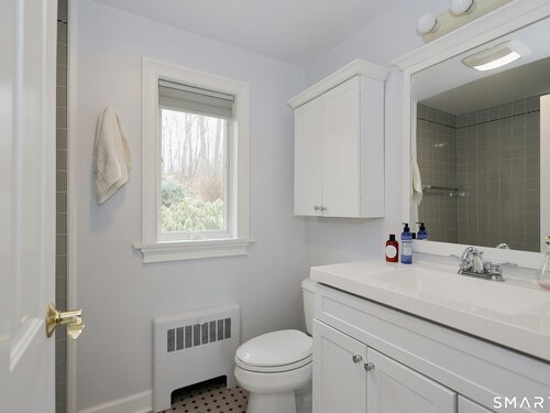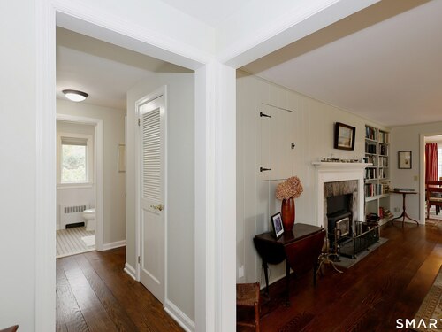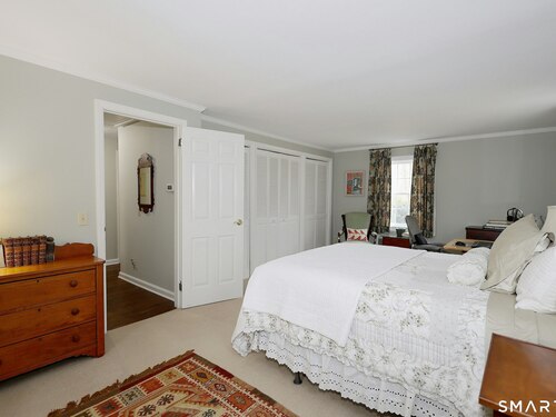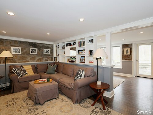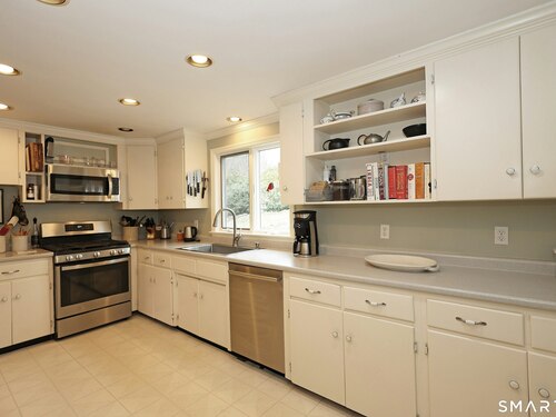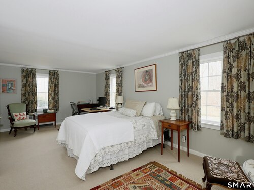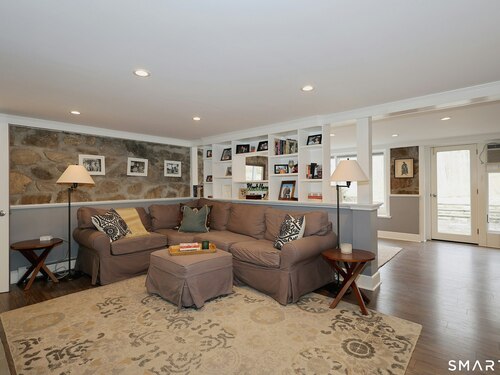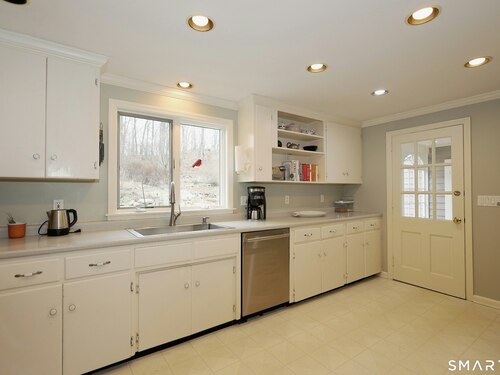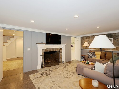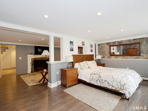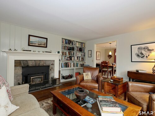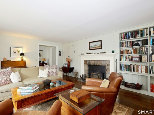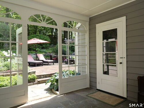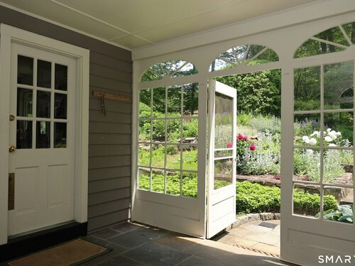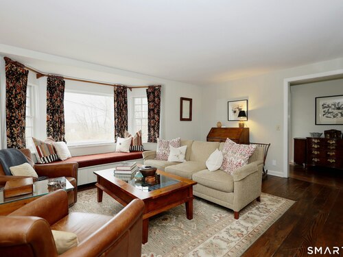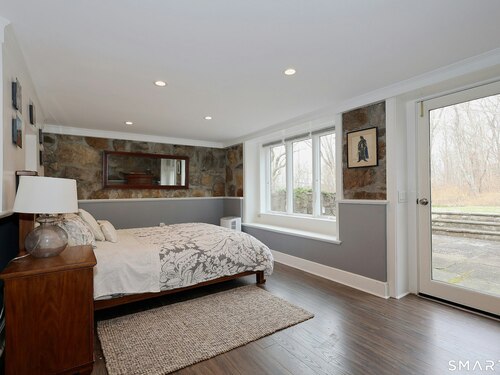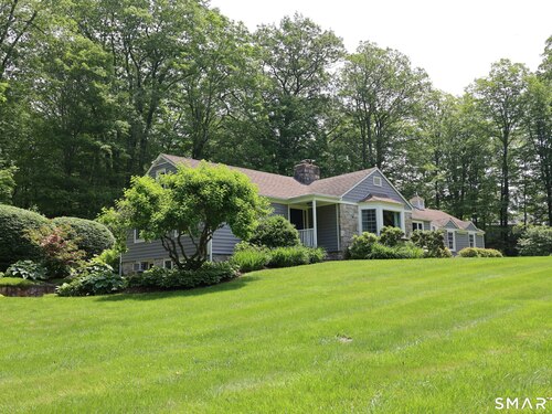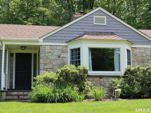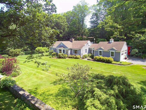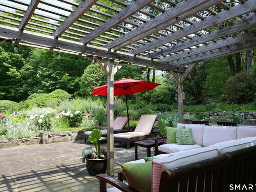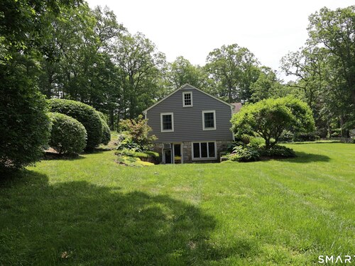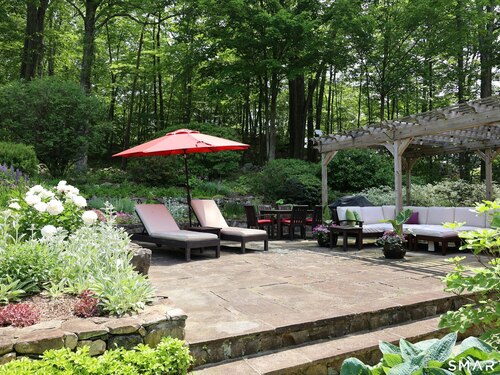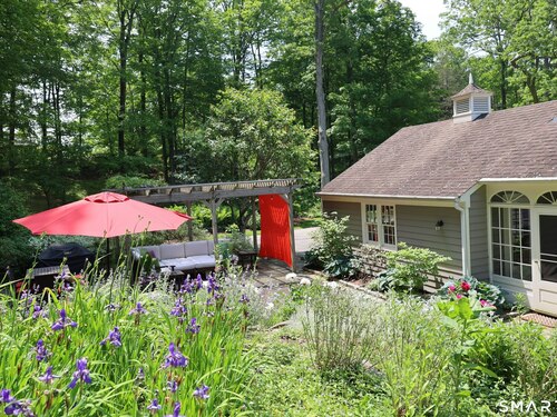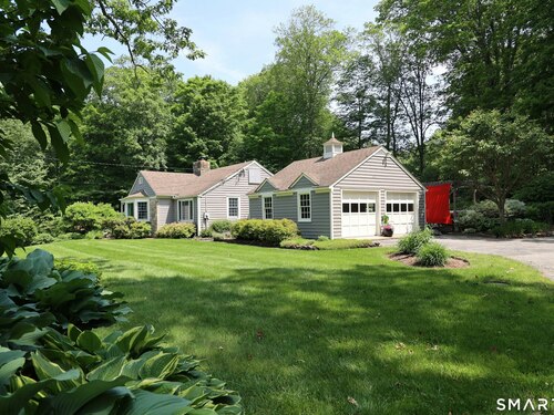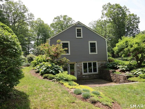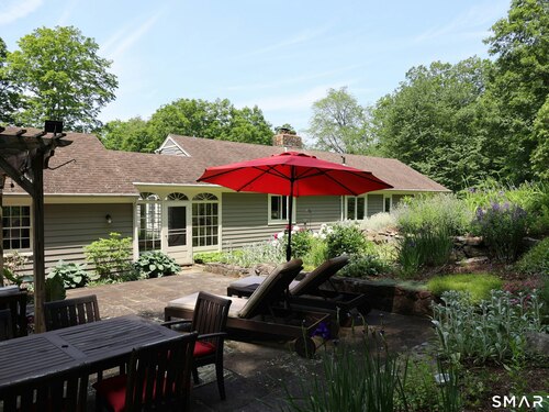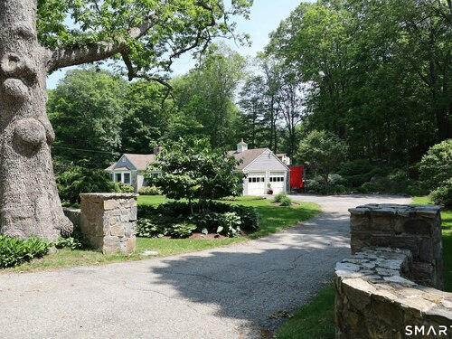 Casually elegant stone & clapboard ranch on stunning property in most desirable West Redding. Park-like setting w/extensive flowering gardens, specimen trees, stone walls, stone patios, & inviting covered pergola seating area. This sophisticated home beckons w/glass breezeway between the 2 car garage w/cheery cupola & the main home w/fieldstone foundation, chimney, & cladding. Generous proportions & open flow including 1,373 sf on the main level plus 735 sf in the walk-out lower level w/total 2-3 BRs & 2 full baths. The heart of this home is the large living room w/custom built-ins & stone fireplace w/wood burning stove insert. The DR, open from the LR for ease of entertaining, features wide board floors & custom built-in shelving/lower cabinets flanking a large picture window. The main floor also features the bright white kitchen w/open shelves, S/S appliances, pantry & views to the stone patio/gardens. The bedroom wing offers one large BR w/multiple closets; 2nd BR w/built-in shelving, currently used as a den; plus the hall bath w/updated vanity & tub/shower. The walk-out lower level has been completely updated to create flexible living space including a family room w/2nd fieldstone fireplace; optional primary suite or guest bedroom w/French door to the stone patio; & full bath featuring glass basin sink & deep soaking tub. Many updates including exterior repainted & brand new roof (2025). Top location in sought after Redding, the "VT of CT," yet just 61 miles to Midtown.