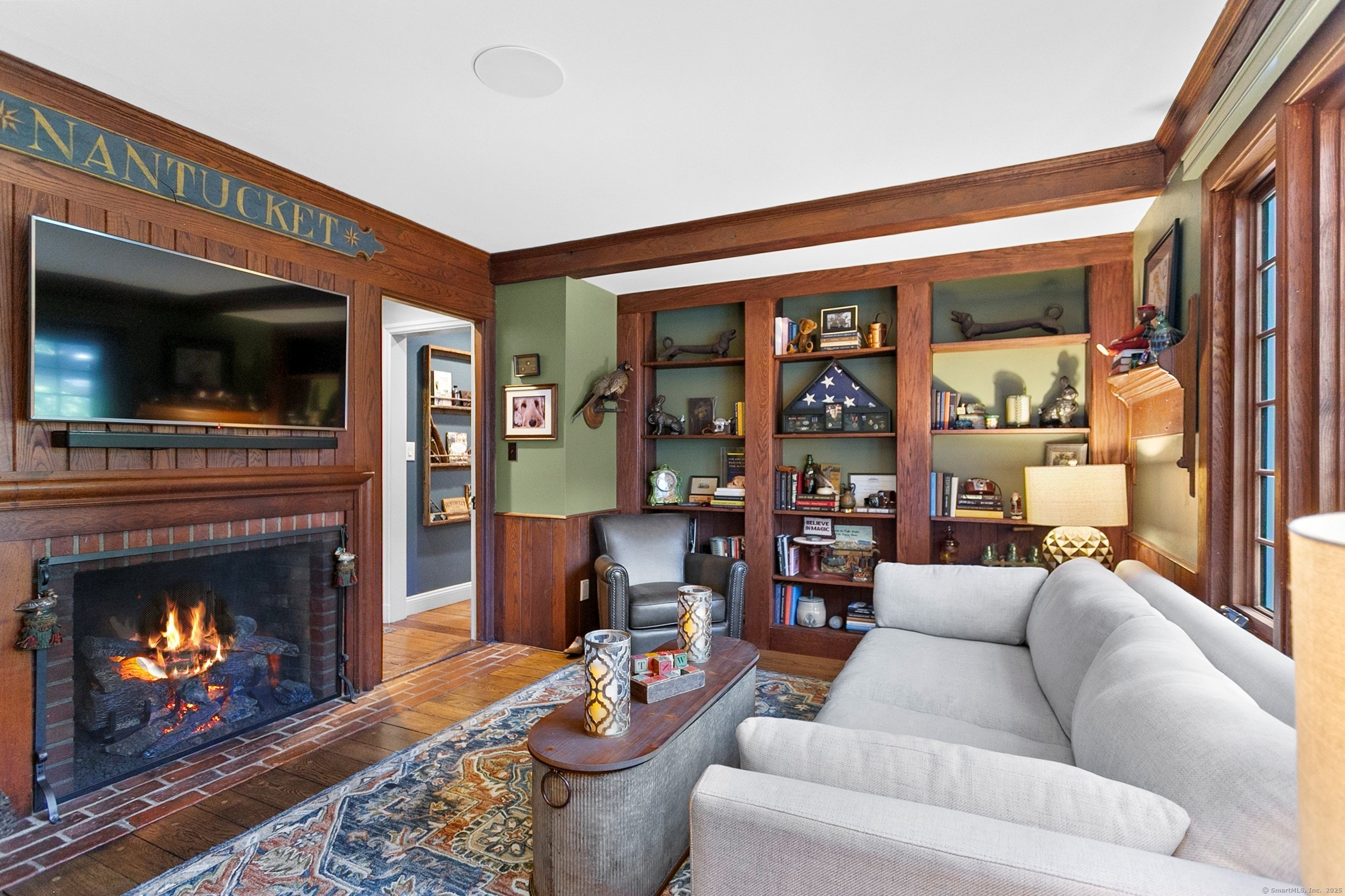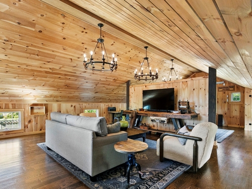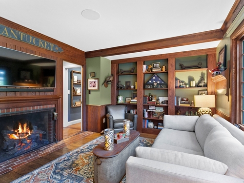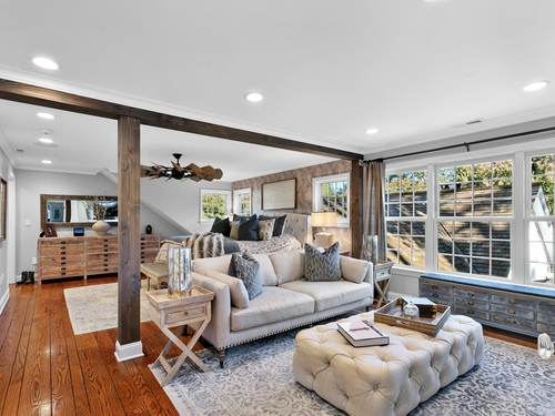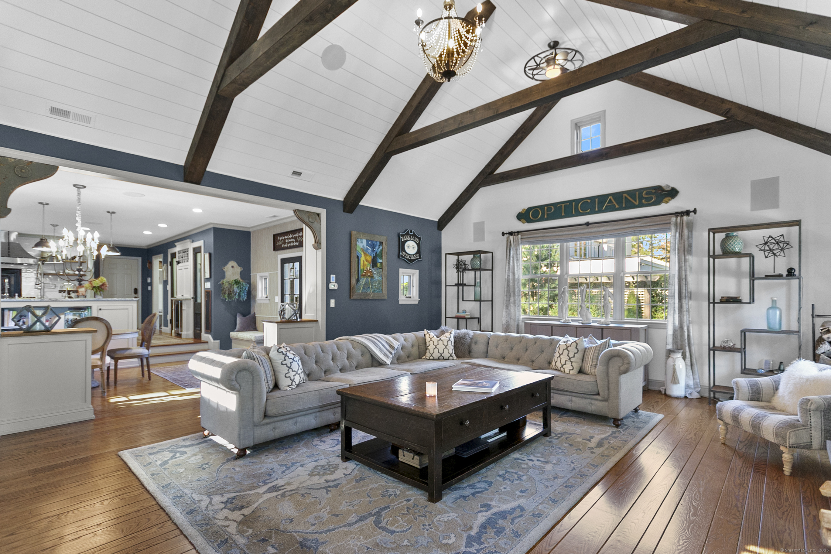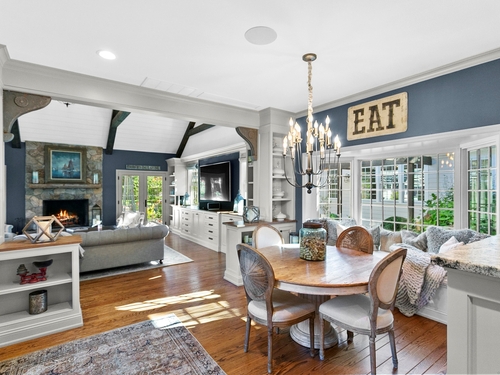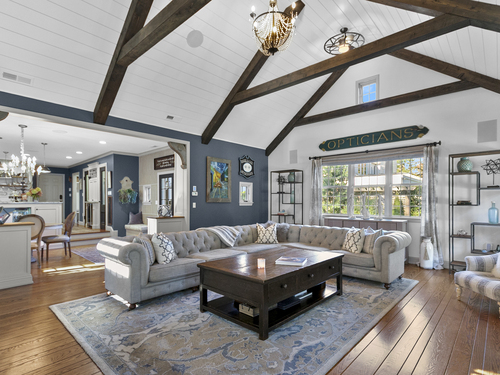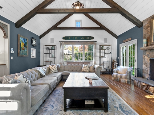 Vaulted Ceiling, Beams, Built-Ins, Fireplace, Hardwood Floor
