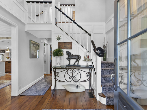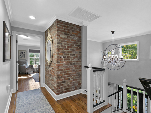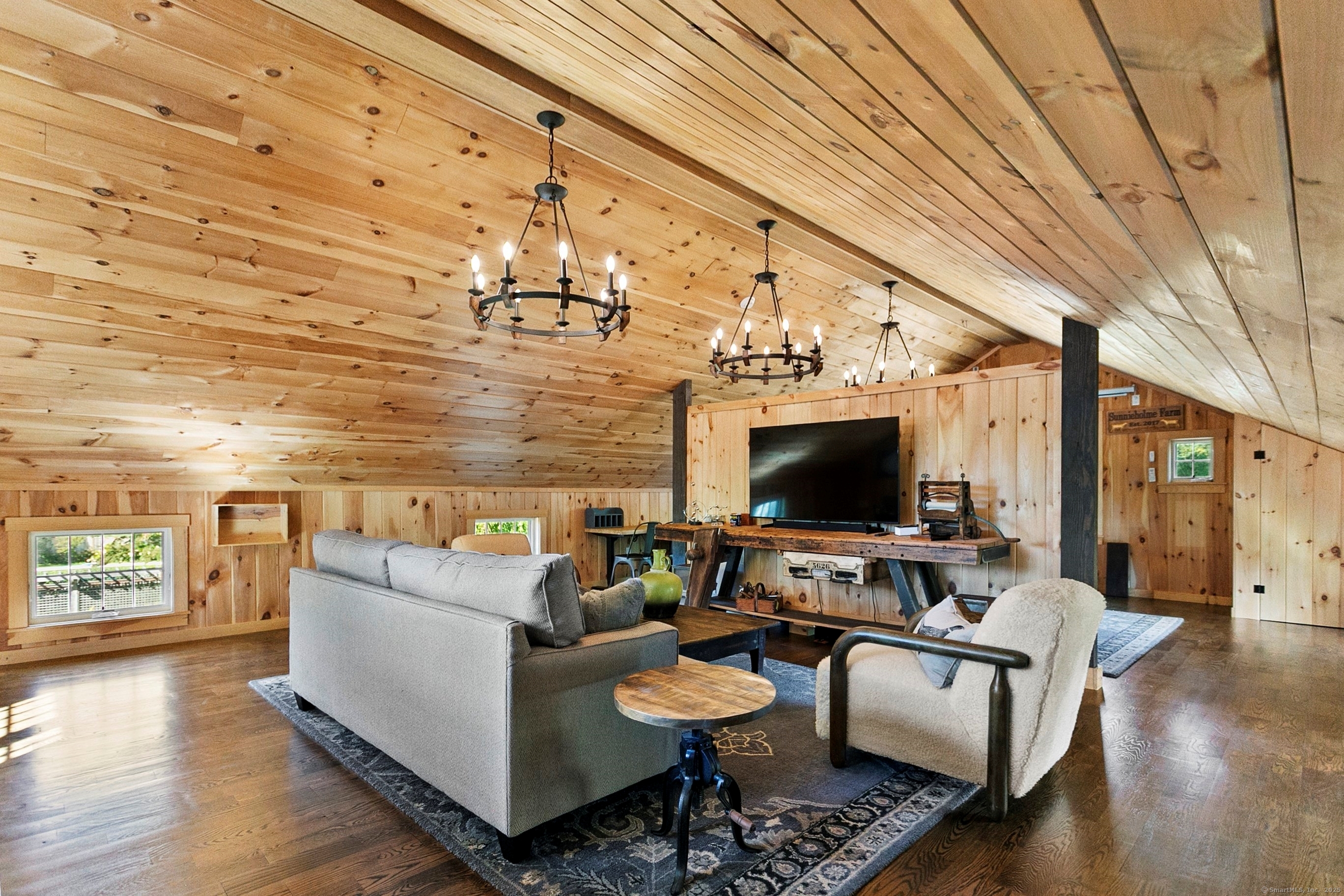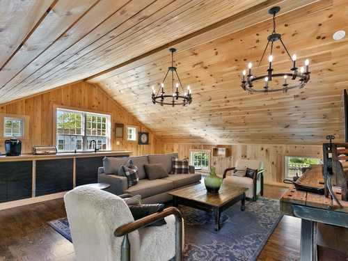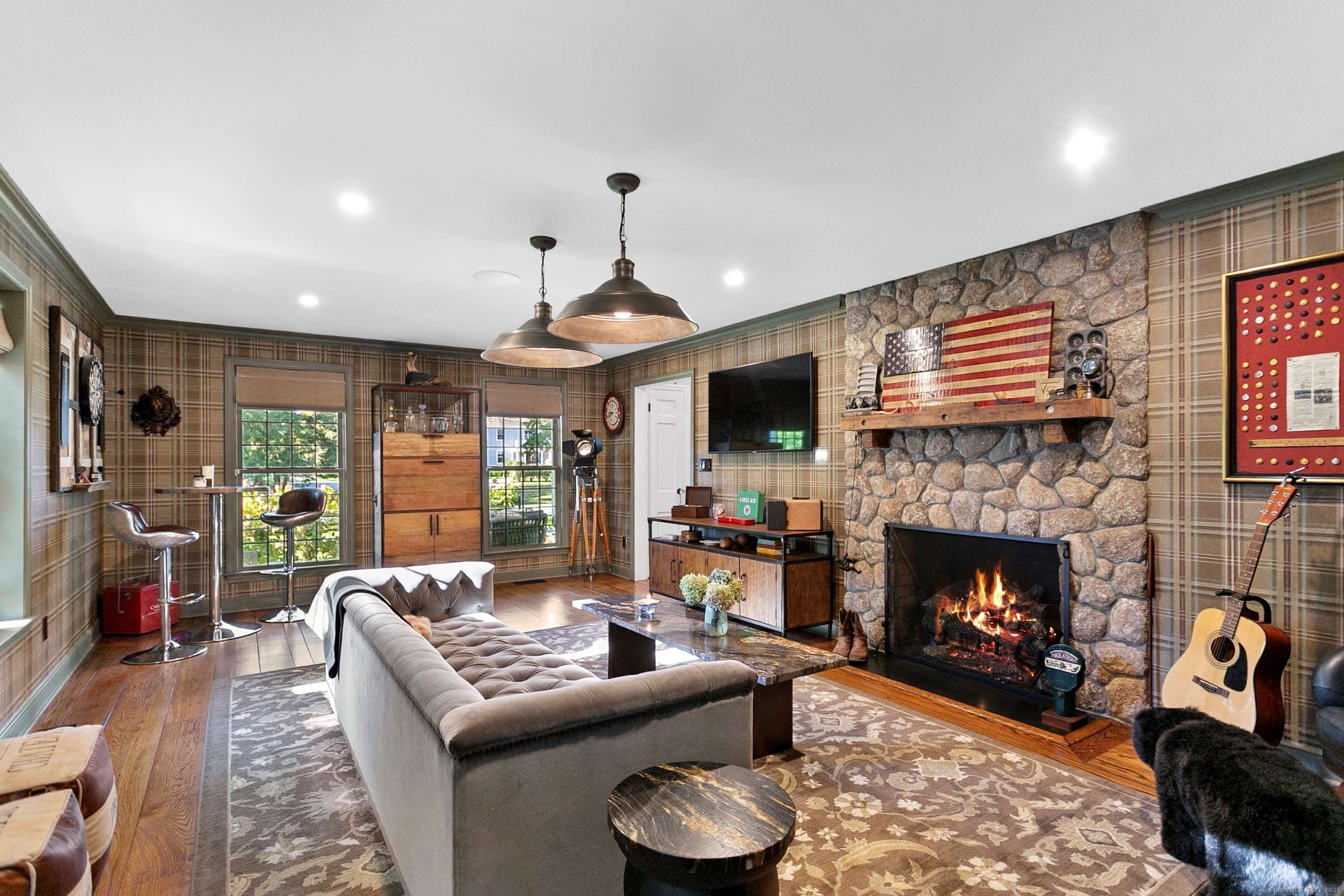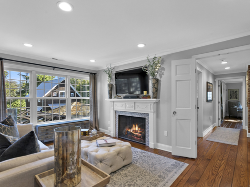Vaulted Ceiling, Beams, Built-Ins, Fireplace, Hardwood Floor