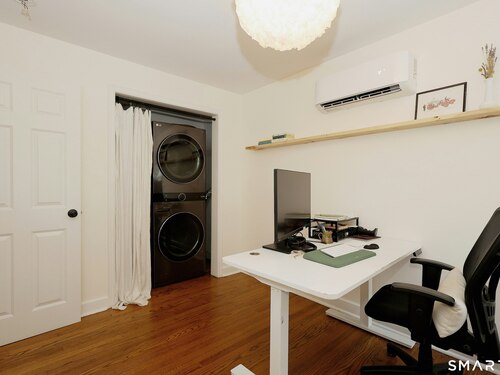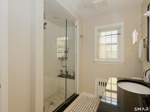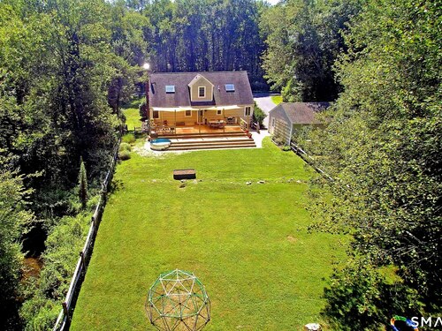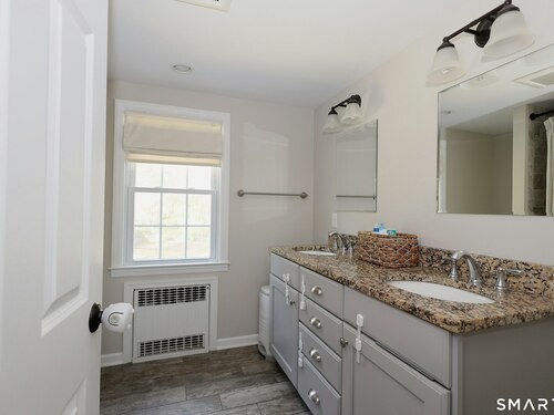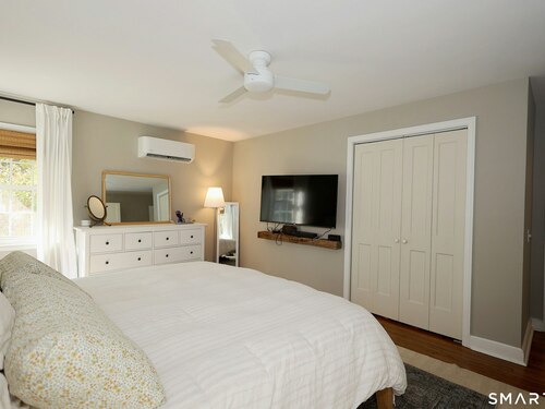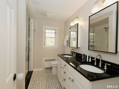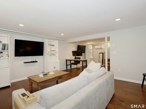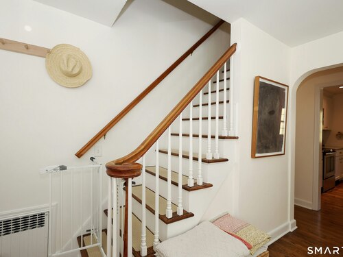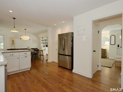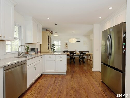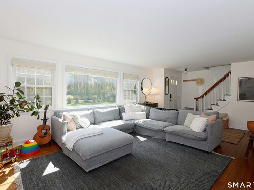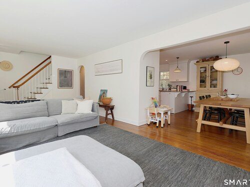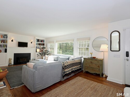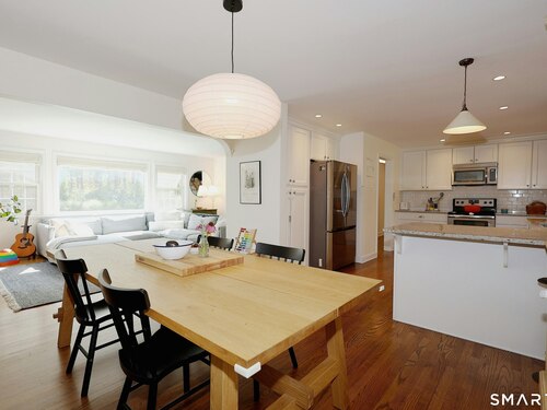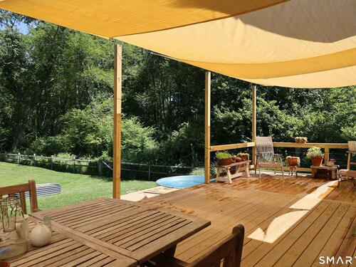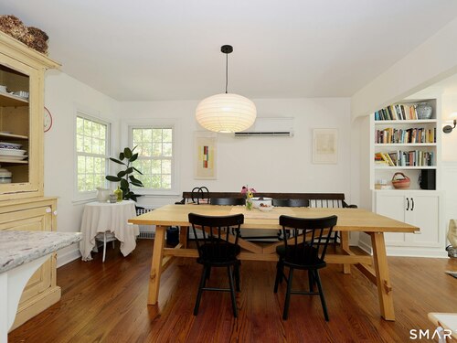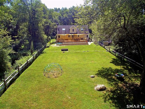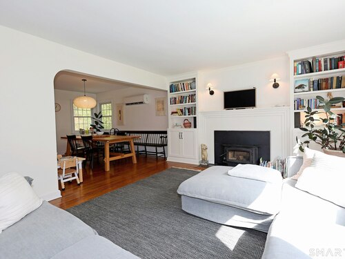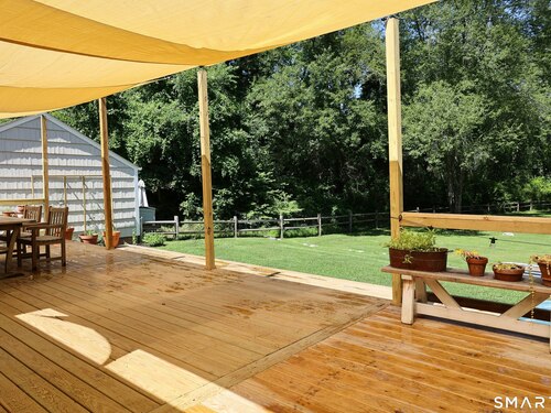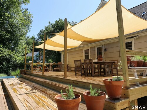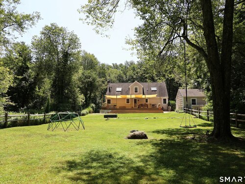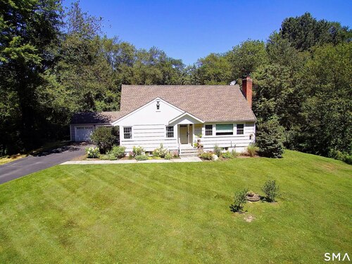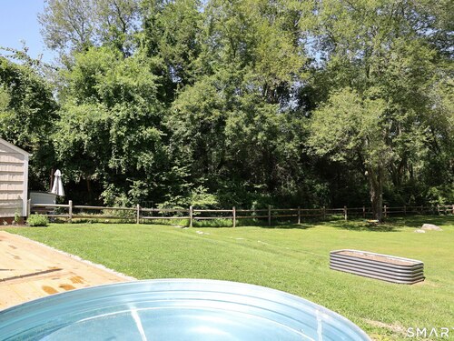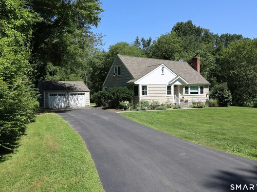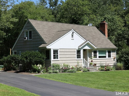 Idyllic country cape on picture perfect level lot, set back privately with fenced in backyard, new spacious deck for entertaining, plus built-in wading pool for summer fun. Perfection inside & out with updated kitchen, baths, hardwood floors, charming arched doorways, & modern open flow. The spacious living room features an inviting fireplace with woodstove insert plus elegant wood surround flanked by wall of custom built-in bookshelves with lower cabinetry. The dining room is wide open to both the living room & the inviting remodeled kitchen with sparkling white cabinets, subway tiled backsplash, granite counters, & S/S appliances. This home is drenched in natural light from the oversized windows & offers flexible living space with total 2,315 sf, 4 bedrooms, 2 full baths & 3 finished levels. Enjoy primary bedroom options on either the main or 2nd floor, each floor with gorgeous updated baths featuring double vanities. The lower level provides more room to spread out with options for family/media room & private home office. Many recent improvements include: new deck with removable awning; extensive landscaping including split rail fence; ductless mini splits for cooling/secondary heating option; new wood stove insert; custom built-ins; & more. Enjoy historic Newtown, known for its blend of small-town charm, New England character, and convenient location near NYC, offering picturesque rolling hills, a vibrant Main St., & historical landmarks like the iconic flagpole. Special!