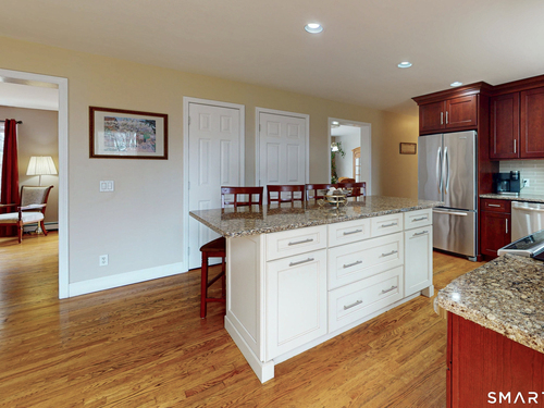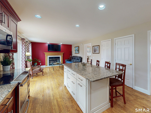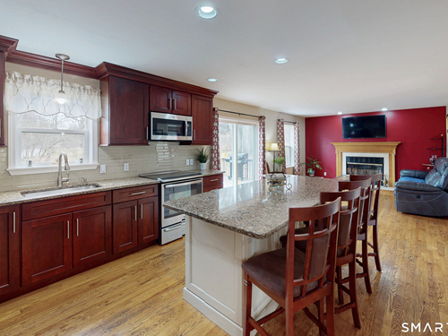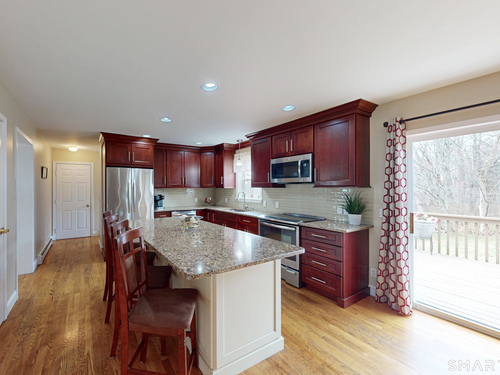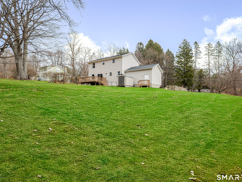 Welcome to this stunning, move-in-ready 3-bedroom, 2.5-bath Colonial, perfectly situated on Danbury's premier West-side. This home offers incredible curb appeal with its wide paved driveway, newer architectural roof and extensive stone wall. Inside features an updated open floor plan with gleaming hardwood floors and natural light. The heart of the home is the eat-in kitchen, boasting solid cherry cabinetry, quartz countertops, a center island, and a stylish tile backsplash complemented by stainless steel appliances. The kitchen flows seamlessly into the family room featuring a cozy gas fireplace or step through the sliders to a sprawling deck which overlooks a private, level backyard with mature trees-perfect for summer barbecues-and includes a shed for extra storage. The spacious formal living and dining rooms are perfect for entertaining guests in style anytime. The upper level continues the hardwood flooring and every bathroom in the home has been tastefully updated, ensuring a modern feel throughout. The primary bedroom hosts double walk-in closets and a full luxury bath complete with double sinks and contemporary finishes. Two additional guest bedrooms are well-appointed with ample closet space and share a full bath. For those needing more space, the lower level offers a large area ideal for a home gym, private office, or a recreation room. Close to NY line, Richter Park golf course, shopping and fine dining, and city water. Perfect place to enjoy your life.