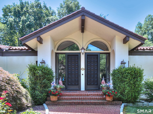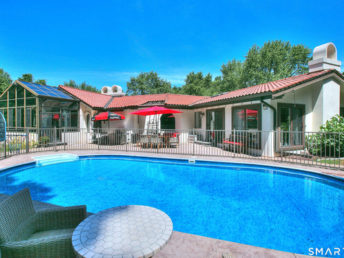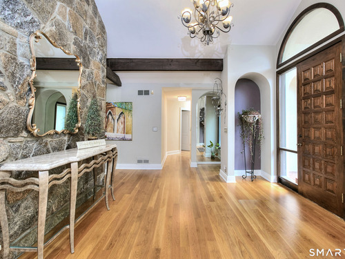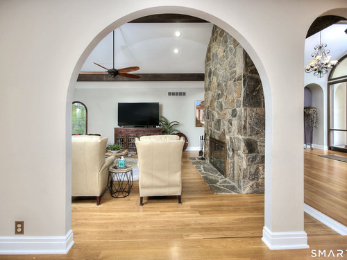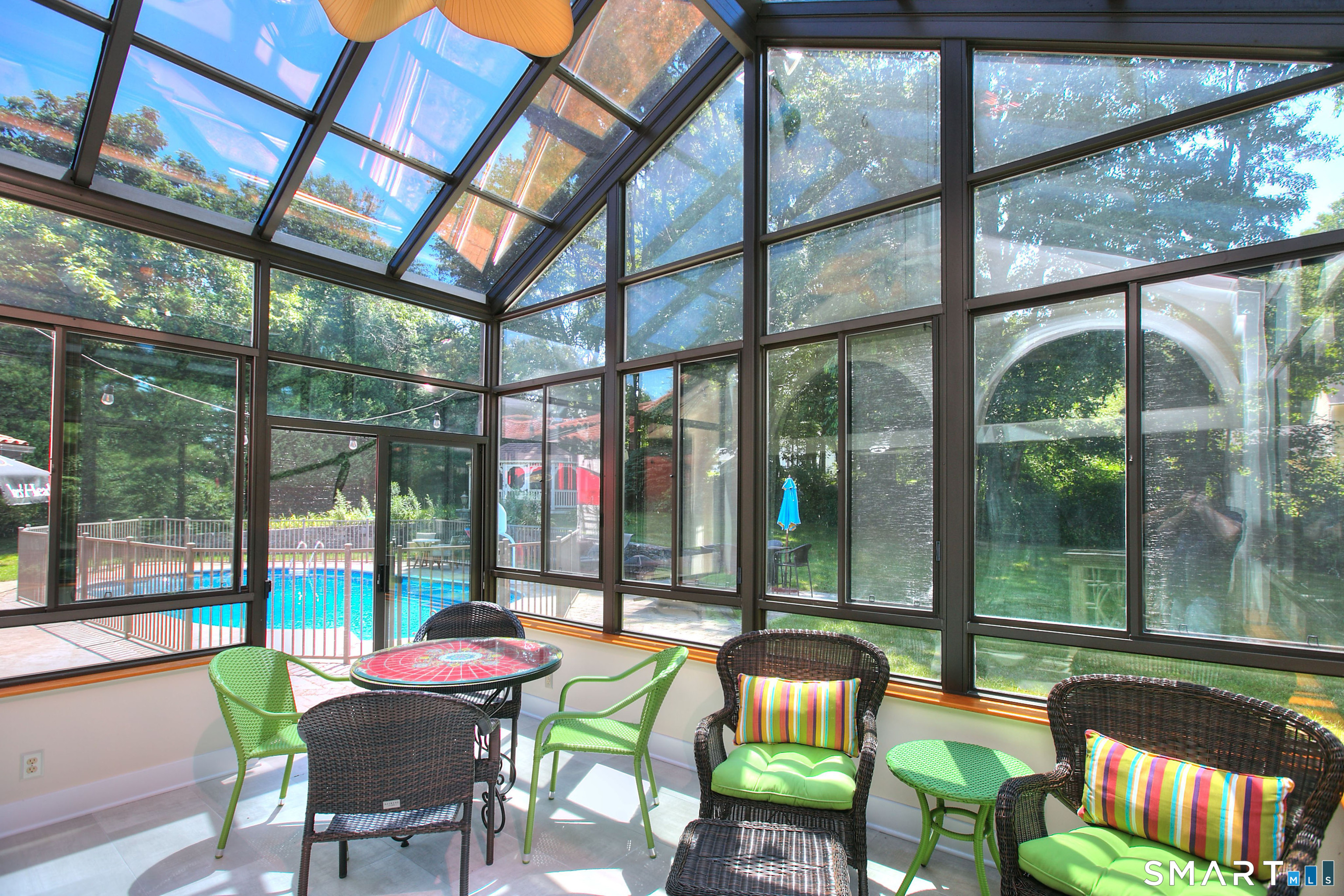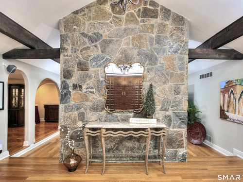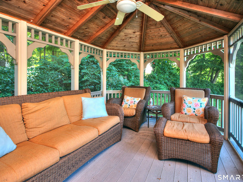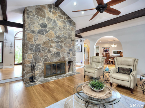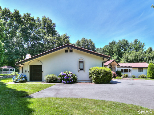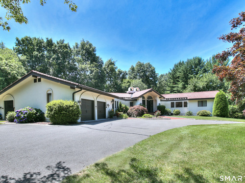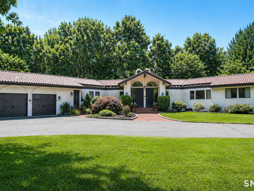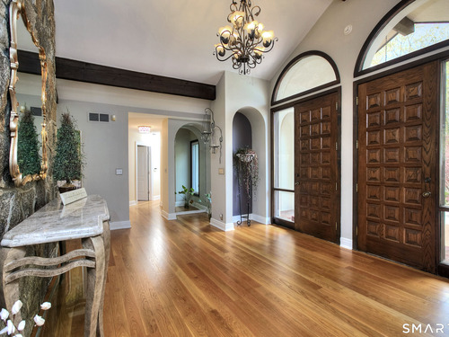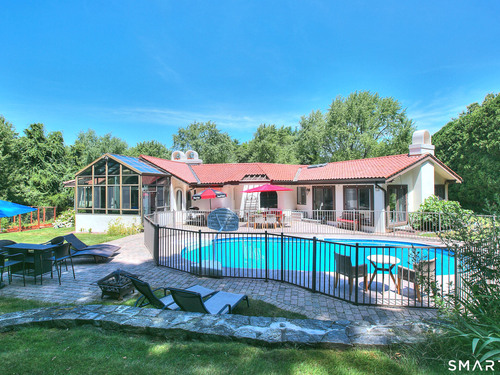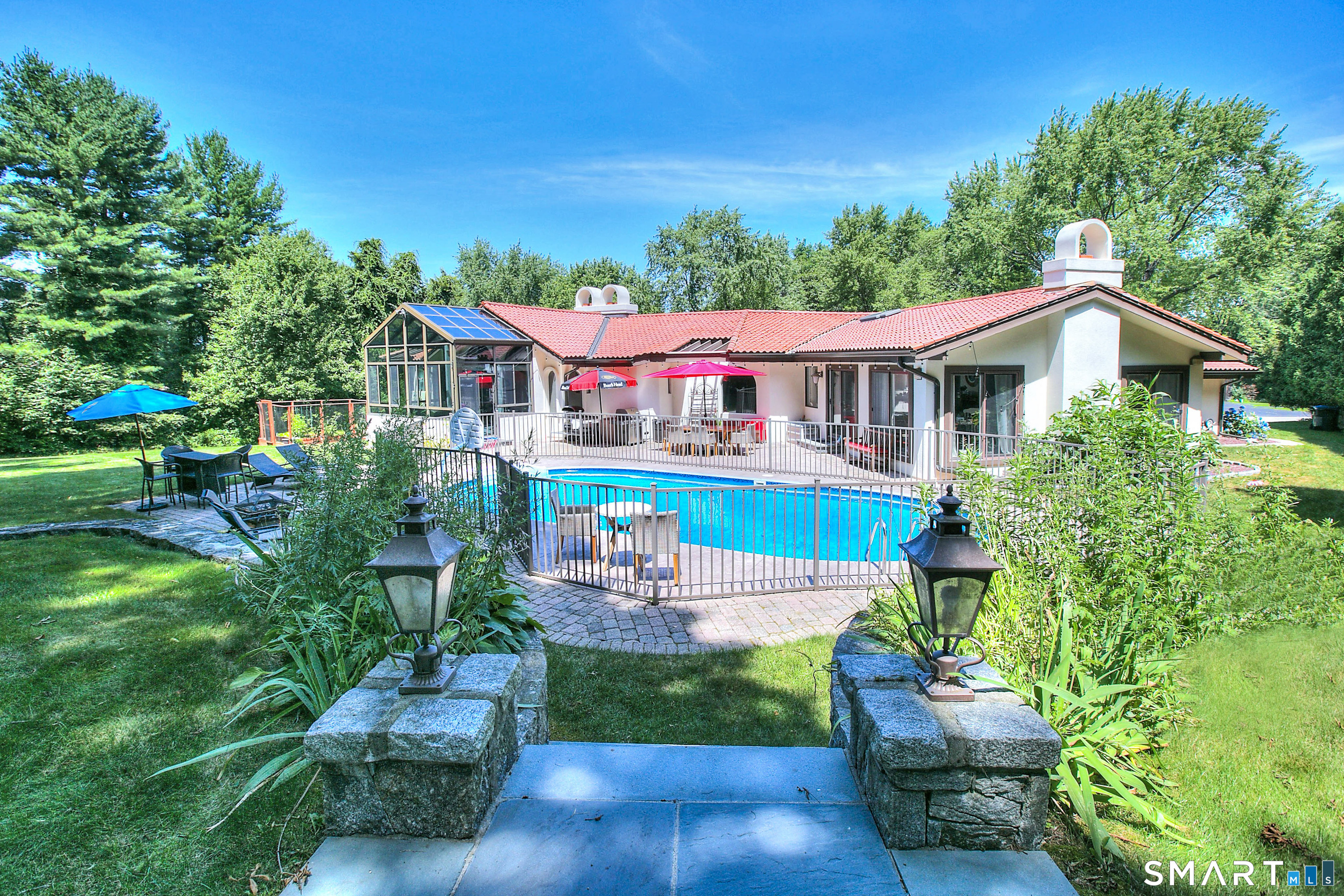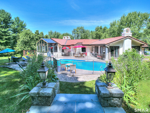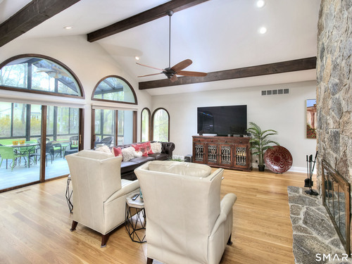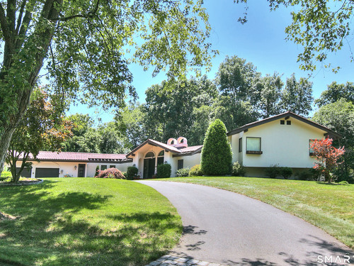 Tucked away on a highly sought-after lane, a sweeping driveway entry to this distinctive custom-built home. Masterfully blending character with privacy, a grand portico and mahogany double-doors open to a sunken main family room anchored by the stunning floor-to-ceiling fieldstone fireplace. The exposed timber beams through soaring vaulted ceilings of this great room, flowing seamlessly into a beautiful glass-wrapped sunroom. This heated space offers indoor-outdoor luxury, night or daytime sky viewing, and overlooks the stone patio surrounding the inground pool, with stone steps to the outdoor gazebo atop this resort-style oasis. The elegant open-archways thoughtfully designed for soft transitions to each room preserve an open-layout concept while curating each room's viewpoint into a dramatic setting. The formal dining room highlights this feature with matching arched windows, picture-framing the outdoor grounds and diffusing indoor natural light. The chef-inspired kitchen is a showpiece centering on an expansive granite island with dual gas cooktops, skylights, and striking copper pendants. This space flows effortlessly into the sun-drenched living room featuring a sleek gas fireplace, vaulted ceilings, and walls of sliding glass to the patio. A walk-out lower level with a gym & private room offers exceptional flexibility for an office or fourth bedroom, completing this architectural gem in a premiere, private enclave on this tree-lined cul de sac in the heart of Monroe.