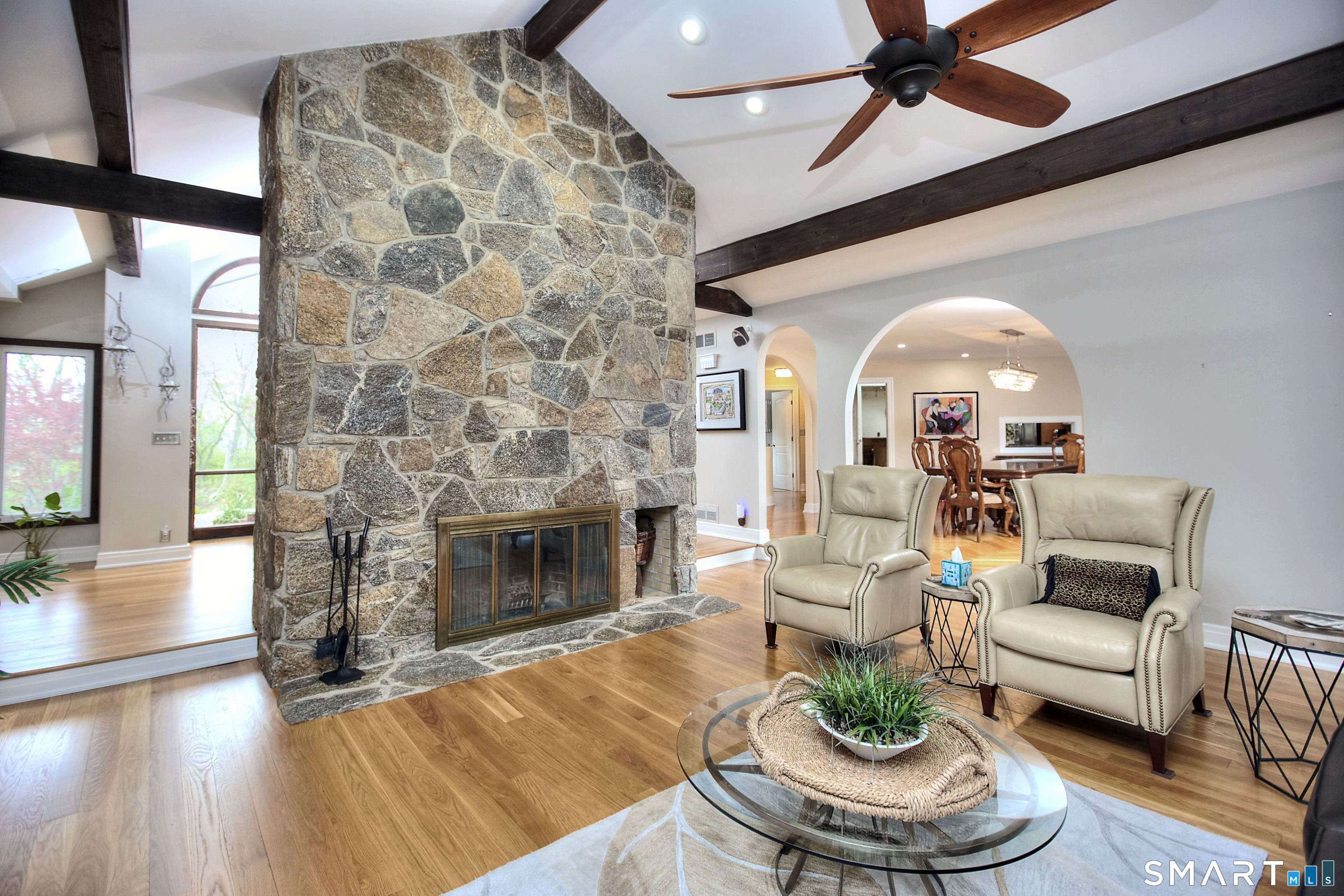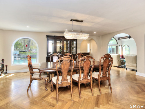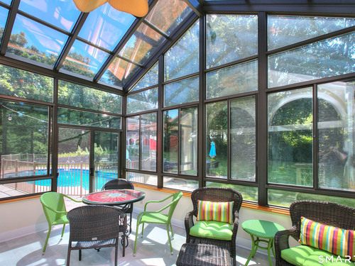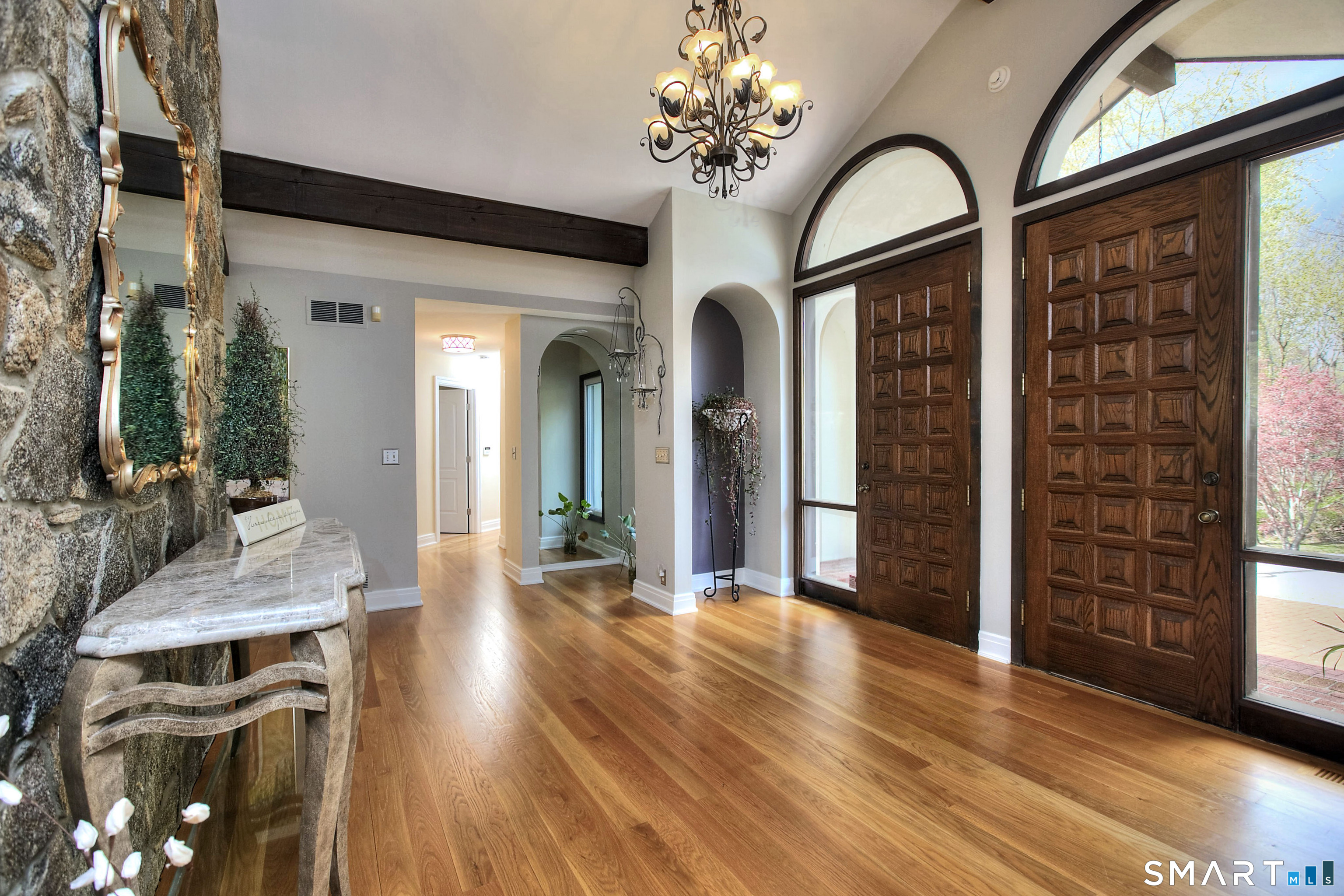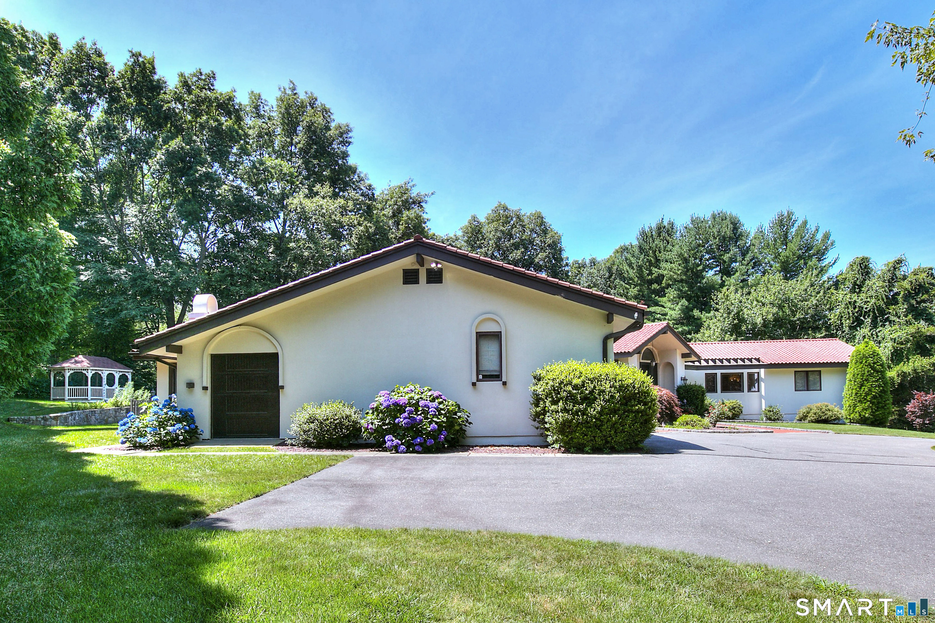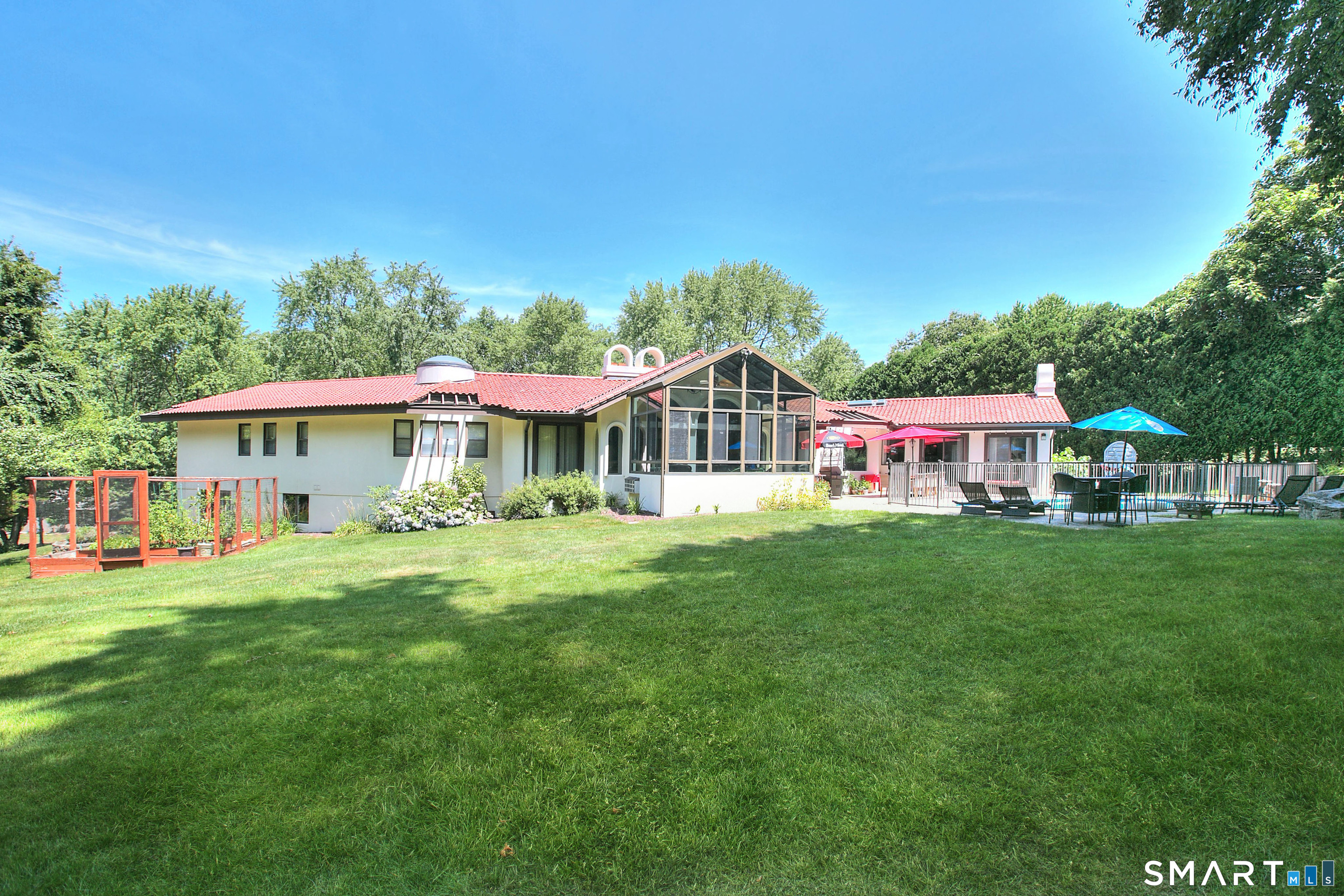 Tucked away on a highly sought-after lane, a sweeping driveway entry to this distinctive custom-built home. Masterfully blending character with privacy, a grand portico and mahogany double-doors open to a sunken main family room anchored by the stunning floor-to-ceiling fieldstone fireplace. The exposed timber beams through soaring vaulted ceilings of this great room, flowing seamlessly into a beautiful glass-wrapped sunroom. This heated space offers indoor-outdoor luxury, night or daytime sky viewing, and overlooks the stone patio surrounding the inground pool, with stone steps to the outdoor gazebo atop this resort-style oasis. The elegant open-archways thoughtfully designed for soft transitions to each room preserve an open-layout concept while curating each room's viewpoint into a dramatic setting. The formal dining room highlights this feature with matching arched windows, picture-framing the outdoor grounds and diffusing indoor natural light. The chef-inspired kitchen is a showpiece centering on an expansive granite island with dual gas cooktops, skylights, and striking copper pendants. This space flows effortlessly into the sun-drenched living room featuring a sleek gas fireplace, vaulted ceilings, and walls of sliding glass to the patio. A walk-out lower level with a gym & private room offers exceptional flexibility for an office or fourth bedroom, completing this architectural gem in a premiere, private enclave on this tree-lined cul de sac in the heart of Monroe.