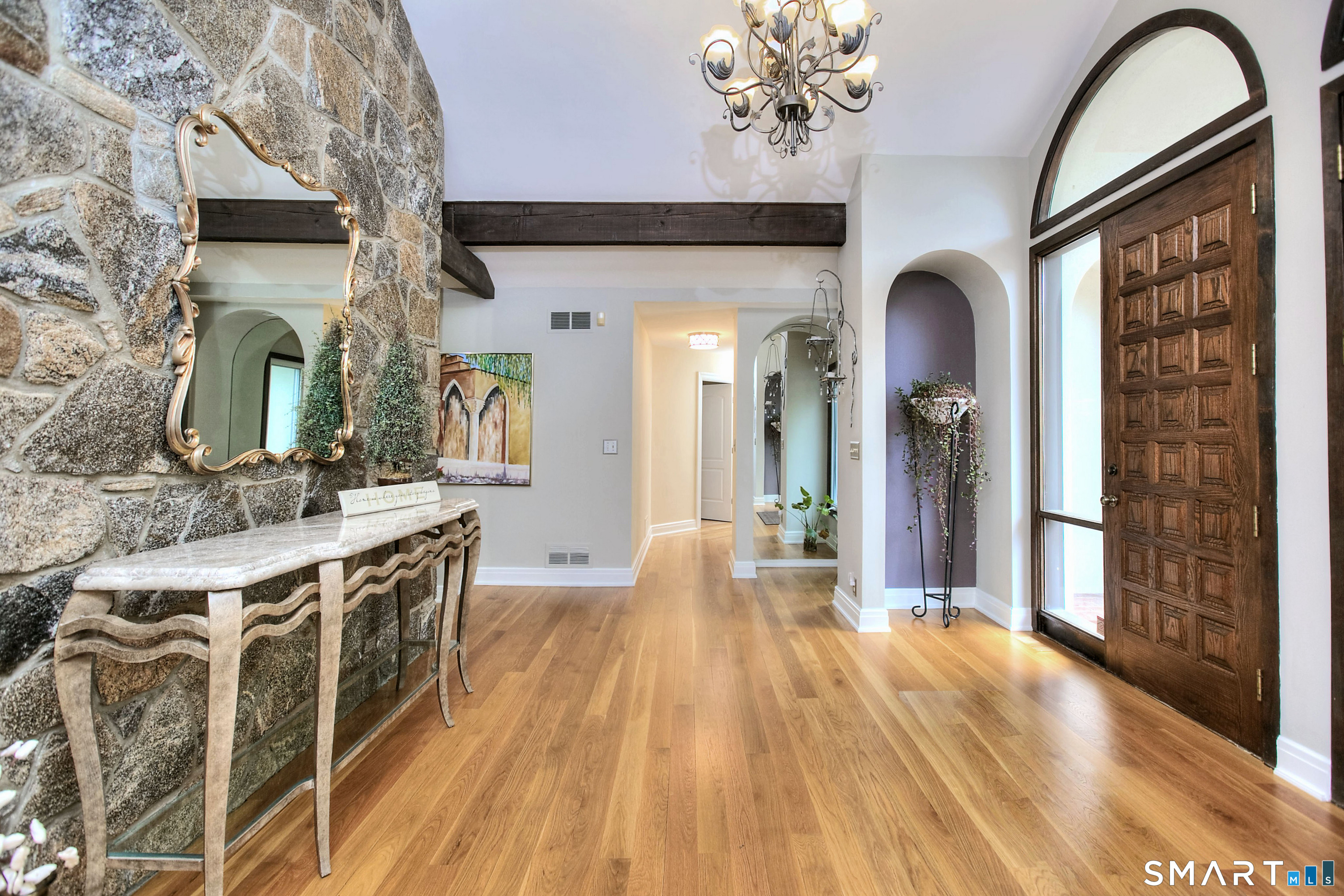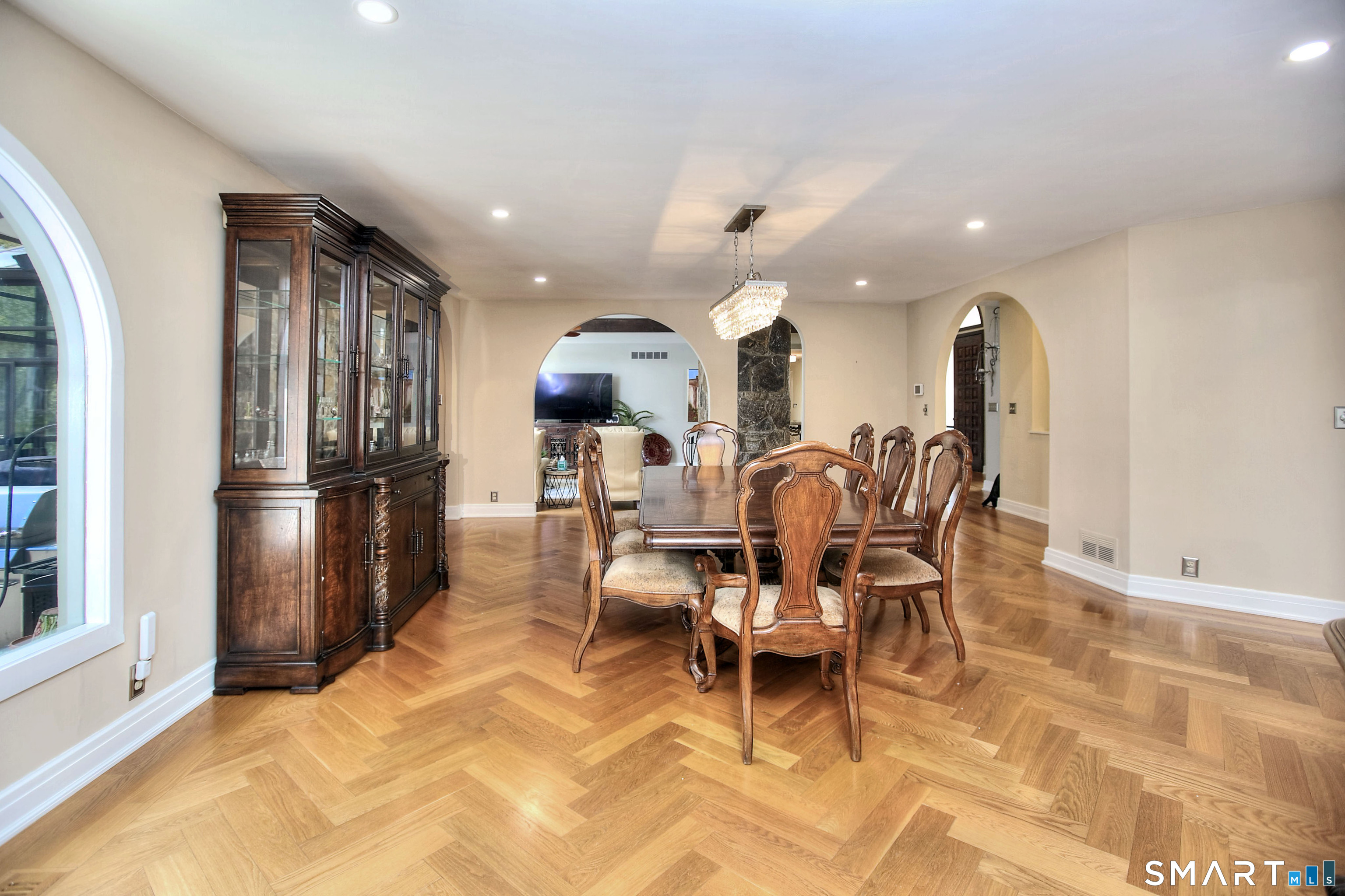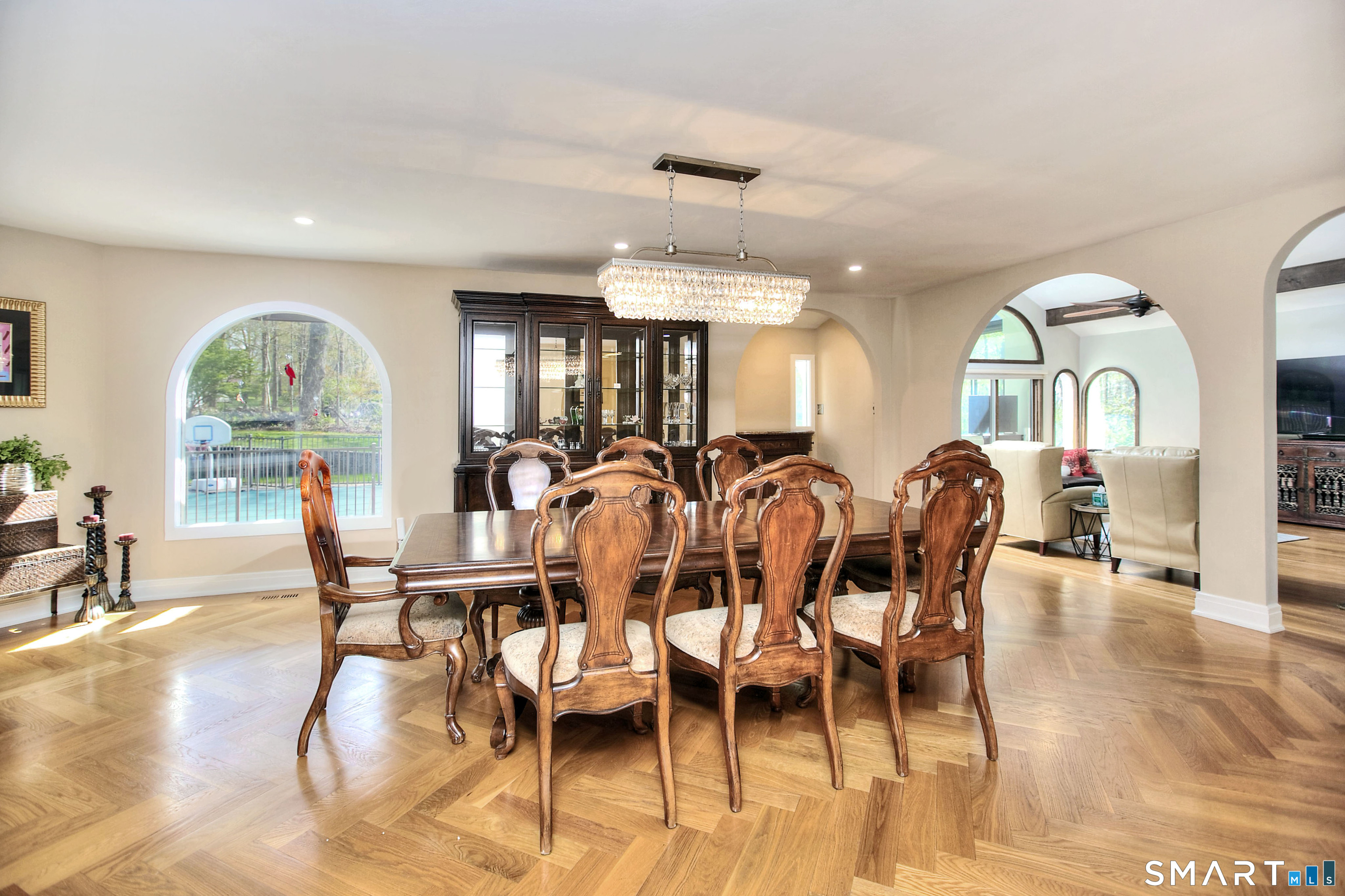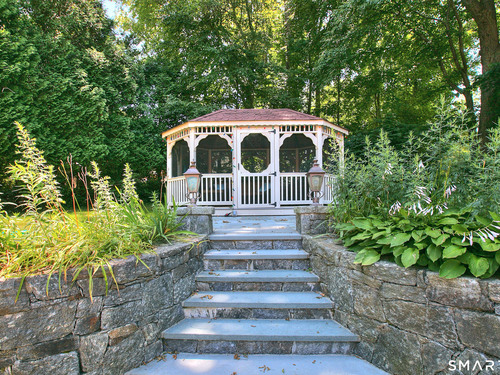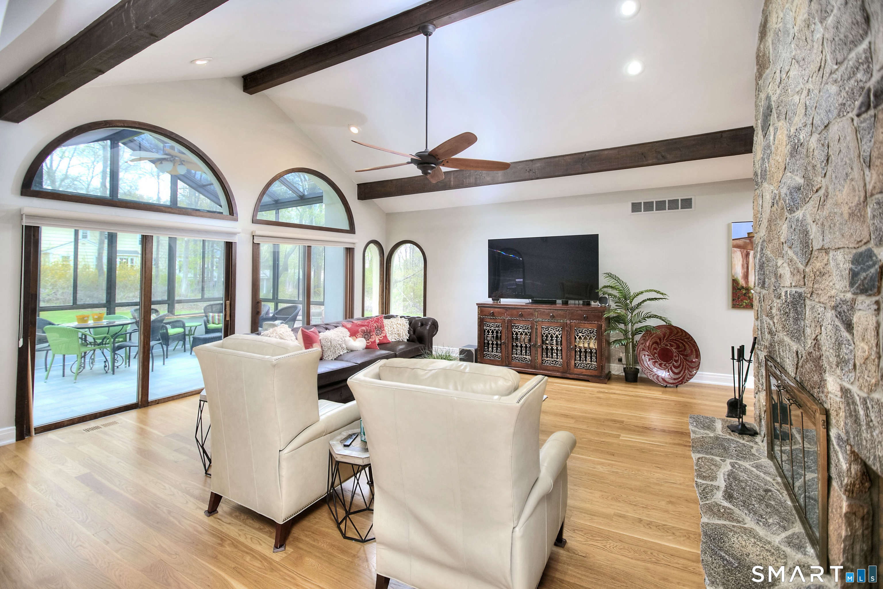 Tucked away on a highly sought-after lane, a sweeping driveway entry to this distinctive custom-built home. Masterfully blending character with privacy, a grand portico and mahogany double-doors open to a sunken main family room anchored by the stunning floor-to-ceiling fieldstone fireplace. The exposed timber beams through soaring vaulted ceilings of this great room, flowing seamlessly into a beautiful glass-wrapped sunroom. This heated space offers indoor-outdoor luxury, night or daytime sky viewing, and overlooks the stone patio surrounding the inground pool, with stone steps to the outdoor gazebo atop this resort-style oasis. The elegant open-archways thoughtfully designed for soft transitions to each room preserve an open-layout concept while curating each room's viewpoint into a dramatic setting. The formal dining room highlights this feature with matching arched windows, picture-framing the outdoor grounds and diffusing indoor natural light. The chef-inspired kitchen is a showpiece centering on an expansive granite island with dual gas cooktops, skylights, and striking copper pendants. This space flows effortlessly into the sun-drenched living room featuring a sleek gas fireplace, vaulted ceilings, and walls of sliding glass to the patio. A walk-out lower level with a gym & private room offers exceptional flexibility for an office or fourth bedroom, completing this architectural gem in a premiere, private enclave on this tree-lined cul de sac in the heart of Monroe.