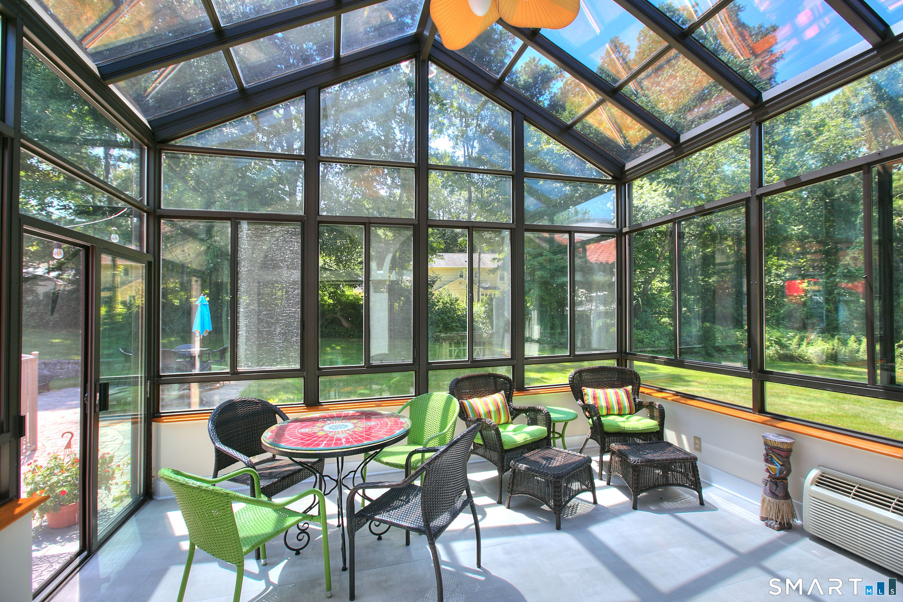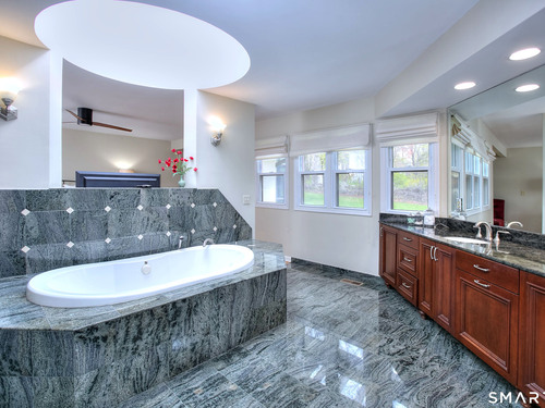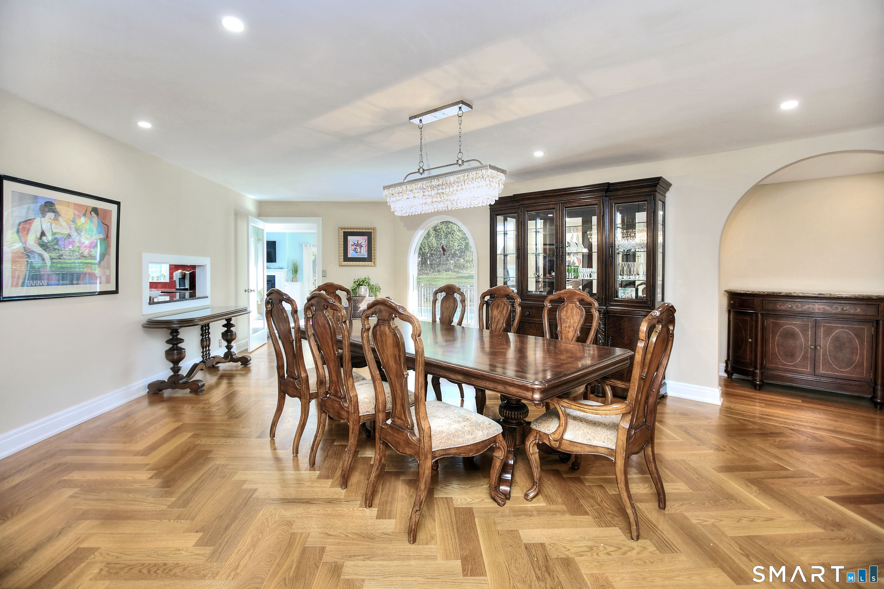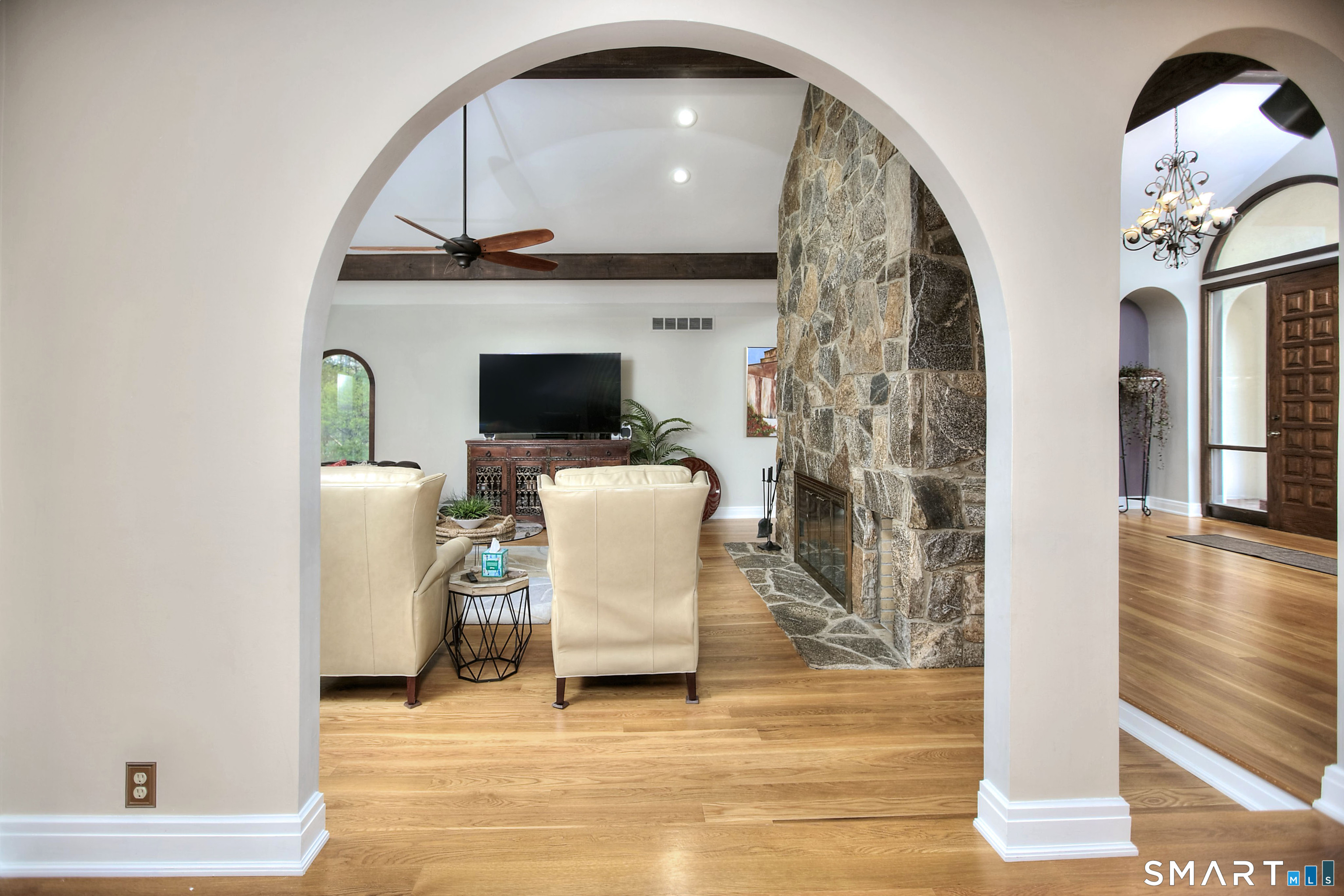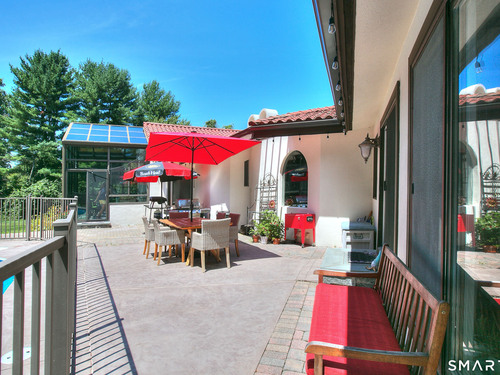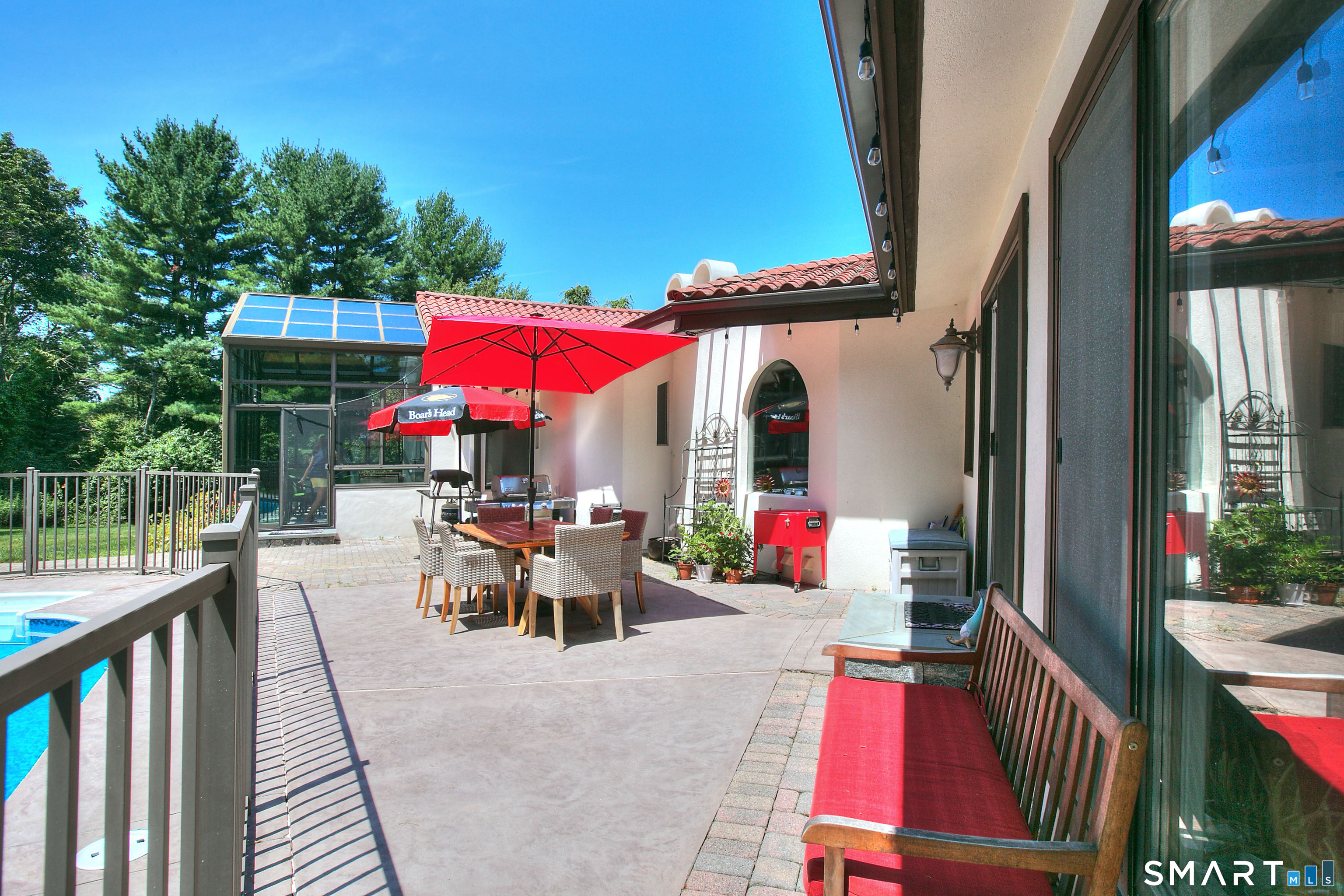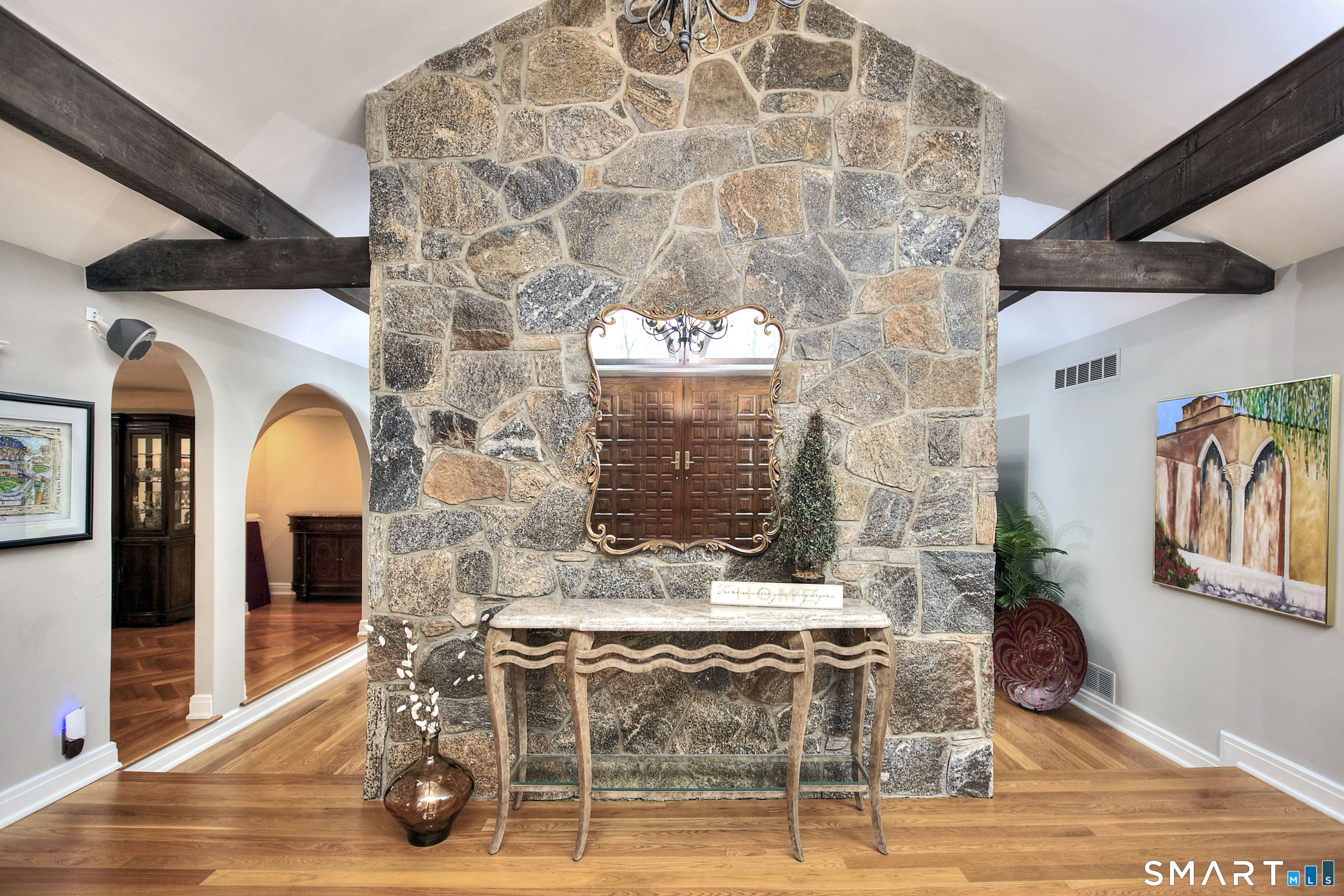 Tucked away on a highly sought-after lane, a sweeping driveway entry to this distinctive custom-built home. Masterfully blending character with privacy, a grand portico and mahogany double-doors open to a sunken main family room anchored by the stunning floor-to-ceiling fieldstone fireplace. The exposed timber beams through soaring vaulted ceilings of this great room, flowing seamlessly into a beautiful glass-wrapped sunroom. This heated space offers indoor-outdoor luxury, night or daytime sky viewing, and overlooks the stone patio surrounding the inground pool, with stone steps to the outdoor gazebo atop this resort-style oasis. The elegant open-archways thoughtfully designed for soft transitions to each room preserve an open-layout concept while curating each room's viewpoint into a dramatic setting. The formal dining room highlights this feature with matching arched windows, picture-framing the outdoor grounds and diffusing indoor natural light. The chef-inspired kitchen is a showpiece centering on an expansive granite island with dual gas cooktops, skylights, and striking copper pendants. This space flows effortlessly into the sun-drenched living room featuring a sleek gas fireplace, vaulted ceilings, and walls of sliding glass to the patio. A walk-out lower level with a gym & private room offers exceptional flexibility for an office or fourth bedroom, completing this architectural gem in a premiere, private enclave on this tree-lined cul de sac in the heart of Monroe.
