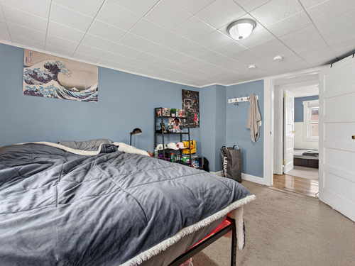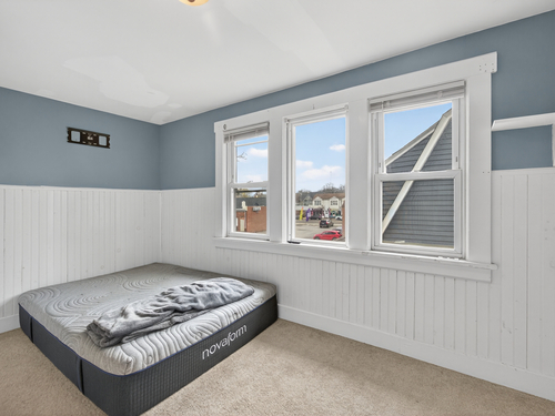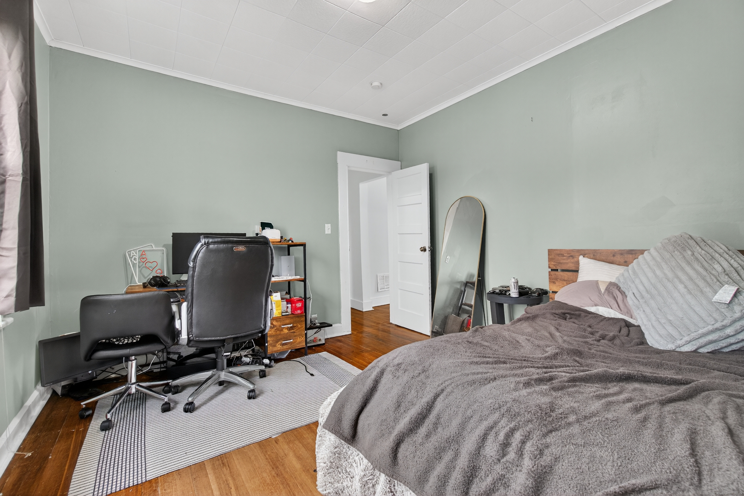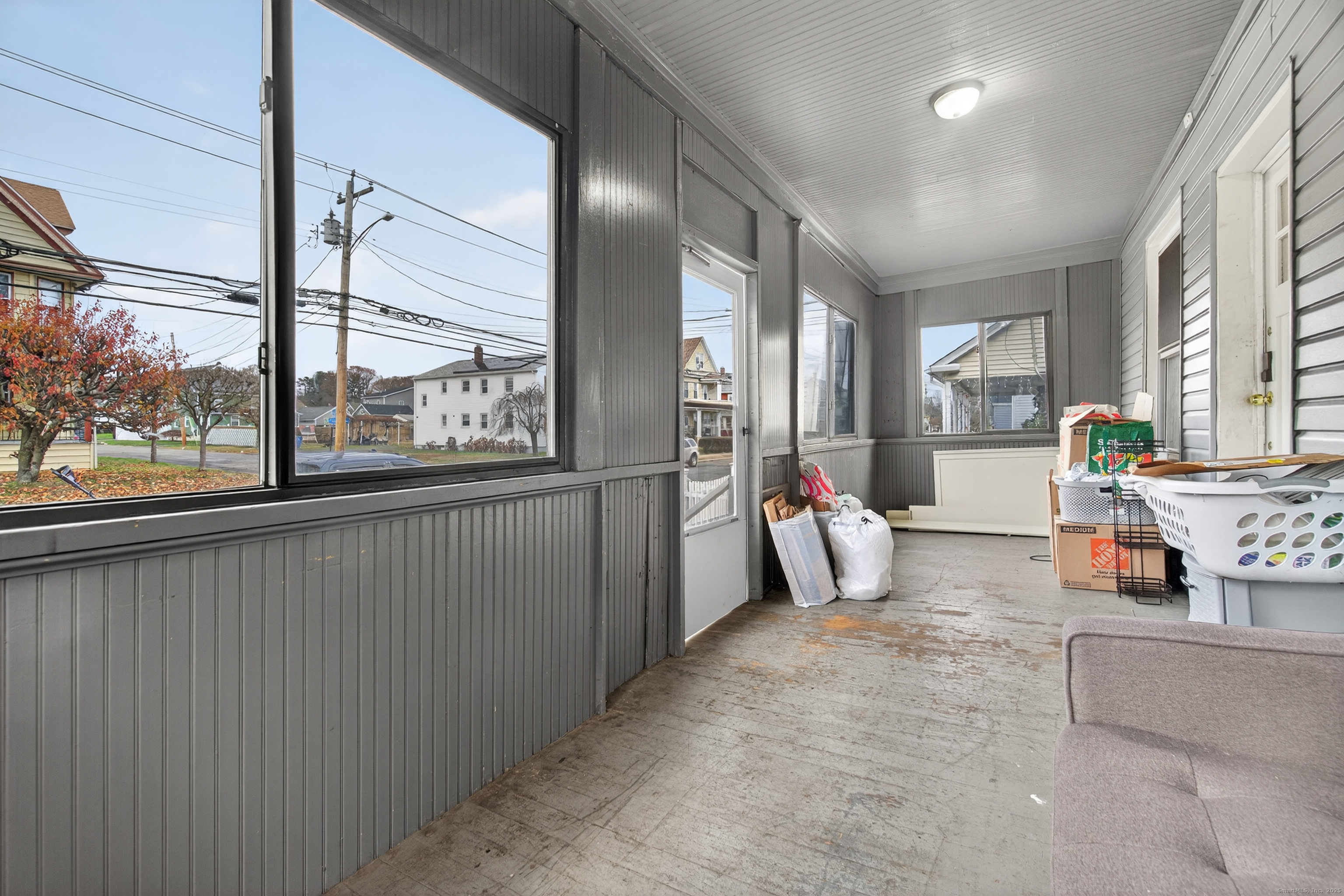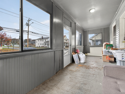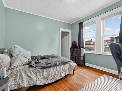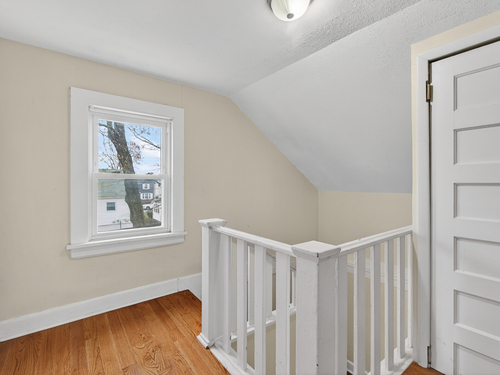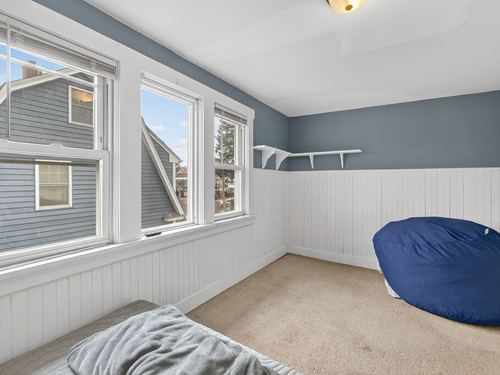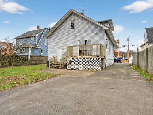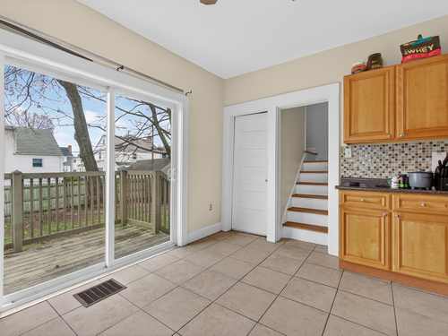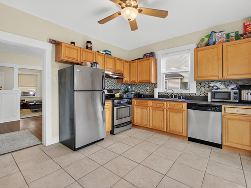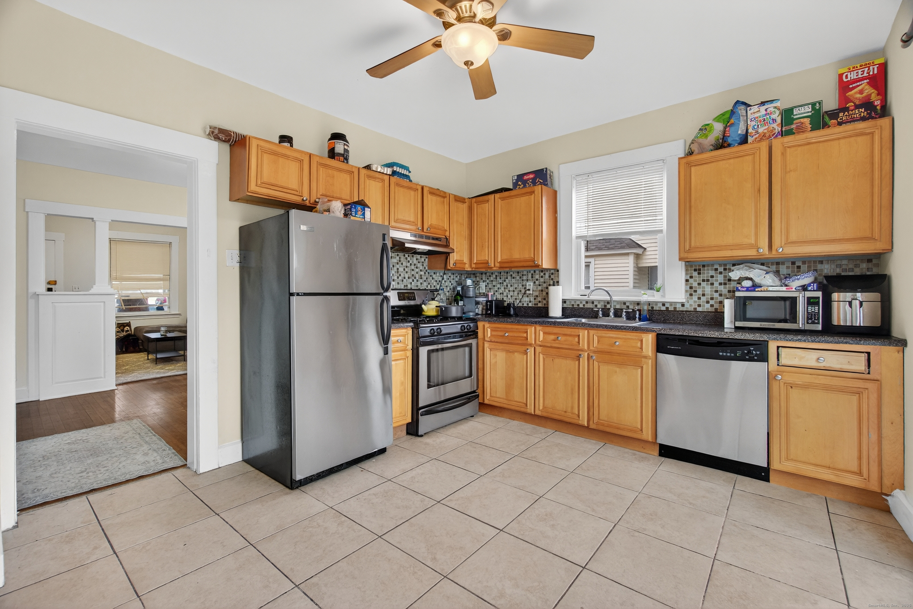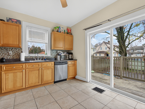 Welcome to this spacious 4-5 bedroom, 2-bath home offering a blend of character and modern comfort. An enclosed sun porch adds extra living space and leads into the main level, where you'll find high ceilings, original hardwood floors, and classic built-ins. The updated, light-filled kitchen features stainless steel appliances and a sliding door to a deck that overlooks a private, fenced backyard. The dining room opens to the living room, creating a warm and functional layout for everyday living or entertaining. Two first-floor bedrooms, including one with a walk-in closet, provide flexibility for guests, work-from-home needs, or single-level living. A full bath completes the main level. Upstairs, a generous landing leads to three additional bedrooms and a second full bath. Additional features include dual-zone high-efficiency gas heat, dual-pane windows, a deck, patio, storage space, and off-street parking for up to four vehicles. The fenced yard offers room to relax and unwind. This property has a strong rental history and offers both comfortable owner-occupied living and appealing investment potential. Conveniently located minutes from shopping, amenities, and major highway access. A versatile home ready for its next chapter.