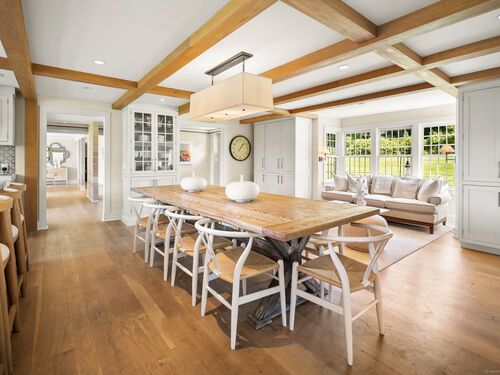 Beams, Built-Ins, Dining Area, Island, Pantry, Wide Board Floor