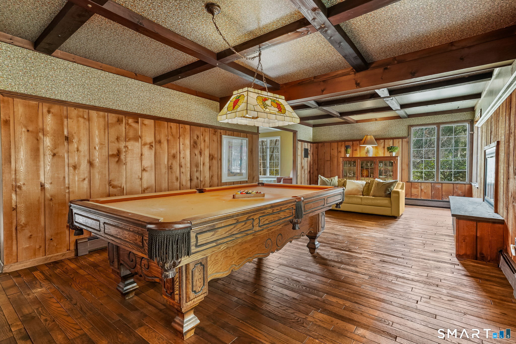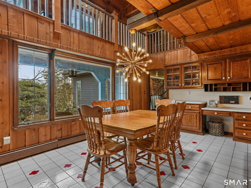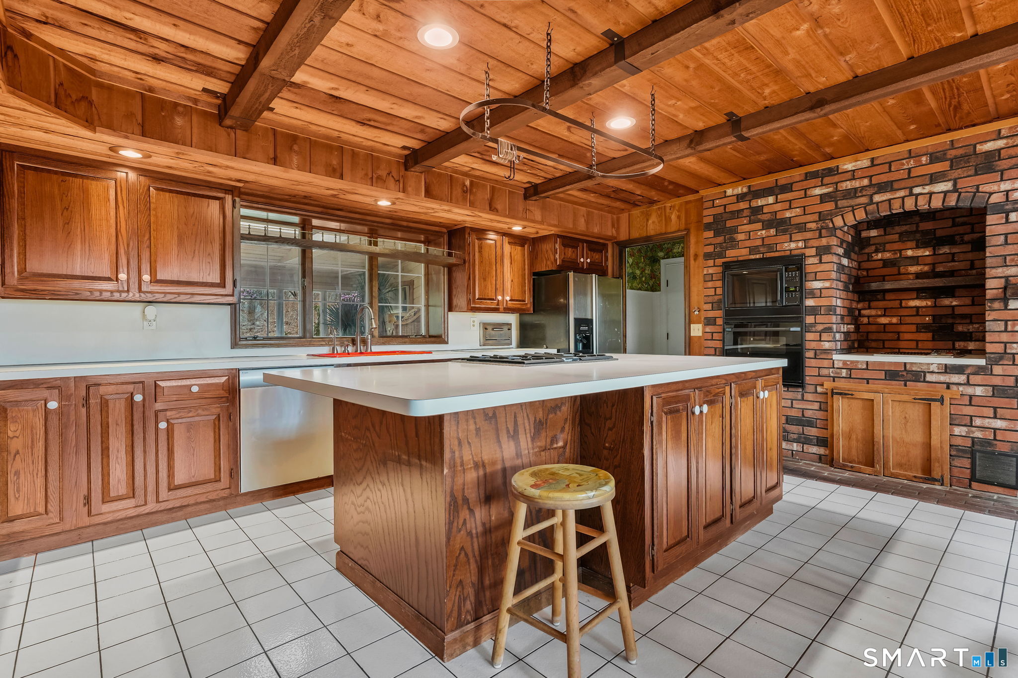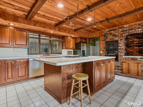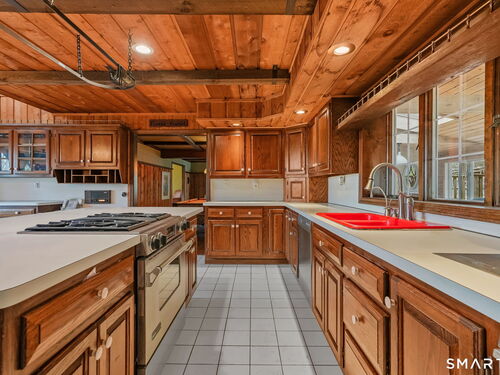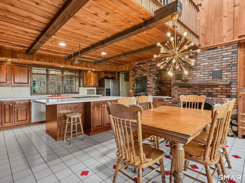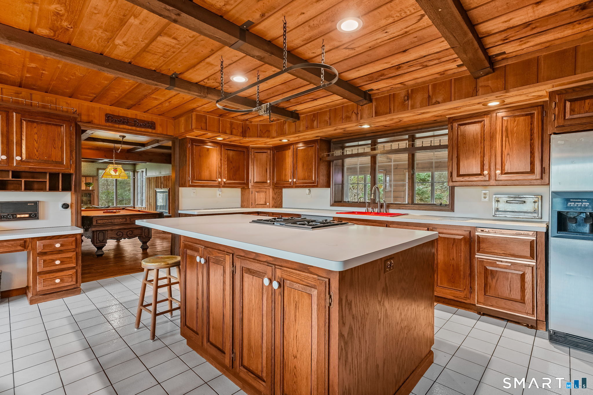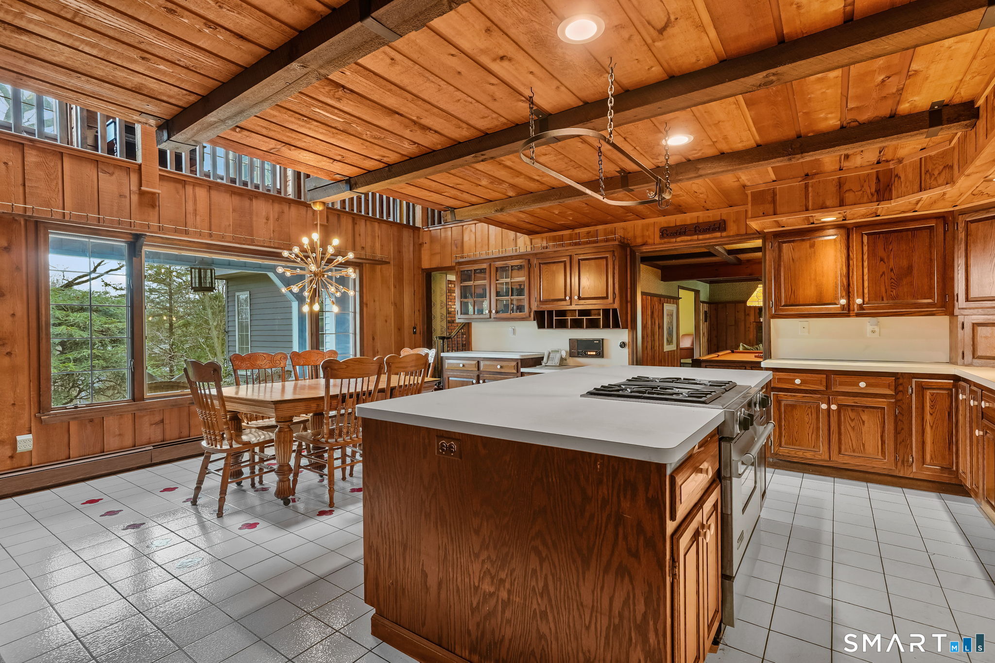 Set back from the street and introduced by a brick entry with space to sit and unwind, this expansive, first-time-offered Colonial reflects a level of craftsmanship and scale rarely found. Built by its original owners, the home offers over 5,000 square feet with a layout suited for both everyday living and entertaining. Inside, hardwood floors, Andersen windows and doors, and a well-proportioned layout connect the formal and informal spaces. A central foyer leads to a living room with a wood-burning fireplace and a dining room with built-ins. The oversized eat-in kitchen features vaulted, wood-beamed ceilings, a brick fireplace, center island, and a generous dining area with an interior balcony above. The adjacent sunroom, with skylights and exposed beams, opens through sliding doors to a deck overlooking the backyard with an above-ground pool and shed. The family room, anchored by a gas fireplace and coffered wood-beamed ceiling, offers a flexible space for gathering or recreation. Upstairs, you'll find a primary suite with en-suite bath, three additional bedrooms with a renovated hall bath, and a separate private suite on the other side of the home with built-ins, a walk-in closet, and a full bath with heated floors. A vaulted upper landing with cedar detailing and an interior overlook into the kitchen adds architectural interest and a sense of openness. A rare opportunity to personalize a home of this scale and quality, offered for the very first time.