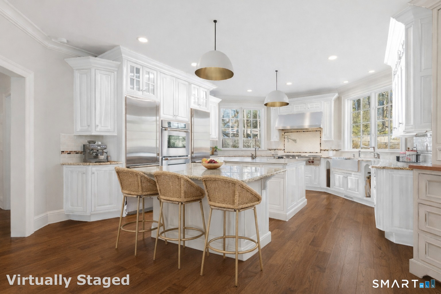 9 ft+ Ceilings, Wet Bar, French Doors, Island, Pantry, Limestone Floor