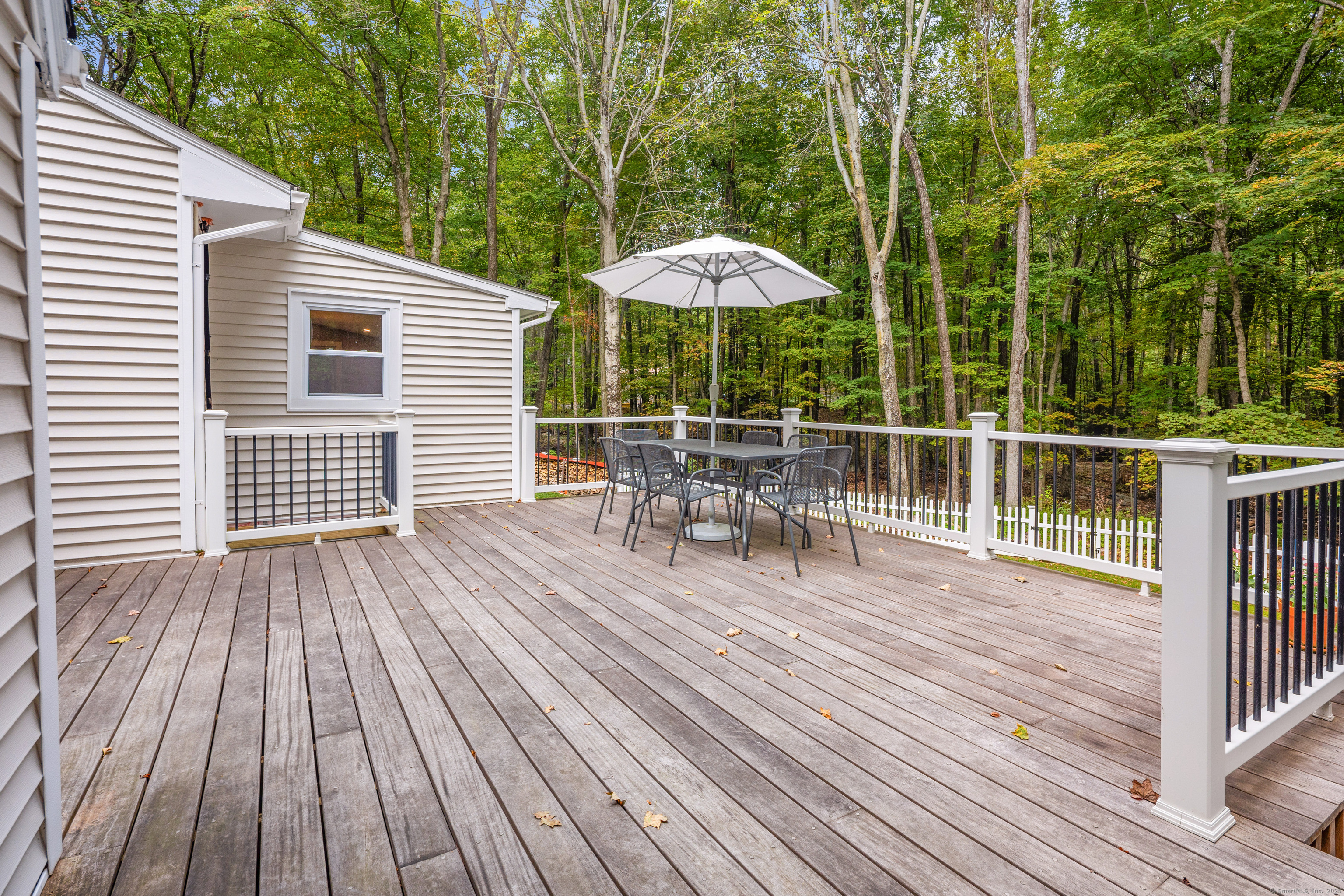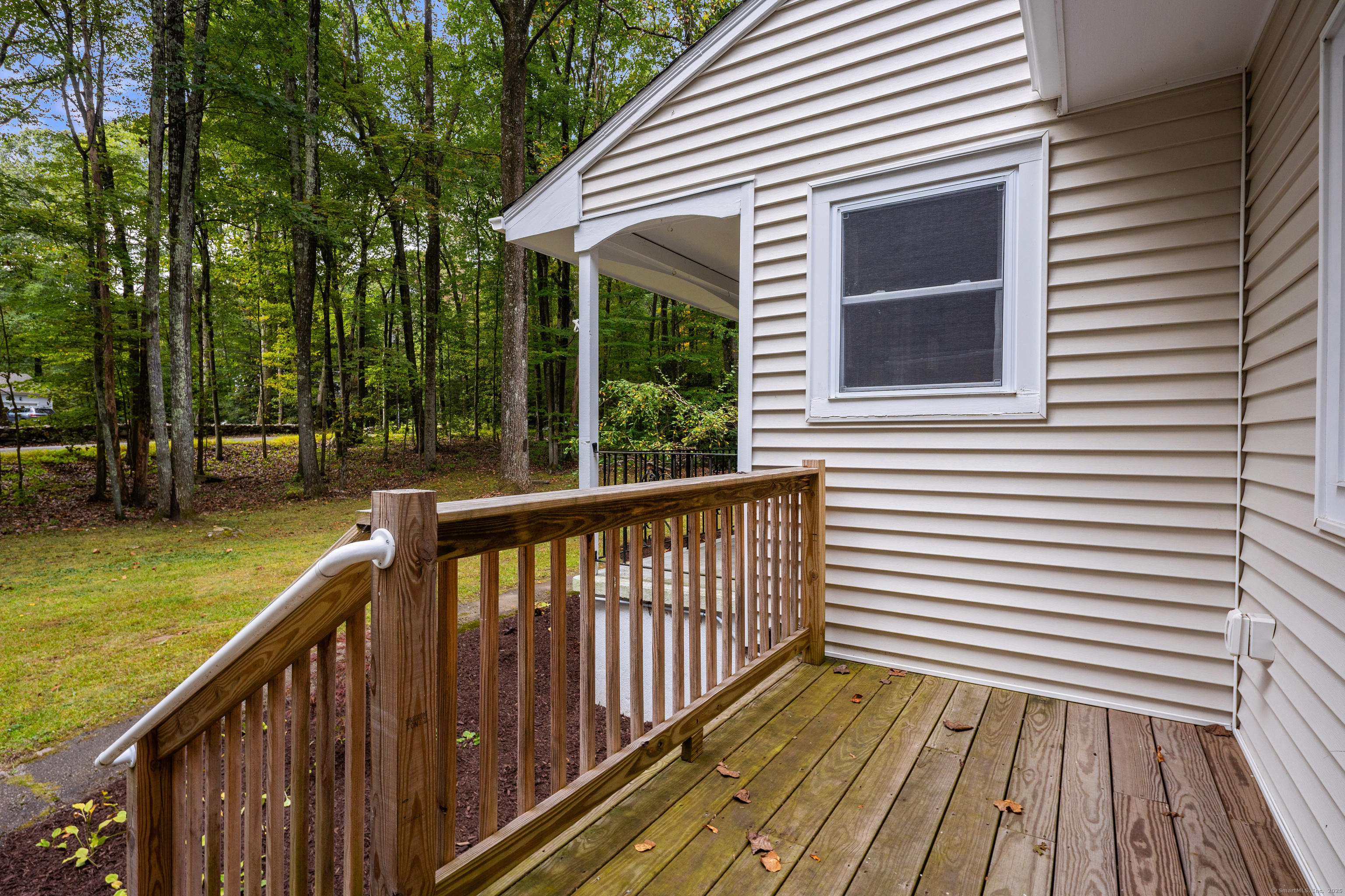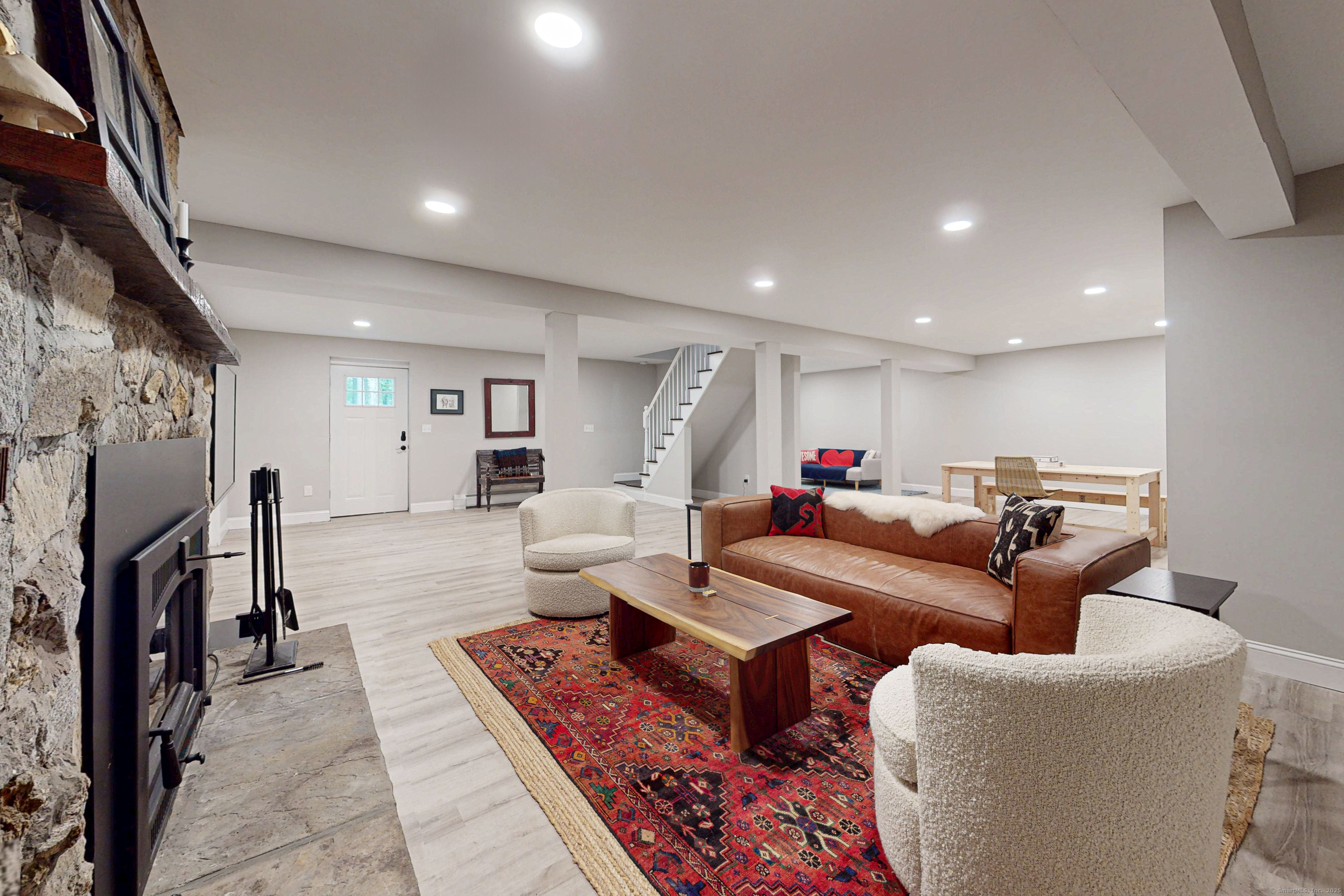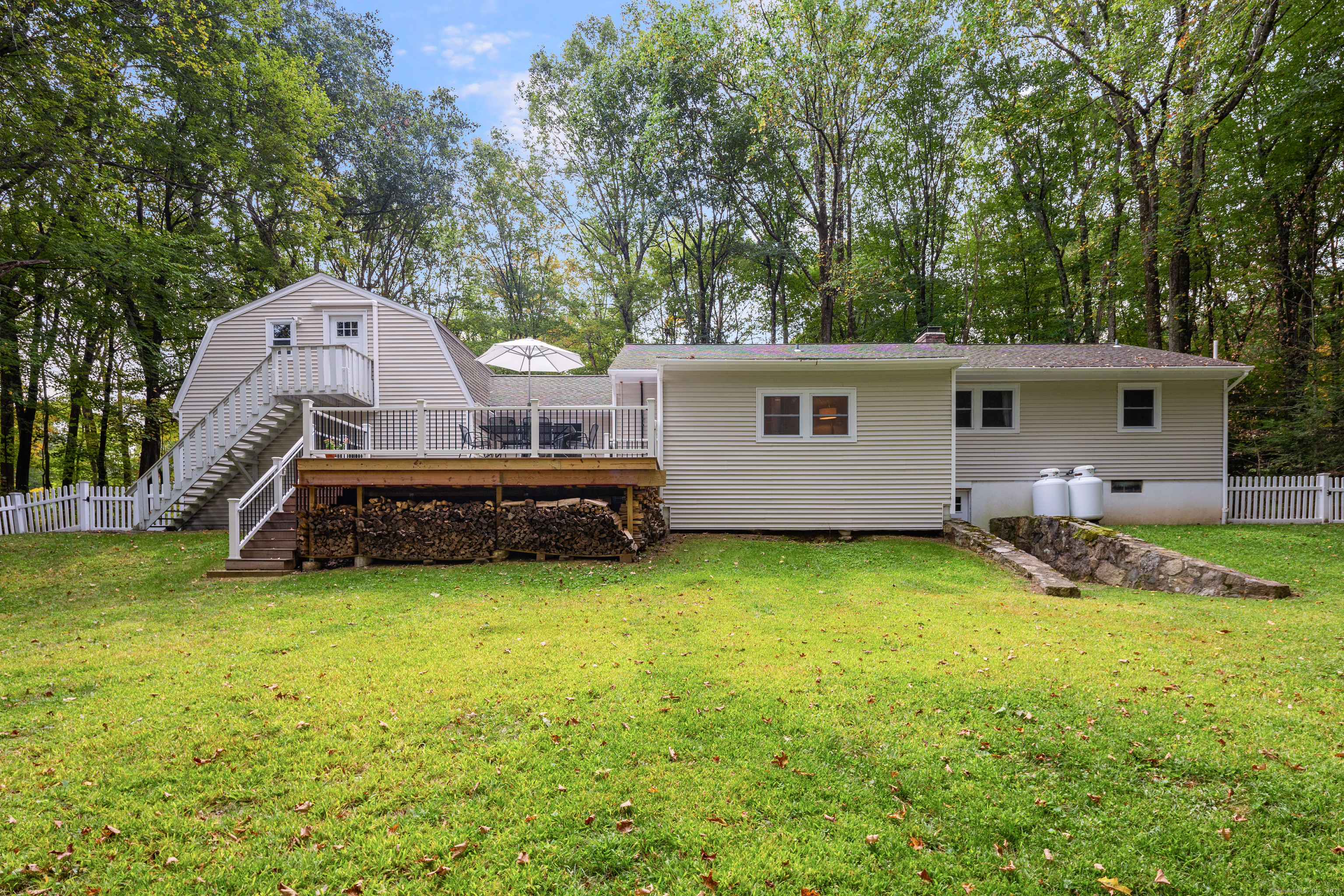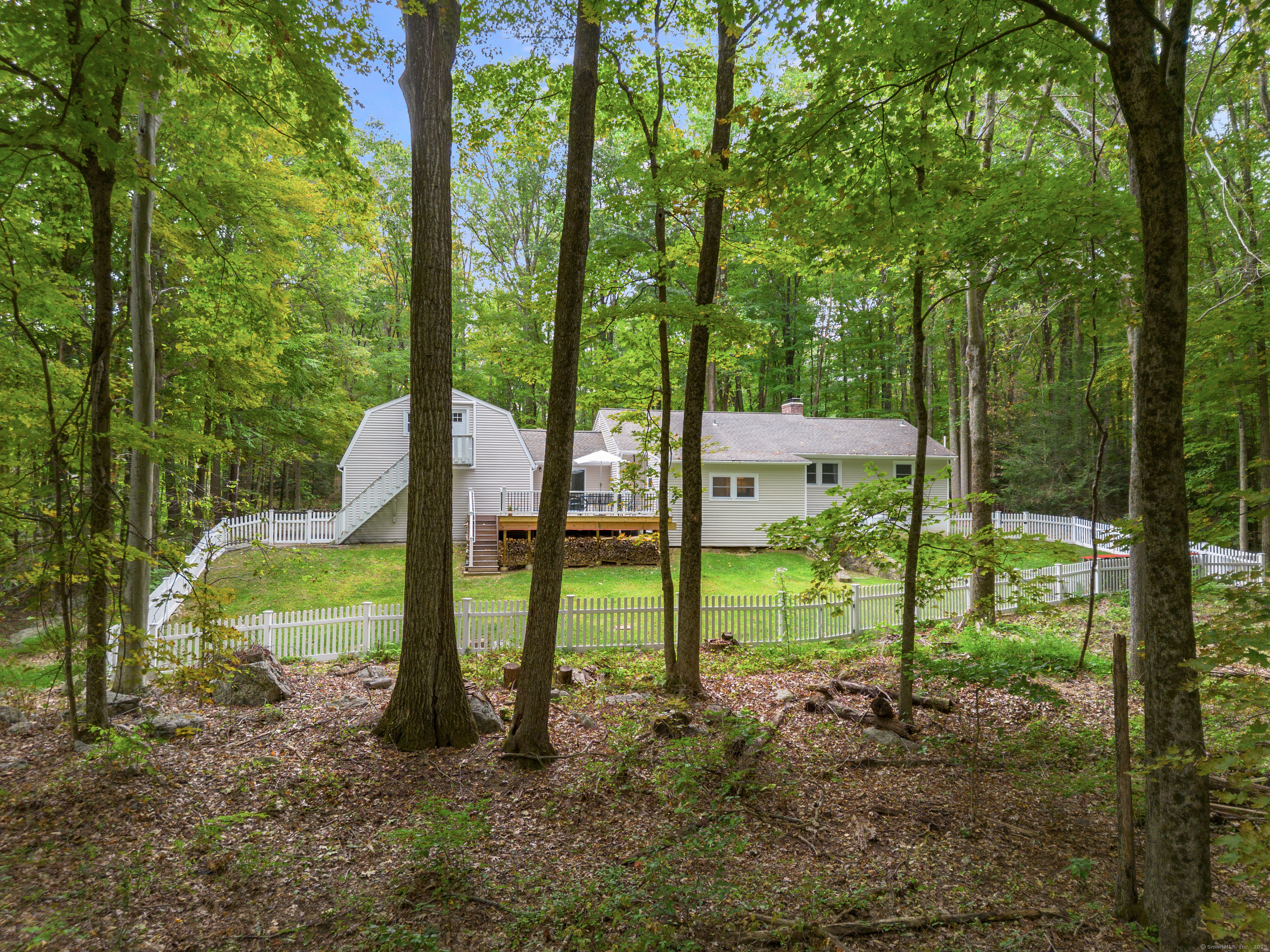 Beautifully updated, this ranch offers an open, airy layout with natural light and clean finishes that create a comfortable, modern feel. Set on over seven private acres, the home also includes an accessory apartment, providing flexibility for a variety of living arrangements. With custom soft-close cabinetry, granite countertops, and a center island, the kitchen transitions to the dining and living areas, providing a natural hub for everyday living and entertaining. The living room is highlighted by a bay window and a beautiful stone fireplace that adds warmth and character. The main level also includes a primary suite with full bath, two additional bedrooms, one with custom closet organizers, a hall bath, and an office. A newly expanded deck extends the living space and overlooks the private yard, which includes a fenced area ideal for play or pets, along with woods to explore. The finished lower level provides additional living space with a second stone fireplace, now outfitted with a new wood stove insert, perfect recreation or media room. The one-bedroom accessory apartment features its own new mini-split system, making it a great option for extended family, in-law set up or income potential. Modern systems include propane heating, central air, and thoughtful updates throughout. A convenient, large attached two-car garage. Located just minutes to Routes 84 and 34, this offering combines privacy, space, and accessibility with all the amenities of the Newtown community.