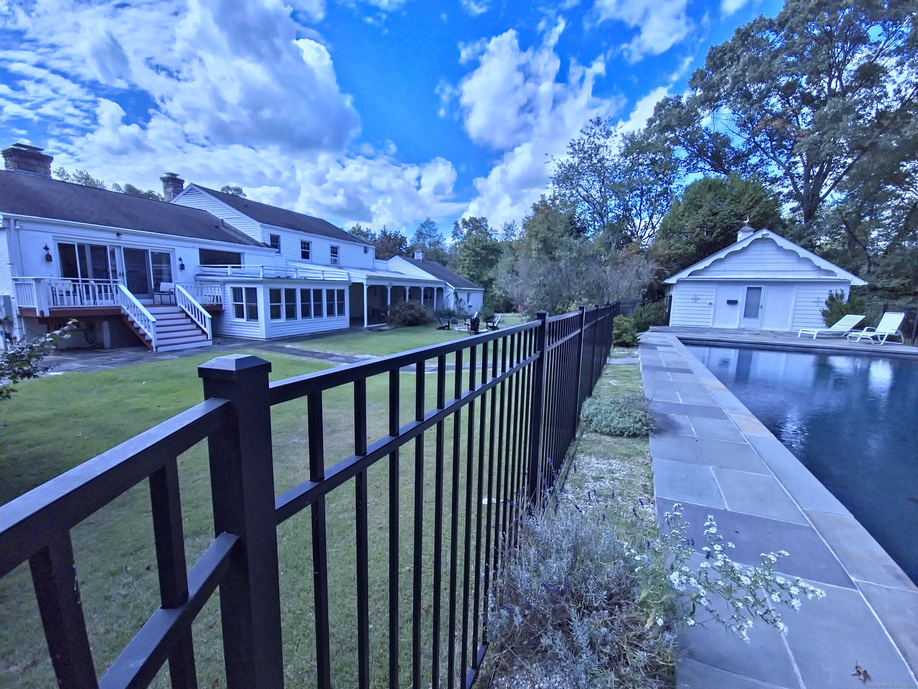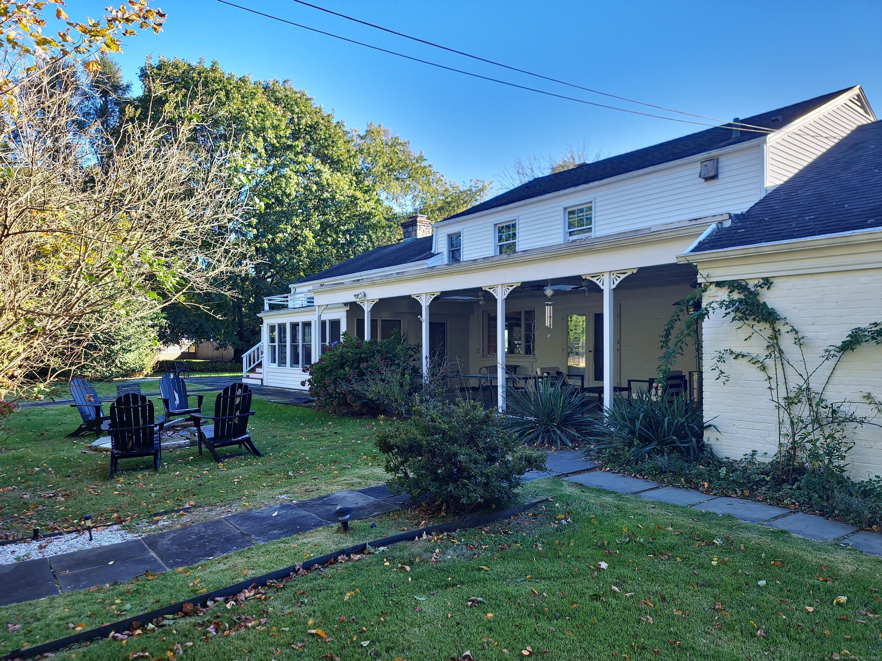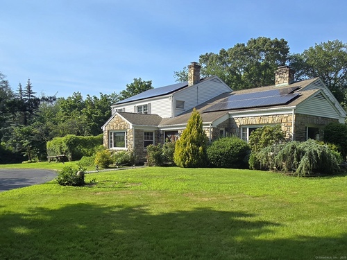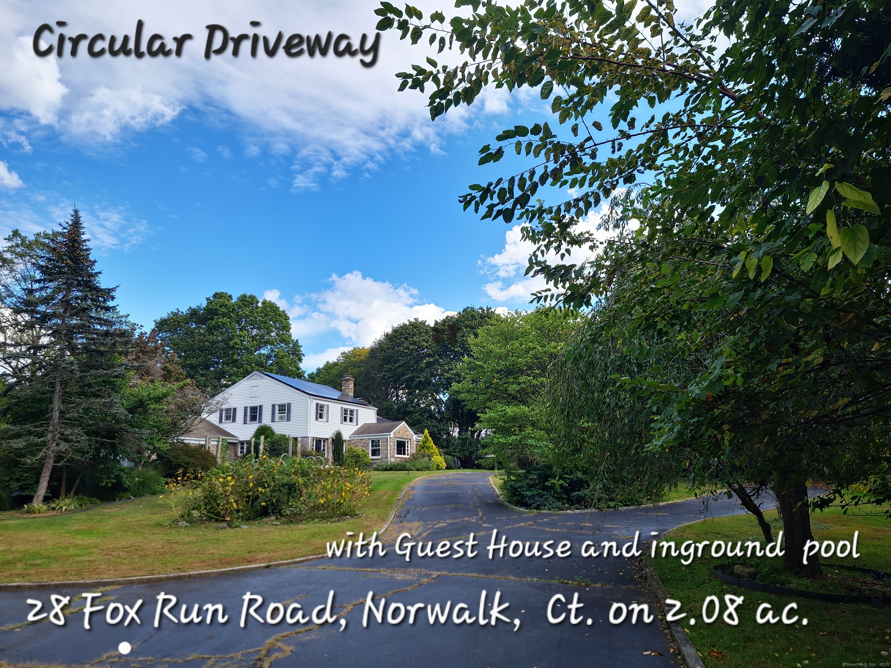 Private oasis on 2.08ac. Mini Estate with matured trees, 3,887sq.ft 11 Rm, 4Br. 3Full Ba. & 2 Half Ba. of living space & 3 car. gar. Minutes to major highways, shops, entertainment and Golf Course. Inground gunite heated pool and guest house 1Br. Kit. 1Ba. Wide stone wall entry leads to the circular driveway and three car garage with parking for over ten cars. Sprinkler system and invisable fence. Hardwood floor through out. Cathedrial ceiling Autrum invites to spacious living rm. with fireplace and direct access to the back yard. Hallway leads to sun filled Play Rm. wrapped with windows, Dining Rm. with mirrored side walls, den with fireplace and to the generous size Chefs kitchen approx. 430sq.ft with marbled floor, pantry, Corian island, two separate sinks, sub zero frig & double wall ovens. Off the kitchen direct entry to up stairs-possible Au pair quarters, entry to front of the house, huge slate covered patio with sky lights, garage & half bath. Possible land subdivision buyer must do their own research in that regard. Vaulted ceiling Master Bedroom Suite, Granite Master Bath with make-up area, bidet and jacuzzi. Two other Bd. Rm on their own wing of the house sharing full bath. Pathway behind the pool leads to Coachmens Ct. cul-de-sac. City side walk and bike lane at the end of the driveway leads to Conn. Ave. Solar pannel contract. 400amp service, genarator ready. If you seek privacy this is it. As is condition. Located between Darien and New Cannan.
