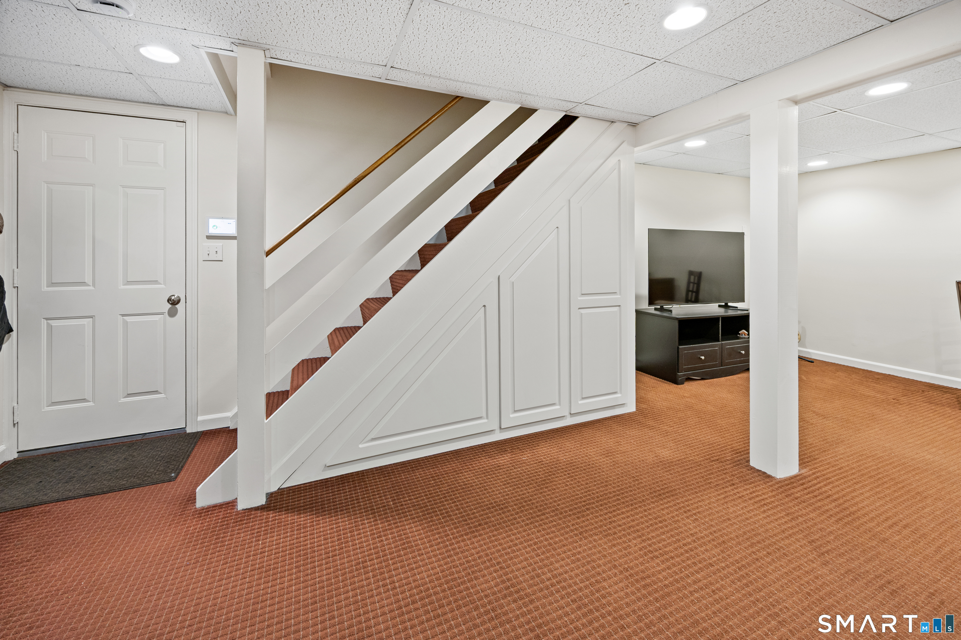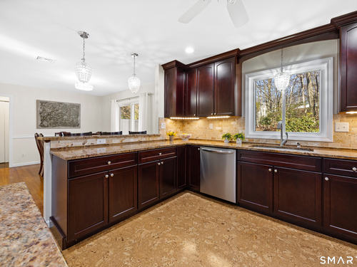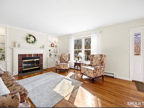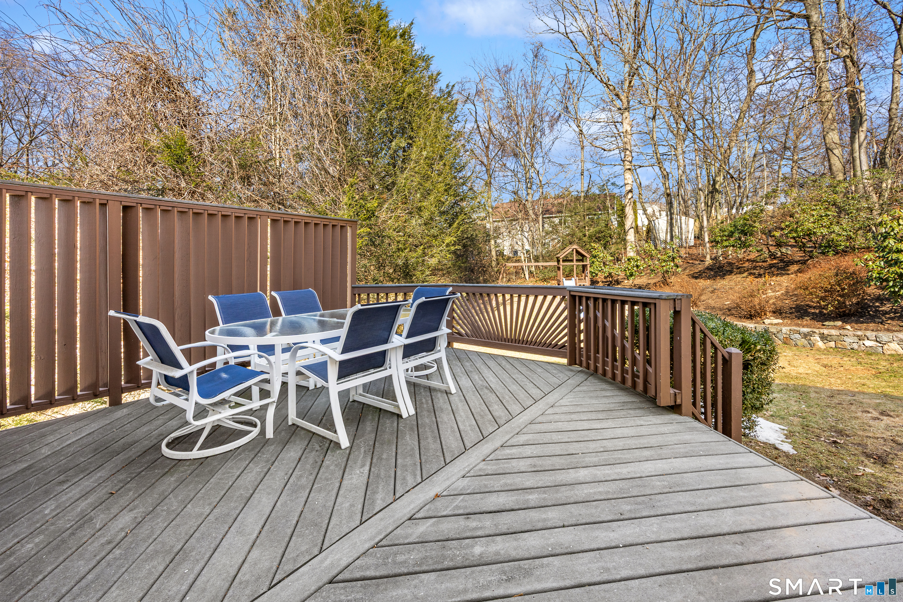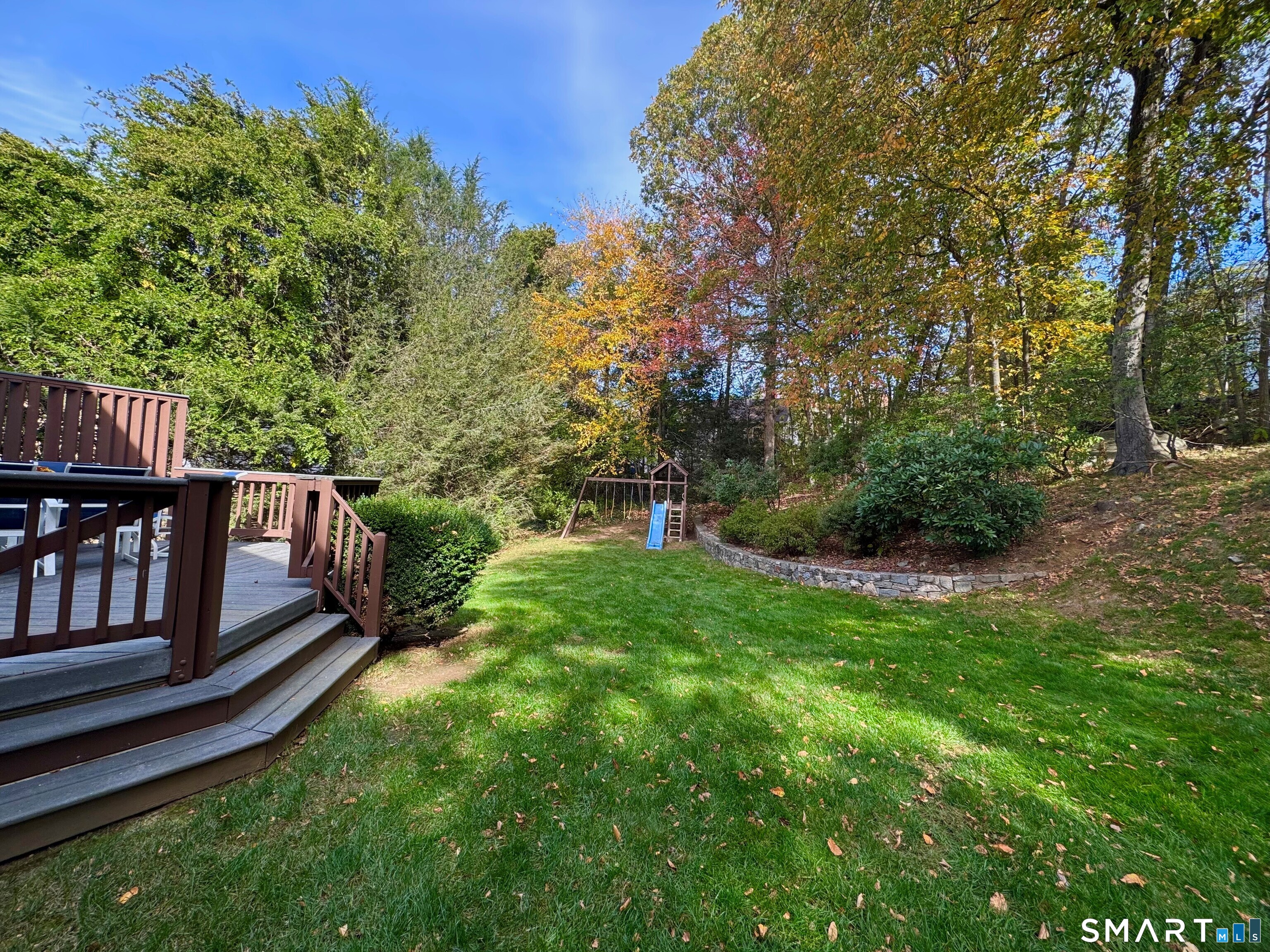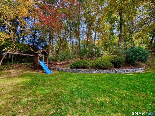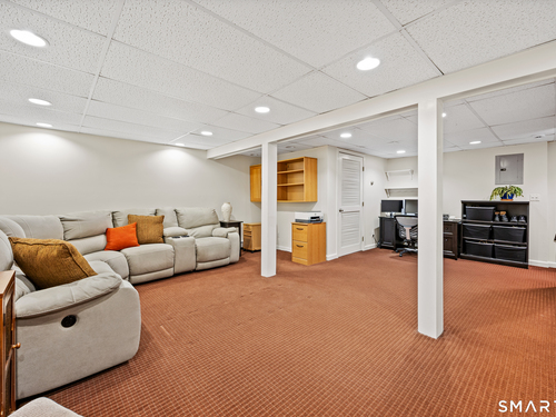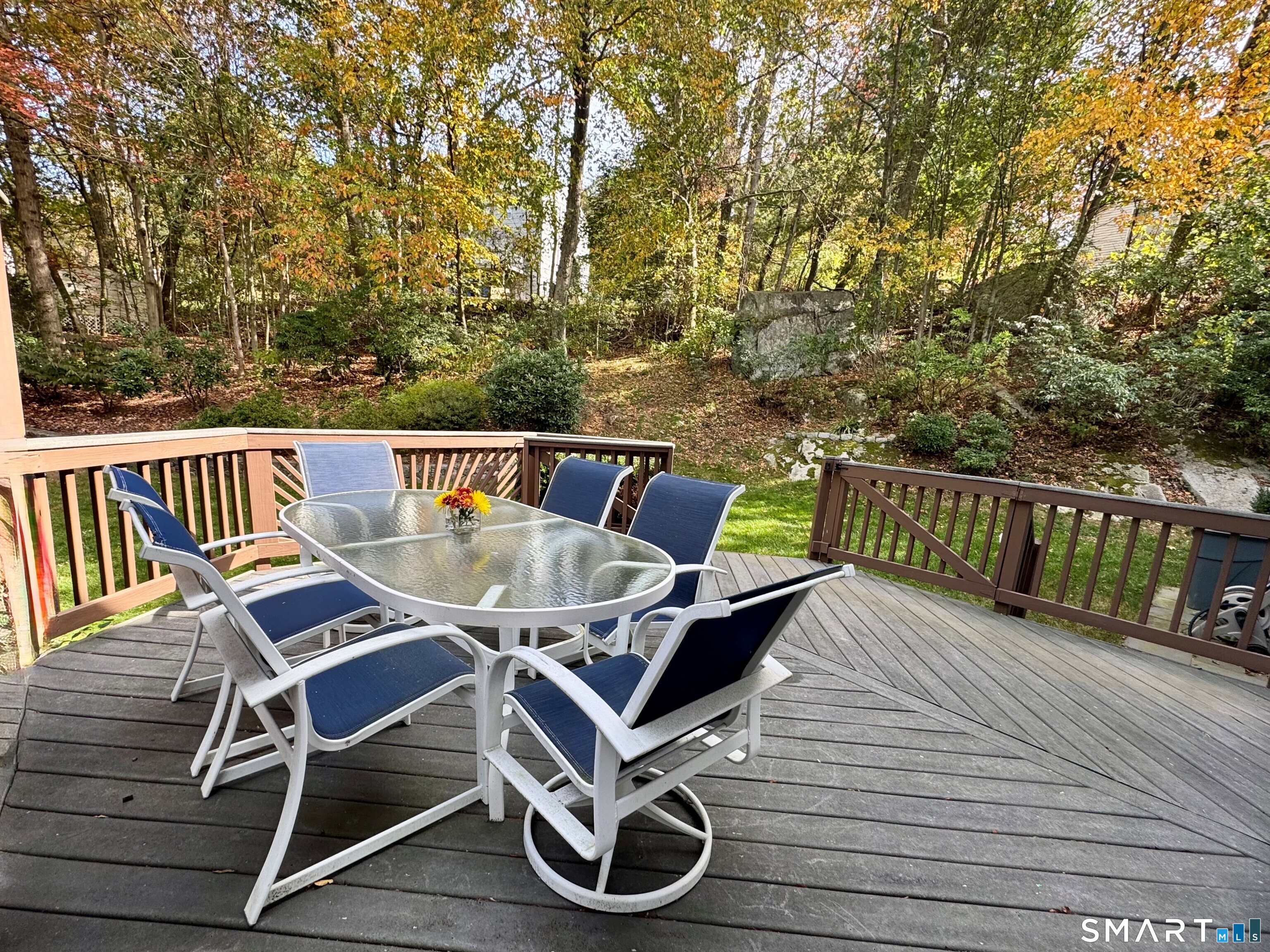 This beautiful Colonial with great curb appeal and striking stonework is perfectly situated in a highly sought-after cul-de-sac neighborhood. The home features a wonderful open floor plan with an elegant living room highlighted by a fireplace and attractive built-ins. The living space flows seamlessly into a beautifully remodeled kitchen with a breakfast bar and a spacious dining area with sliding doors to a large, comfortable deck-perfect for relaxing outdoors. Just off the main living area is a versatile den with a large closet, ideal as a home office or potential fourth bedroom, along with a full bath and convenient first-floor laundry. Upstairs you will find a spacious primary bedroom with a large walk-in closet, two additional generously sized bedrooms, and a full bath. A finished lower level with good storage adds valuable additional living space. List of improvements include: freshly painted interior (2026), roof (2020), driveway (2022), oil tank (2024), front porch (2022), remodeled kitchen, replacement windows, whole-house generator, and invisible dog fence. This well-maintained home offers a convenient location close to highways, shopping, schools, and parks.