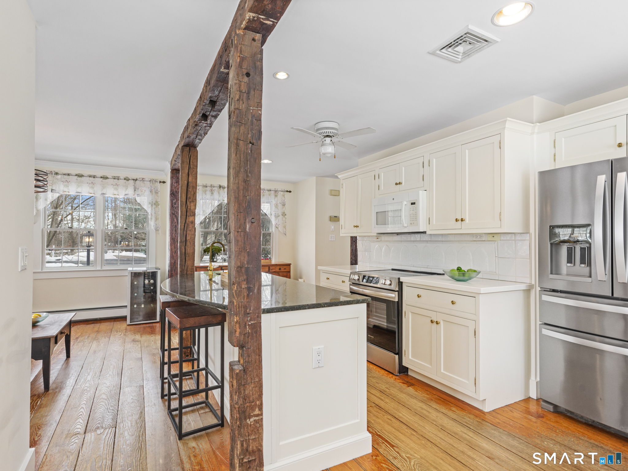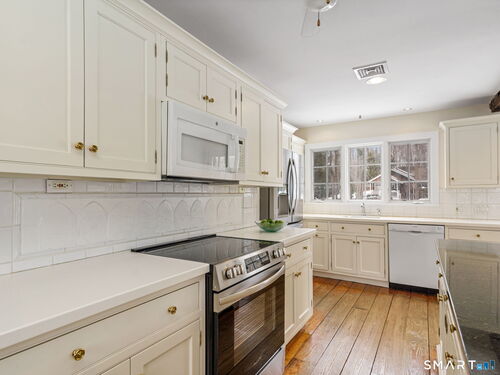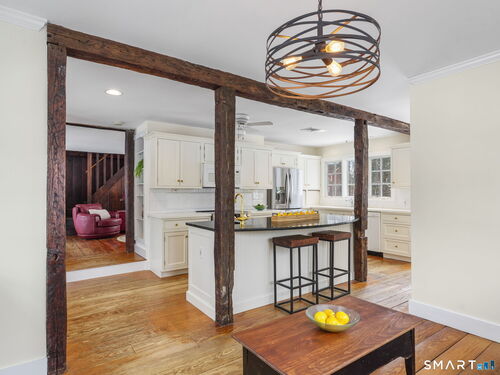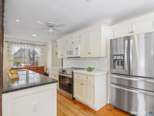 Once Upon a Time....the story of this enchanting Antique begins in 1859. Every magical space combines the charm of history with the ease of modern day. Rustic original hand hewn beams, wide plank hard/soft wood floors, brick fireplace, all drenched in light that adds to the gentle glow and ambience that has welcomed generations. The beautifully renovated Eat in Kitchen is surely the heart of this home, where modern luxury meets timeless charm - gleaming granite island with prep sink and seating, large pantry and counter with appliance garages to help keep surfaces clear. Cozy seating areas to entertain your guests while preparing or for Dining Area. Convenient side door goes directly to powder room and into kitchen for easy grocery unpacking. Brand new Stove/Range. Spacious Living and Dining Room spaces can easily be interchanged, cozy wood fireplace for chilly evenings..flexible living at its best. Doors to a slate patio allow for al fresco dining and morning coffee moments. The Primary Suite with brand new carpet boasts a walk in closet and En Suite Bathroom. Second Floor Laundry is a fabulous convenience. 2 additional Bedrooms with hall bath, one with new carpet offers space for guest or studio, office or nursery. Flat, half acre with storage shed, hot tub, useable backyard and walk to town and train. True walking neighborhood community, Award Winning Wilton Schools and steps away from the Norwalk River Valley Trail, Wilton Historical Society and dining. City Water. A GEM!
