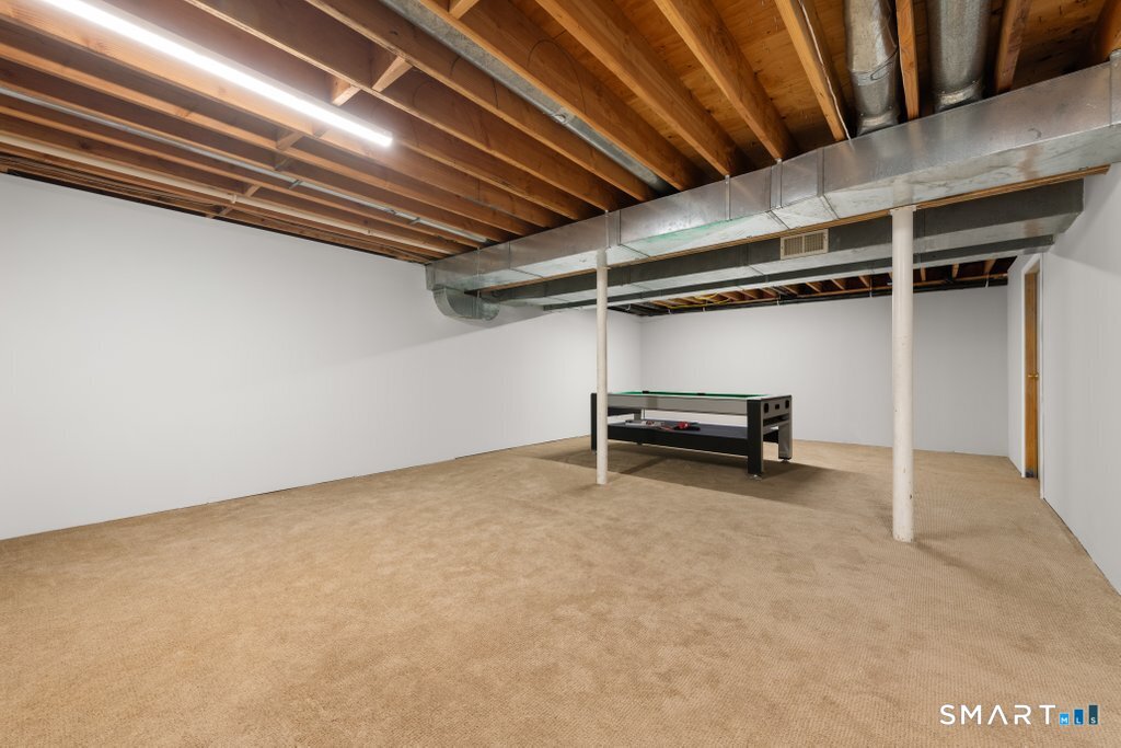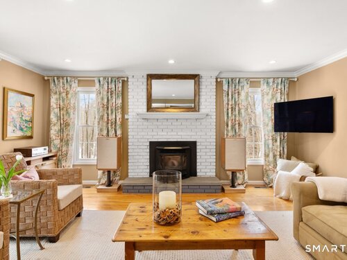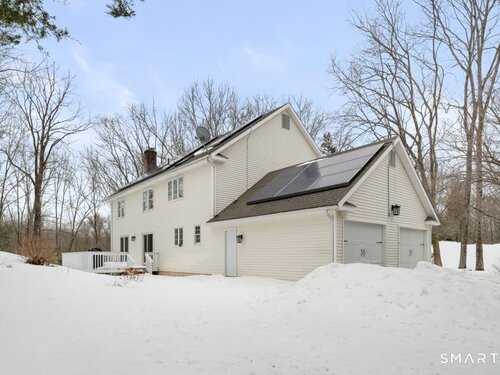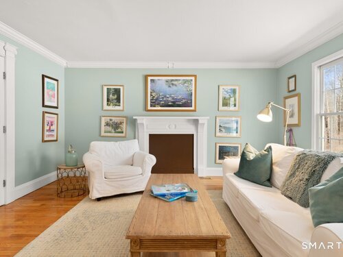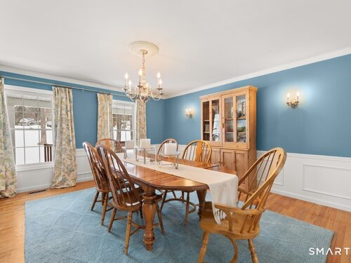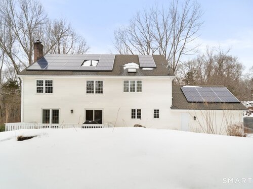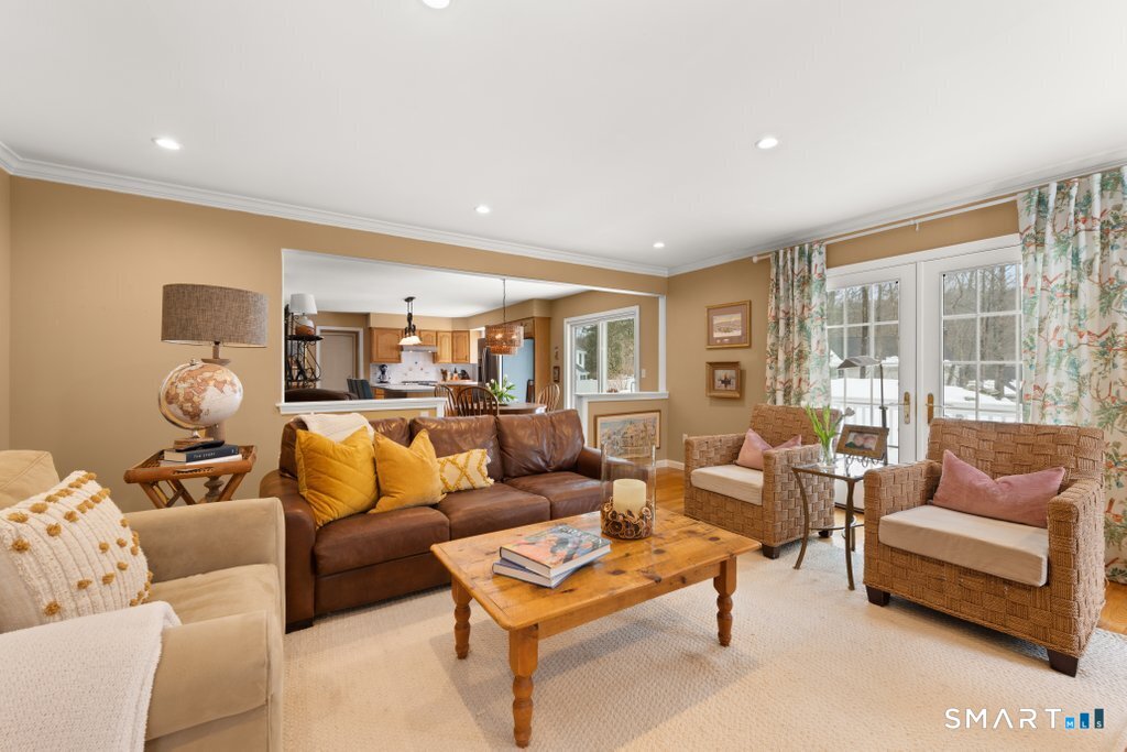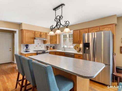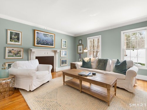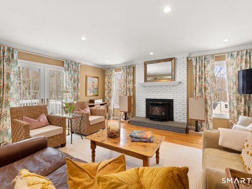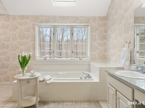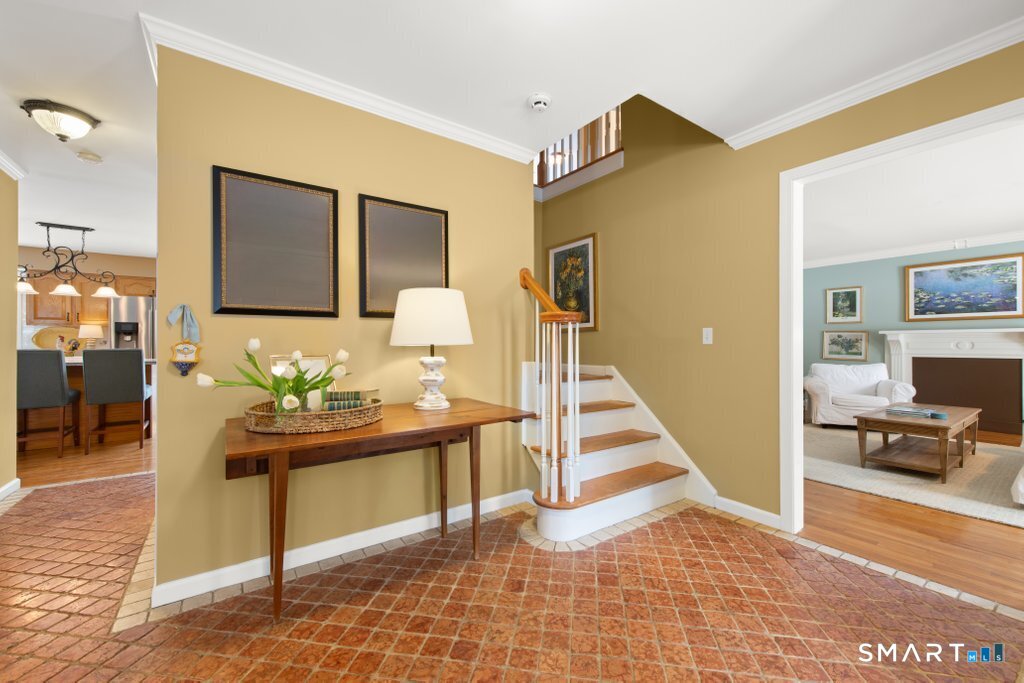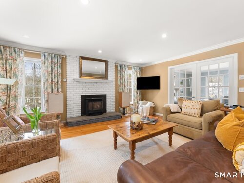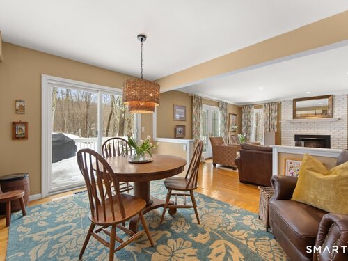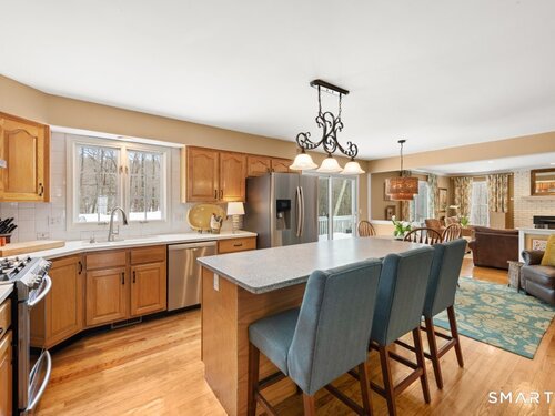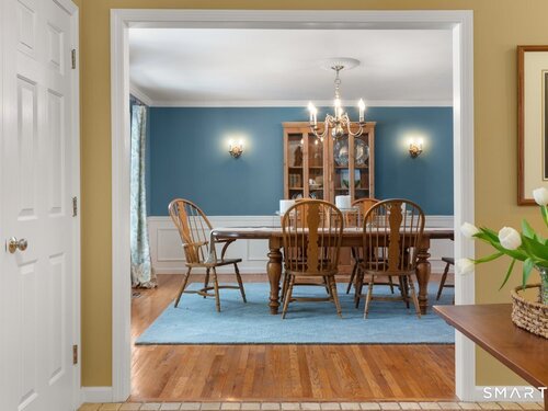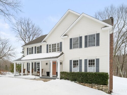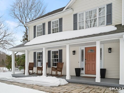 Tucked at the end of a peaceful cul-de-sac with nature bordering the side yard and calming wooded views from the family room, this magazine-designer-inspired 4BR Colonial offers a serene retreat just minutes to Sandy Hook Village. Step onto the welcoming front porch and into beautifully curated spaces made for everyday comfort and entertaining. A tranquil living room is perfect for quiet mornings, while the spacious dining room sets the stage for gatherings. The sunlit eat-in kitchen is the heart of the home, featuring an oversized island, stainless steel appliances, and generous workspace for cooking, hosting, and lingering. Just beyond, the inviting family room warms the space with a cozy pellet stove picturesque views of the woods. A convenient half bath and a spacious, separate laundry room complete the main level. Upstairs, the primary suite is a true escape with a versatile sitting area-ideal for an office, reading nook, nursery, or yoga space. The oversized primary bath feels airy and spa-like with high ceilings and a skylight that fills the room with natural light. Three additional bedrooms with hardwood floors are bright and generously sized, sharing a full hall bath. The lower level offers a potential blank canvas perfect for a rec room, playroom, gym, or movie space. Enjoy outdoor living on the deck and the rare blend of privacy, neighborhood charm, and an unbeatable Sandy Hook location.