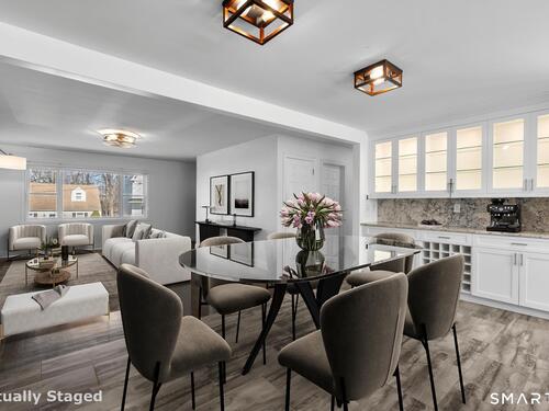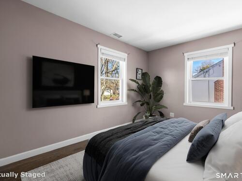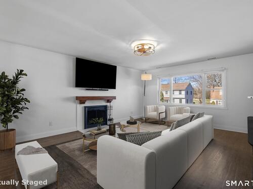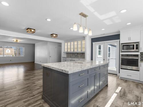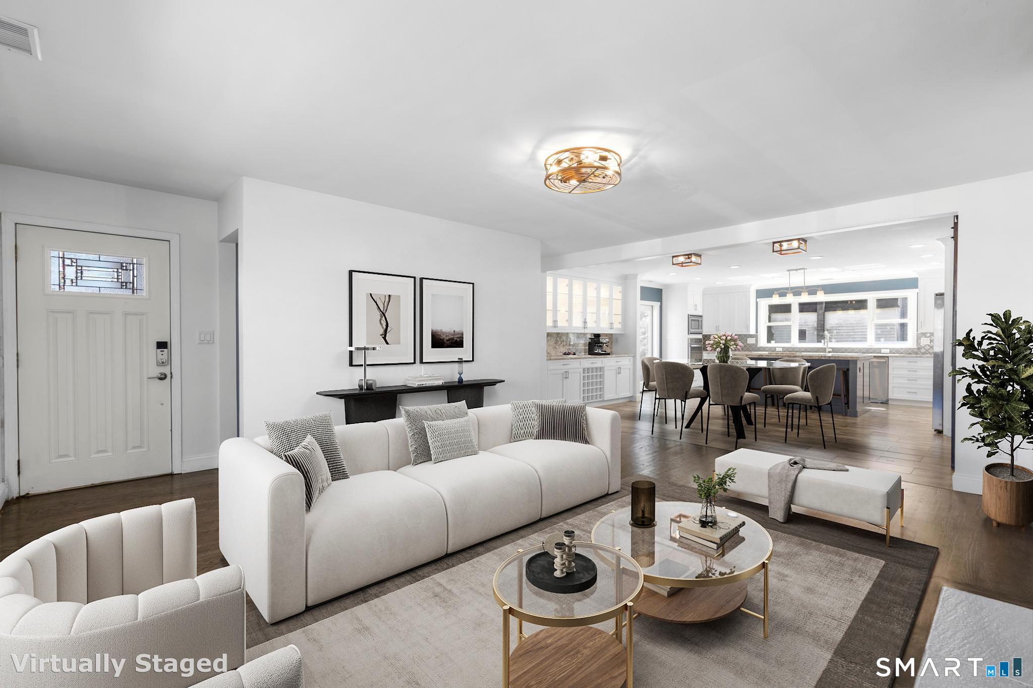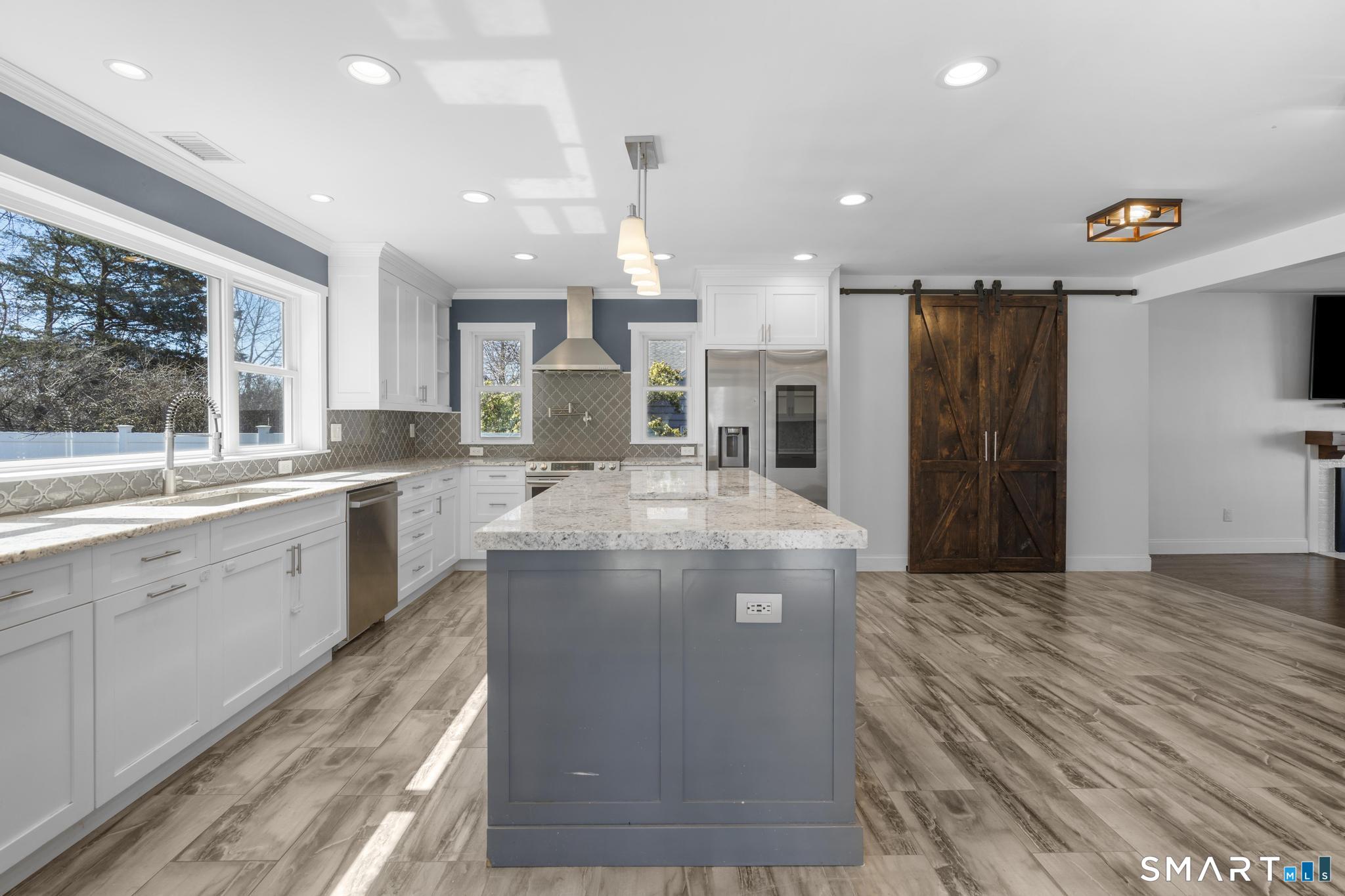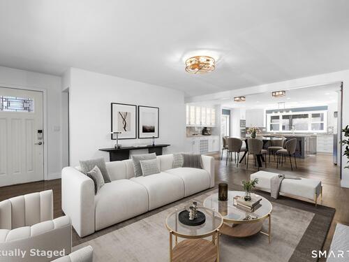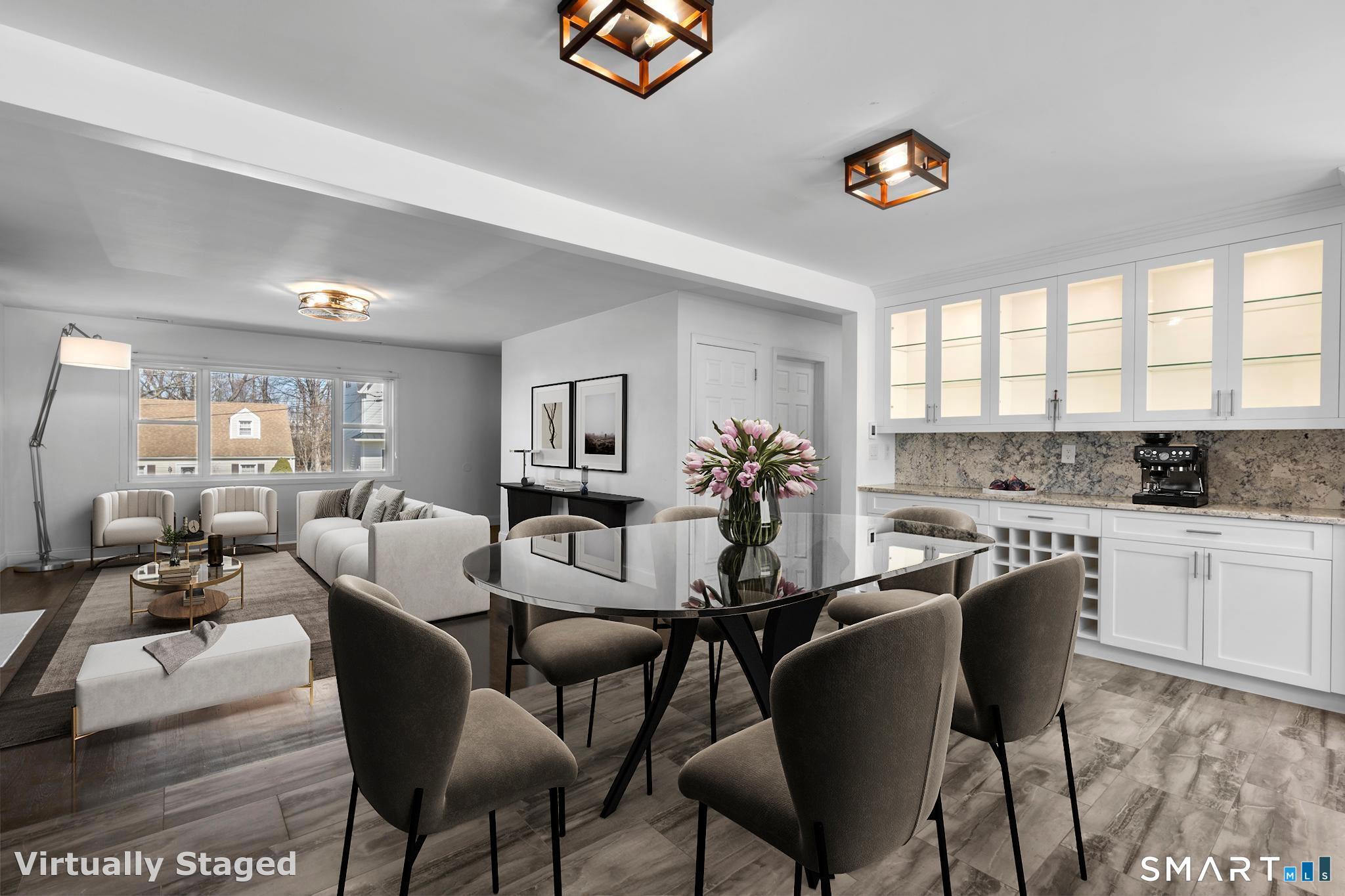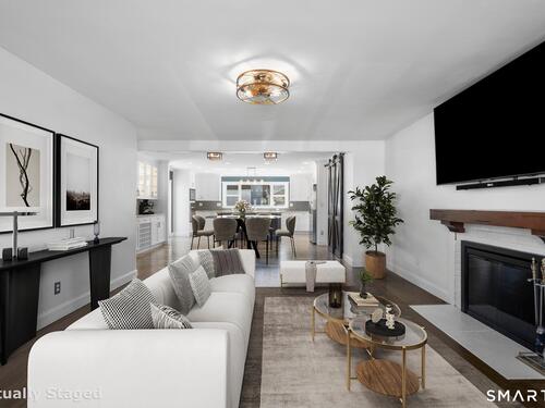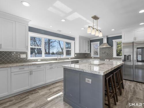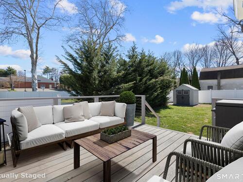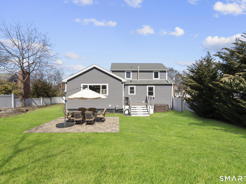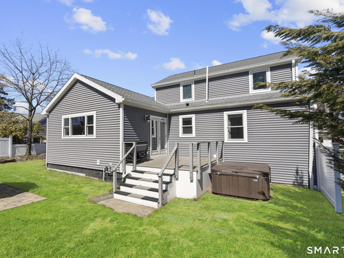 Nestled in Stamford's highly sought-after Waterside neighborhood, this beautifully reimagined 5BR 2.5BA Colonial seamlessly blends timeless charm with sophisticated modern living. The sun-filled main level welcomes you with an expansive living room centered around a stylish fireplace and oversized picture windows, flowing effortlessly into the dining area and stunning state-of-the-art gourmet kitchen featuring custom white shaker cabinetry, premium stainless steel appliances, designer tile backsplash, granite countertops, and an oversized center island perfect for entertaining. Sliders lead directly to a spacious rear deck overlooking the private fenced yard, creating seamless indoor-outdoor living. This level is rounded out by a beautifully renovated full bath, spacious primary bedroom, and two additional well-proportioned bedrooms, all complemented by hardwood floors and refined finishes throughout. The upper level offers exceptional flexibility with two additional bedrooms and a full bath set apart enough to function as an ideal in-law suite, guest quarters, or private home office retreat. The fully finished lower level provides additional living space perfect for a family room, media room or gym. Outside, enjoy a large level fenced yard complete with deck, hot tub, firepit area, and storage shed, ideal for relaxing or entertaining. Perfectly positioned just moments from Stamford's waterfront, beaches, parks, Metro-North, and vibrant downtown dining and nightlife!