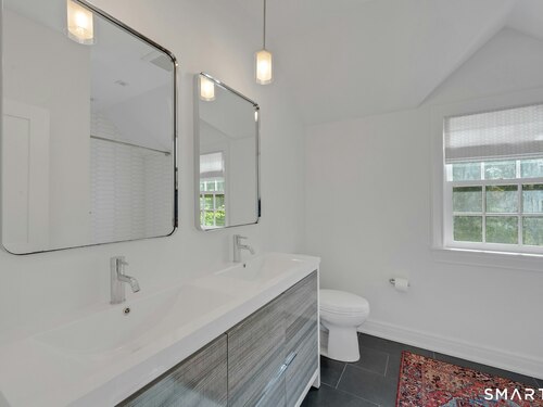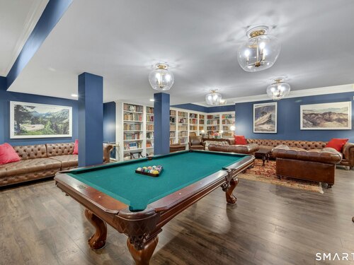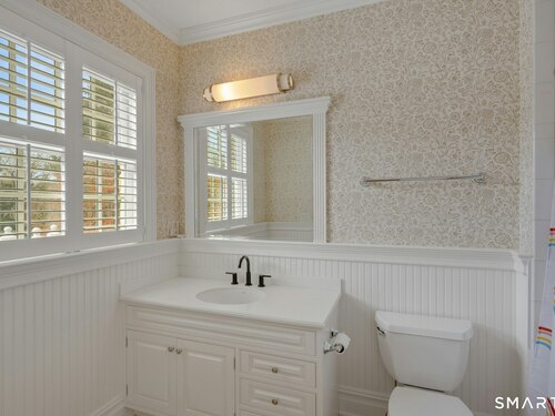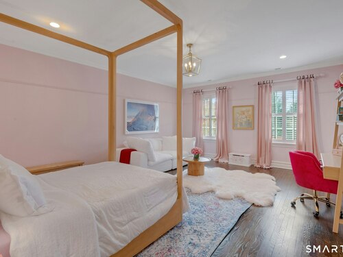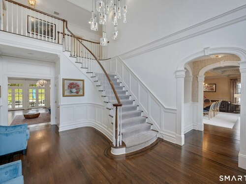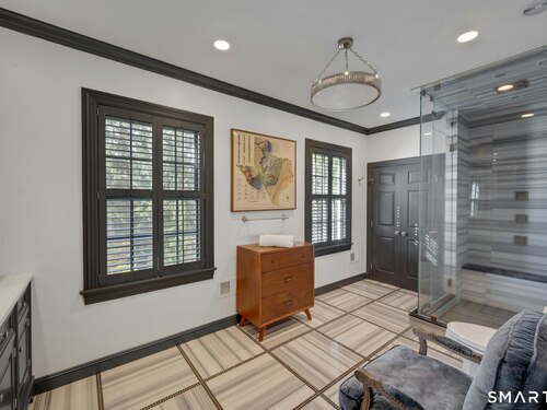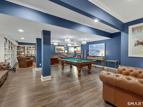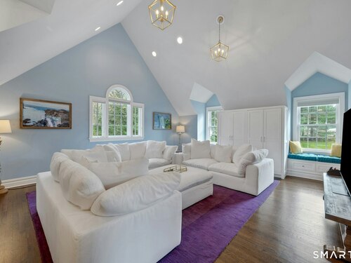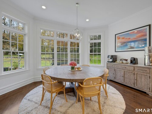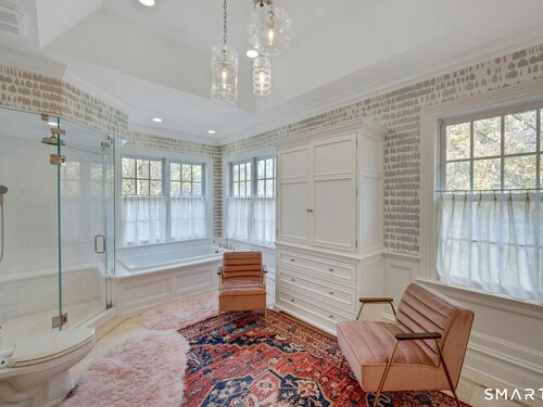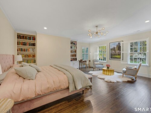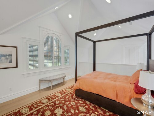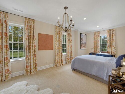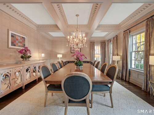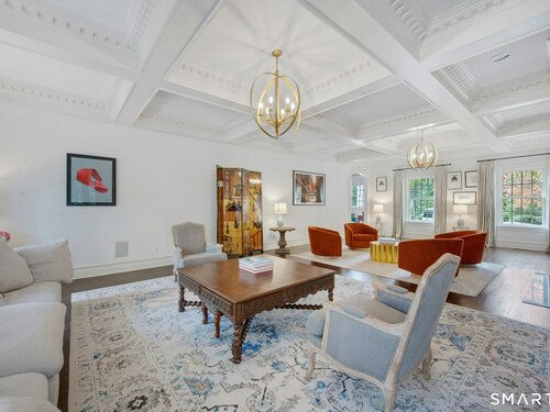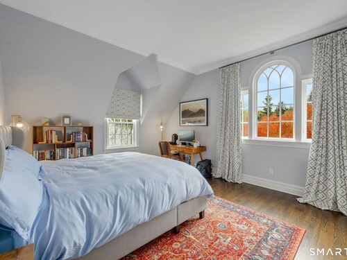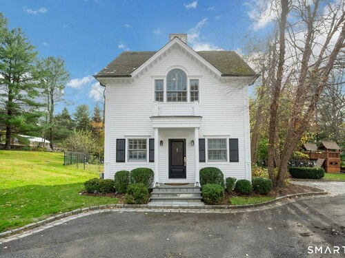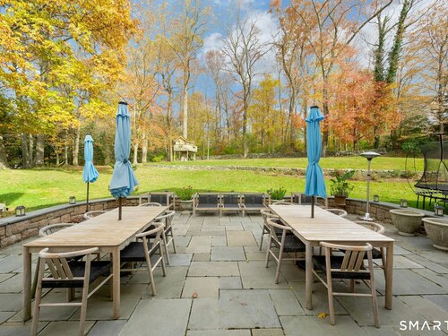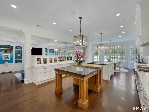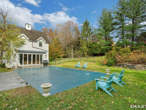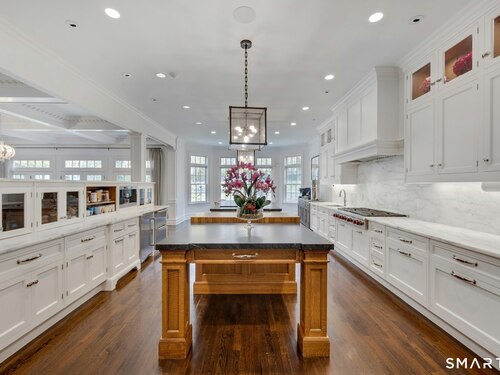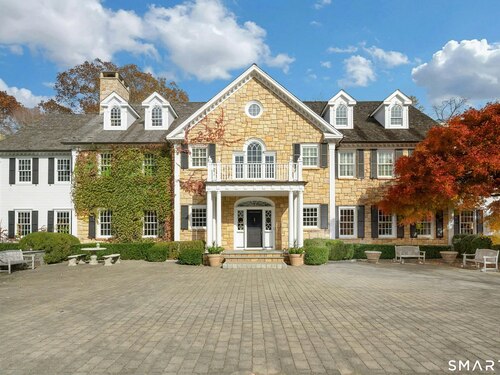 Tucked away on over seven quiet acres off prestigious Round Hill Road, this private estate offers a serene blend of luxury, space, and style. The main residence is complemented by a beautiful pool/guest house designed for effortless entertaining and resort-style living. At the heart of the home, a Christopher Peacock kitchen showcases statuary marble countertops and backsplash, double islands, and professional-grade appliances, all centered around a custom command station with built-in desk and storage. The kitchen opens seamlessly to a sun-filled family room with bespoke cabinetry, creating the perfect setting for relaxed gatherings. The first floor also features a front-to-back living room, elegant dining room, inviting home office, and private en-suite guest suite.