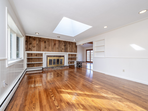 Skylight, Book Shelves, Fireplace, Hardwood Floor