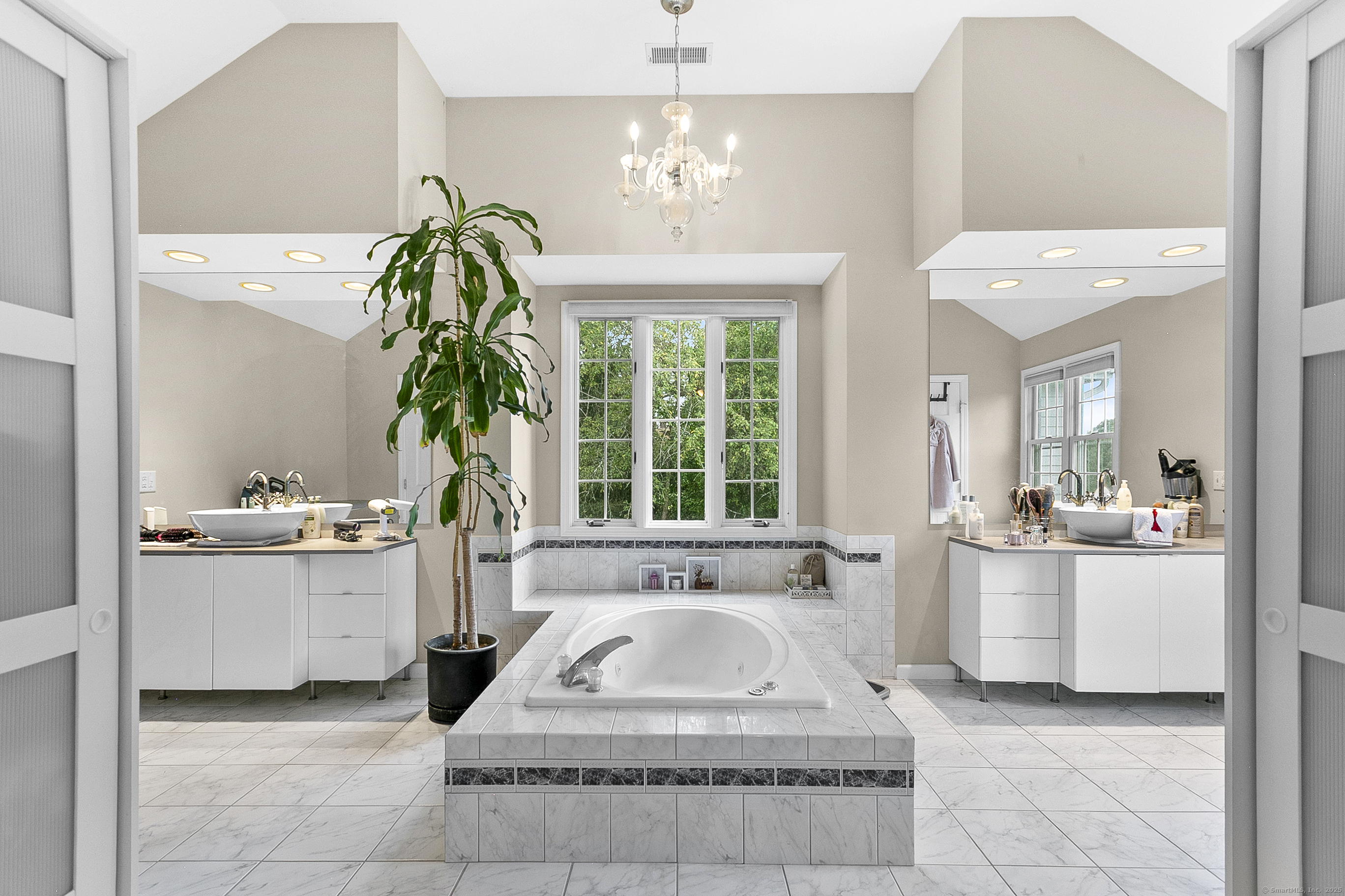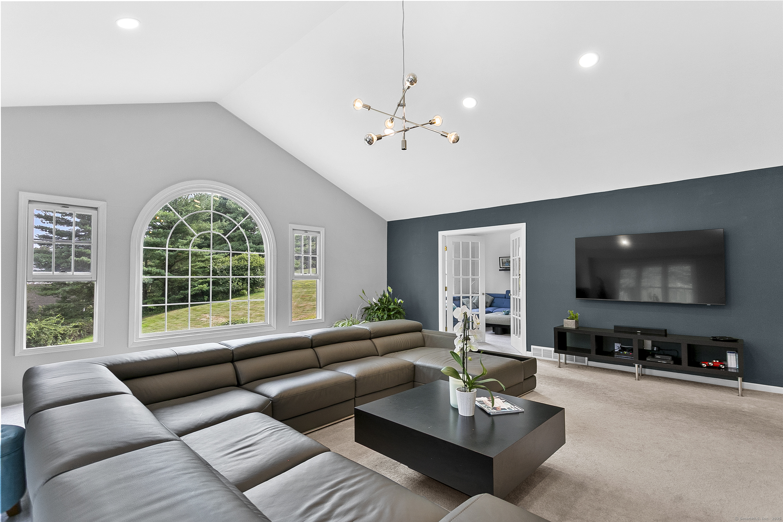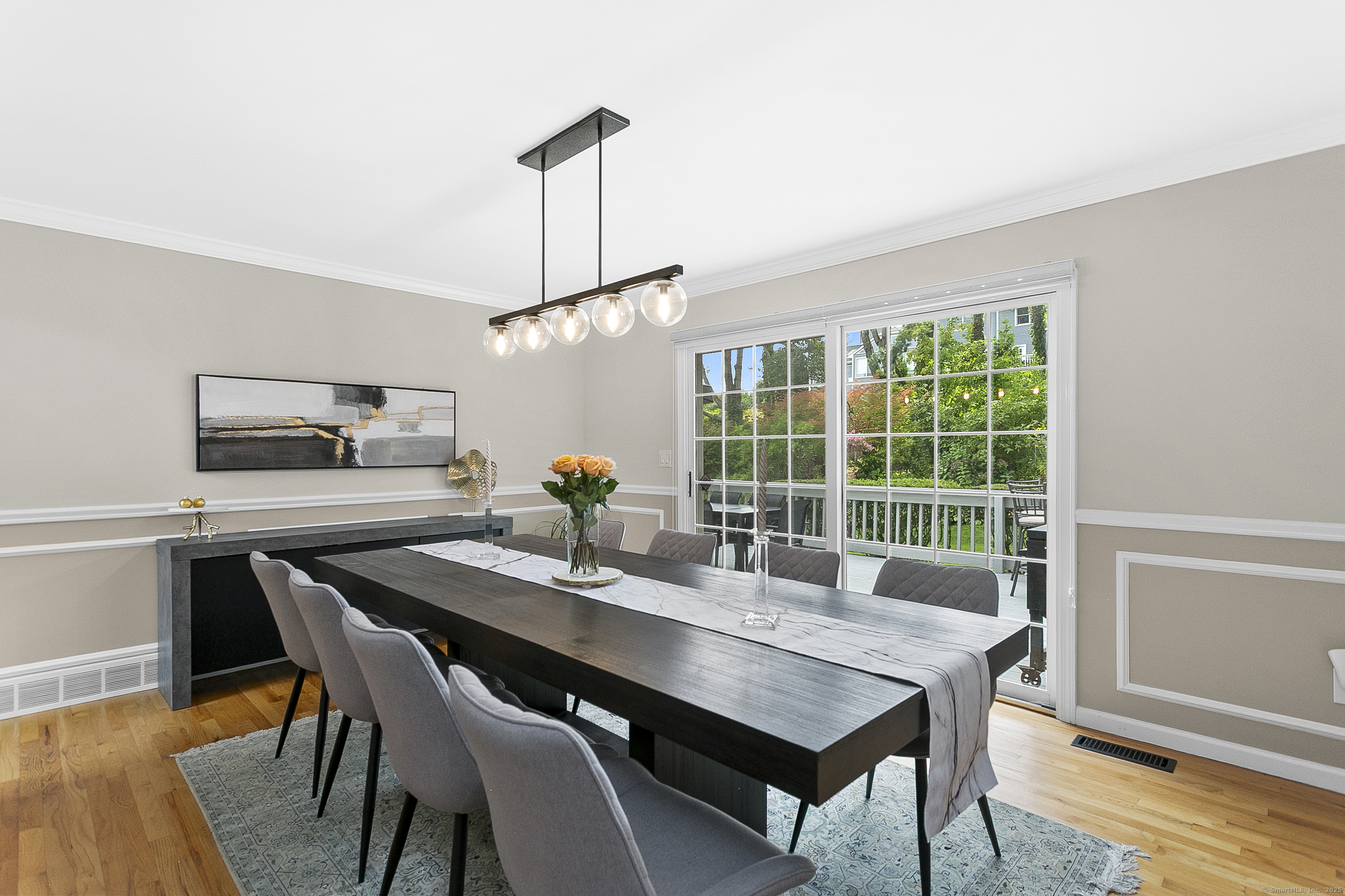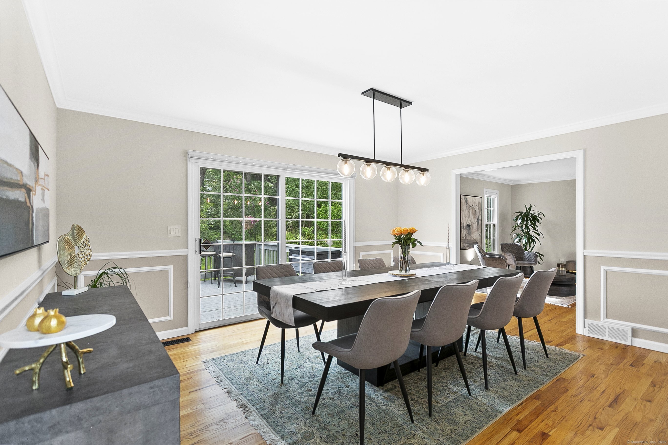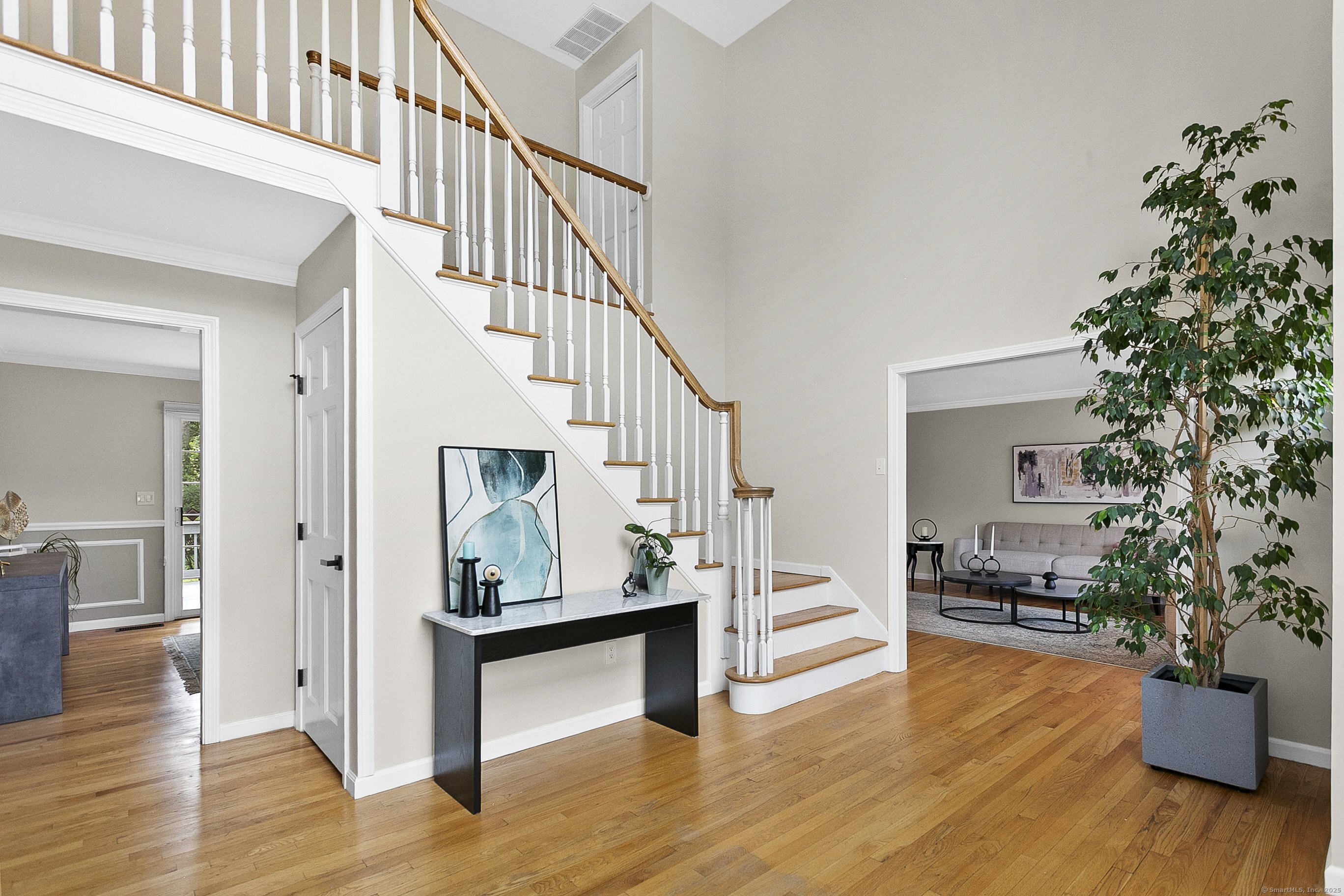 Welcome to a gracious 4,287-sq-ft, 5-bed, 4.5-bath home designed for hosting and everyday ease-set on a private 1-acre lot in Trumbull, tucked away yet 3 minutes to Rt. 25 and connected to Tashua School (K-5), with gas heat and potential space for a future pool. The heart of the home is a massive, chef-ready kitchen with counter bar, cafe bar, twin ovens, and a sunny breakfast nook. It flows and connects to a spacious dining room and out to a rear deck and fire-pit patio-seamless indoor-outdoor entertaining. A secondary pantry doubles as a smart laundry/utility zone to keep cleanup out of sight. An oversized powder room and a welcoming foyer-overlooked by a balcony and statement chandelier-complete the arrival experience. A huge family room with fireplace opens to a large sunroom/office for comfortable living. The first-floor guest suite offers privacy with an en-suite bath and dedicated storage. Upstairs, the vaulted-ceiling primary suite features a bath with dual vanities and a jetted soaking tub. Bedroom 3 includes its own en-suite; Bedroom 4 is served by a twin-sink hall bath. Downstairs, lower level expands your living space and connects to a utility room and an attached three-car garage. Attic storage adds convenience. Nicely done circular driveway, Thoughtful and thorough landscaping ties the outdoor zones together.