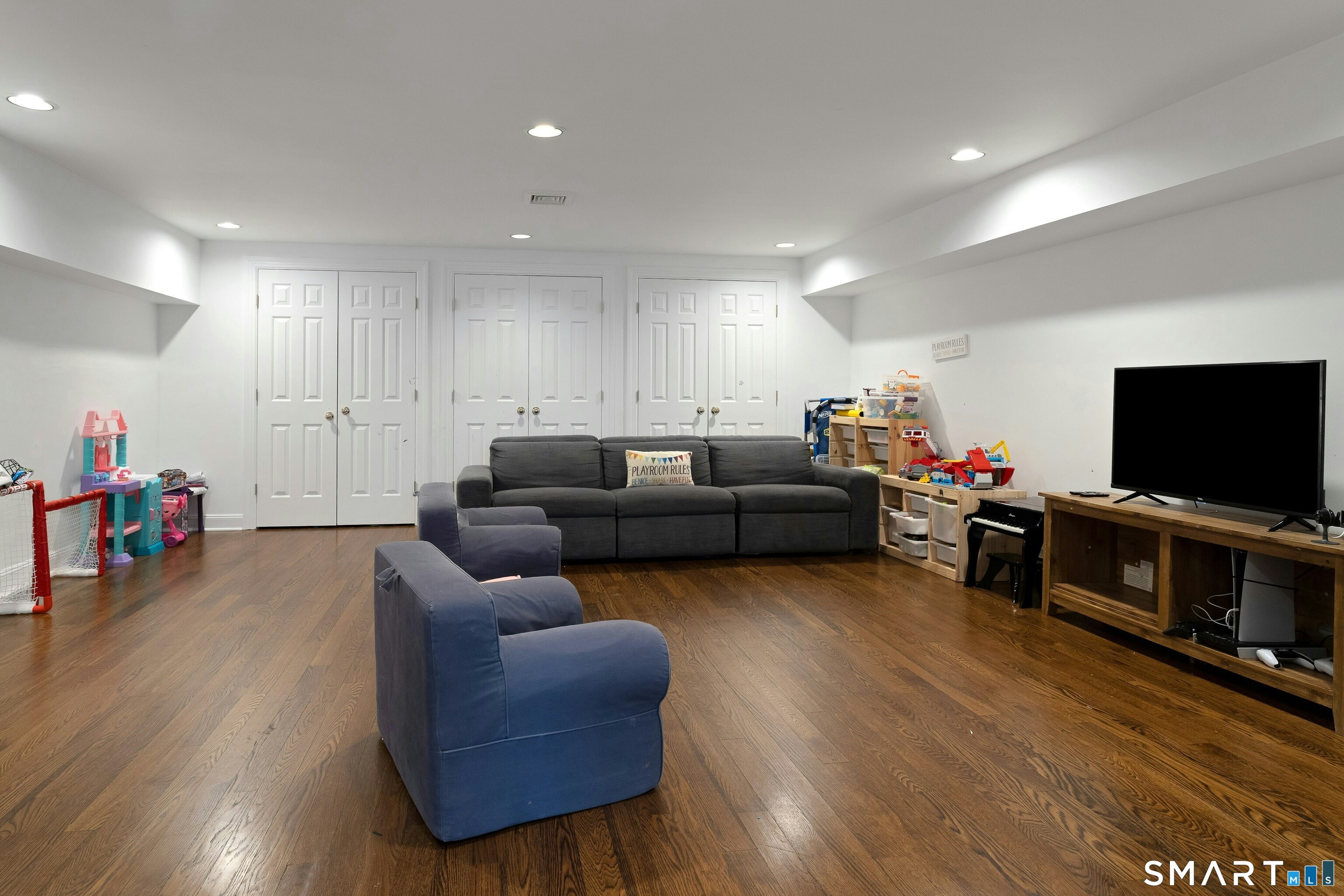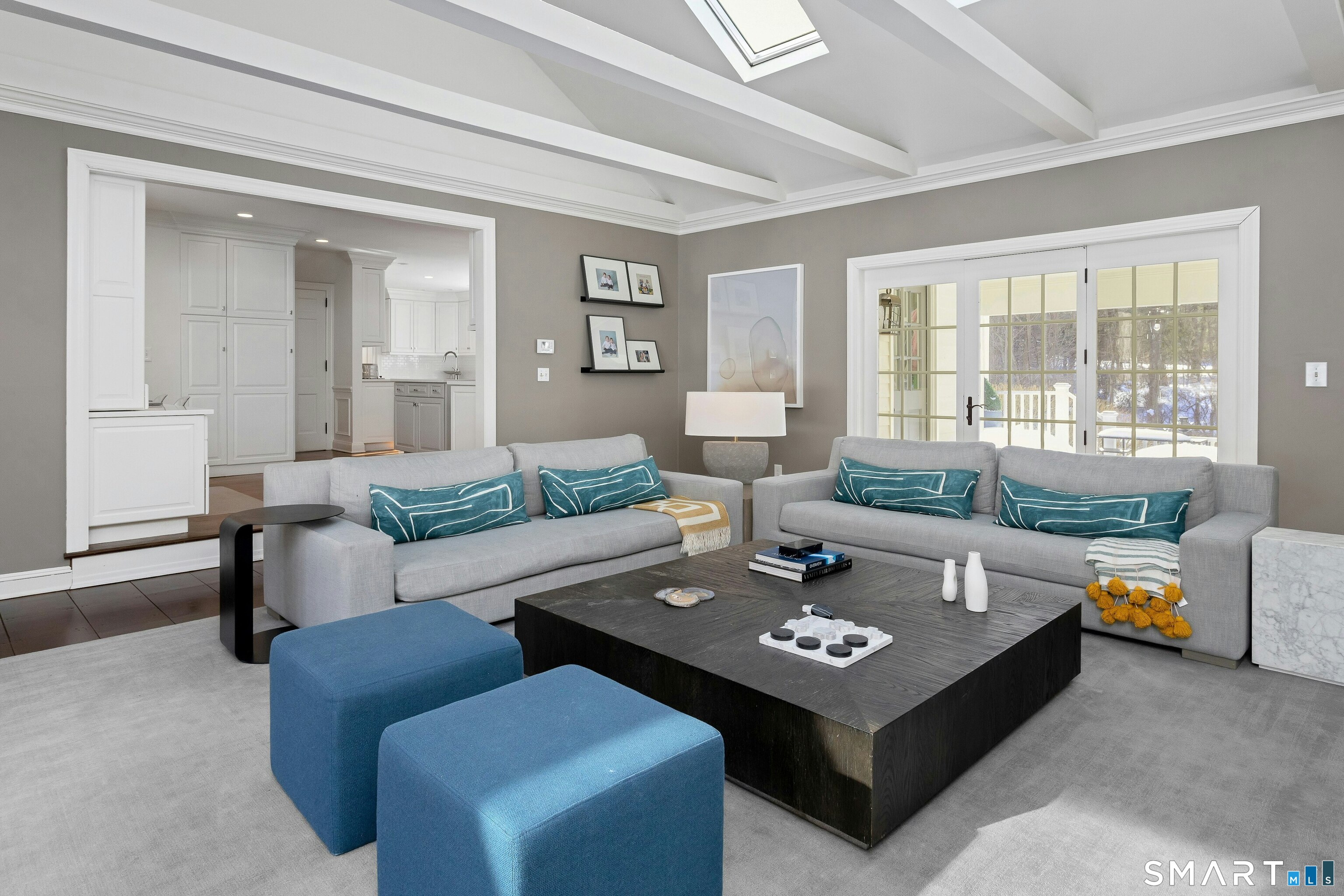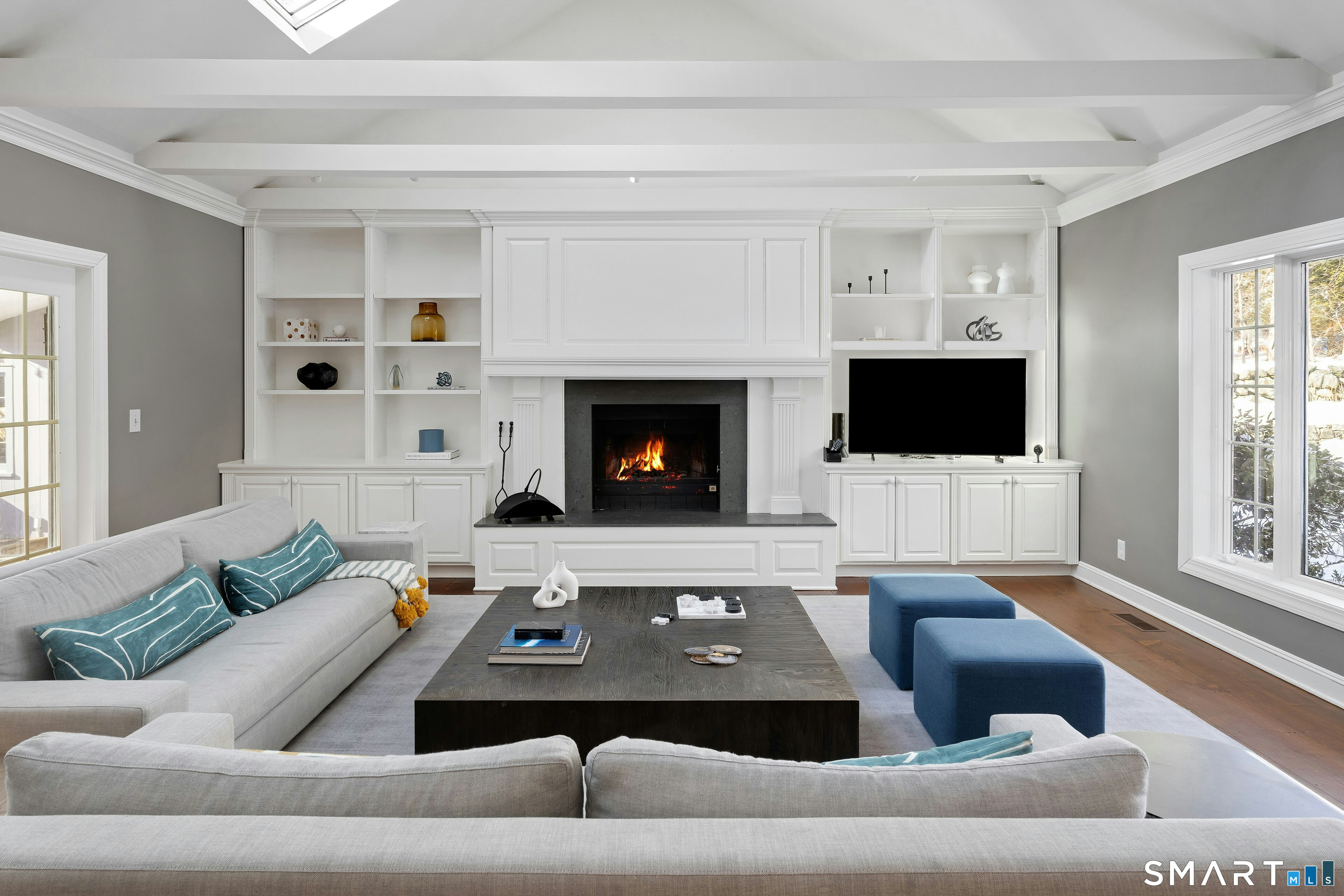 Skylight, Vaulted Ceiling, Built-Ins, Fireplace, French Doors, Hardwood Floor