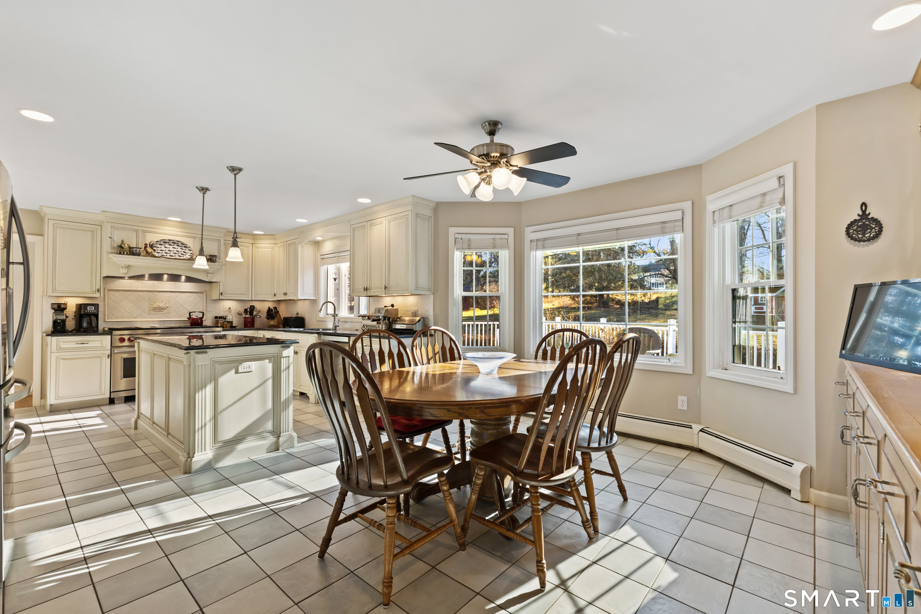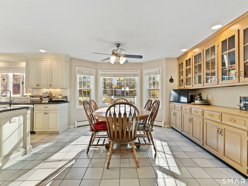 Built-Ins, Ceiling Fan, Granite Counters, Dining Area, Island, Tile Floor