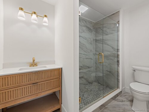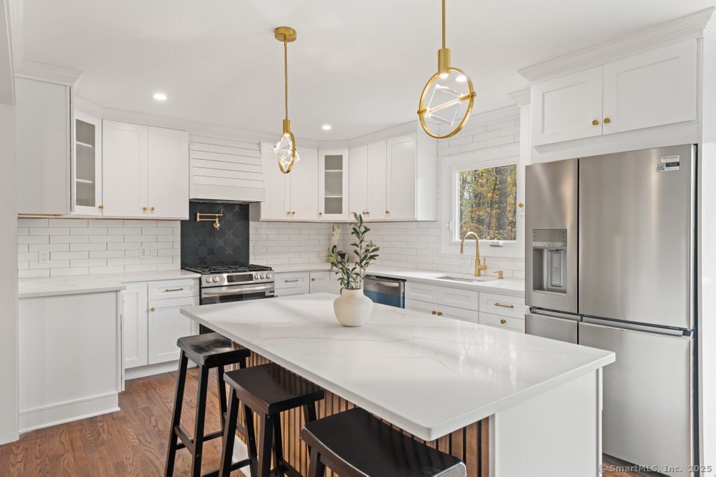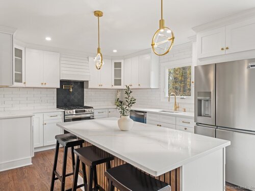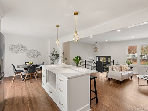 Crisp white siding and clean lines welcome you to this fully remodeled Shelton home. Step inside and notice the statement-making metal stair rail-modern, sturdy, and instantly memorable. The welcoming sunlit living area flows to an expansive, on-trend kitchen featuring a large island, stainless steel appliances, abundant cabinetry, pot filler and a generous dining area. Slide open the glass door to a brand-new Trex deck; envision meals and morning coffee, overlooking the level, private yard. The private primary suite feels calm and current, with a well-appointed bath complete with a custom glass shower door, stylish tile, and a sleek vanity. Two additional bedrooms share an updated hall bath with a tub/shower combo and thoughtful finishes. Need more space? The walkout lower level delivers a true bonus: a large family room with windows, a half bathroom, laundry area and a slider to the patio for easy yard access-media, play, or guest overflow made simple. An oversized two-car garage is spotless, fresh, and storage-ready. Major Systems, lighting, and fixtures have been updated for move-in ease. Enjoy all this and a low mill rate that helps keep carrying costs in check; plentiful parks and riverfront recreation (with Indian Well State Park nearby); quick access to Route 8, the Merritt, and I-95; and convenient Metro-North connections for commuters. Dining, shopping, services-it's all close. Modern remodel, indoor-outdoor lifestyle, central location: New Driveway In Process