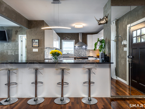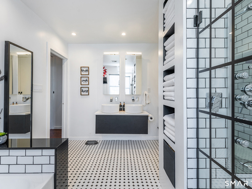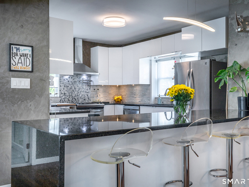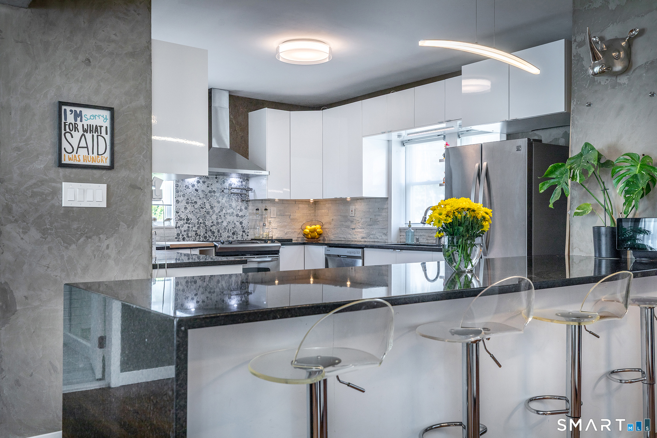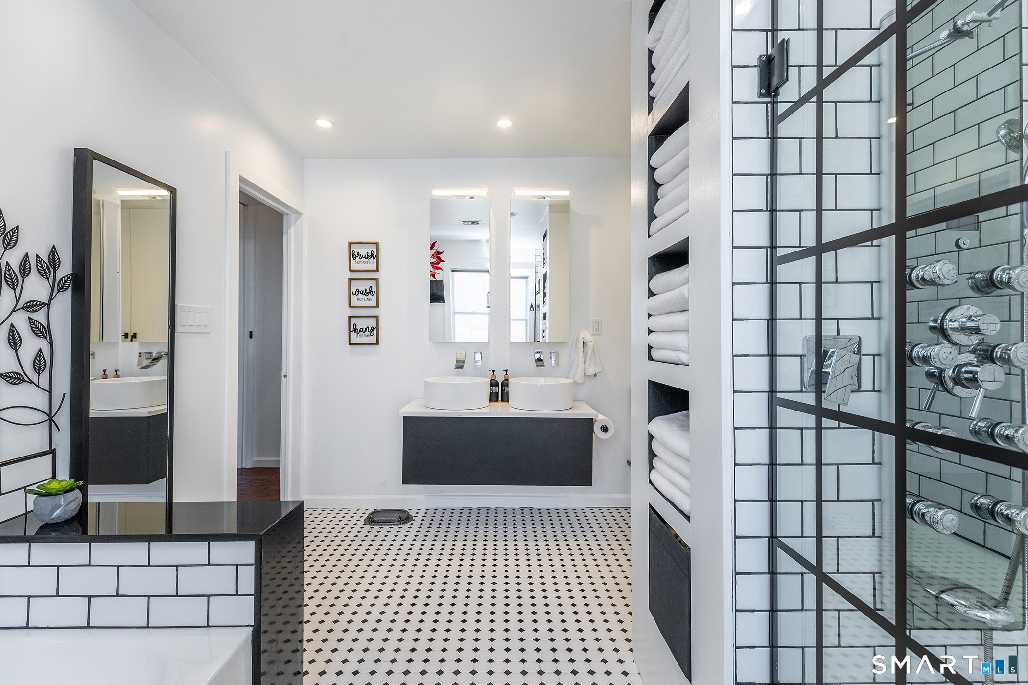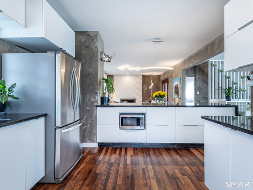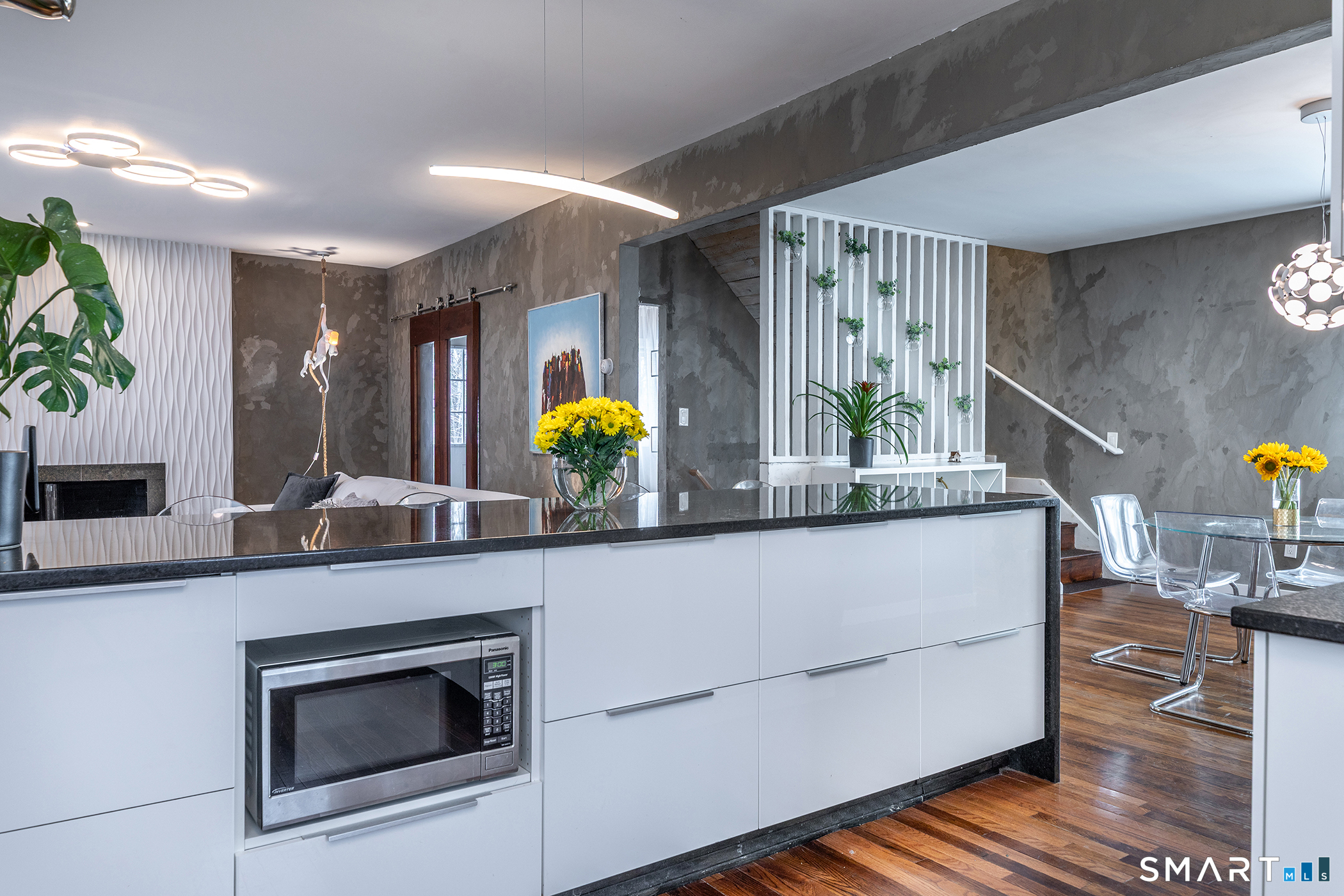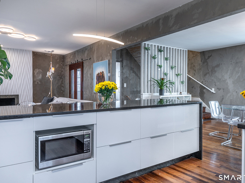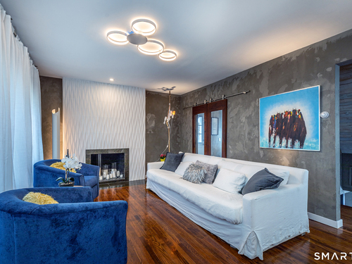 This is a Show-Stopper!!! Presenting 4 Darien Road; an exquisitely reimagined residence that pairs refined modern design with an artful sense of warmth, comfort and sophistication. Beautifully curated interiors, custom finishes, and a seamless blend of texture, light and proportion create a home of exceptional character and style, where every space feels both striking and effortlessly livable. The open floor plan of the main level unfolds with ease, offering a dramatic living room with sleek fireplace feature, an elegant dining area and a designer kitchen appointed with crisp white cabinetry, granite countertops, stainless steel appliances and distinctive tiles. An expansive peninsula with seating anchors the space and encourages gathering, while thoughtful lighting and textural wall treatments set a refined, gallery-like tone. A full bath, dedicated office space and a bonus den provide dedicated living spaces for all the family. Upstairs, the private quarters are anchored by a gracious primary suite reminiscent of a boutique hotel, showcasing a soaring ceiling, richly paneled accent wall and generous walk-in closet space. The adjoining spa-inspired bath features a glass-enclosed shower, deep soaking tub, dual floating vanities and chic monochrome finishes, complemented by 3 additional well-proportioned bedrooms. The lower level expands the home's livability with a stylish lounge area, abundant storage and a thoughtfully designed laundry room with ample work surfaces.