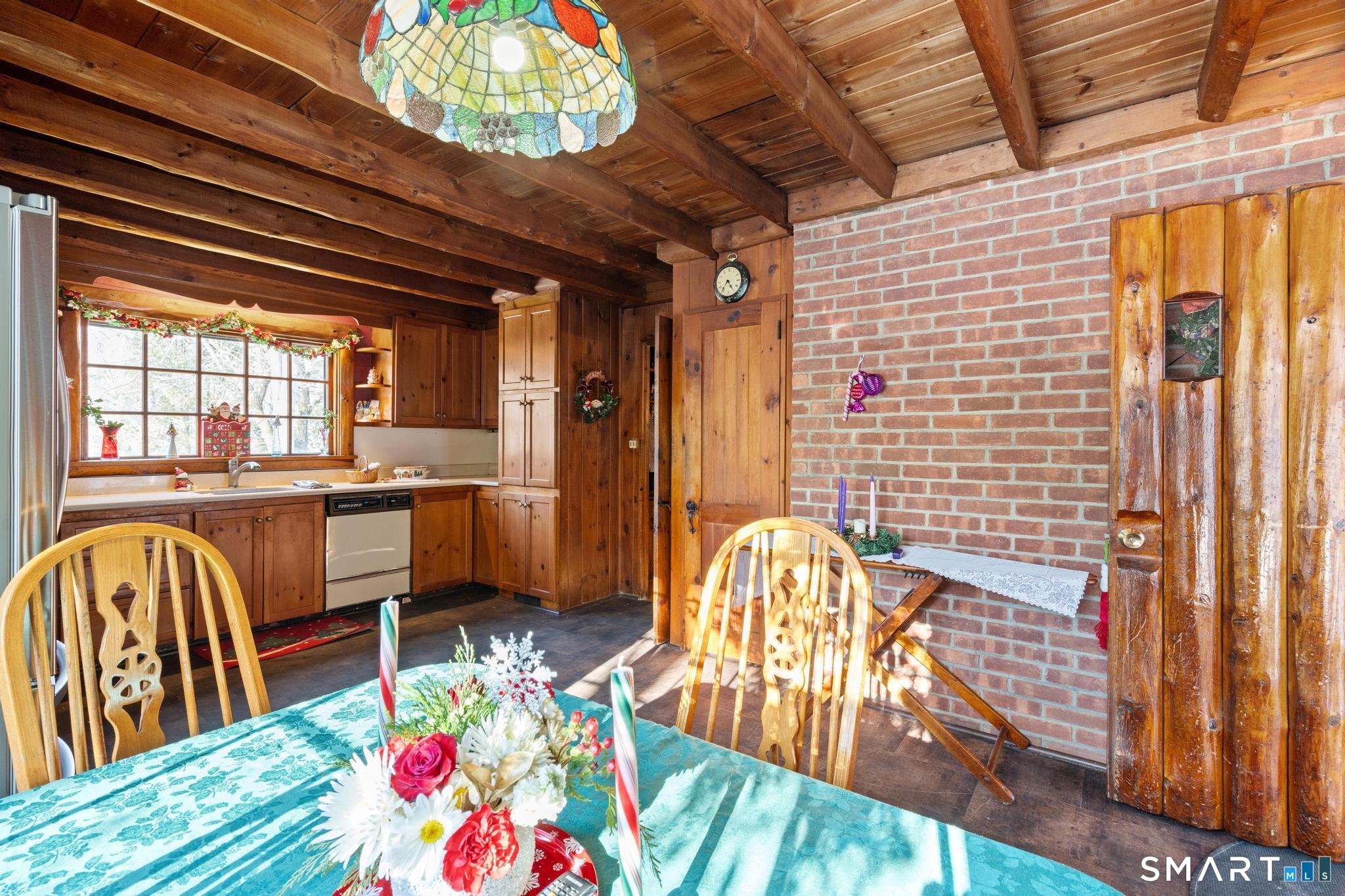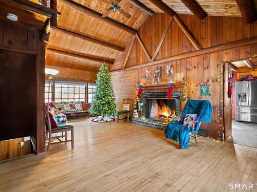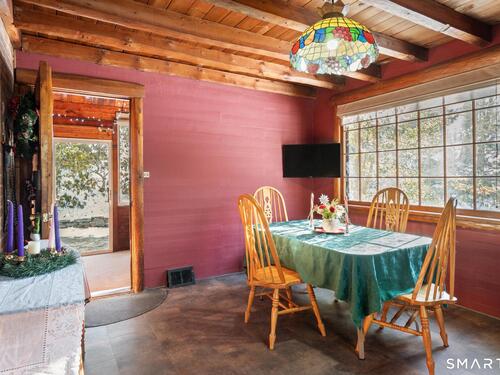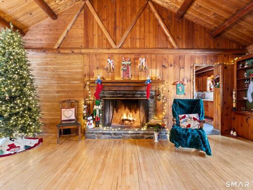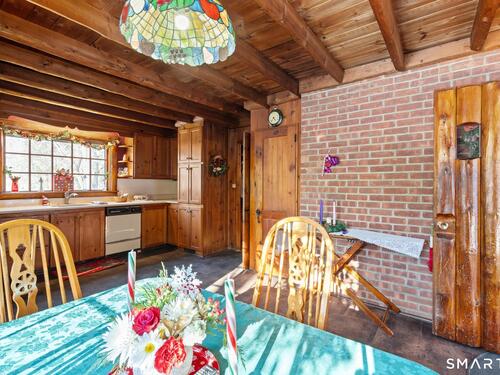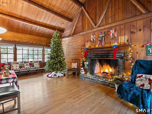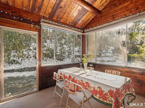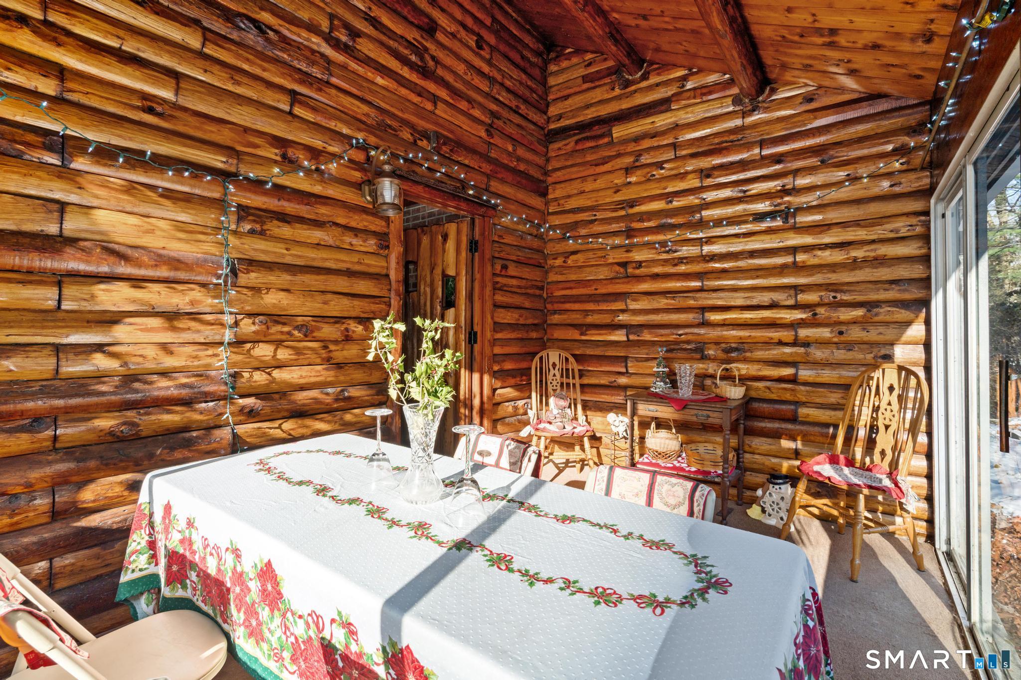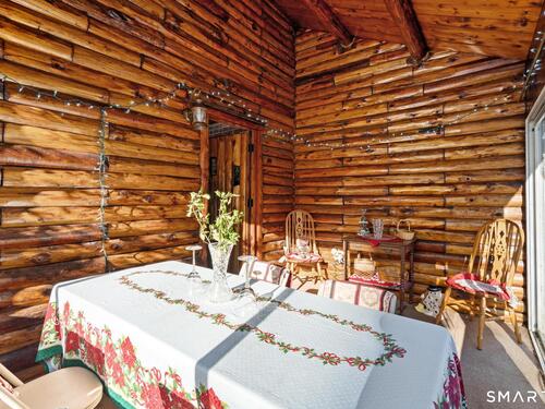 Tucked away on a private road, 4 Rowledge Pond Road offers a rare opportunity to own a true log cabin retreat with picturesque views of Rowledge Pond. This 3-bedroom, 2-bath home blends rustic charm with everyday comfort, featuring warm wood interiors, exposed beams, and inviting living spaces that capture the essence of cabin living. Enjoy shared access to the lake, perfect for fishing, swimming, kayaking, and entertaining, making this a truly special place to call home. Large windows frame tranquil pond views and fill the home with natural light, while the open living and dining areas create an easy flow for both relaxing and entertaining. Each bedroom offers a cozy escape, and the two full bathrooms provide convenience for guests or everyday living. The home is topped with a durable metal standing seam roof, offering longevity and low-maintenance appeal. Additional highlights include ample storage in the walk-in attic and a finished lower level with in-law setup potential. Step outside to the bluestone patio off the back sunroom and enjoy the peaceful setting, ideal for morning coffee, evening sunsets, or simply taking in the natural surroundings. Located just minutes from Sandy Hook Village, shopping, dining, and commuter routes, this unique property delivers an ideal balance of privacy, character, and location.