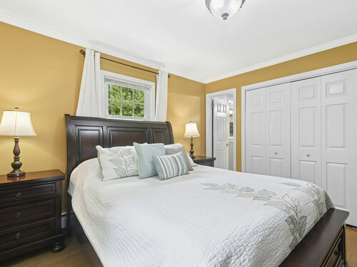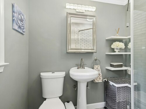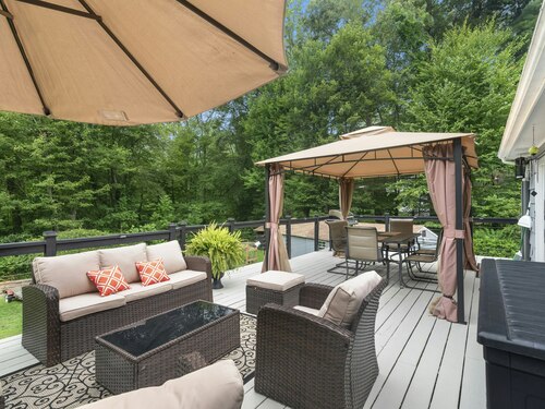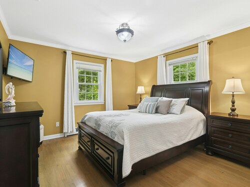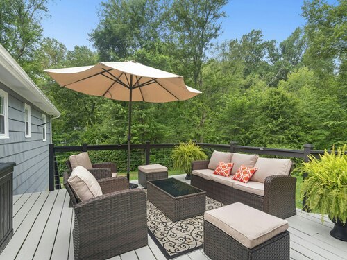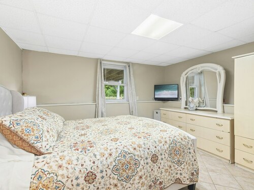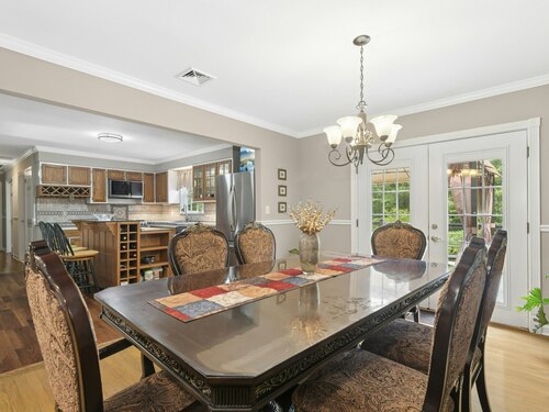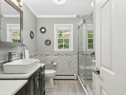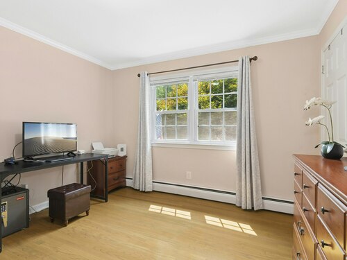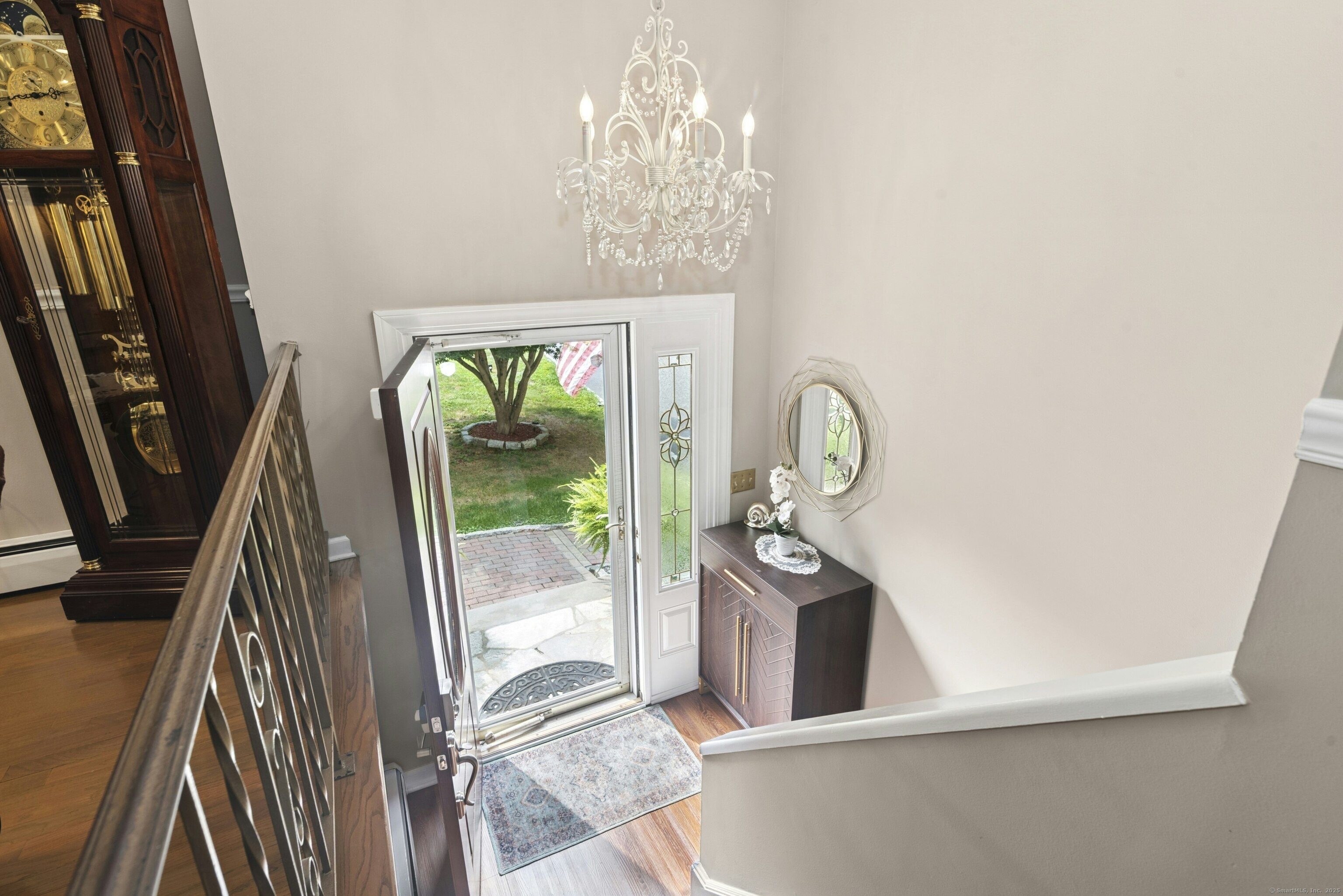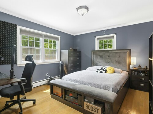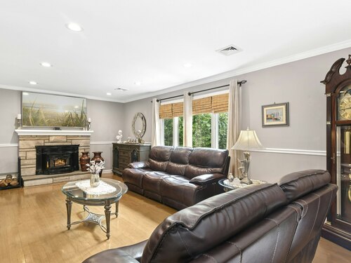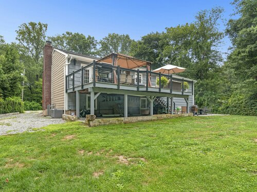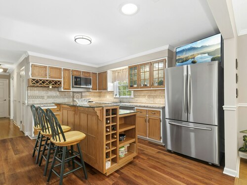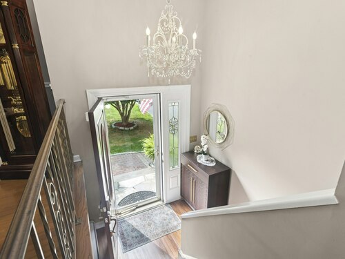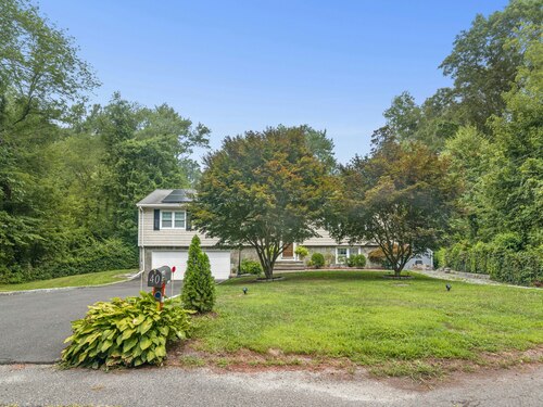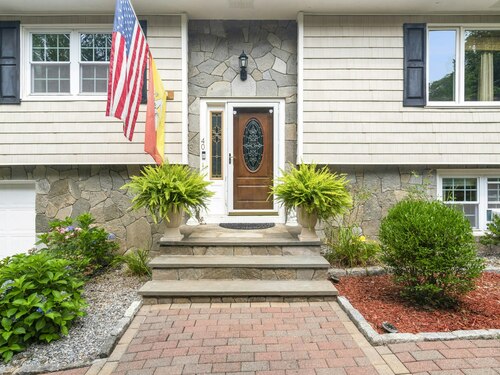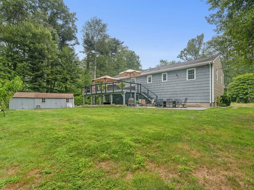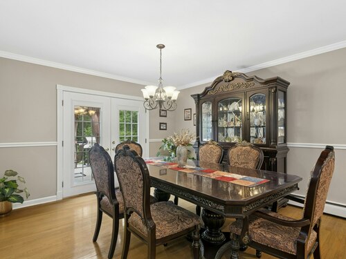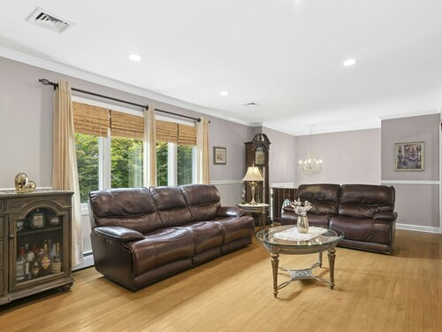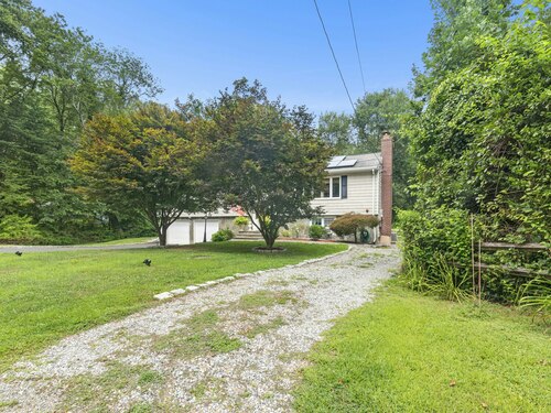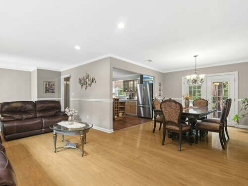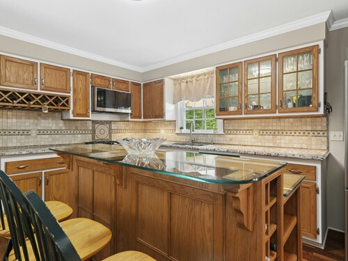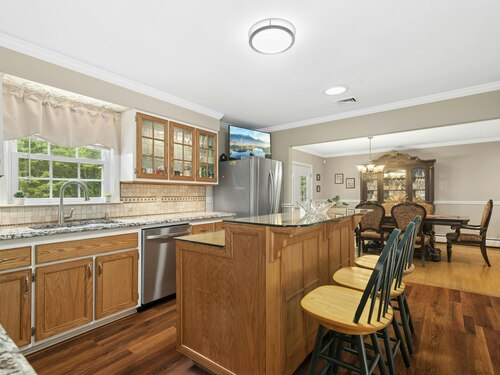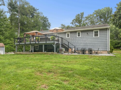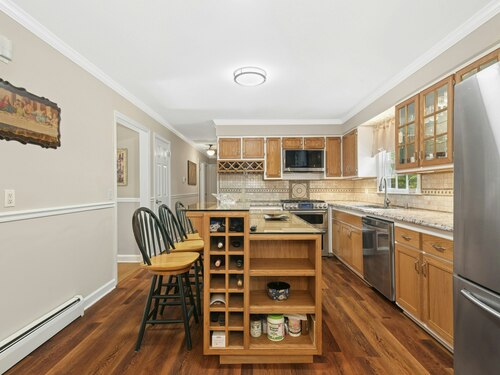 Welcome to this beautifully updated and impeccably maintained Raised Ranch, offering 6 spacious rooms, including 4 bedrooms and 3 modernized baths. Open floor plan to newer kitchen with breakfast bar island, w/glass counters, refinished cabinets w/glass fronts, granite countertops & tile backsplash, and stainless steel appliances. Dining area with French doors to expansive deck. Gleaming hardwood floors flow throughout the main level, adding warmth and elegance to every room. There is a Wood Burning stove in Living room. Pride of ownership shines through in every detail of this Home. The expansive lower level features a family room with stylish tile flooring---perfect for entertaining & relaxing. Be sure not to miss 4th Bedroom with Potential for in-law suite or home office in the lower level. Conveniently located near schools, shopping, parks, and recreational amenities, this home blends comfort, style, and practicality in an ideal setting.