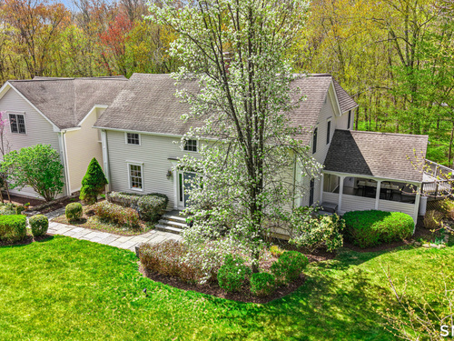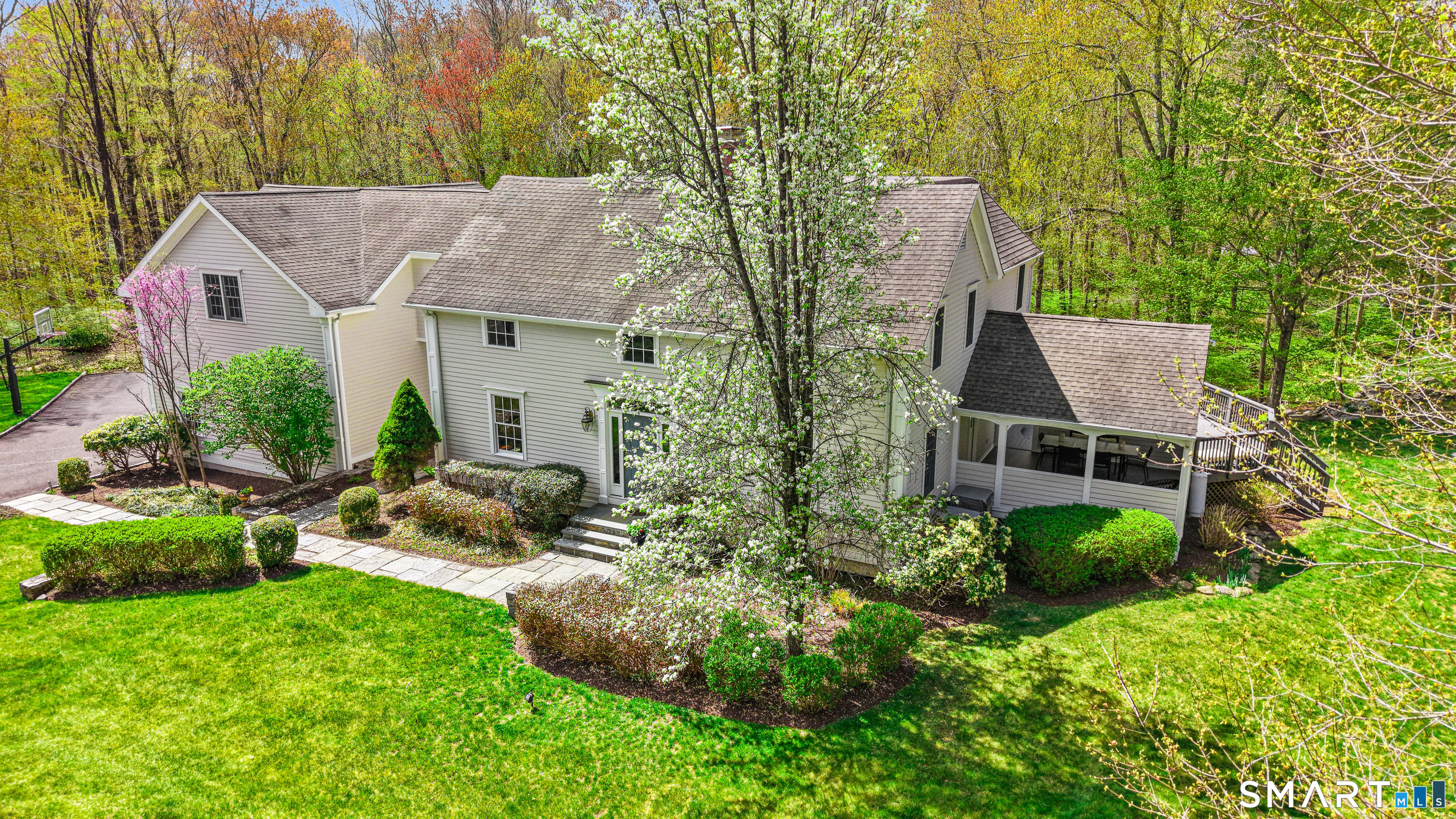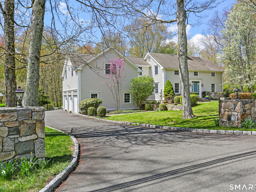 Set on 3.23 acres in the Greenfield Hill area of Fairfield, this 5BR, 4BA home offers privacy, natural surroundings, & a layout designed for the way we live today. Rustic stone walls welcome you to a property overlooking a deep wooded backdrop, with a landscaped lawn defined by a classic stone retaining wall. The main level features a home office, full bath, & an open living and family room with wood-burning fireplace. Access to the covered porch & open deck extends the living space outdoors. The kitchen is functional & welcoming, with a center island, gas range, wall oven, microwave, warming drawer, ample storage, & a dining area for everyday meals. The dining room sits between the kitchen & living spaces, with a bay window overlooking the rear yard. Upstairs, the primary suite offers a private balcony, spa-like bath, large walk-in closet plus two additional closets, & a spiral staircase connection to the main level. Four additional bedrooms include a Jack & Jill bath and hall bath, along with second-floor laundry. Finished lower level with flexible space and unfinished storage. Attached 3-car garage and detached 2-car garage. Enjoy the space and privacy that define Greenfield Hill, with convenient access to Fairfield's town center, Westport, Weston, and Easton, all within approximately a 15-minute drive.This location offers a balance of quiet surroundings and everyday accessibility.