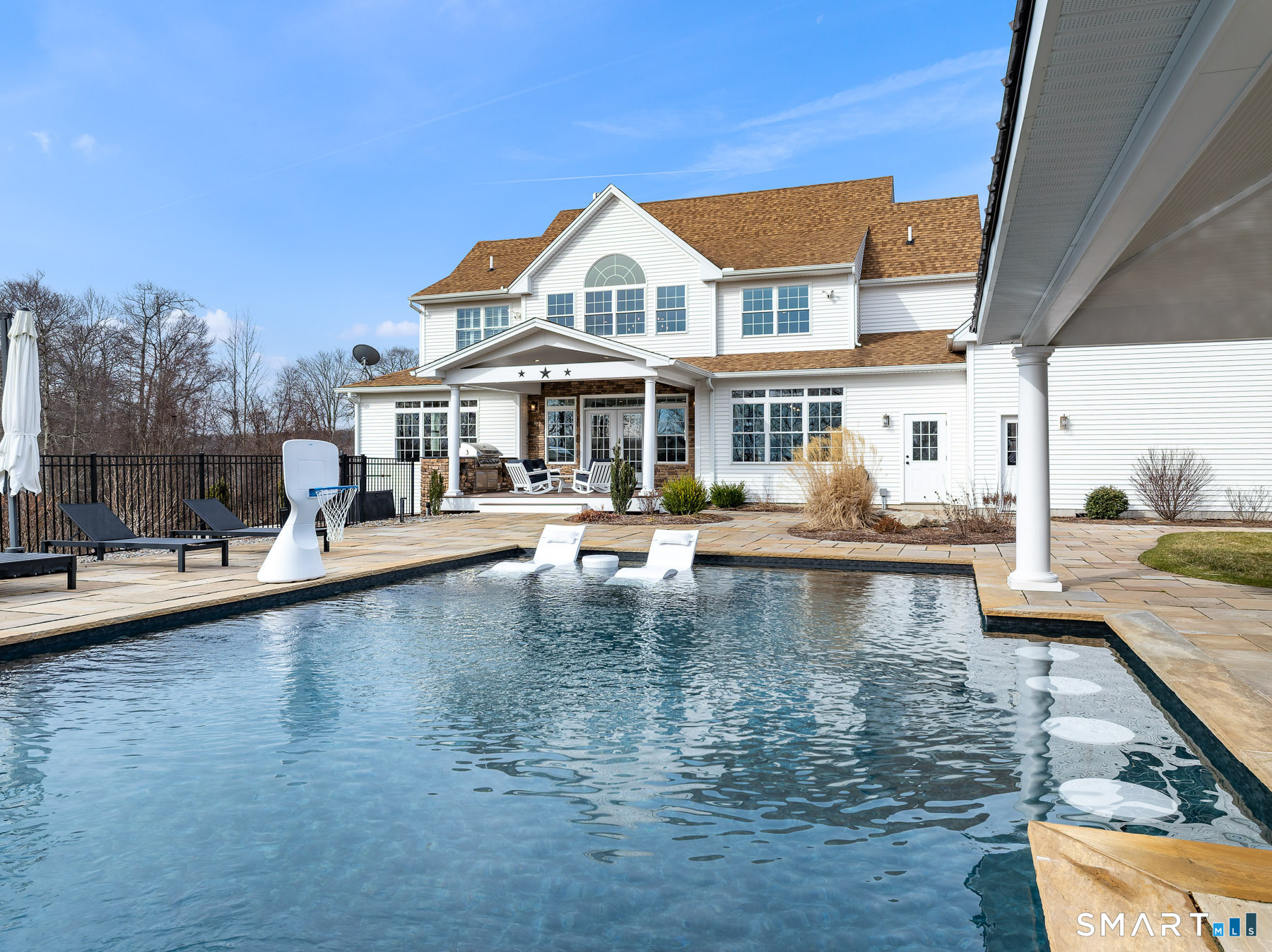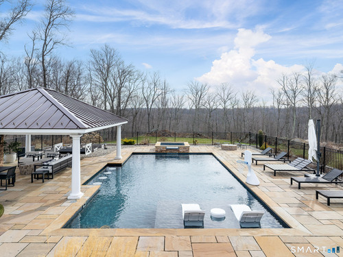 Beautifully situated on 5.4 serene acres at the end of a cul-de-sac, this custom-built 2018 colonial offers resort-style living. Imagine waking up every day to your own private oasis, where a sparkling pool, relaxing spa and a cozy fire pit set the stage for ultimate enjoyment. The outdoor living space is an entertainer's dream, featuring a built-in Napoleon grill and a covered sitting area with a gas fireplace that help to extend the backyard season. The interior features an open and airy floor plan bathed in natural light. The dramatic double-height ceilings in the entryway and family room create a sense of grandeur, while a gas fireplace, flanked by built ins, anchors the space with warmth. The stunning, sunlit kitchen features Thermador and Sub-Zero appliances. The main-level primary suite combines luxury and convenience, offering a tranquil retreat from the day. Upstairs, you'll find three additional bedrooms - two with en suite bathrooms and one with easy access to a nearby hall bath - plus a playroom and a second office. The possibilities continue with an unfinished walkout lower level featuring high ceilings. Whether you dream of a home theater, gym, wine cellar, or all three, this space can be transformed to suit your vision. Come experience the extraordinary blend of tranquility and sophistication at this exclusive retreat.