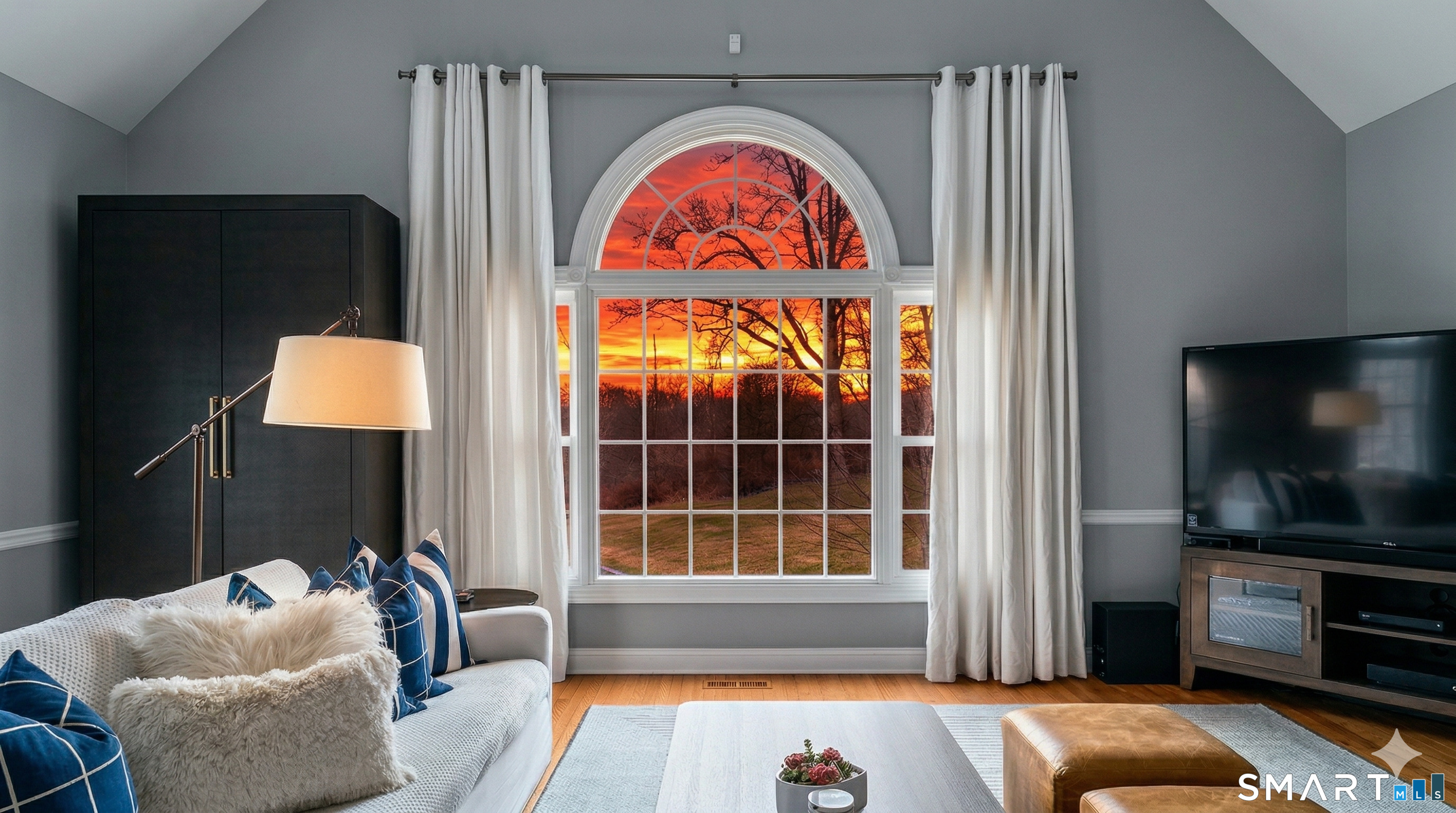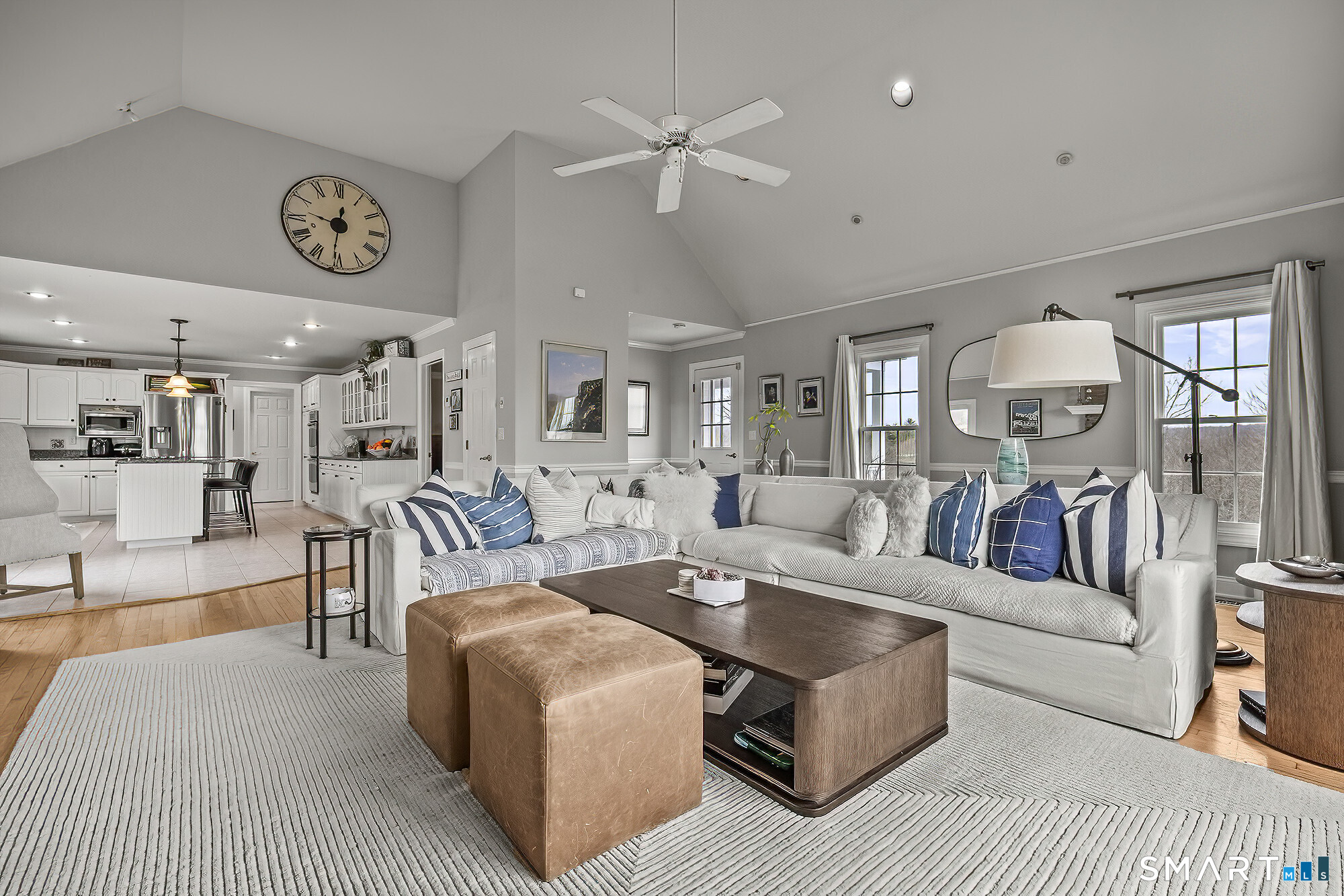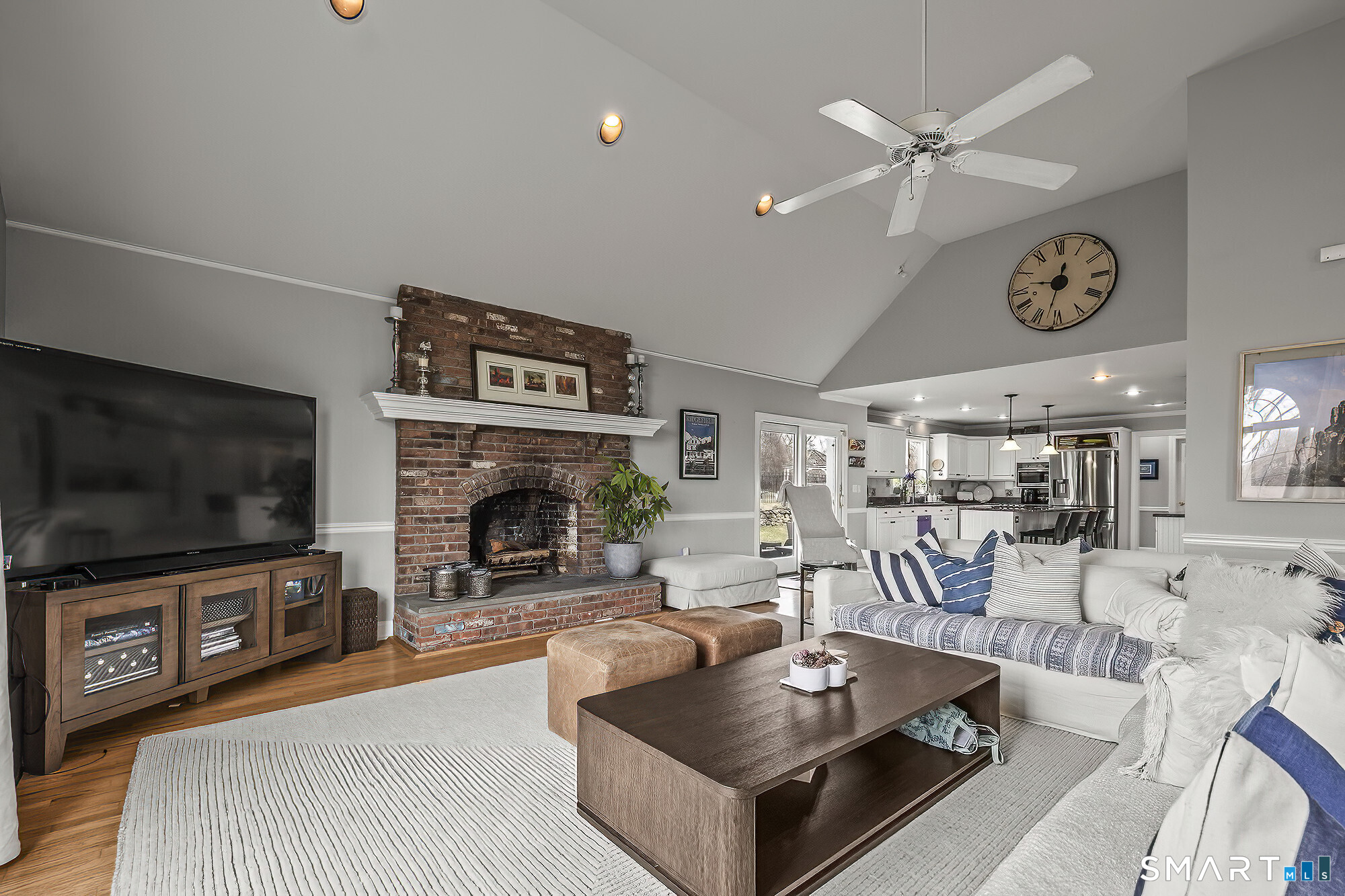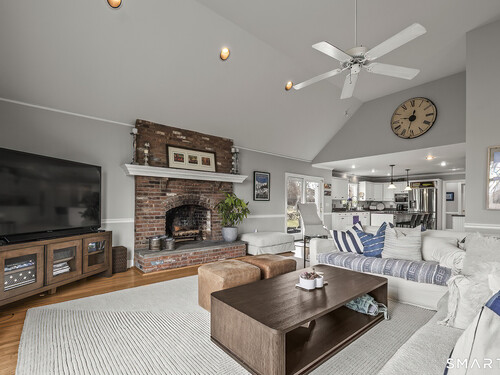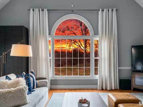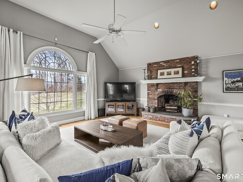 Family Room (Main Level)Palladian Window(s), Vaulted Ceiling, Fireplace, French Doors, Hardwood Floor