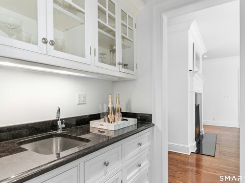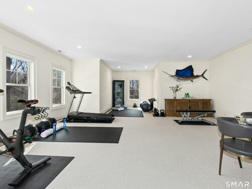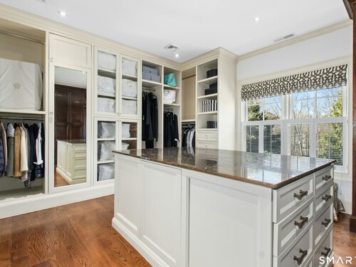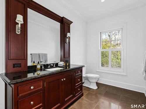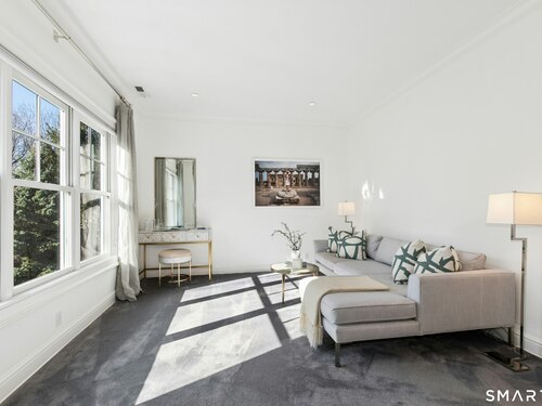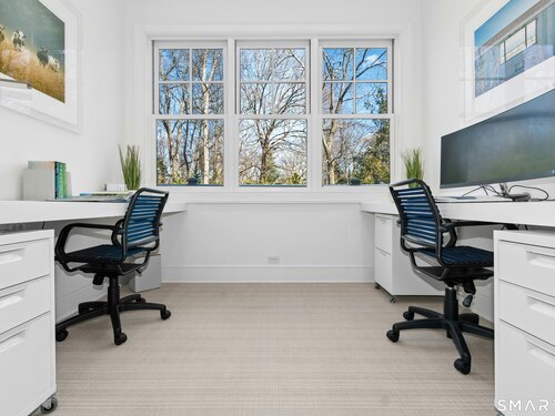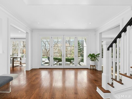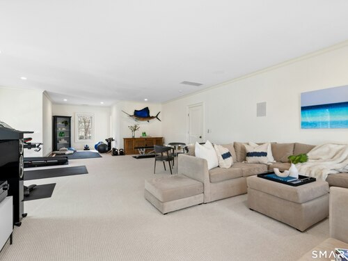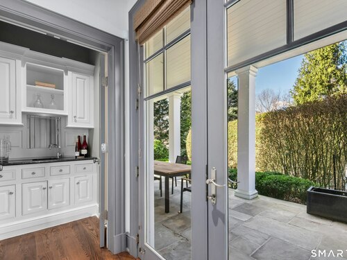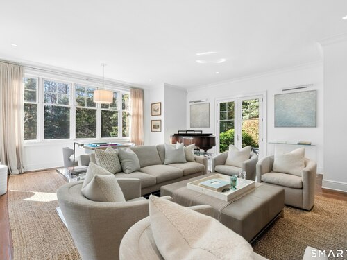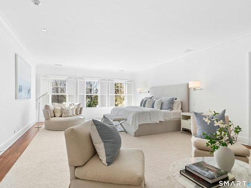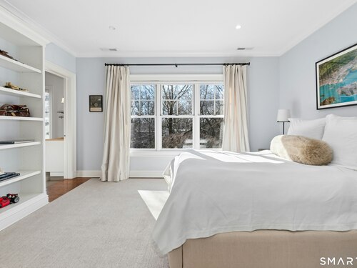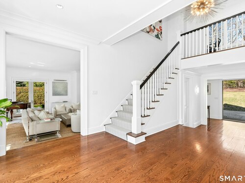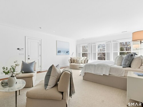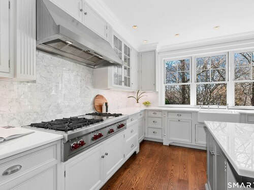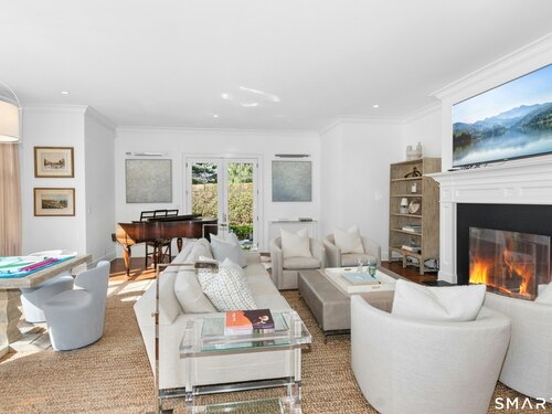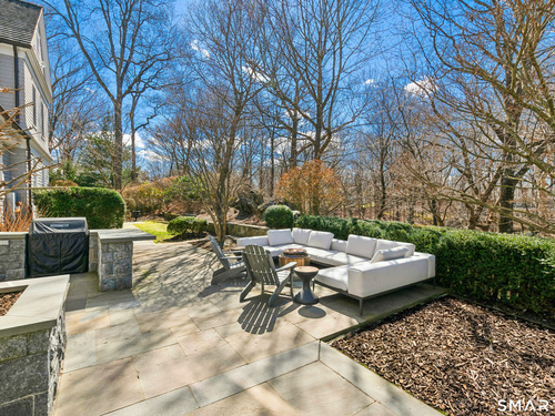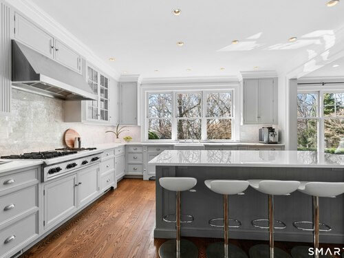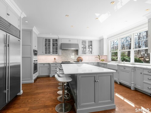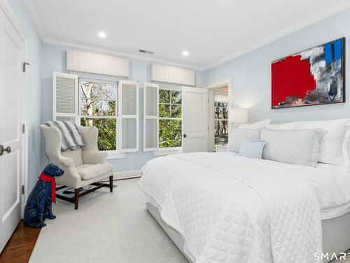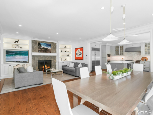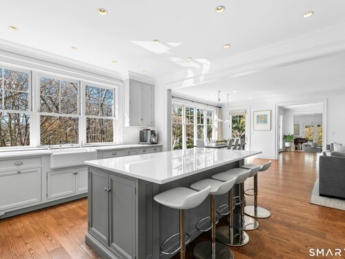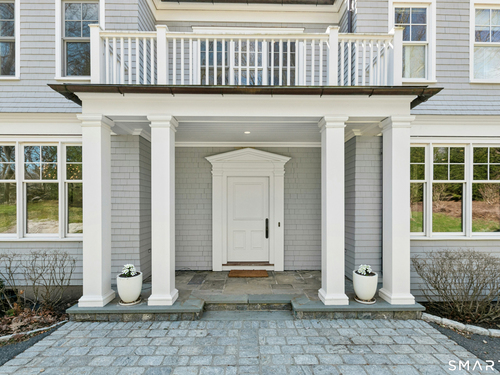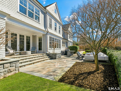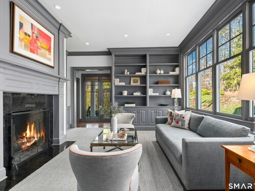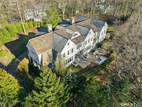 Situated proudly on a knoll near the center of town, this beautifully crafted Nantucket-style Colonial blends timeless grandeur with effortless livability. A gracious front-to-back foyer welcomes guests and draws the eye upward to the belvedere, a hidden nook where sunlight pours in and creates a dramatic entrance. The library is wrapped in floor-to-ceiling bookshelves, creating an intimate space to read beside the fireplace, enjoy a drink from the wet bar or relax on the adjoining covered patio. The dining room, centered around a grand fireplace, is equally striking and complemented by a butler's pantry with wet bar for seamless entertaining. At the heart of the home, the well-appointed chef's kitchen features an expansive island with seating for five and opens to a great room, where a fireplace and sunlit dining area create a natural gathering place while opening up to the backyard patio for easy entertaining. Bathed in afternoon light, the formal living room is an elegant setting for fireside conversation and quiet relaxation. Upstairs, a thoughtfully designed office with built-in desks leads to 4 ensuite bedrooms, a huge rec room, laundry facilities and a gracious primary suite, complete with a sitting area, fireplace, dressing room and 2 primary baths for refined tranquility. An oversized three car garage has masterfully designed storage while an expansive unfinished basement offers abundant space and possibilities...all just steps from town, dining, and shopping.