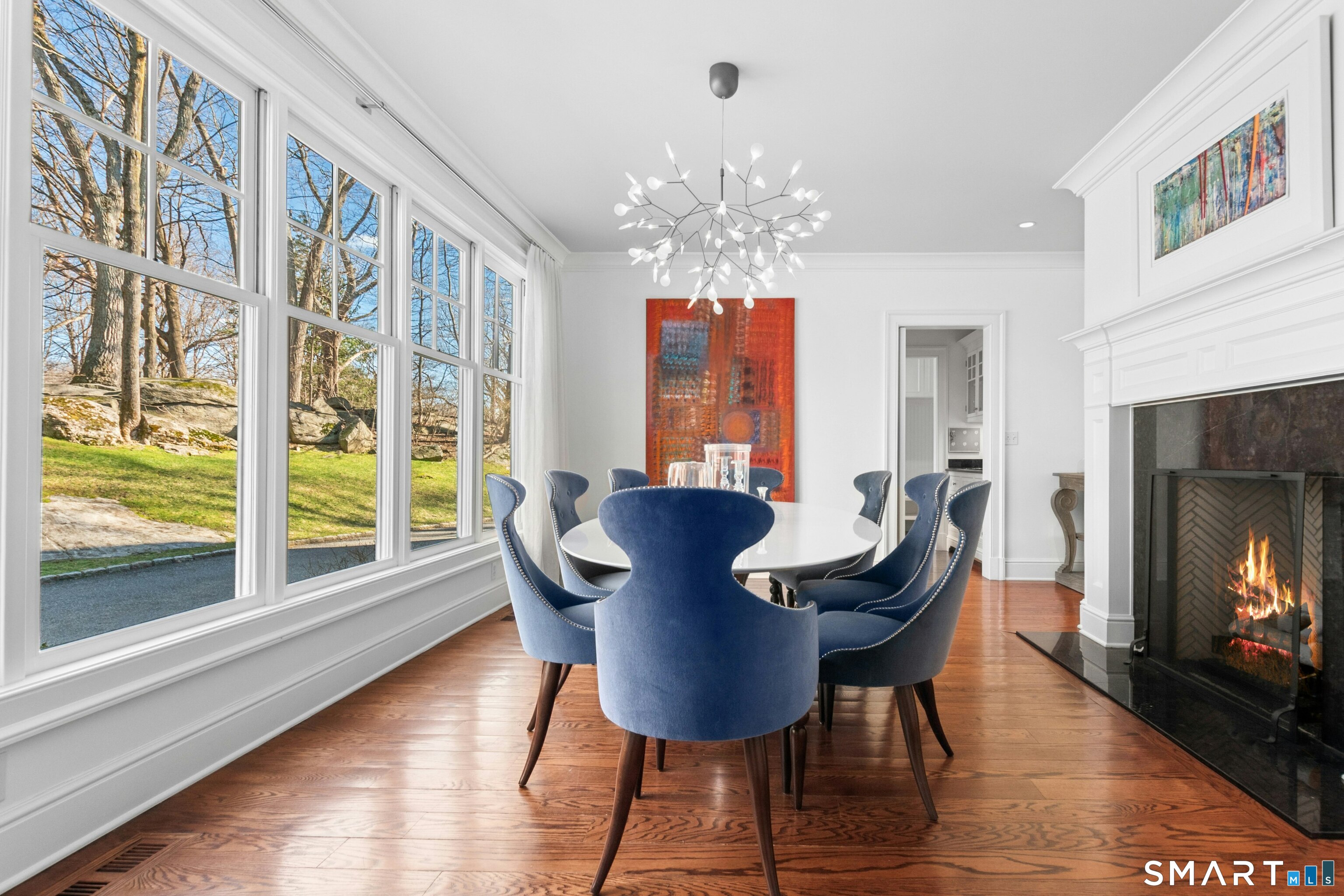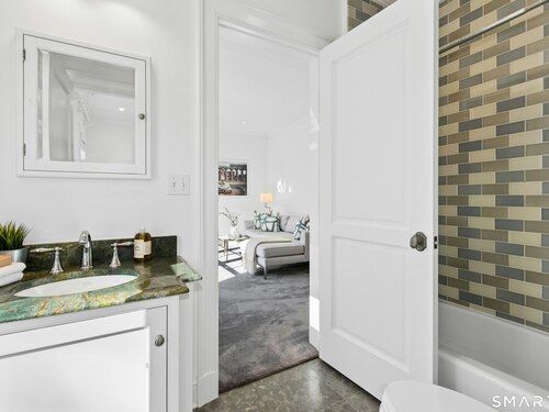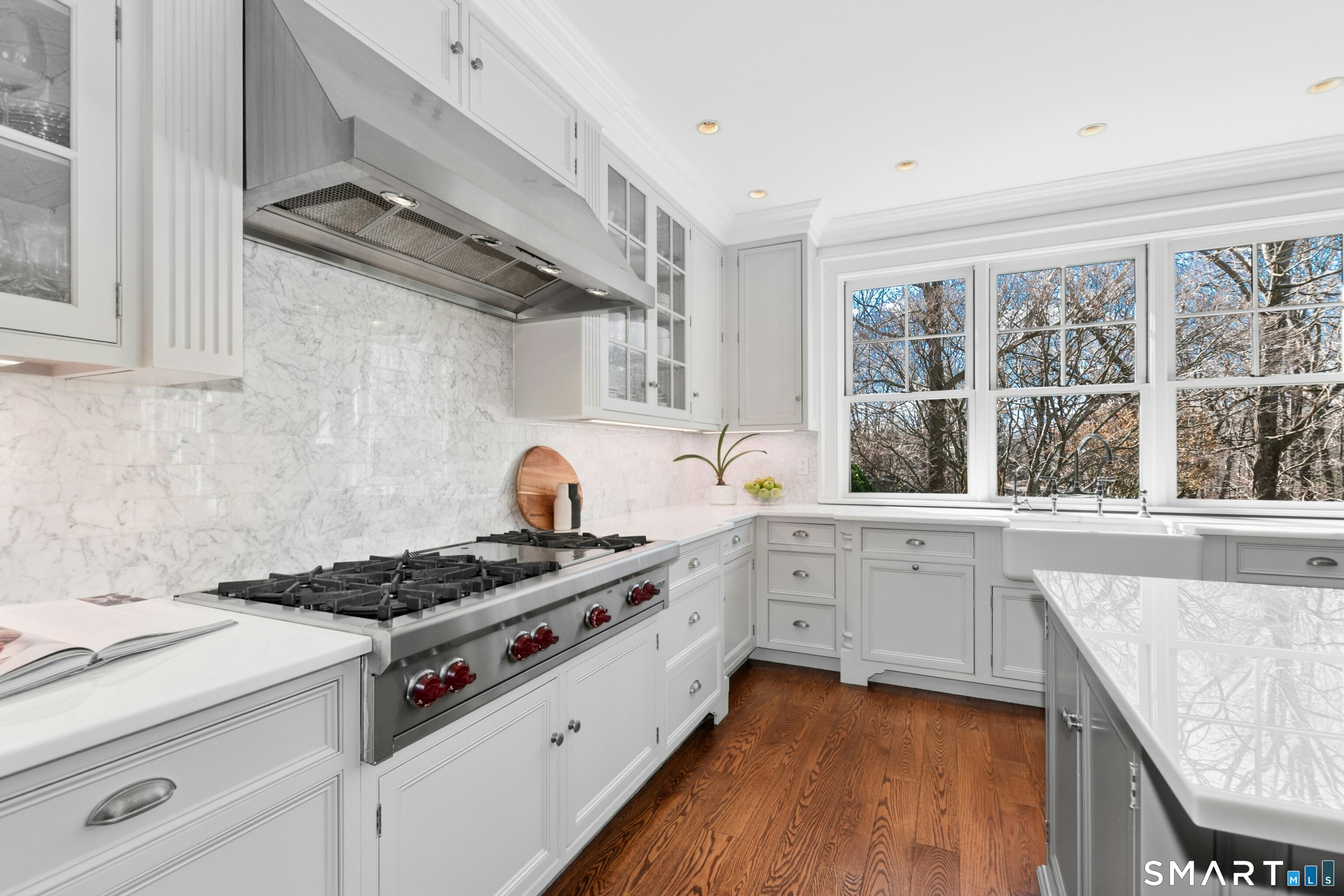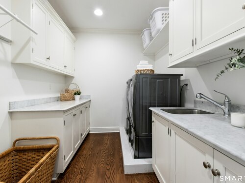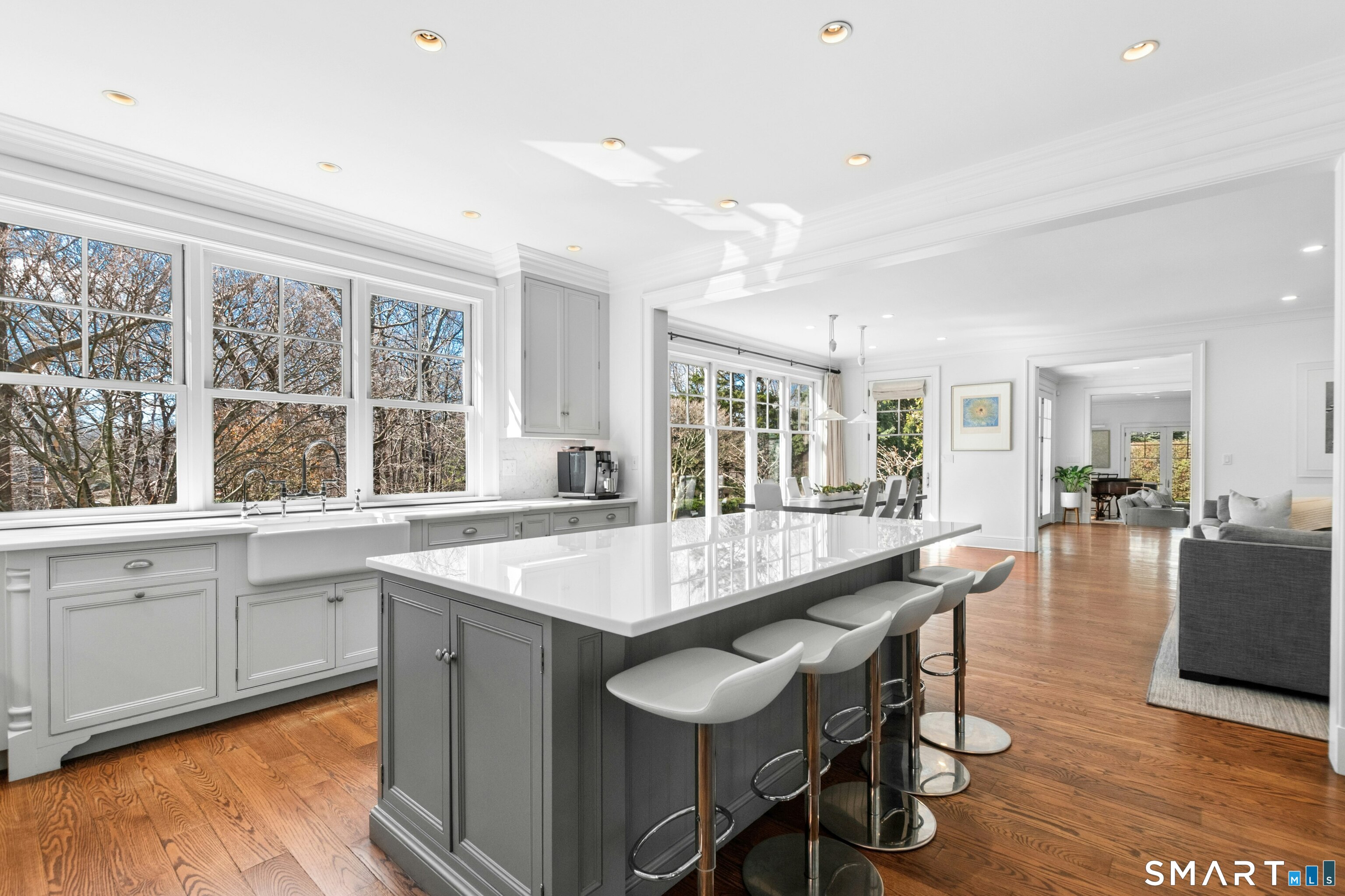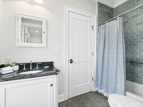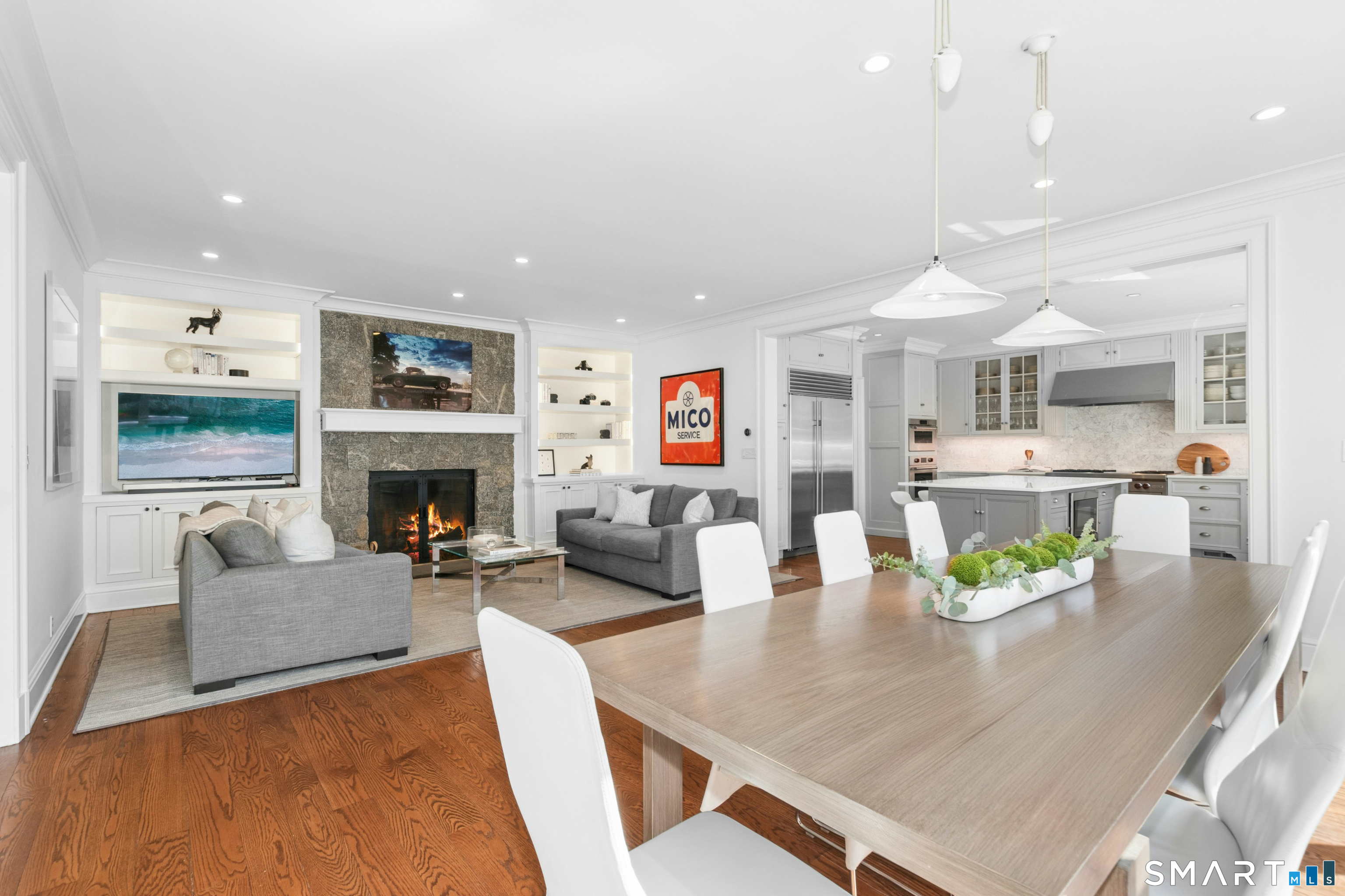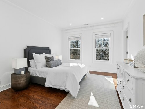 Situated proudly on a knoll near the center of town, this beautifully crafted Nantucket-style Colonial blends timeless grandeur with effortless livability. A gracious front-to-back foyer welcomes guests and draws the eye upward to the belvedere, a hidden nook where sunlight pours in and creates a dramatic entrance. The library is wrapped in floor-to-ceiling bookshelves, creating an intimate space to read beside the fireplace, enjoy a drink from the wet bar or relax on the adjoining covered patio. The dining room, centered around a grand fireplace, is equally striking and complemented by a butler's pantry with wet bar for seamless entertaining. At the heart of the home, the well-appointed chef's kitchen features an expansive island with seating for five and opens to a great room, where a fireplace and sunlit dining area create a natural gathering place while opening up to the backyard patio for easy entertaining. Bathed in afternoon light, the formal living room is an elegant setting for fireside conversation and quiet relaxation. Upstairs, a thoughtfully designed office with built-in desks leads to 4 ensuite bedrooms, a huge rec room, laundry facilities and a gracious primary suite, complete with a sitting area, fireplace, dressing room and 2 primary baths for refined tranquility. An oversized three car garage has masterfully designed storage while an expansive unfinished basement offers abundant space and possibilities...all just steps from town, dining, and shopping.