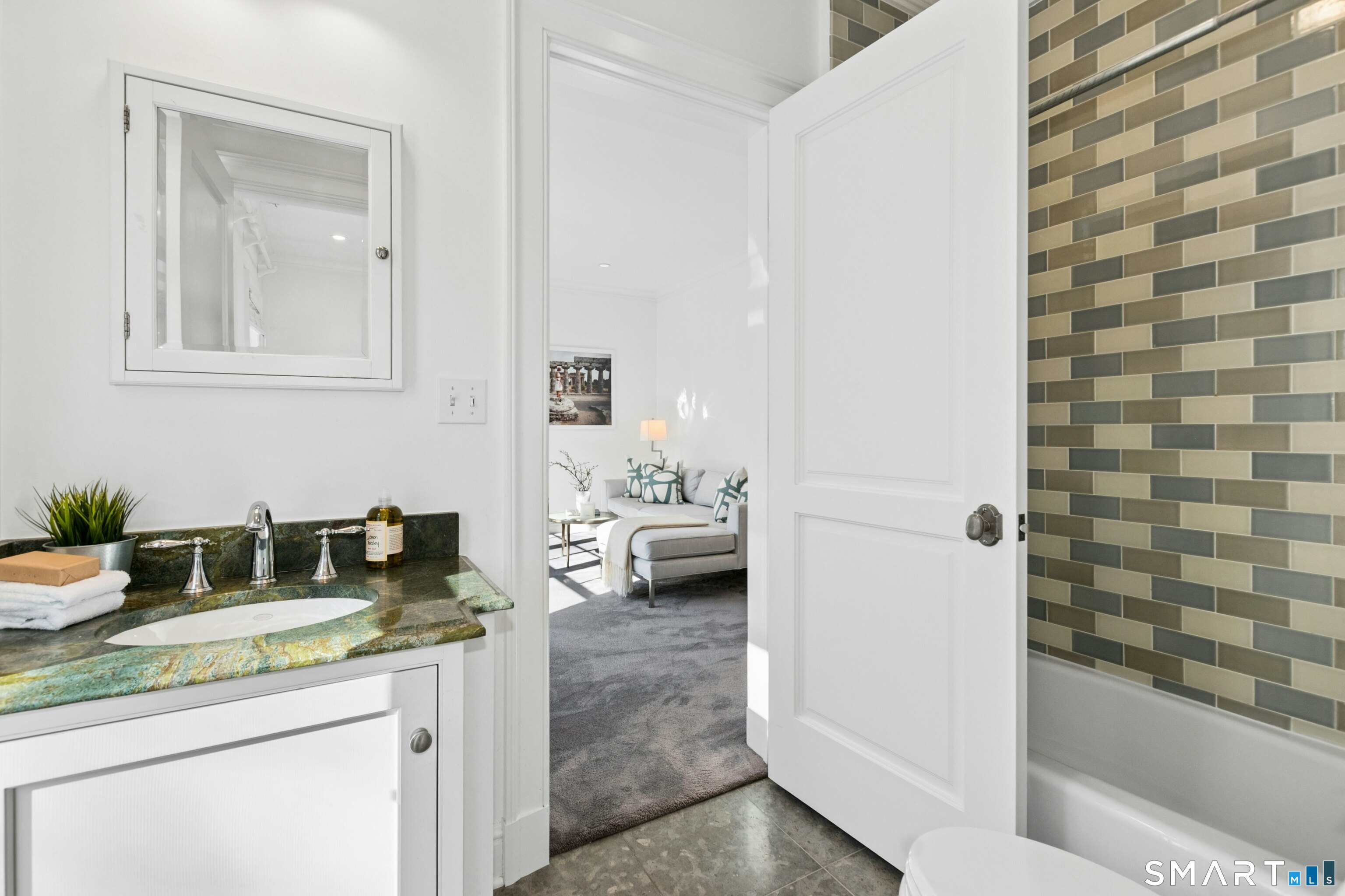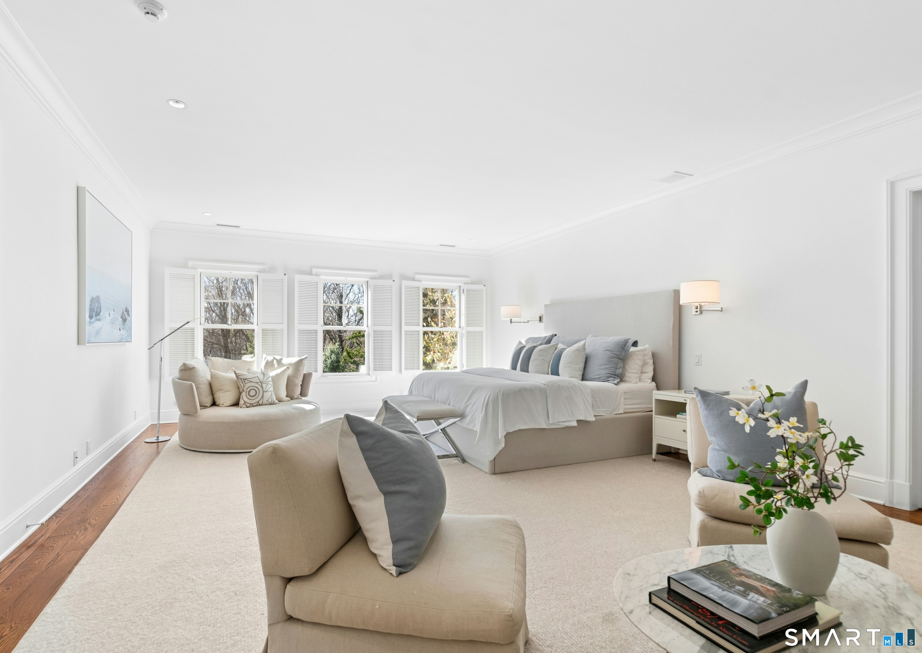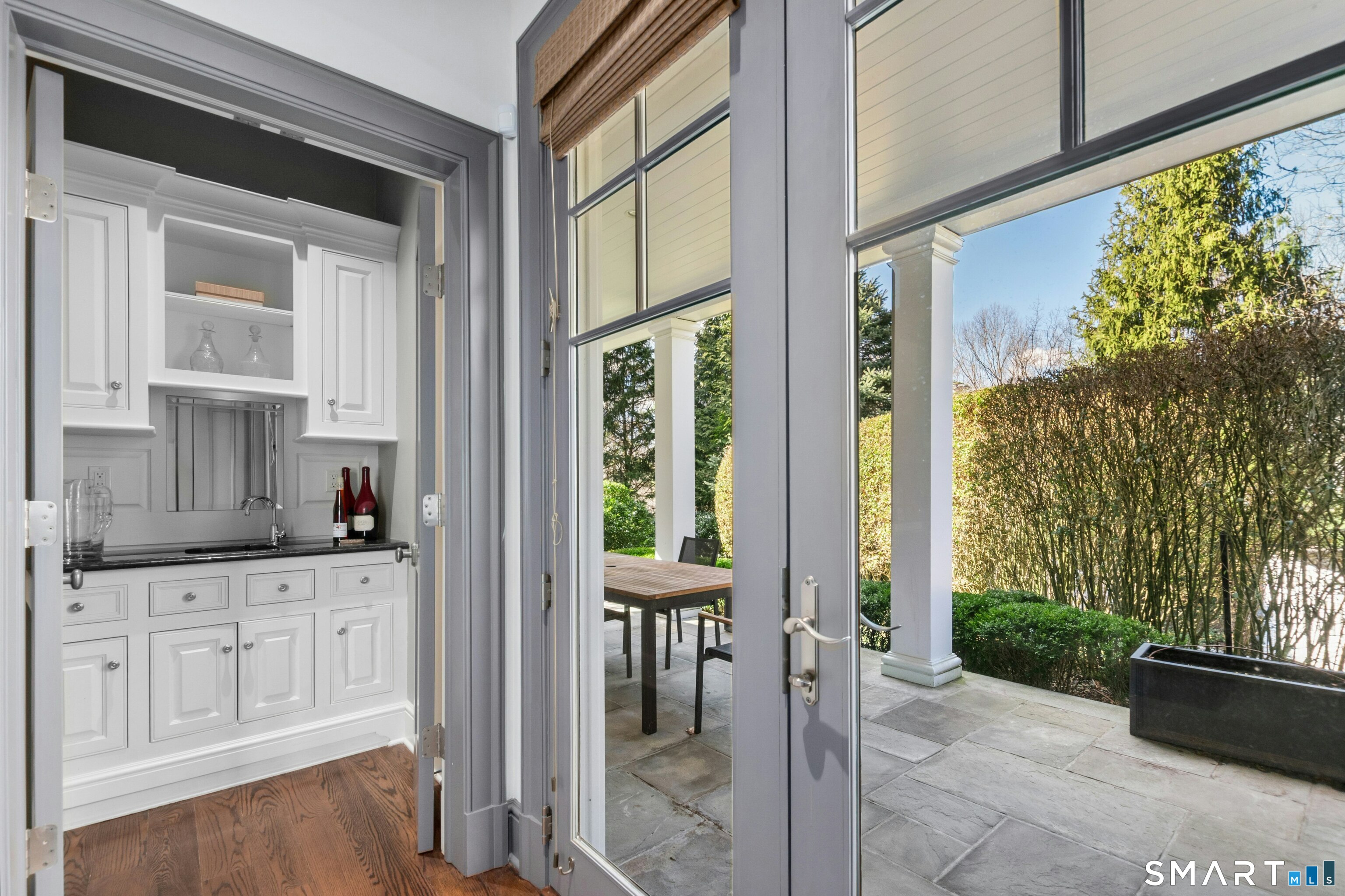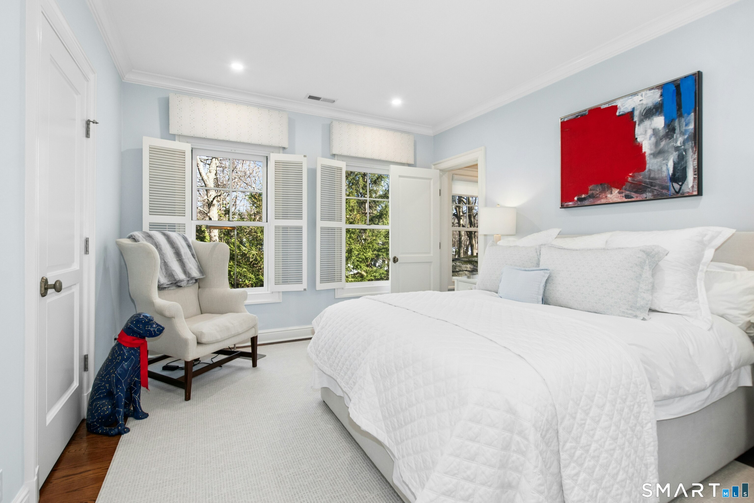 Situated proudly on a knoll near the center of town, this beautifully crafted Nantucket-style Colonial blends timeless grandeur with effortless livability. A gracious front-to-back foyer welcomes guests and draws the eye upward to the belvedere, a hidden nook where sunlight pours in and creates a dramatic entrance. The library is wrapped in floor-to-ceiling bookshelves, creating an intimate space to read beside the fireplace, enjoy a drink from the wet bar or relax on the adjoining covered patio. The dining room, centered around a grand fireplace, is equally striking and complemented by a butler's pantry with wet bar for seamless entertaining. At the heart of the home, the well-appointed chef's kitchen features an expansive island with seating for five and opens to a great room, where a fireplace and sunlit dining area create a natural gathering place while opening up to the backyard patio for easy entertaining. Bathed in afternoon light, the formal living room is an elegant setting for fireside conversation and quiet relaxation. Upstairs, a thoughtfully designed office with built-in desks leads to 4 ensuite bedrooms, a huge rec room, laundry facilities and a gracious primary suite, complete with a sitting area, fireplace, dressing room and 2 primary baths for refined tranquility. An oversized three car garage has masterfully designed storage while an expansive unfinished basement offers abundant space and possibilities...all just steps from town, dining, and shopping.