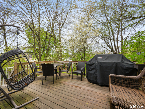 Discover this delightful colonial, tucked away on a private, cul-du-sac. The welcoming entry opens to a formal dining room and a flexible living room/office. The heart of the home is the updated Martha Stewart kitchen-featuring a built-in pantry and tile flooring-which flows seamlessly into a spacious family room with a fireplace. Step out to a brand-new deck, perfect for enjoying the lush, mature greenery. Upstairs, the luxurious primary suite boasts vaulted ceilings, hardwood floors, and a spa-like bath with double walk-in closets. Two additional bright bedrooms feature ample storage, one with a charming built-in window seat. The lower level offers an extra 832 sq. ft. of living space, featuring a playroom/exercise room with sliders leading to a private patio. Enjoy ease of entry with the conveniently located 2-car garage right off of the kitchen. This home seamlessly combines traditional charm with open-concept modern living.