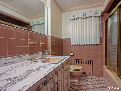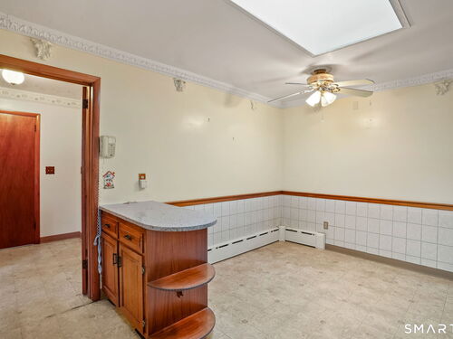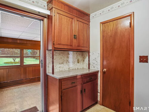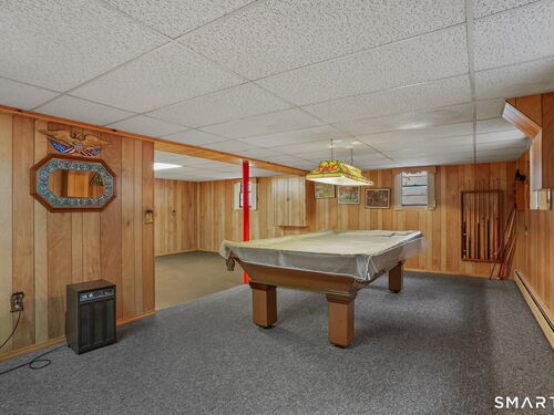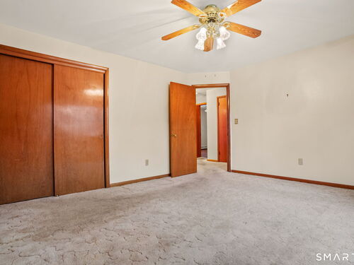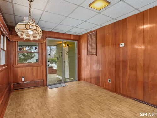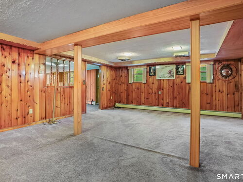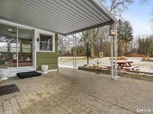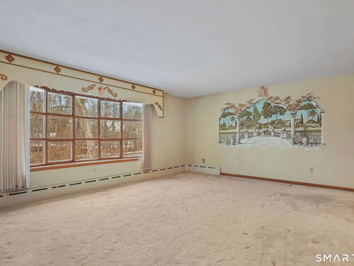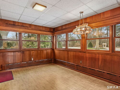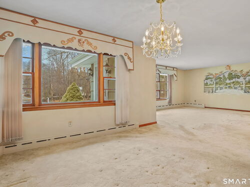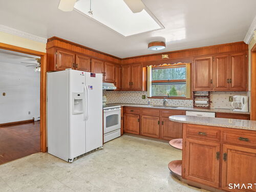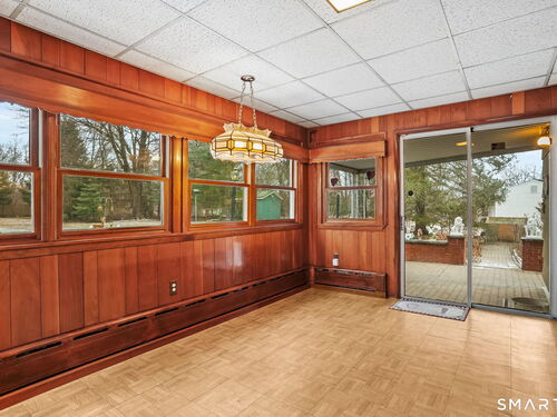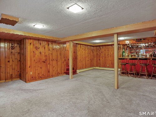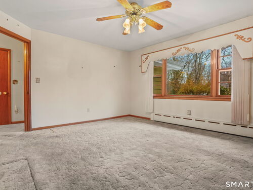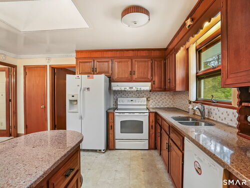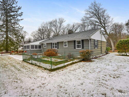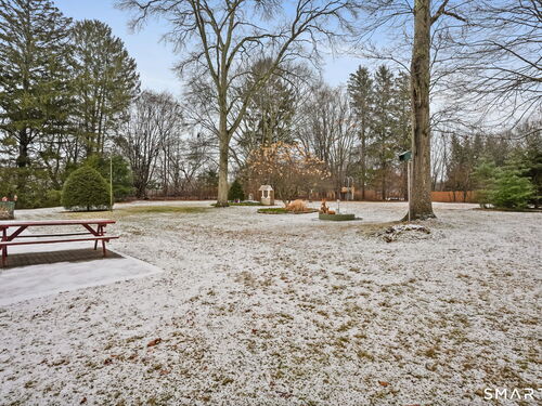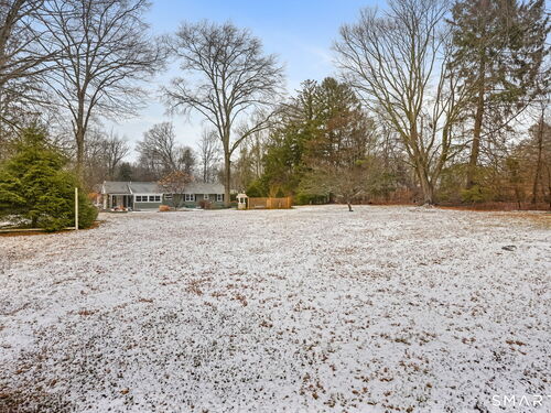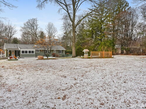 Sun-filled 7-room, 3-bedroom, 2 full bath ranch set on a picturesque, level 1.07-acre park-like lot in a desirable Trumbull neighborhood near Canoe Brook Lake, schools, parks, shopping, and highways. This home offers the ease and comfort of single-level living, ideal for downsizers or those seeking convenience without sacrificing space. The expansive living room features a dramatic wall-to-wall, floor-to-ceiling natural stone fireplace with raised hearth and a large bay window that fills the home with natural light. Hardwood floors run throughout the main level beneath wall-to-wall carpeting. A generous dining area with picture window flows seamlessly from the living room. The spacious eat-in kitchen offers cherrywood cabinetry, granite countertops, vinyl flooring, skylight, ceiling fan, and ample dining space. Two fully tiled full bathrooms, each with shower stalls. Bedrooms are generously sized with excellent closet space. Enjoy a bright four-season sunroom with windows on all sides, sliding glass door, cast-iron baseboard heat, and its own zone. The finished lower level offers approximately 1,000 sq ft of additional living space with bar, carpeting, baseboard heat, and laundry area. Oversized attached two-car garage, newer roof, new state-of-the-art heating system, new hot water heater, stone patios, paved driveway, and a tranquil backyard complete this exceptional opportunity. With some light modernization, this home offers tremendous potential to make it your own.