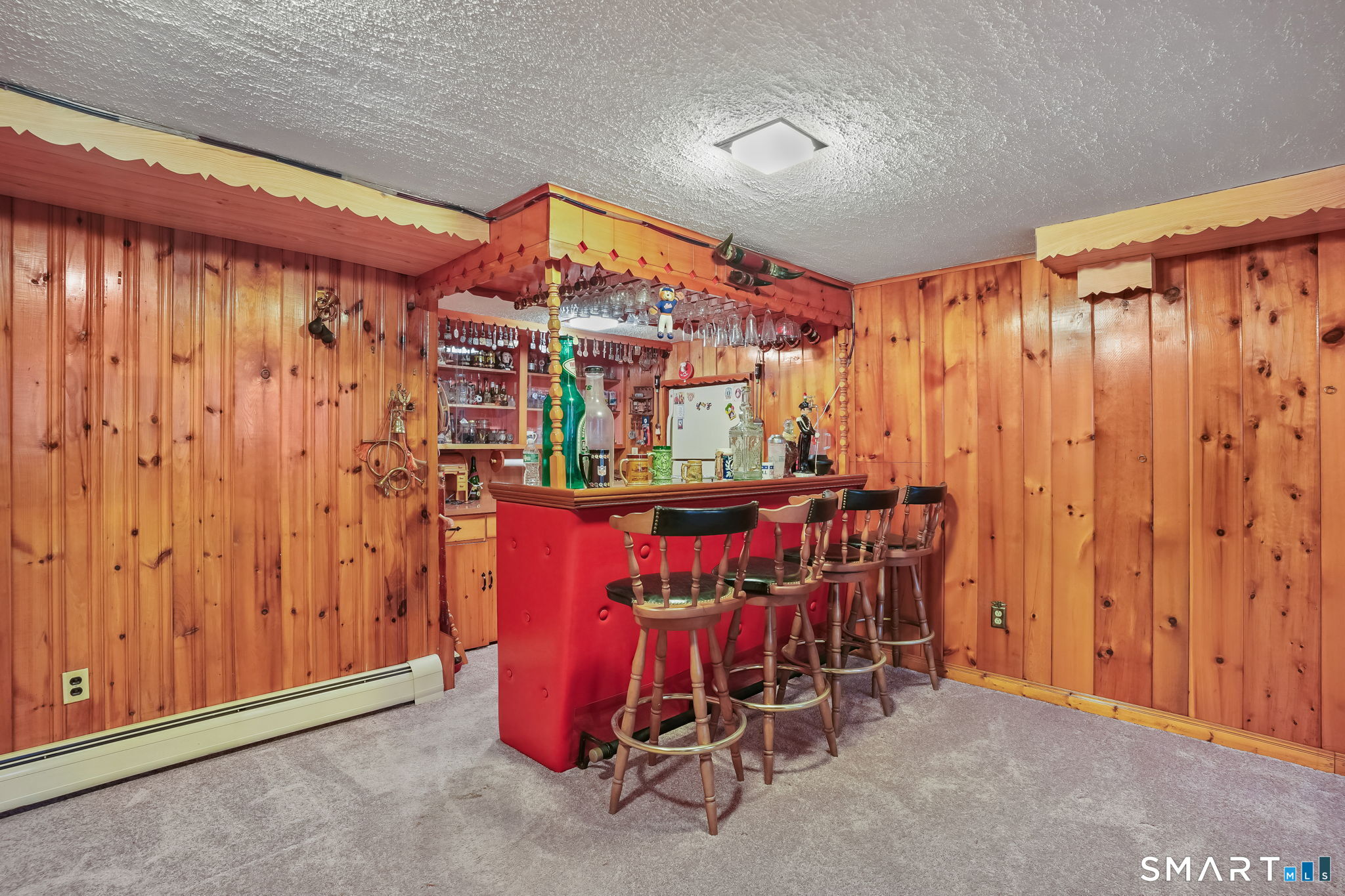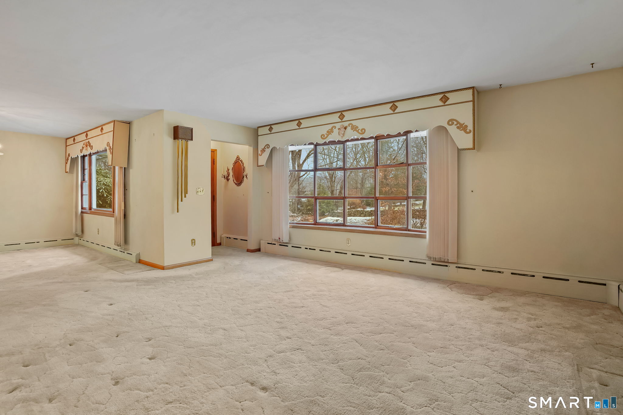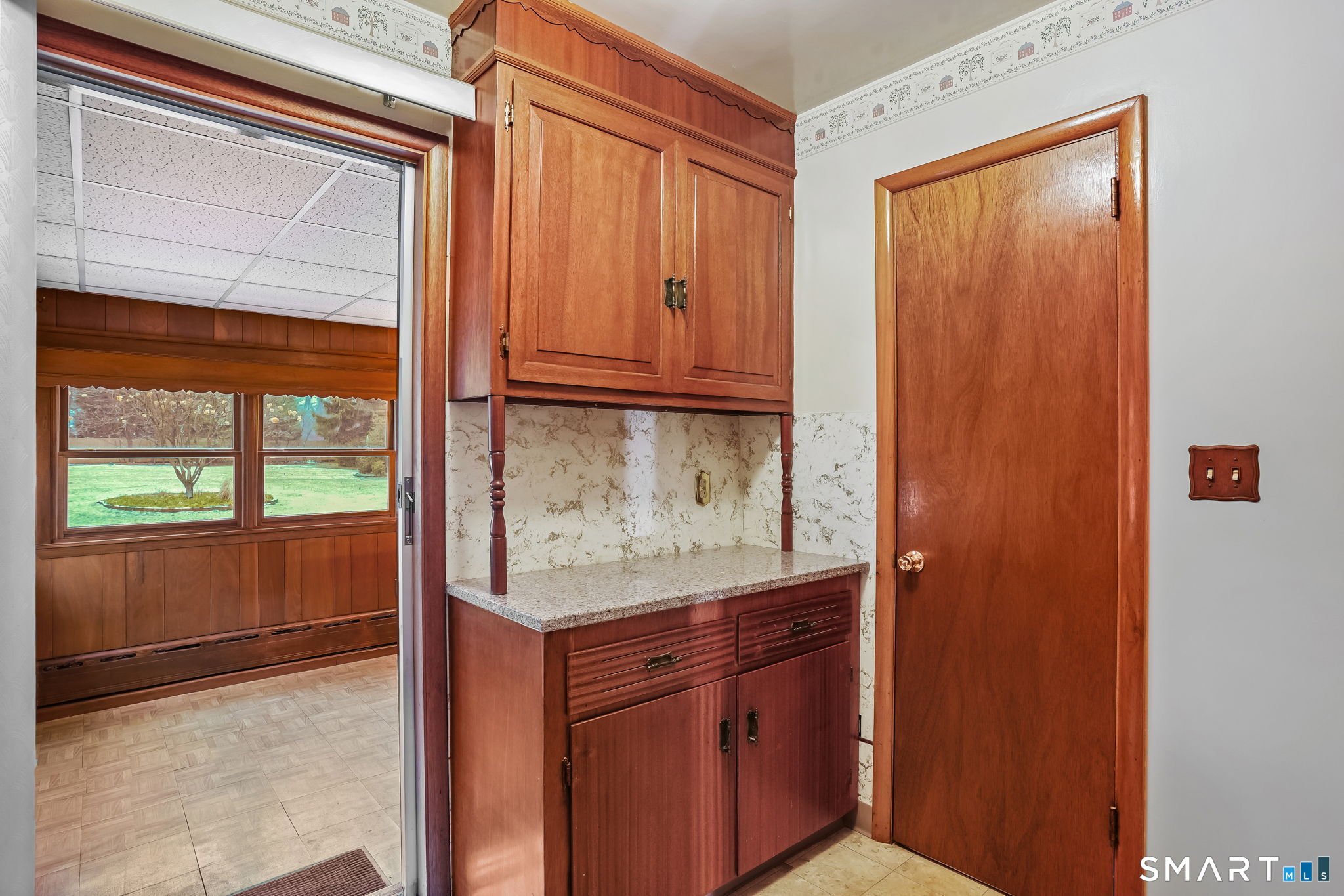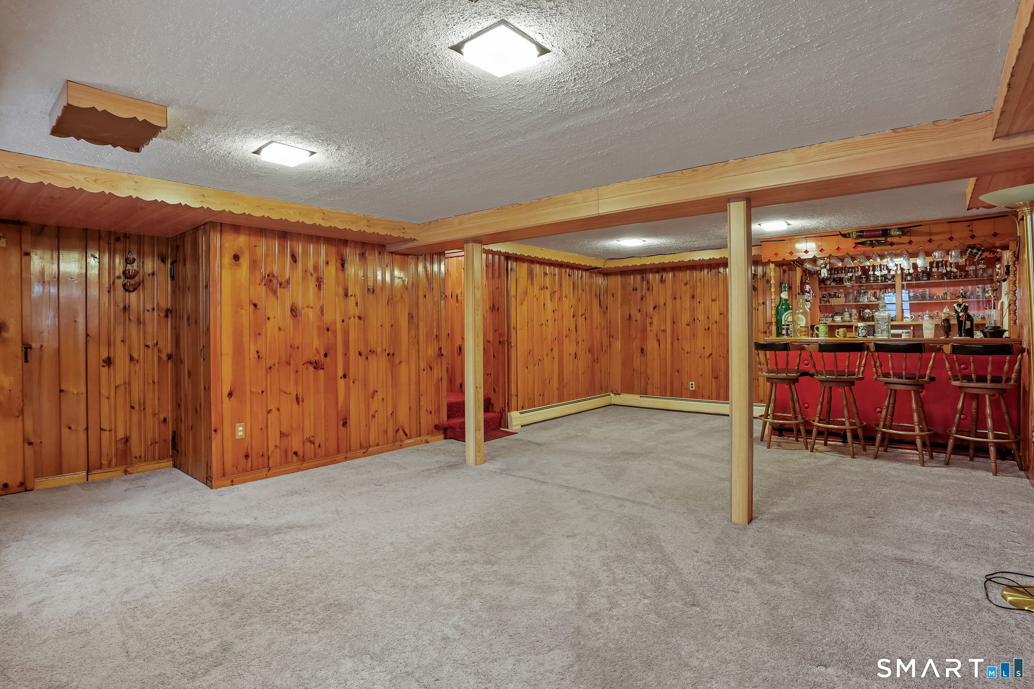 Sun-filled 7-room, 3-bedroom, 2 full bath ranch set on a picturesque, level 1.07-acre park-like lot in a desirable Trumbull neighborhood near Canoe Brook Lake, schools, parks, shopping, and highways. This home offers the ease and comfort of single-level living, ideal for downsizers or those seeking convenience without sacrificing space. The expansive living room features a dramatic wall-to-wall, floor-to-ceiling natural stone fireplace with raised hearth and a large bay window that fills the home with natural light. Hardwood floors run throughout the main level beneath wall-to-wall carpeting. A generous dining area with picture window flows seamlessly from the living room. The spacious eat-in kitchen offers cherrywood cabinetry, granite countertops, vinyl flooring, skylight, ceiling fan, and ample dining space. Two fully tiled full bathrooms, each with shower stalls. Bedrooms are generously sized with excellent closet space. Enjoy a bright four-season sunroom with windows on all sides, sliding glass door, cast-iron baseboard heat, and its own zone. The finished lower level offers approximately 1,000 sq ft of additional living space with bar, carpeting, baseboard heat, and laundry area. Oversized attached two-car garage, newer roof, new state-of-the-art heating system, new hot water heater, stone patios, paved driveway, and a tranquil backyard complete this exceptional opportunity. With some light modernization, this home offers tremendous potential to make it your own.
