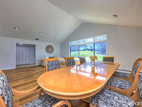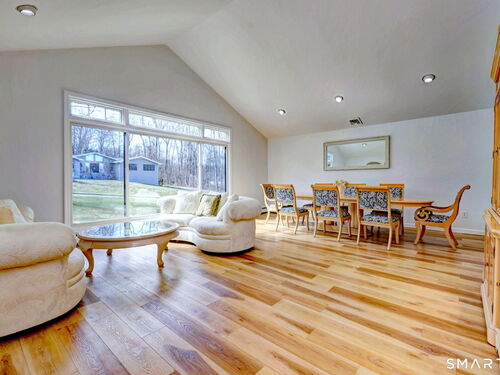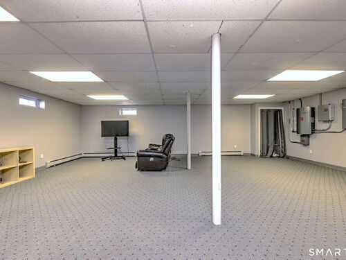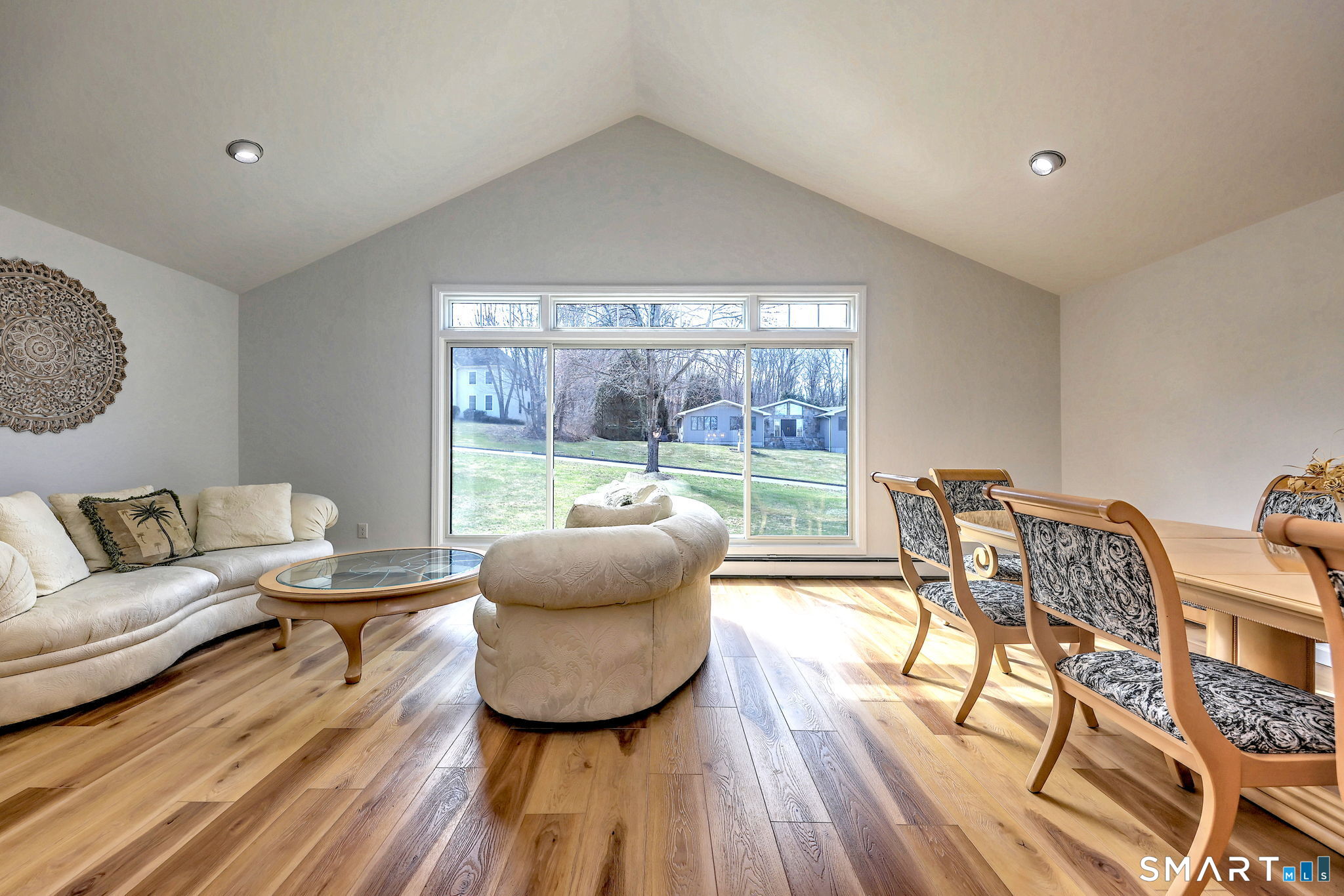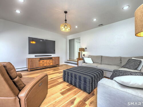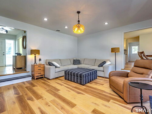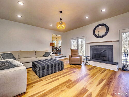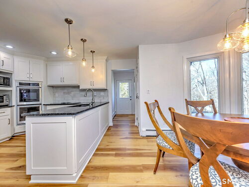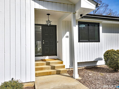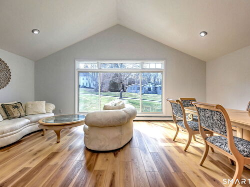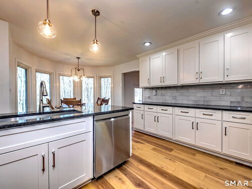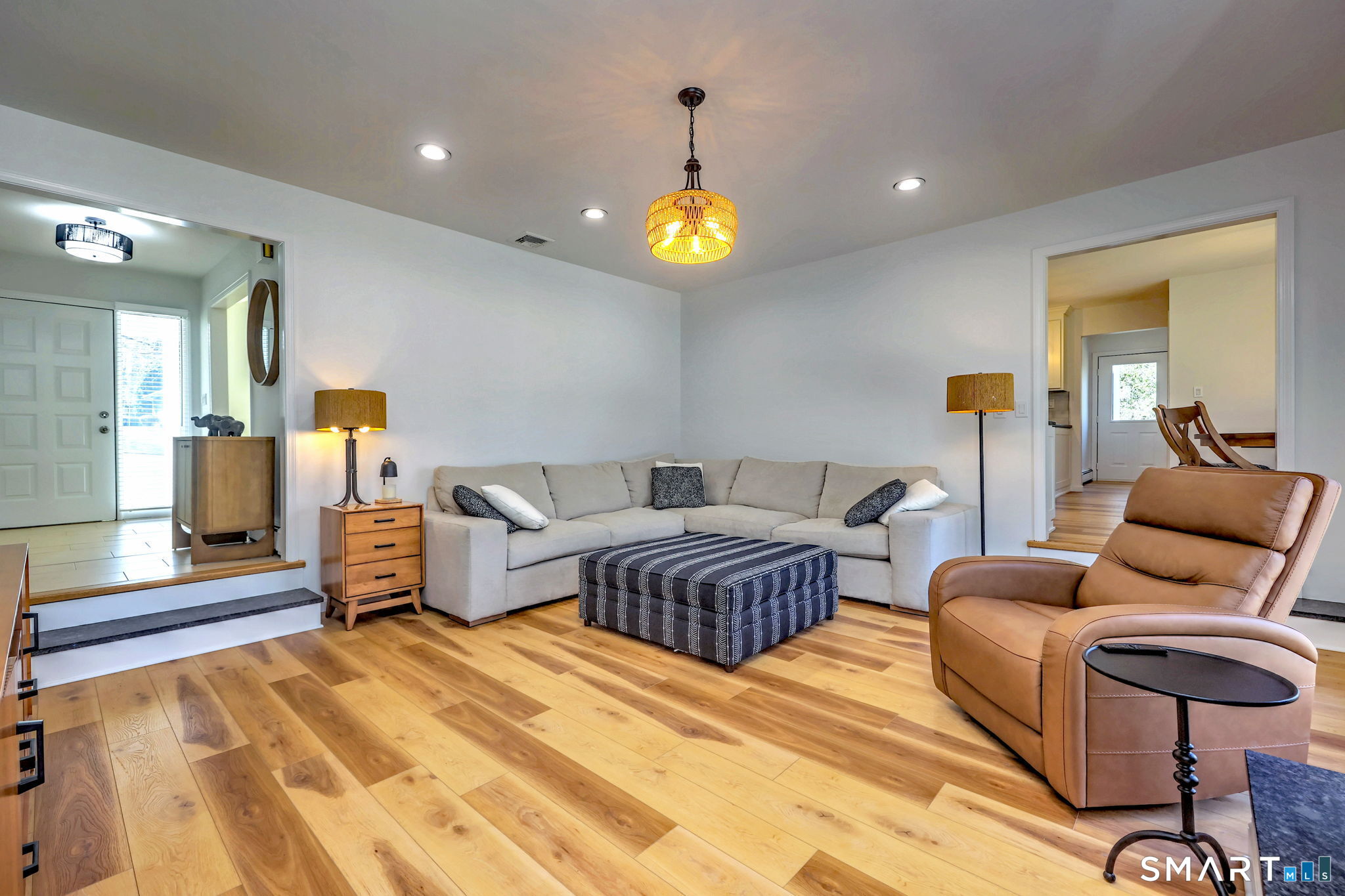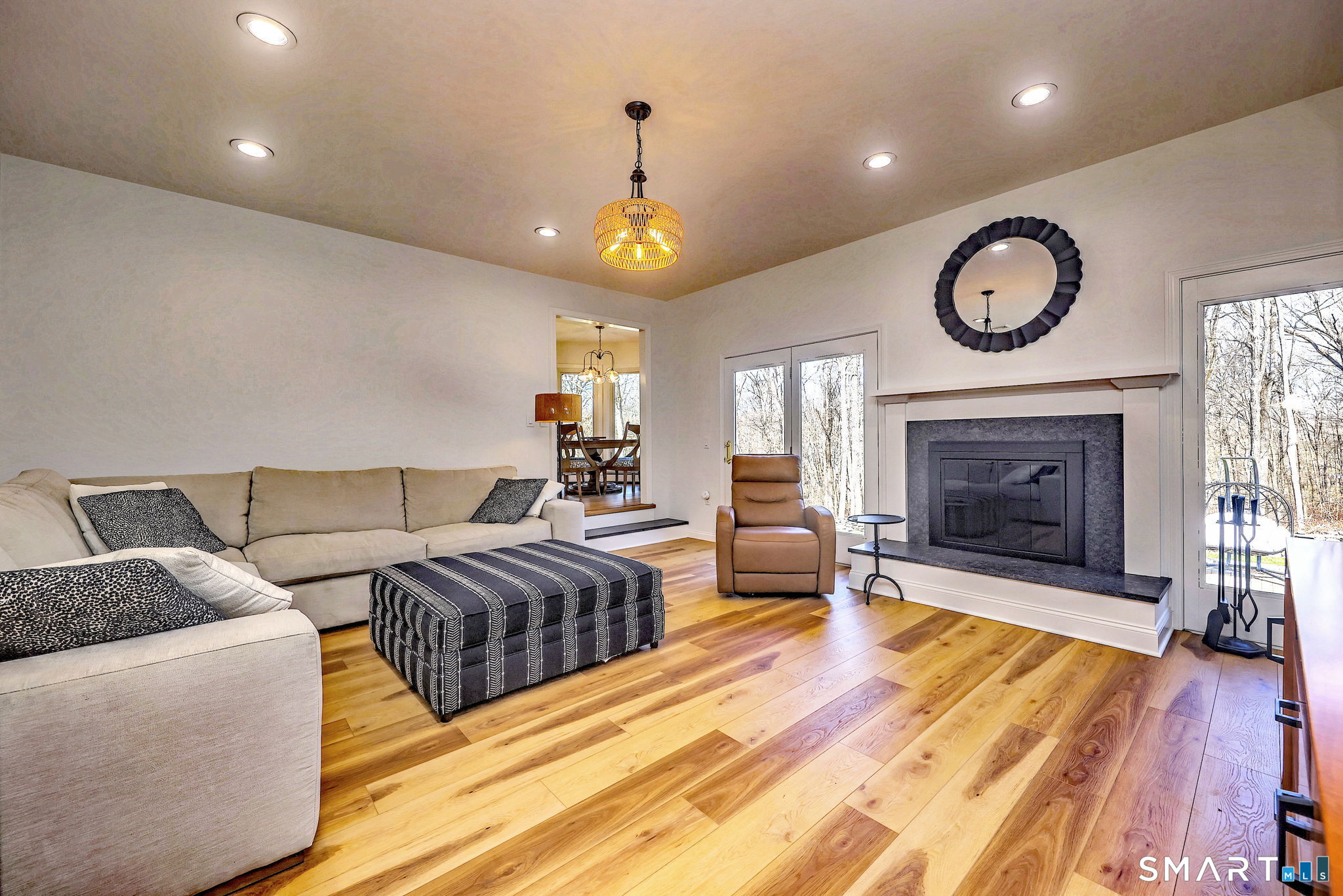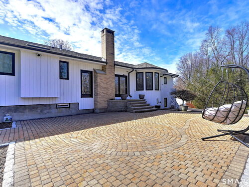 Completely remodelled from top to bottom, this stunning home combines modern design with exceptional energy efficiency featuring solar panels for sustainable cost-saving living. A bright open living and dining area showcases a vaulted ceiling along with a distinctive screened picture window that fills the room with natural light. Newer kitchen with abundant cabinetry and a one-of-a-kind dining area with circular window overlooking rear yard. Inviting family room with cozy fireplace. Comfortable primary bedroom offers newer bath, plenty of closet space (including WIC). Flexible floor plan is designed to accommodate a variety of living needs. Secluded from the main bedroom wing, the fourth bedroom features a vaulted ceiling and provides versatile options for in-law accommodations, home office or guest suite. Heated finished lower level adds approx. 700 feet. Garage comfortably accommodates 3 vehicles. Large circular paver patio provides inviting outdoor space. Younger mechanicals throughout including 3 yr. old roof, new driveway (2025), new windows (2025) and more. Solar panels with battery backup that not only eliminate electric bills but also establish quarterly credits from Eversource (See info in supplements).This turnkey home offers modern updates, energy efficiency and versatile living spaces. Potential pool site.