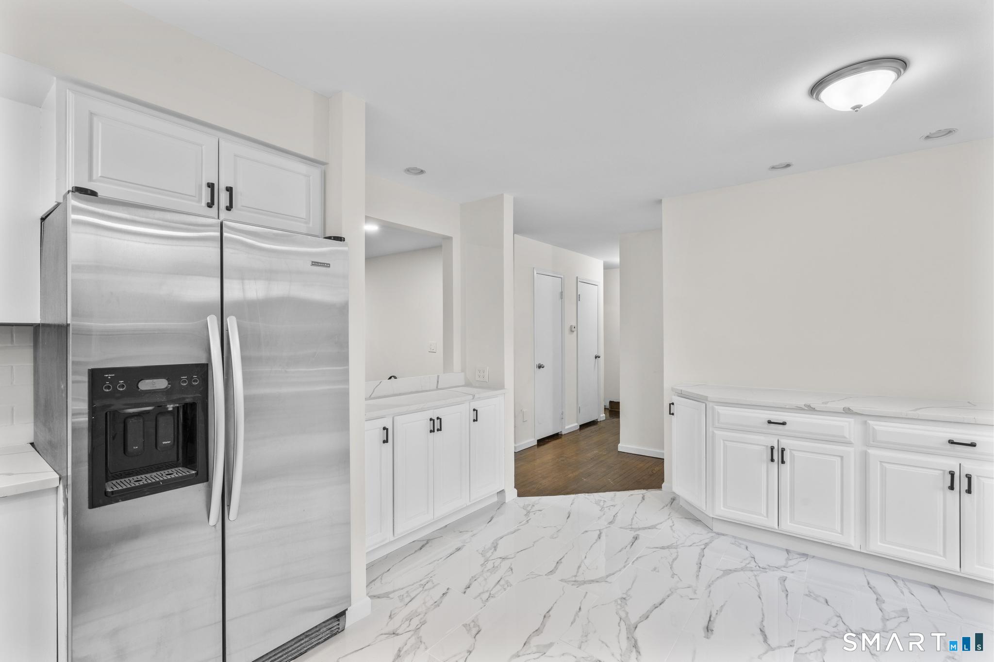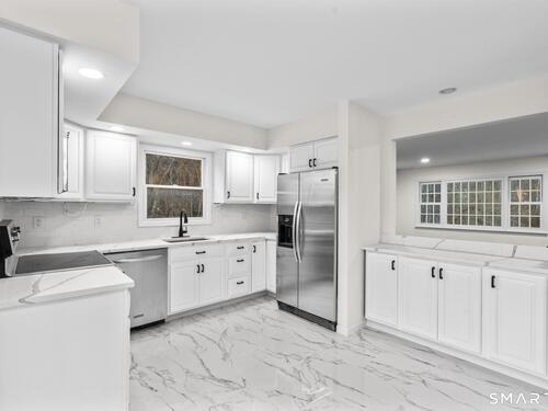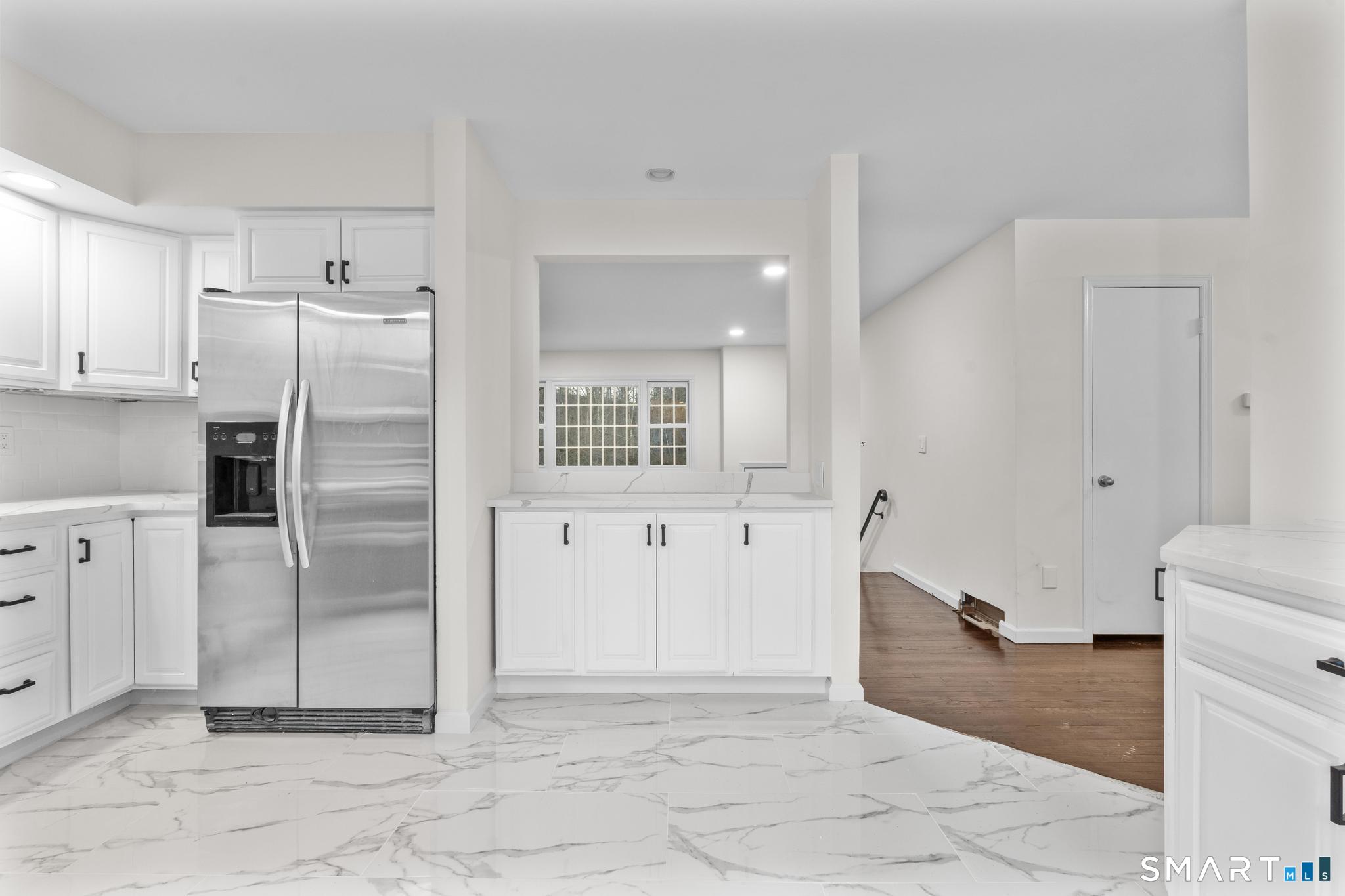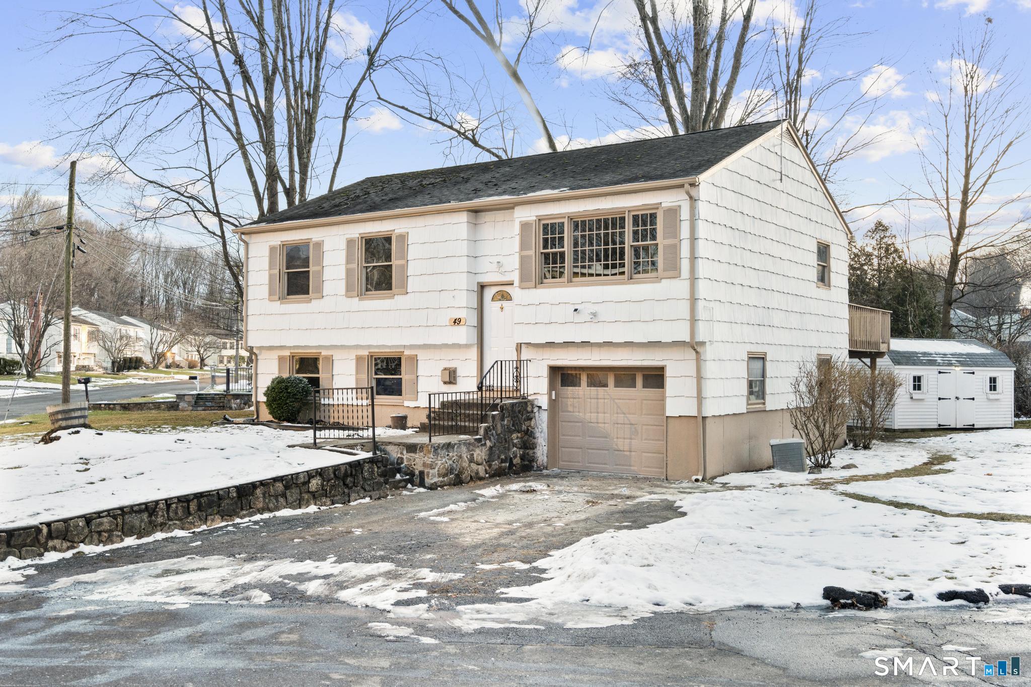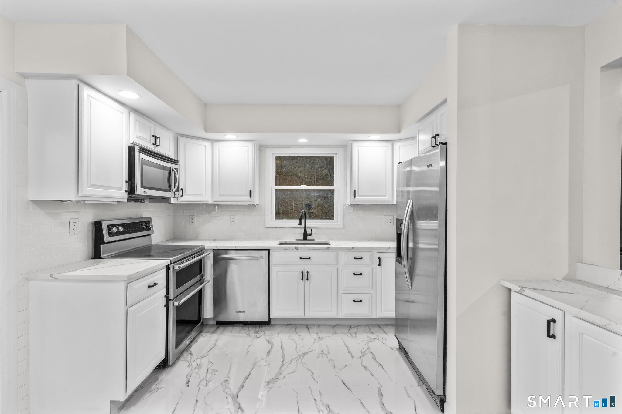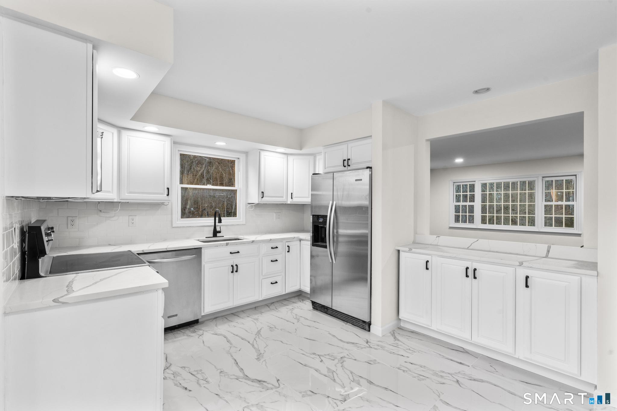 Welcome to 49 Sleepy Hollow Drive, an updated raised ranch set on a desirable corner lot, offering modern upgrades, flexible living space, and excellent New York commuter access. Located on a quiet residential street just minutes from I-84, Route 7, Metro-North, and the NY border, this home provides both privacy and convenience. The sun-filled main level features beautifully refinished hardwood floors, recessed lighting, and a stylish fireplace anchoring the living room. The brand-new kitchen showcases white cabinetry, quartz countertops, stainless steel appliances, and elegant marble-style flooring, with sliding glass doors leading to a private rear deck ideal for entertaining. The upper level offers 3 comfortable bedrooms and a completely renovated full bathroom in a clean, neutral palette. The finished lower level adds exceptional versatility, featuring a spacious family or recreation room, additional finished rooms ideal for a home office, guest suite, or potential fourth bedroom, multiple fully renovated bathrooms with walk-in tiled showers, a laundry area, ample storage, and direct access to the attached garage, making it well-suited for in-law or multi-generational living potential. A turn-key raised ranch offering space, flexibility, corner-lot appeal, and commuter-friendly living in a prime Danbury location.