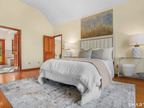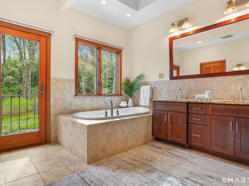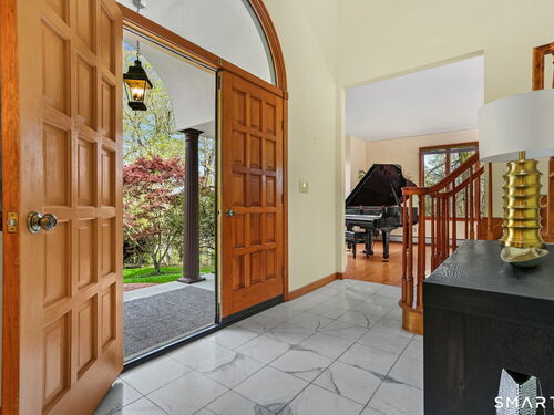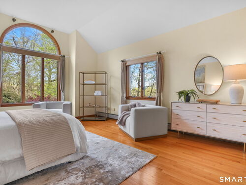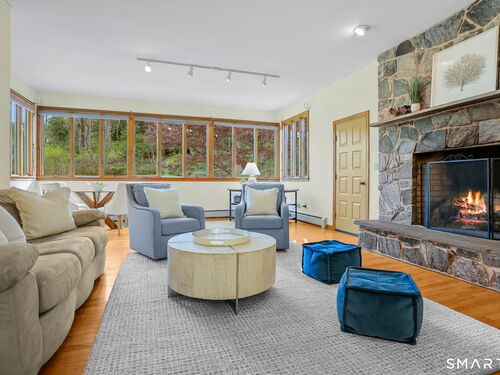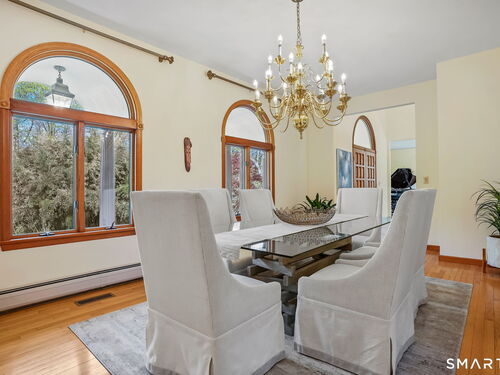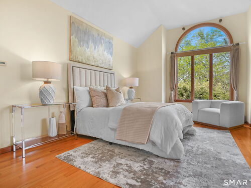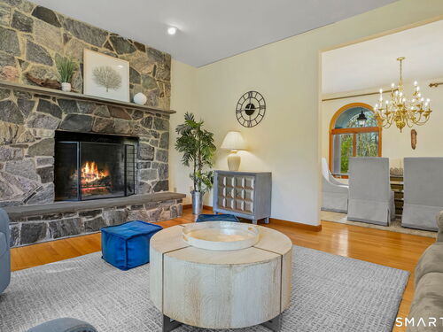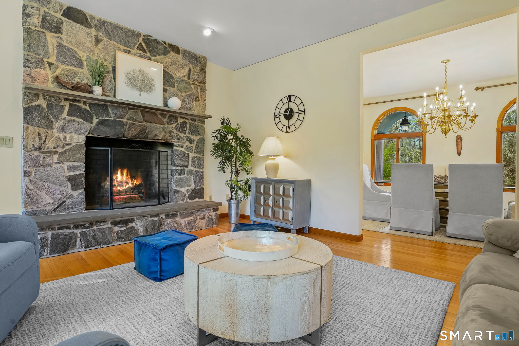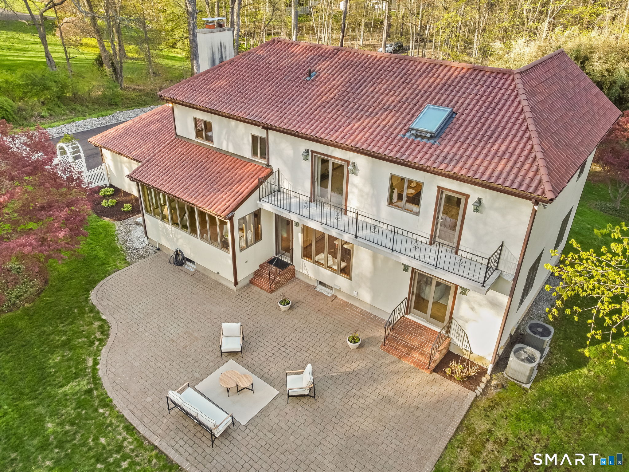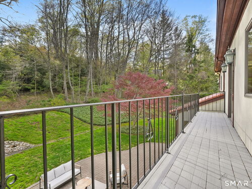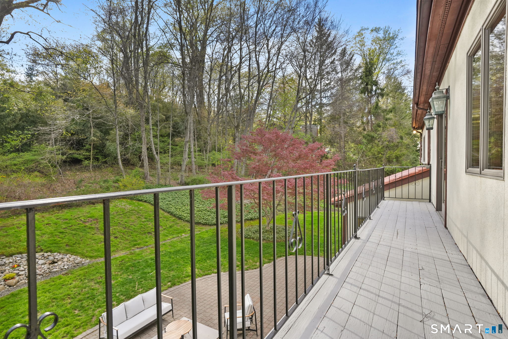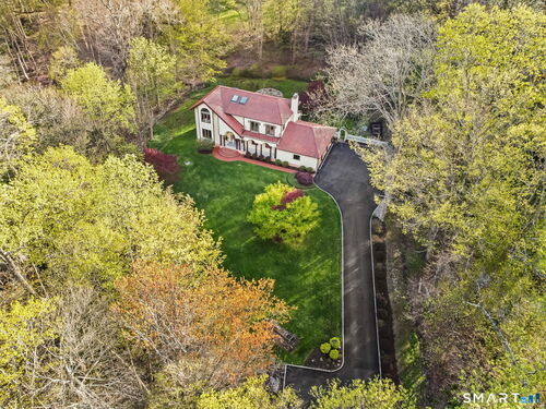 Set gracefully back from the road on an oversized 2.17 acre lot, this pristine 4-bedroom colonial offers tons of privacy and tranquility while being in an excellent commuting location. The freshly painted Mediterranean-inspired facade greets you with a timeless sense of warmth and welcome. Inside, 9 foot ceilings on the main and 2nd levels create an airy, open feel while sun-drenched rooms and gleaming hardwood floors highlight the home's impeccable condition and thoughtful design. The main level boasts an expansive front to back living room with sliders to the elegant back yard, spacious dining room with Palladian windows, inviting family room with stone fireplace, eat-in kitchen overlooking the beautiful back paver patio, and half bath. Retreat upstairs to the fabulous primary suite with vaulted ceiling, huge walk-in closet, and spa bath with door to outdoor balcony. 3 more good sized bedrooms share recently updated full bath - and 2 of the bedrooms have their own balcony. The upstairs landing, also with balcony access, is a flexible space that makes a great office or kids area. The sprawling finished basement with half bath, wet bar, and pantry offers tons of possibilities as well. The 3 car garage and ample storage is icing on the cake. All this just minutes from the Merritt, metro-north, shopping, restaurants, hiking trails, farm stands, and pickleball courts.