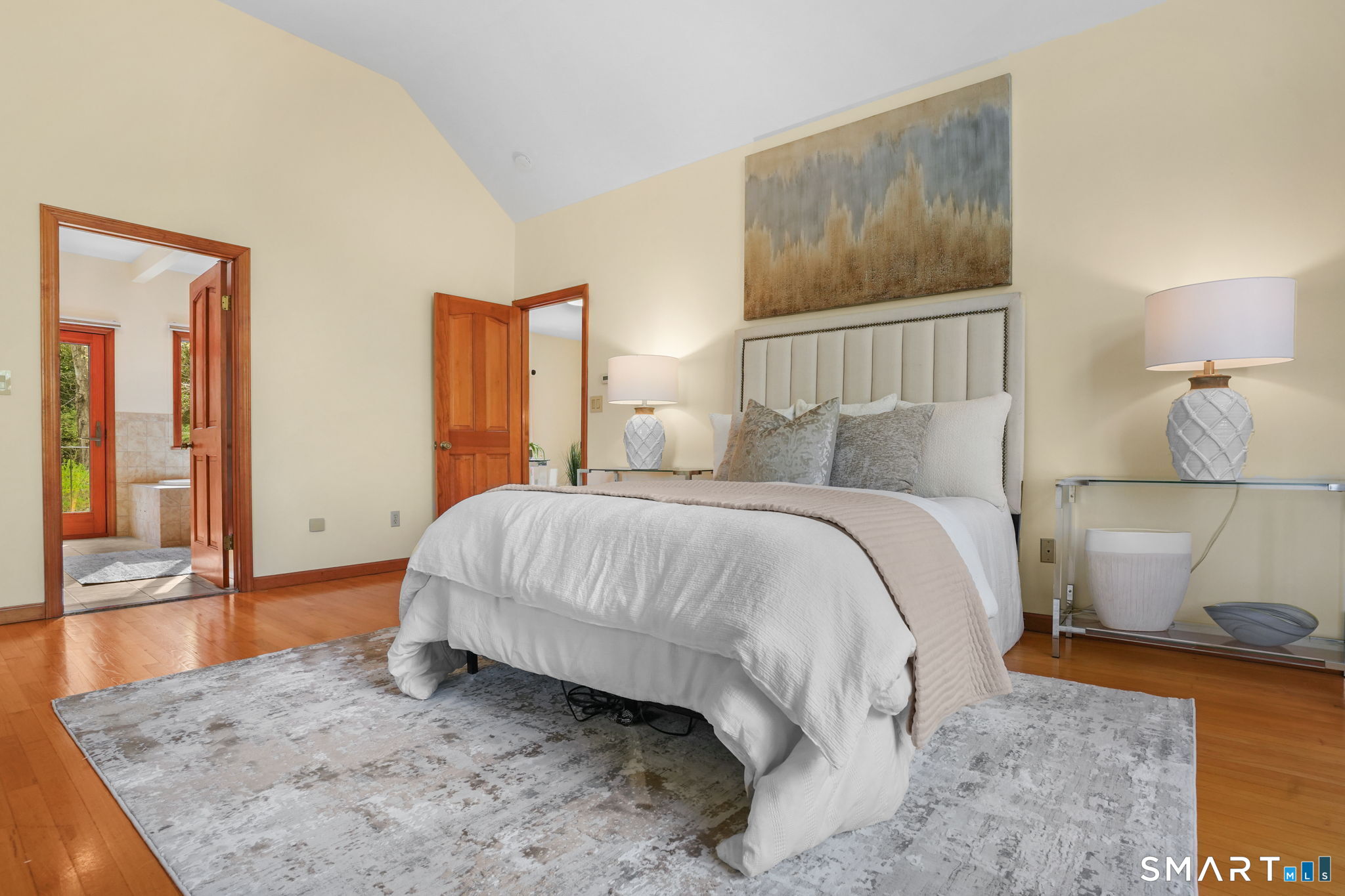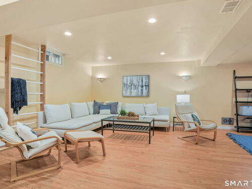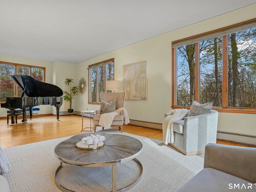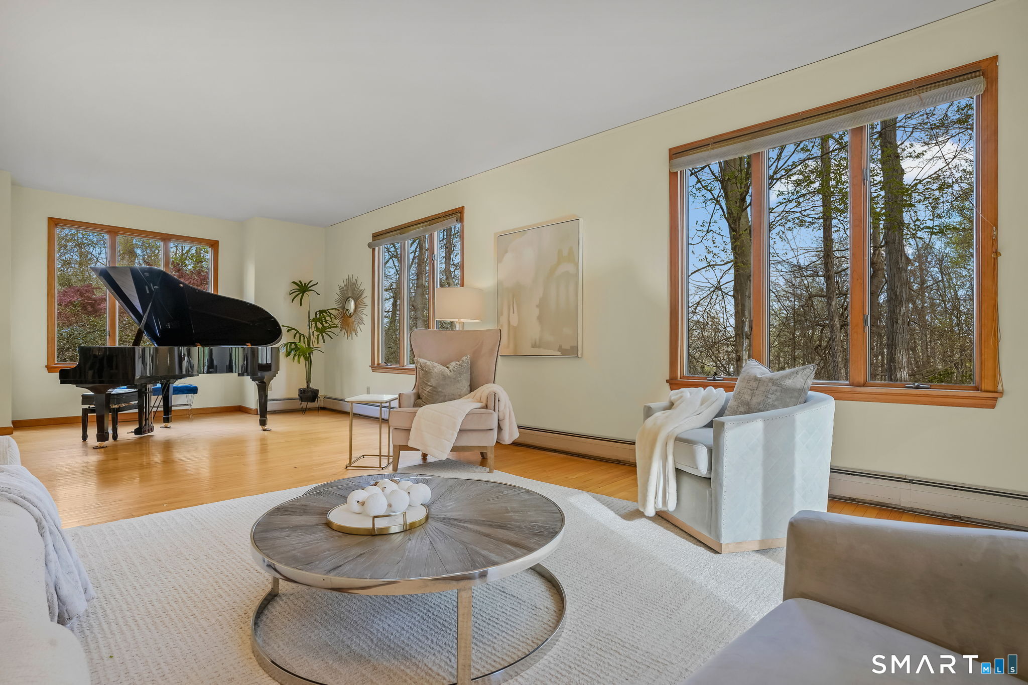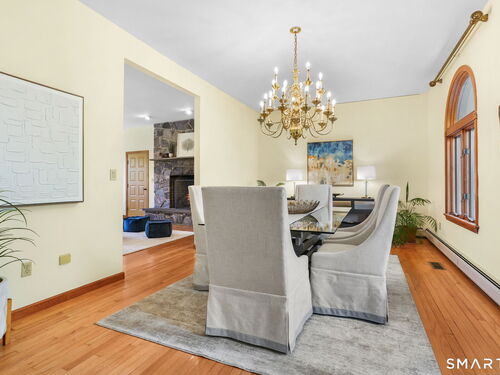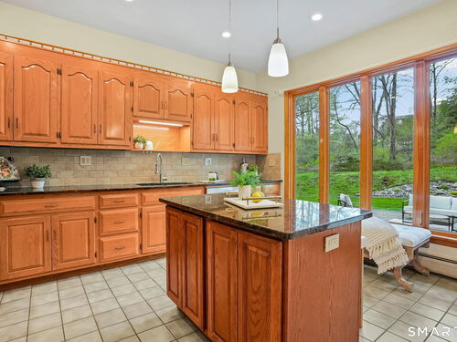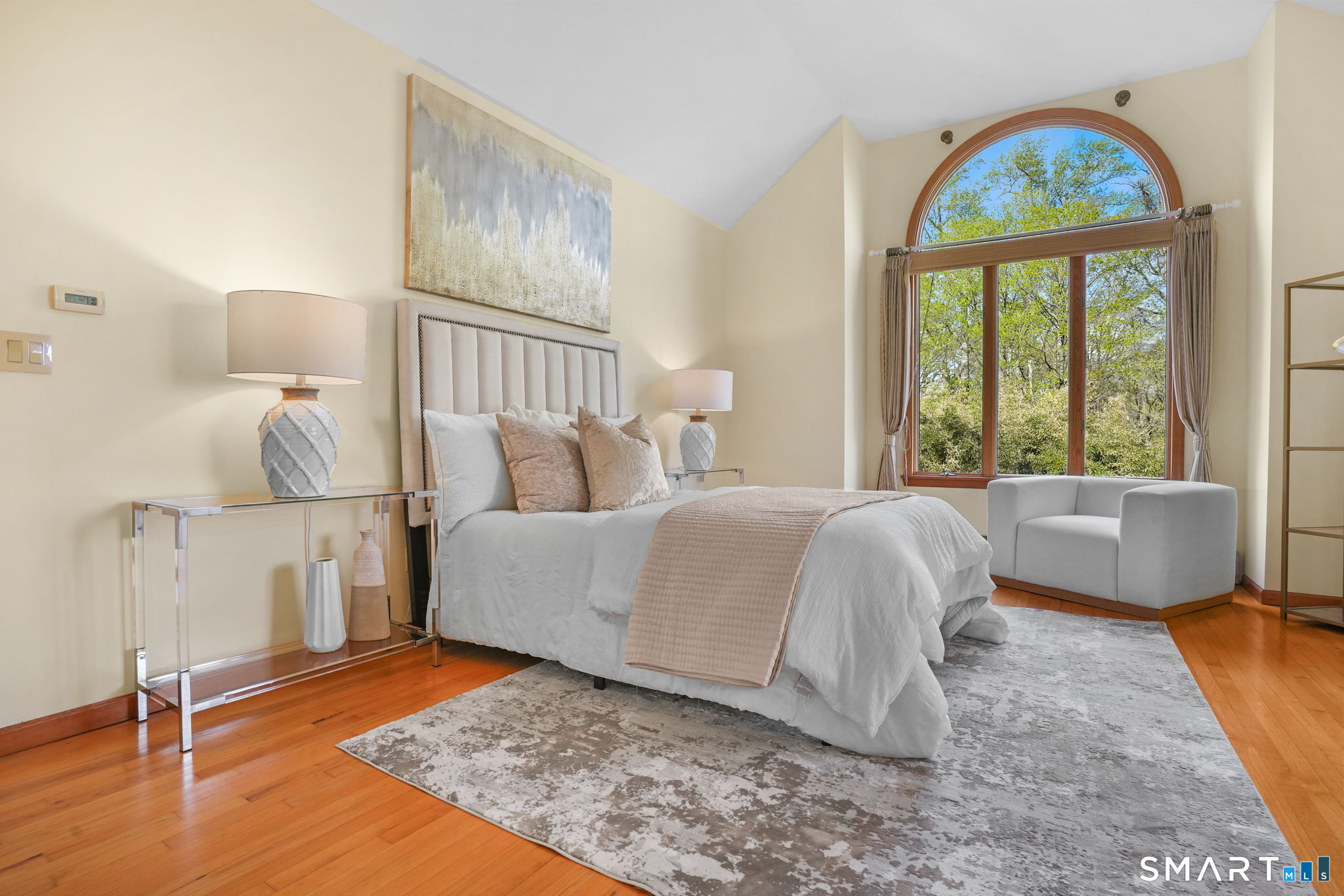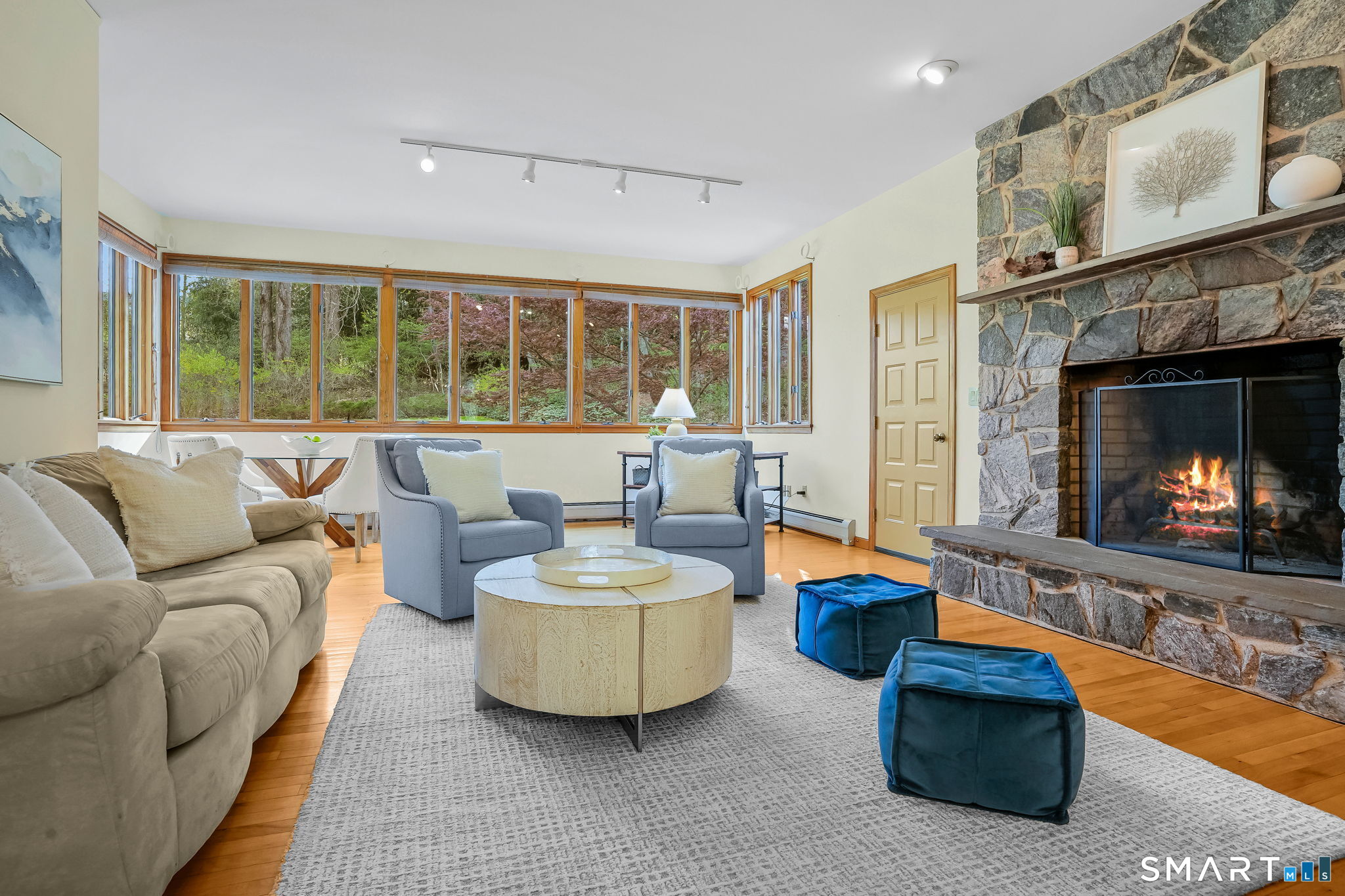 Set gracefully back from the road on an oversized 2.17 acre lot, this pristine 4-bedroom colonial offers tons of privacy and tranquility while being in an excellent commuting location. The freshly painted Mediterranean-inspired facade greets you with a timeless sense of warmth and welcome. Inside, 9 foot ceilings on the main and 2nd levels create an airy, open feel while sun-drenched rooms and gleaming hardwood floors highlight the home's impeccable condition and thoughtful design. The main level boasts an expansive front to back living room with sliders to the elegant back yard, spacious dining room with Palladian windows, inviting family room with stone fireplace, eat-in kitchen overlooking the beautiful back paver patio, and half bath. Retreat upstairs to the fabulous primary suite with vaulted ceiling, huge walk-in closet, and spa bath with door to outdoor balcony. 3 more good sized bedrooms share recently updated full bath - and 2 of the bedrooms have their own balcony. The upstairs landing, also with balcony access, is a flexible space that makes a great office or kids area. The sprawling finished basement with half bath, wet bar, and pantry offers tons of possibilities as well. The 3 car garage and ample storage is icing on the cake. All this just minutes from the Merritt, metro-north, shopping, restaurants, hiking trails, farm stands, and pickleball courts.