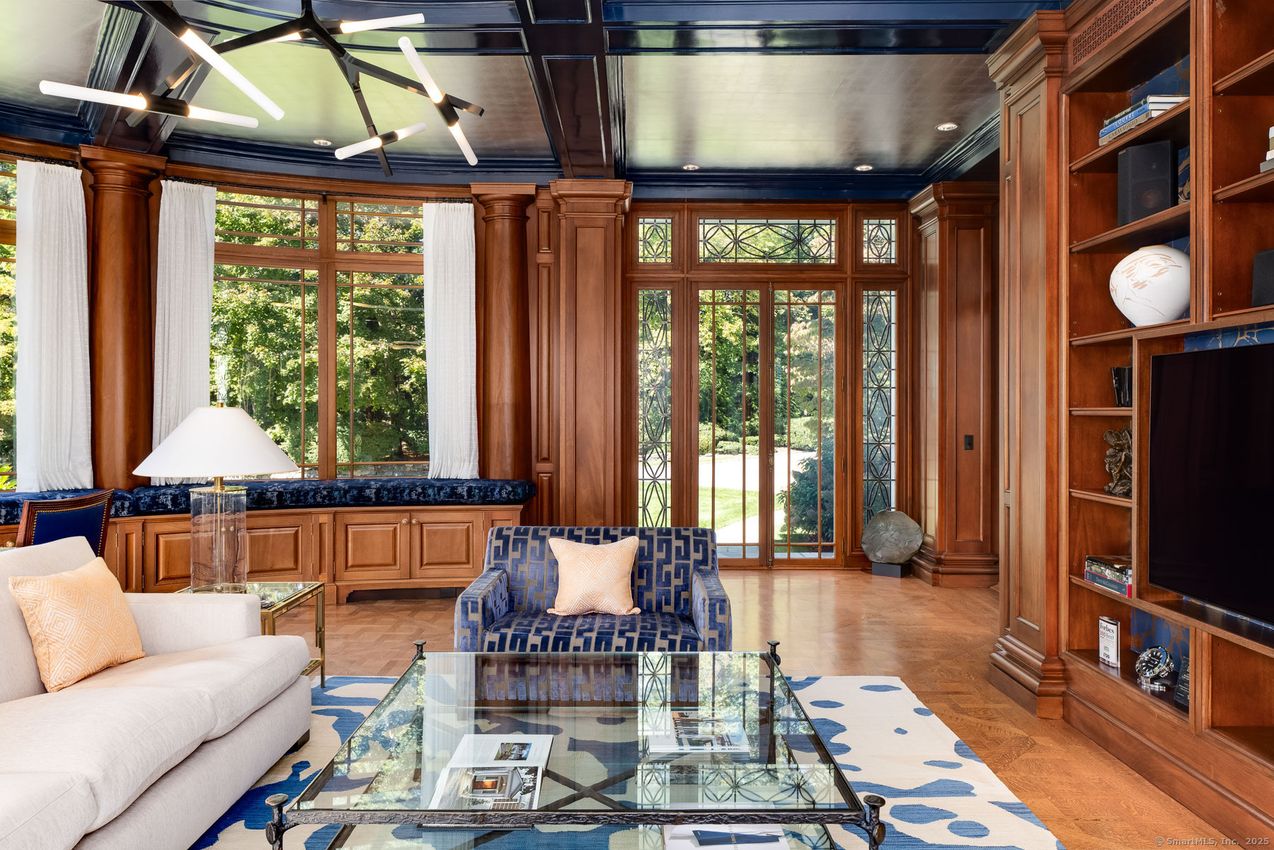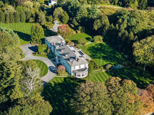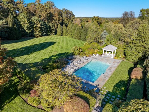 Set on one of New Canaan's highest elevations, this iconic country estate offers a rare combination of architectural distinction, modern functionality, and understated luxury. Exquisitely restored by renowned architects Wadia Associates, the 14-room manor balances timeless design with contemporary ease. A grand reception hall introduces a sequence of formal rooms with soaring ceilings, curved glass windows, lacquered finishes, and classic French doors that open seamlessly to the outdoors. At the heart of the home, the Smallbone of Devizes kitchen with walls of Calacatta marble and top-tier appliances flows seamlessly into a light-filled family room overlooking four stunning sculpted acres. The primary wing, is a private retreat of more than 1,100 square feet, featuring a spa-style bath and expansive dressing room. Four additional en-suite bedrooms graciously complete the second floor with an additional spacious & sunny room/office on the third floor. Thoughtfully equipped as a smart home, the property places technology and convenience at your fingertips. Outside, landscaped grounds unfold with an expansive terrace, covered porch, heated pool, and cabana-an environment designed equally for quiet weekends or refined entertaining. Every detail reflects a commitment to craftsmanship and lifestyle, creating a residence that is both stately and livable. This is New Canaan at its most elevated-a rare opportunity to own a property where design, privacy, and comfort converge.