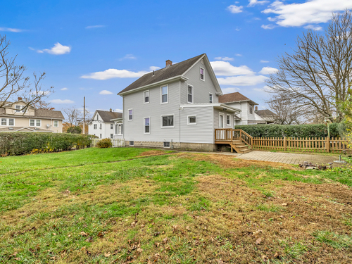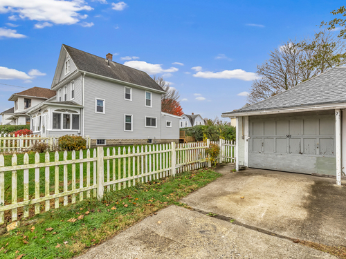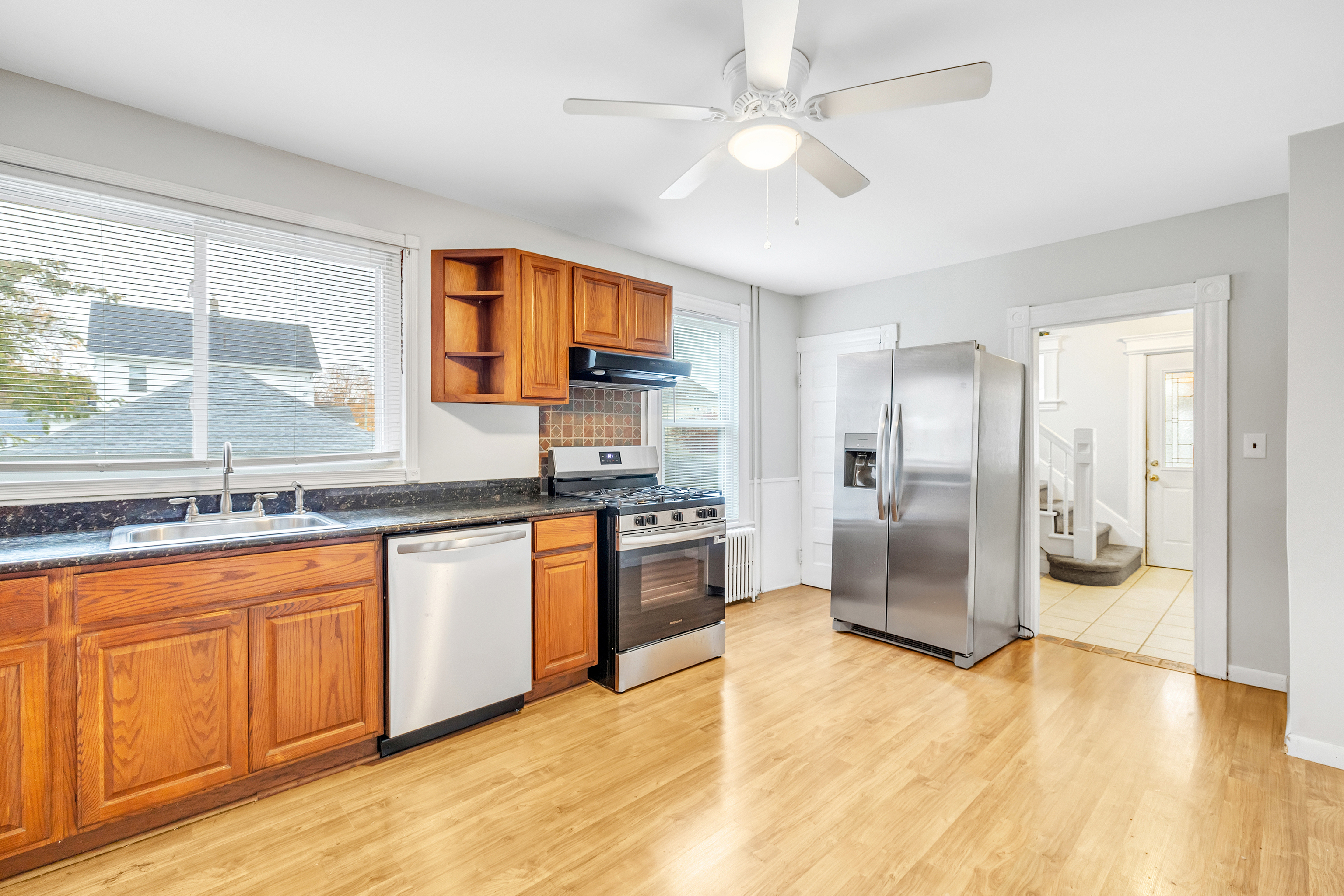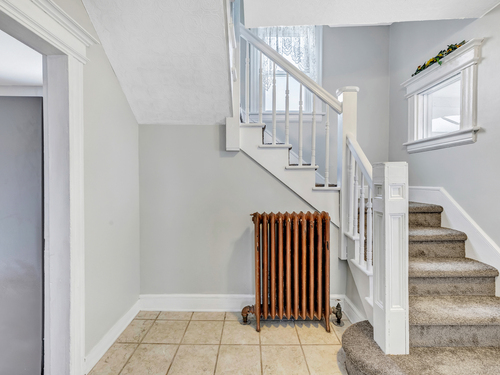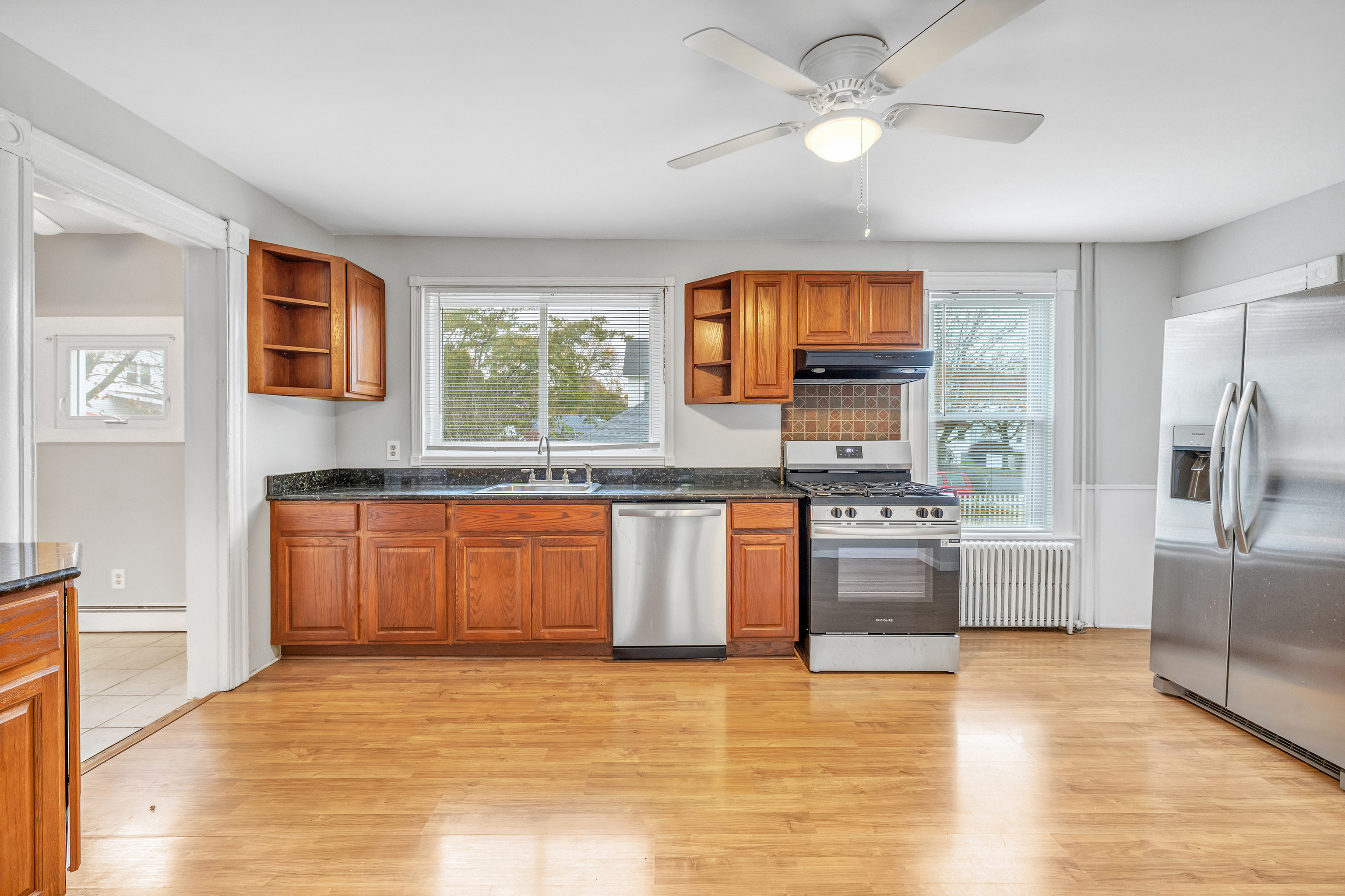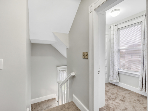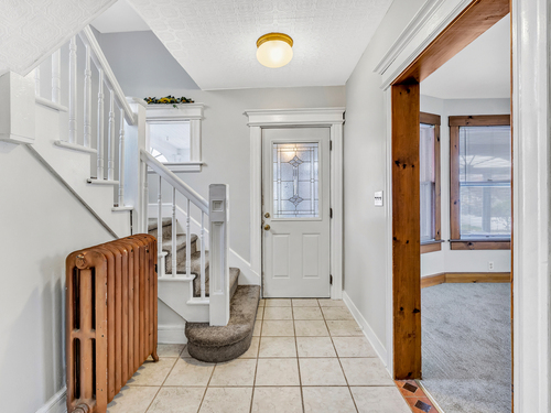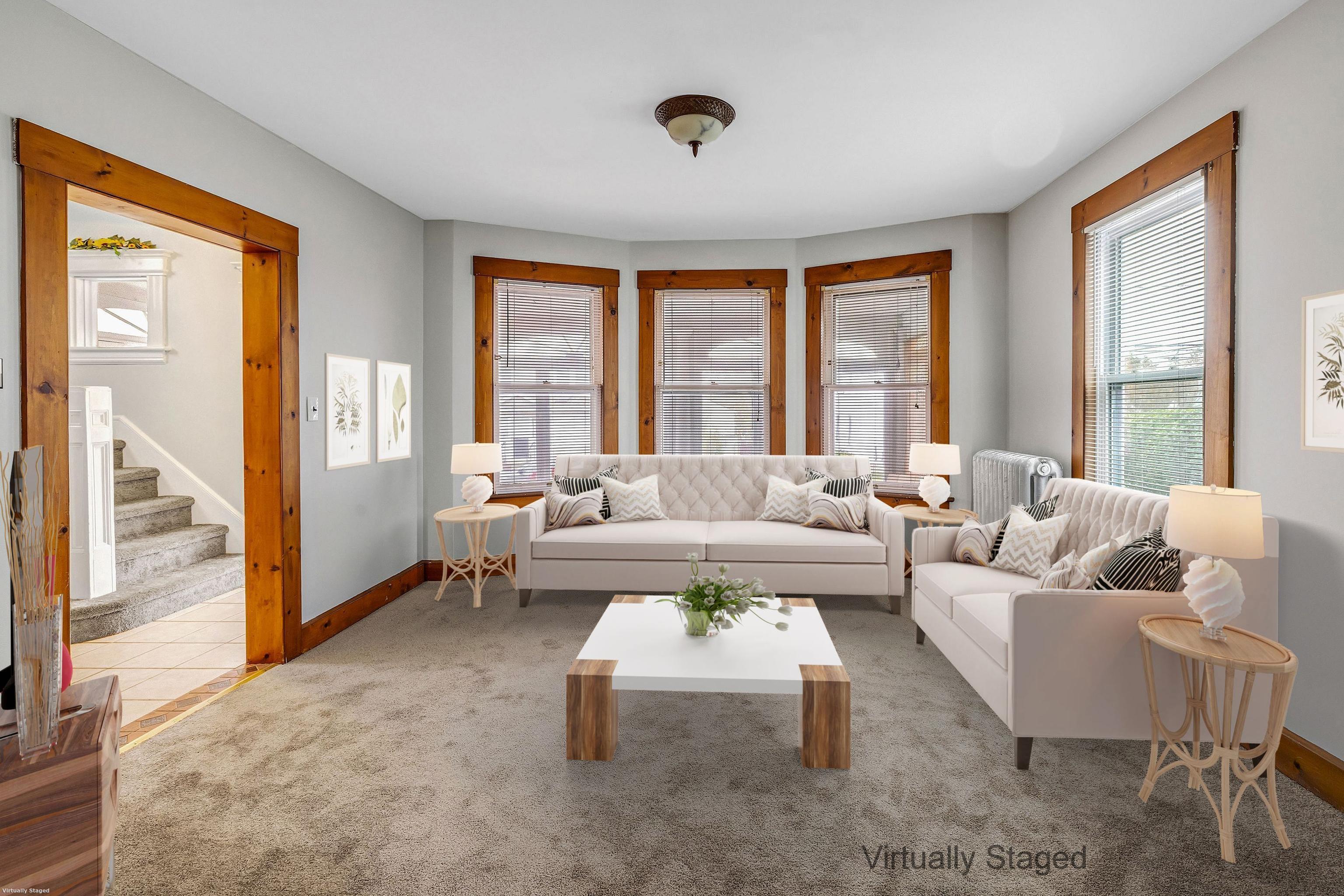 Ideally sited less than a mile from the train and a hop skip and a jump to the schools, this charming home makes life easy! The enclosed front porch is a lovely introduction in to the warm and welcoming entryway that opens into a cozy living room with wall to wall carpet and a bowed wall of windows. The formal dining room is ideal for entertaining with a bowed wall of windows and a ceiling fan. The eat in kitchen is the perfect place for gatherings and leads to a mudroom and a full bathroom on the main level! The 2nd floor has 2 bedrooms and a third flex space perfect for4 a reading nook or yoga space with stairs to a 3rd floor with 2 flex rooms that could serve as bedrooms, office space, craft rooms....your imagination is the only limitation! Brand new natural gas hot water heater. Gas stove. Oil heat.