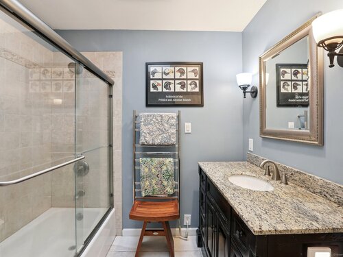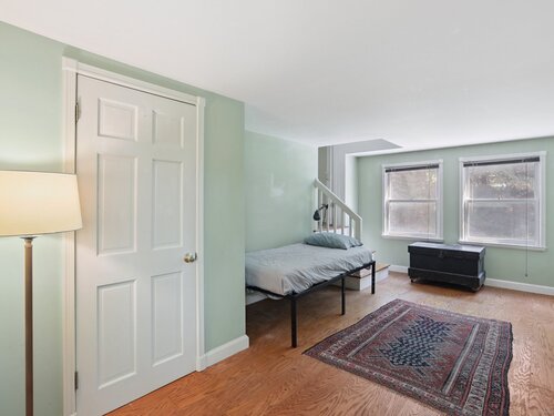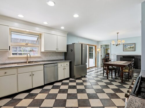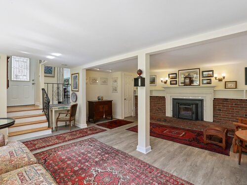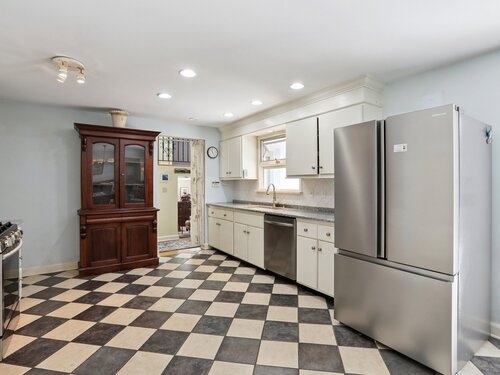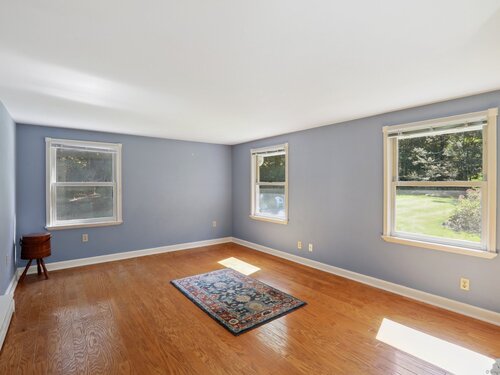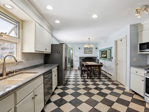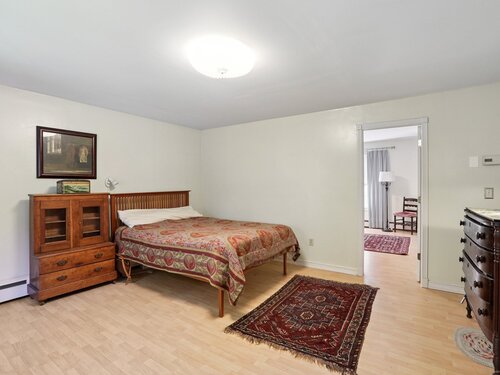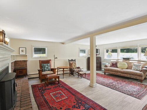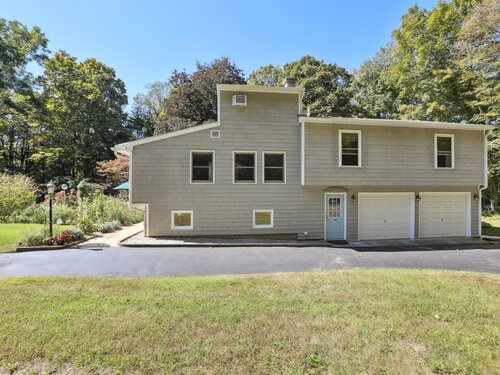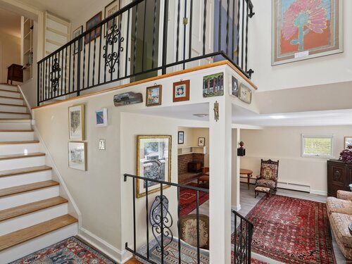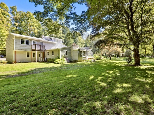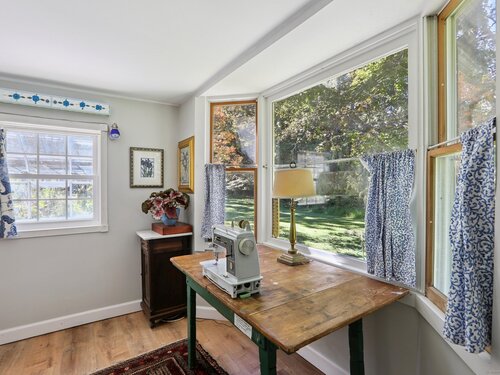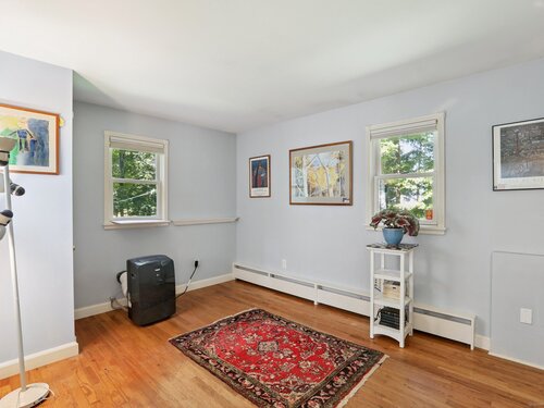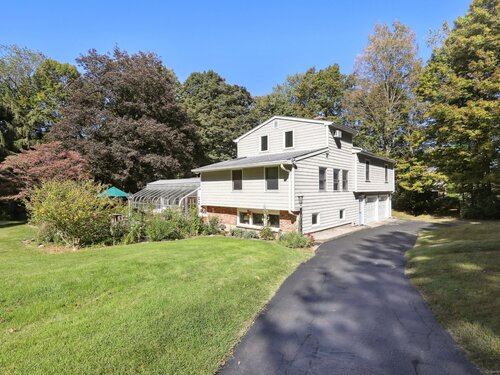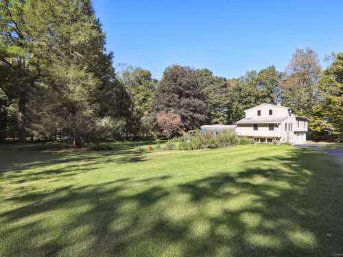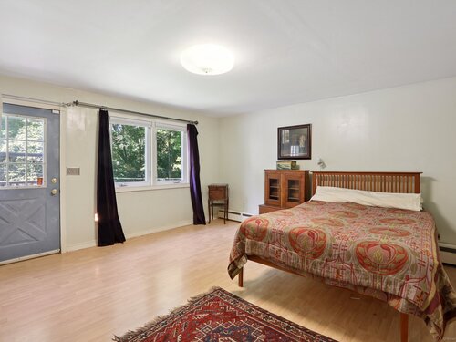 This unique 5+ bedroom home, on 1.5 private acres, offers a huge sunroom/solarium facing the expansive yard. The large eat-in kitchen features a woodstove, stainless appliances, granite counters and plenty of room for an island. There's two rooms off the kitchen, which can as an office, extra bedroom, or craft room. The larger room has an attached full bath, making it a great option as a main-level primary bedroom. Garage access is only a few steps away from the kitchen. The cozy living room has a pellet stove. Bedrooms are on different levels, offering easy multi-generational or home office living arrangements. Off the primary bedroom is a Juliet balcony and another bedroom that could be used as a huge walk-in closet or turned into a primary bathroom. The room on the top floor could make a wonderful studio, remote office or exercise space. Newer improvements include a brand new Peerless boiler, plus updated kitchen, windows, and bathrooms.
