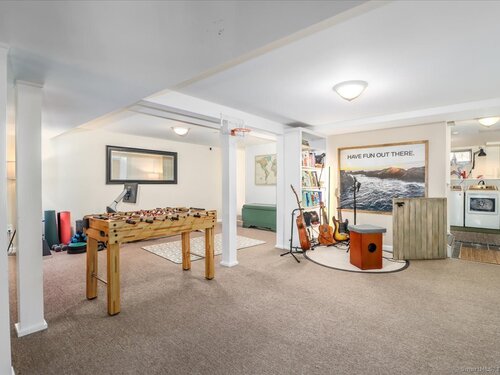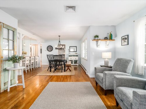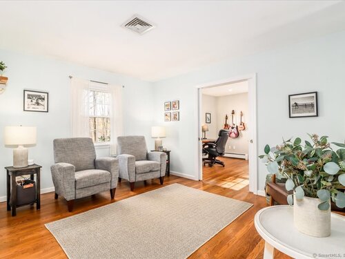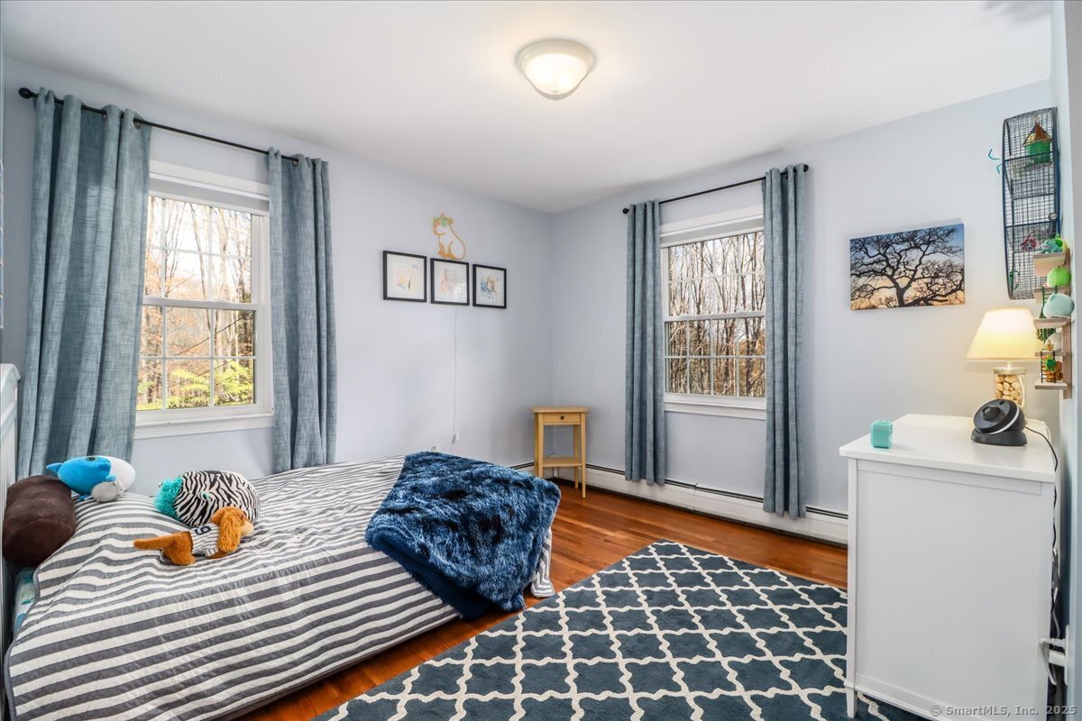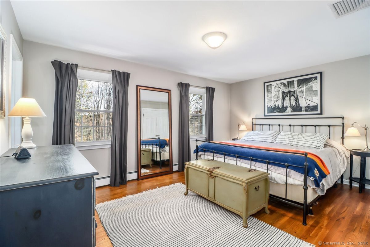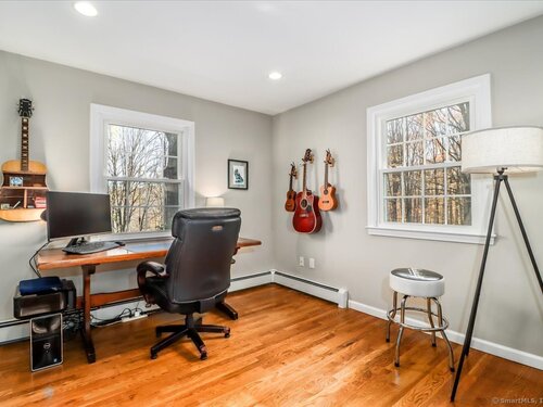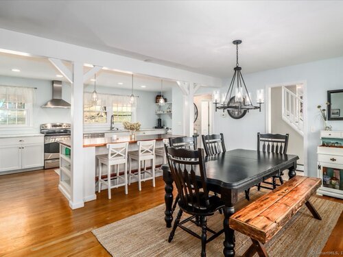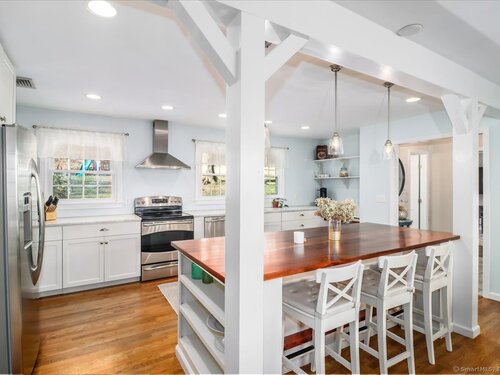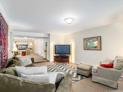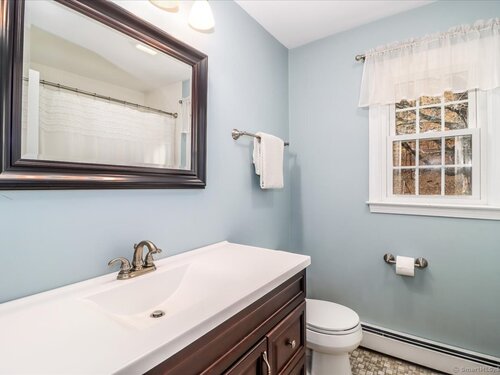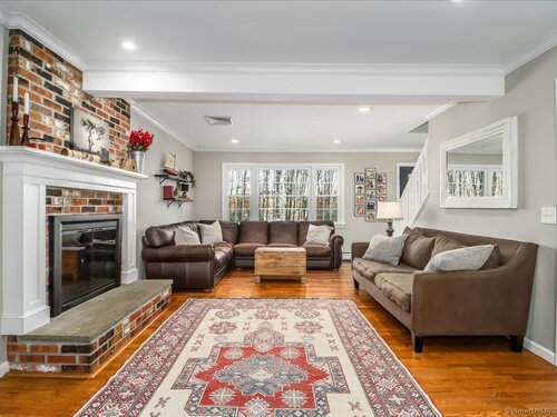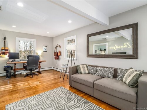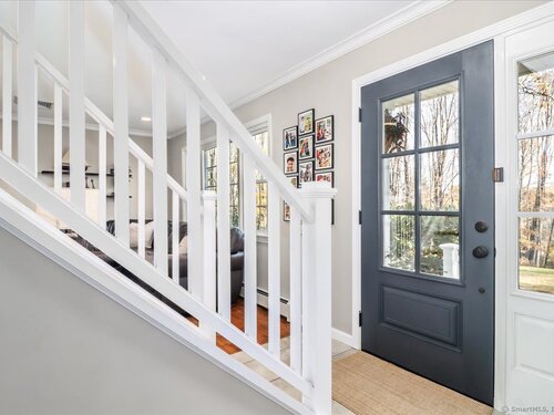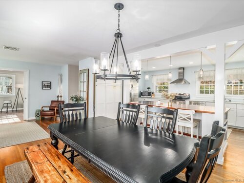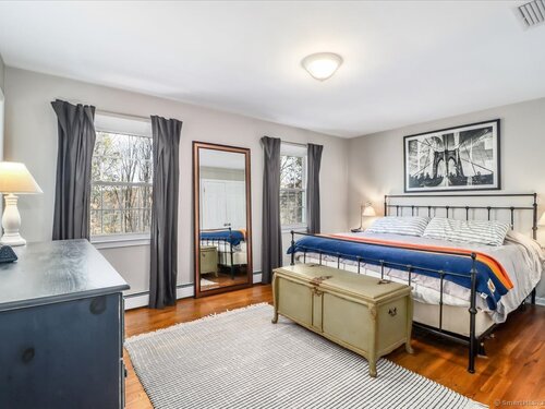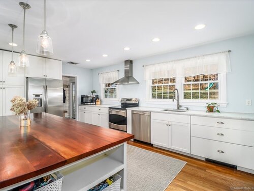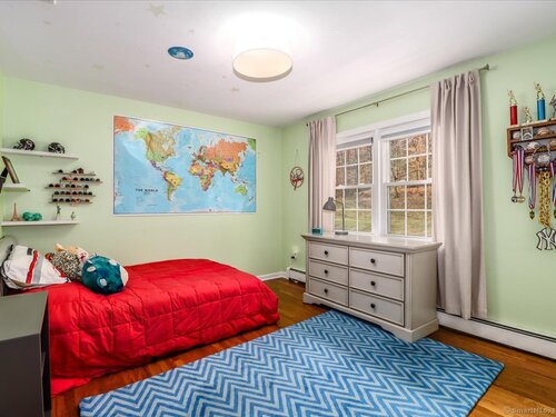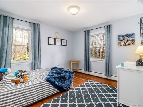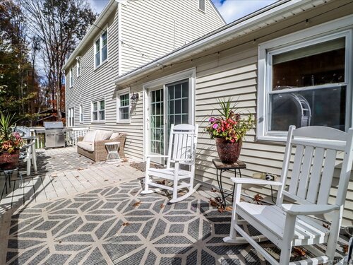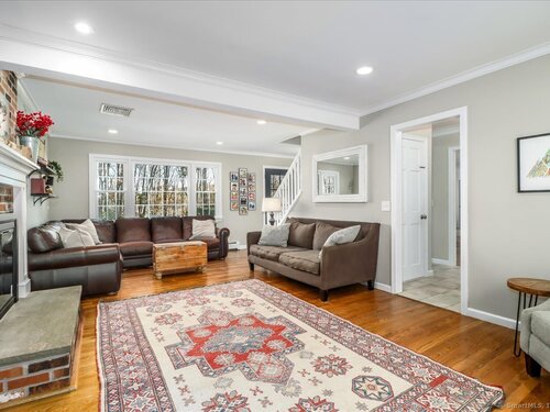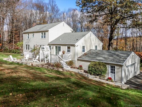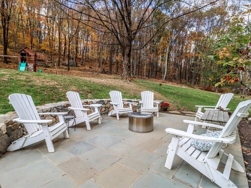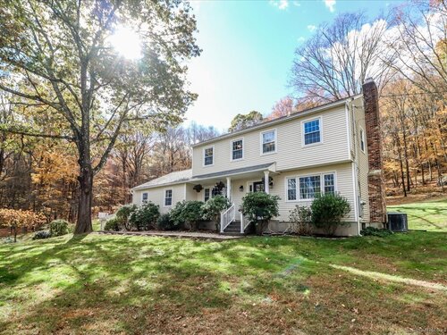 This spacious 5-bedroom Colonial, located in Bethel, CT, offers an updated open floor plan on 2.23 private, tree-lined acres. The home features a bright and sunny interior. The main level includes a gourmet kitchen equipped with marble countertops and a large island featuring a mahogany countertop. Adjacent to the kitchen are a dining room and a living room with a fireplace. A versatile family room, which can also serve as a fifth bedroom, is located on this level and includes a full bath. Both the main and upper levels boast hardwood flooring throughout. The upper level houses four bedrooms and two full baths, along with custom closets in each bedroom. The lower level provides additional living space with wall-to-wall carpeting, built-in bookshelves, and a dedicated laundry room. The home is equipped with central air conditioning for comfort. Exterior features complement the interior, including a large deck and a flagstone patio with a fire pit in the backyard. A barnyard shed was installed on September 1, 2025. The property includes a two-car garage and backs up to Stevenson Reserve, offering access to a pond and trails. Conveniently situated on the Redding line, the residence is minutes from the town of Bethel, providing easy access to local amenities, various commutes, and proximity to Metro North.