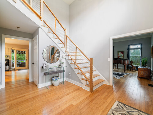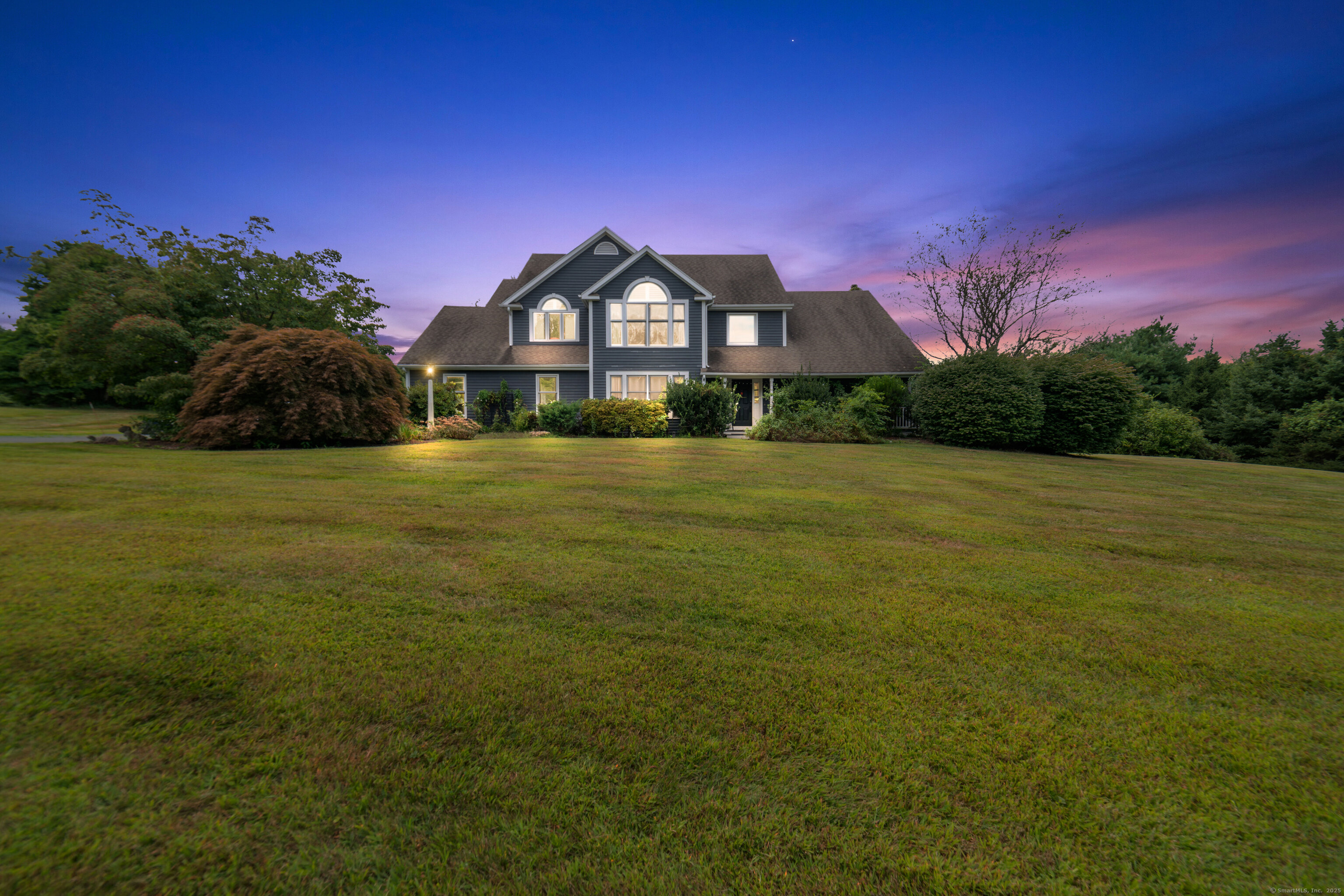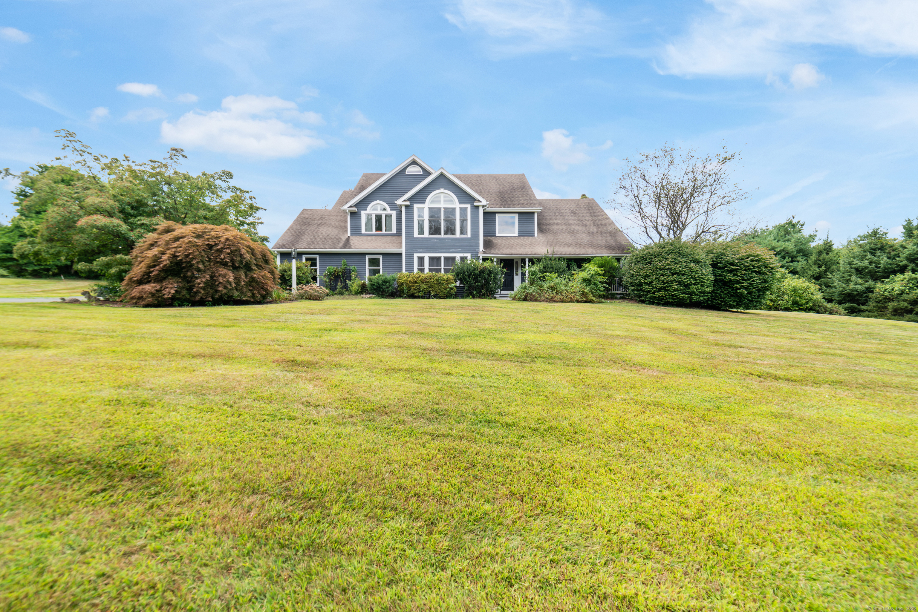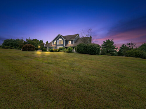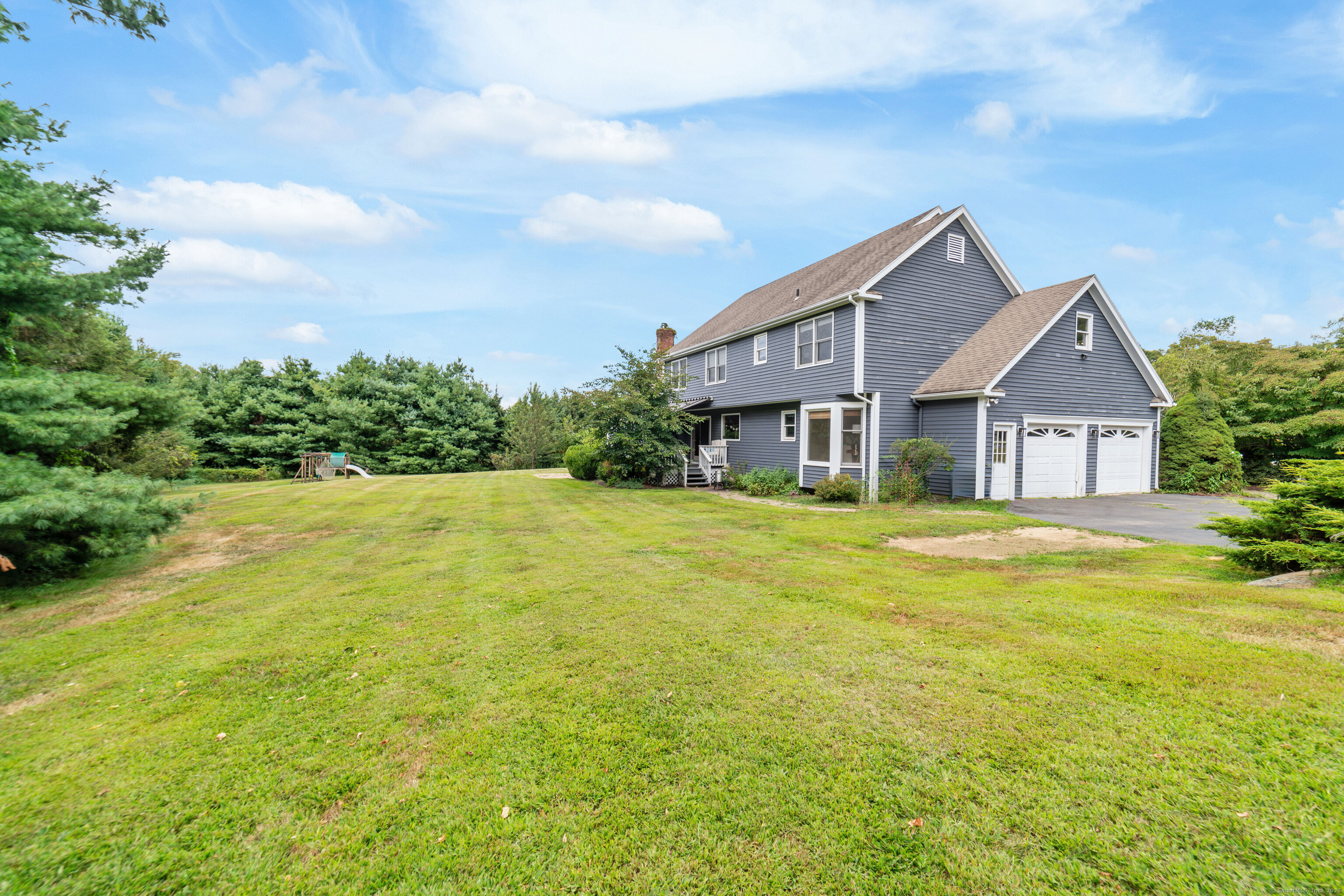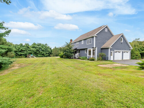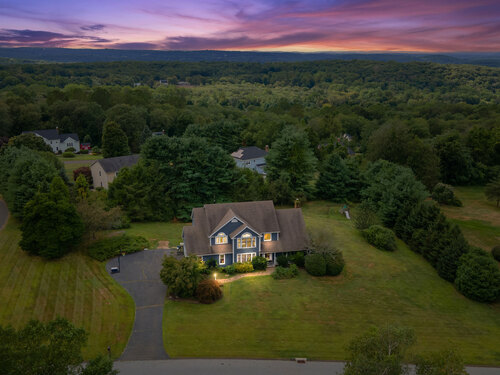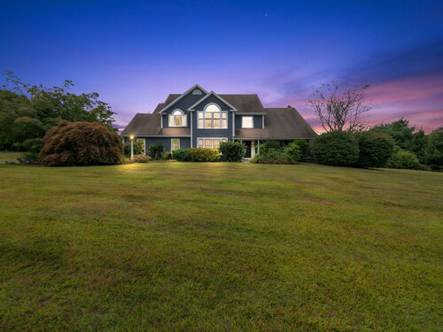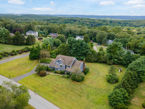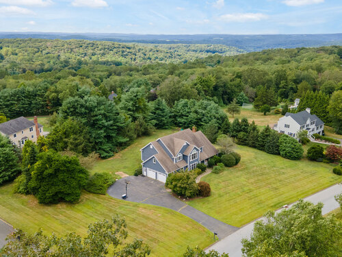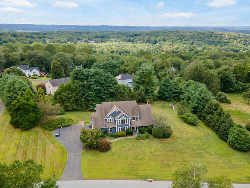 Located in a rural area within Newtown, Connecticut, this colonial home sits on a level, cleared corner lot. Constructed in 1996, the four-bedroom, 2.5-bath residence has been updated with modern aesthetics. The first floor features an open floor plan, with a kitchen equipped with an island, a dining area, a large picture window above the sink, and stainless Kitchen Aide appliances, including a wall oven and microwave. Quartz countertops and contemporary cabinetry are featured in the kitchen. The kitchen flows into the family room. A dining room, and study, are also located on the first floor.The kitchen opens onto a deck with an awning. Bamboo engineered flooring is installed throughout the home first and second floor. A cable-railed stairway with a chandelier lift leads to the second floor. The primary bedroom has ample natural light and includes a walk-in closet, a walk-in shower, and a soaking tub. Three additional bedrooms and a full bath with a walk-in shower are also located on the second floor. Additional features of the property include a dog fence, a generator, a water filtration system, and a propane-fueled continuous water heater. The home also offers a partially finished basement, an electric dog fence and a electric charger for your car in the garage.
