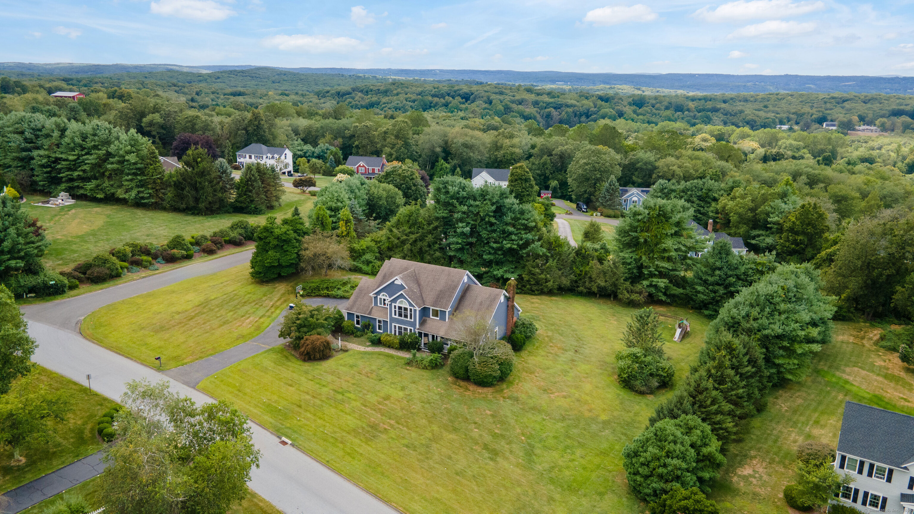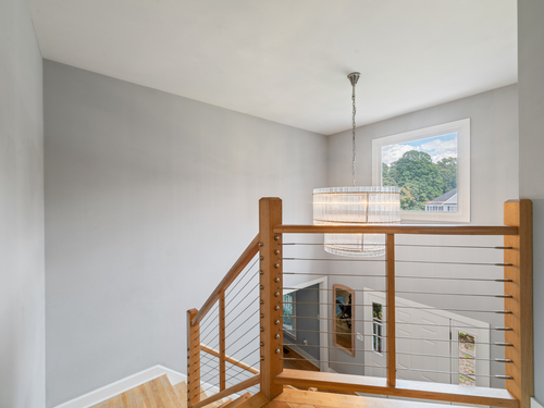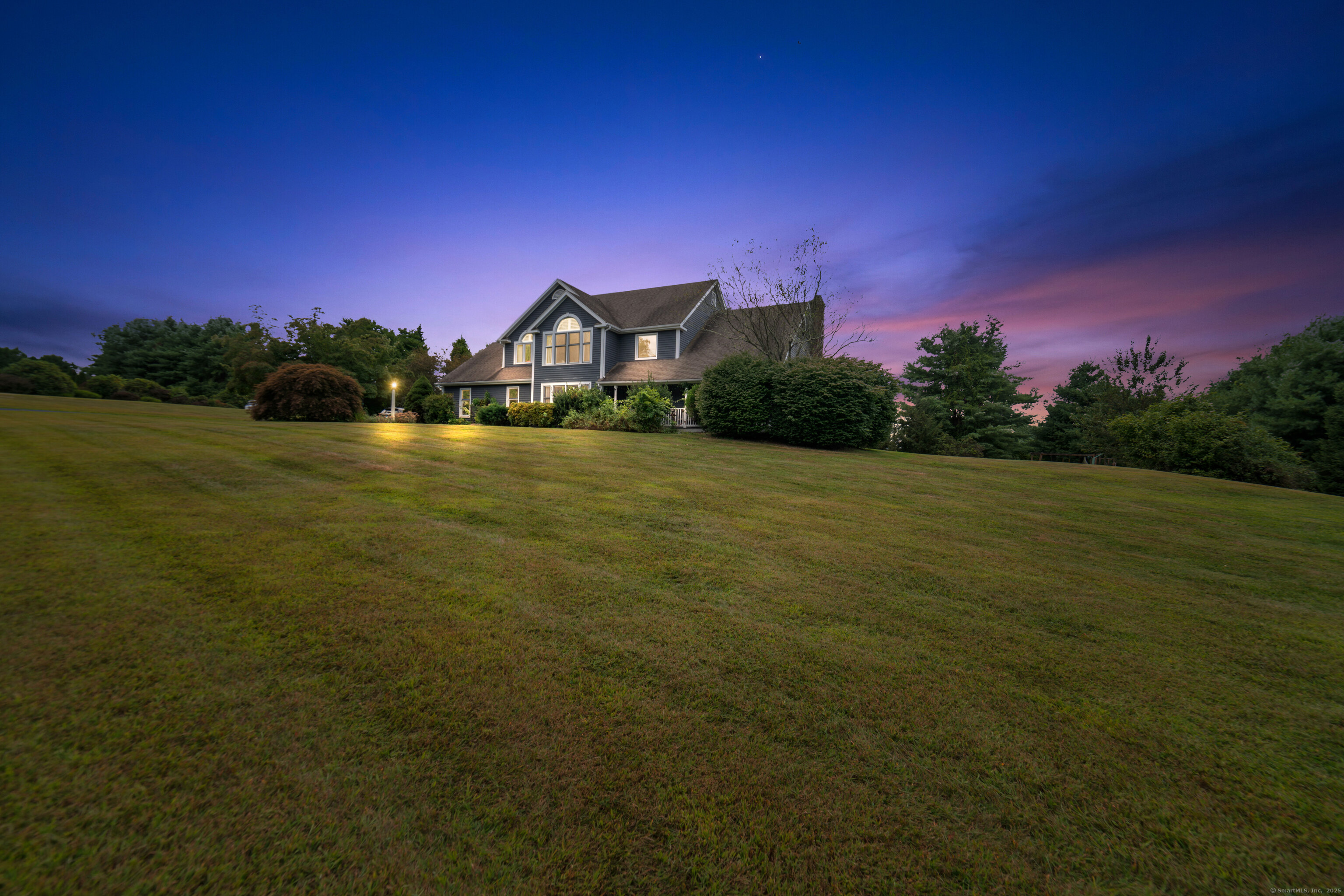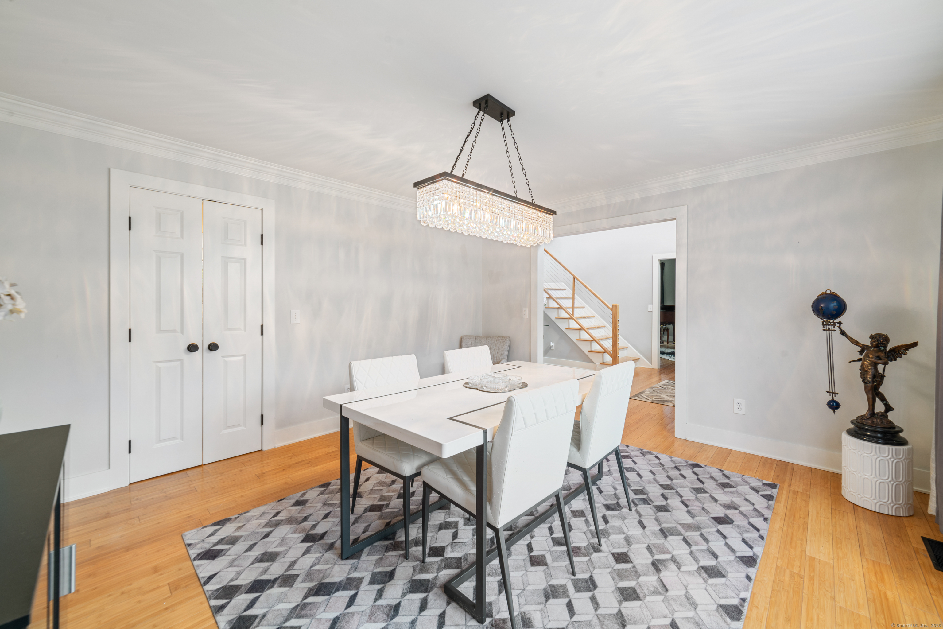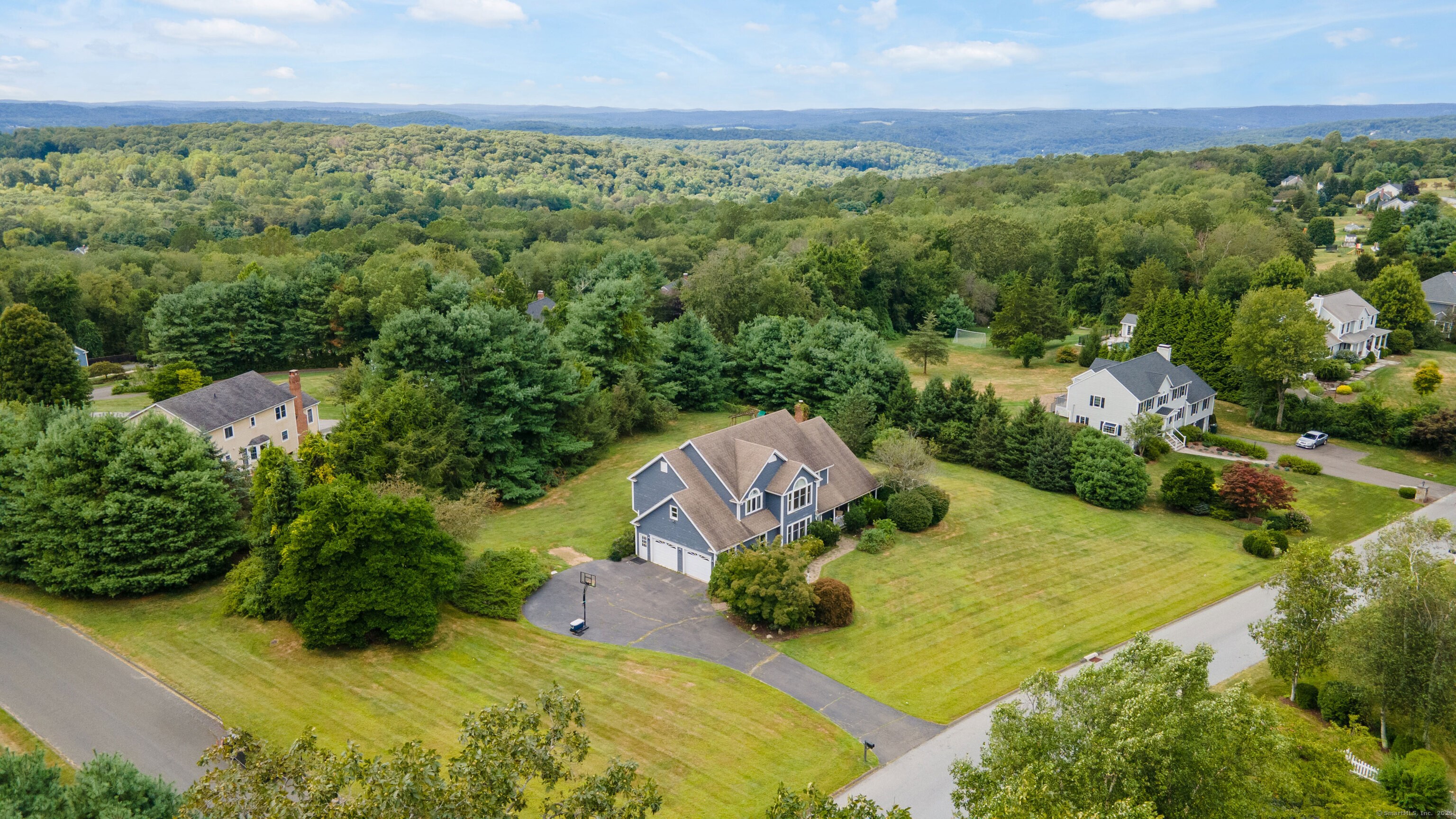Located in a rural area within Newtown, Connecticut, this colonial home sits on a level, cleared corner lot. Constructed in 1996, the four-bedroom, 2.5-bath residence has been updated with modern aesthetics. The first floor features an open floor plan, with a kitchen equipped with an island, a dining area, a large picture window above the sink, and stainless Kitchen Aide appliances, including a wall oven and microwave. Quartz countertops and contemporary cabinetry are featured in the kitchen. The kitchen flows into the family room. A dining room, and study, are also located on the first floor.The kitchen opens onto a deck with an awning. Bamboo engineered flooring is installed throughout the home first and second floor. A cable-railed stairway with a chandelier lift leads to the second floor. The primary bedroom has ample natural light and includes a walk-in closet, a walk-in shower, and a soaking tub. Three additional bedrooms and a full bath with a walk-in shower are also located on the second floor. Additional features of the property include a dog fence, a generator, a water filtration system, and a propane-fueled continuous water heater. The home also offers a partially finished basement, an electric dog fence and a electric charger for your car in the garage.