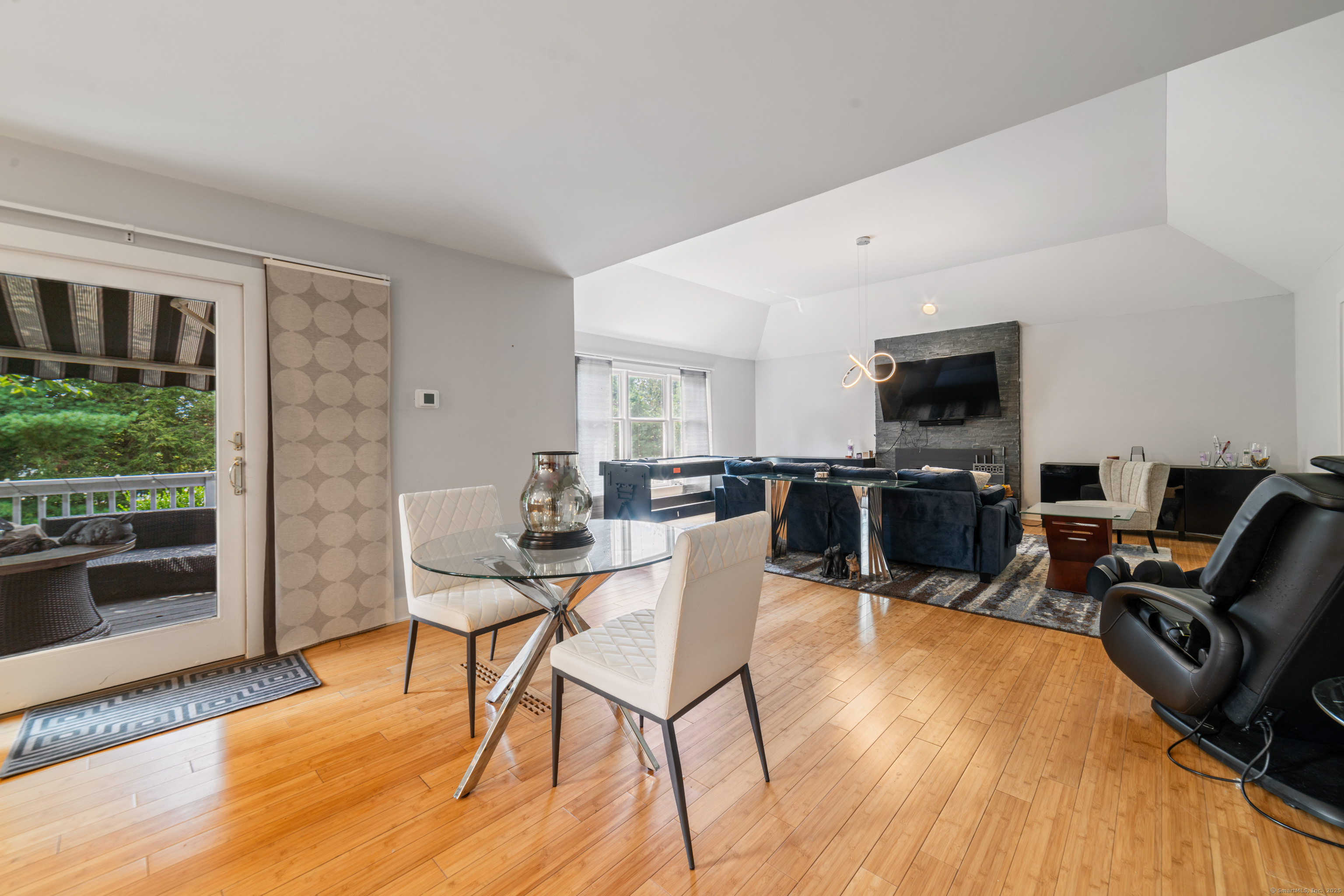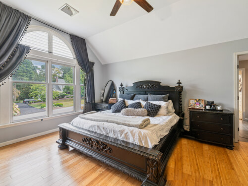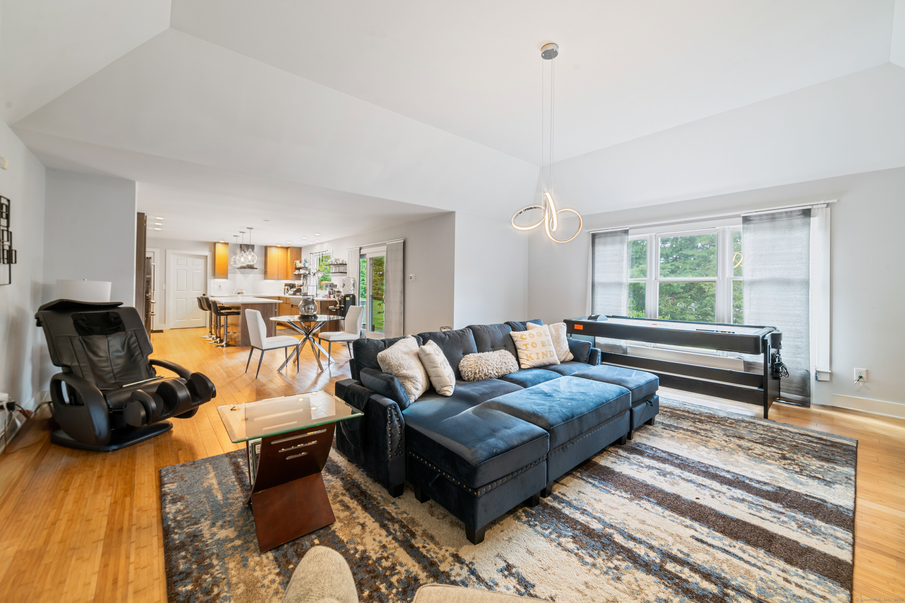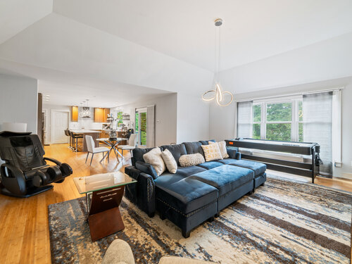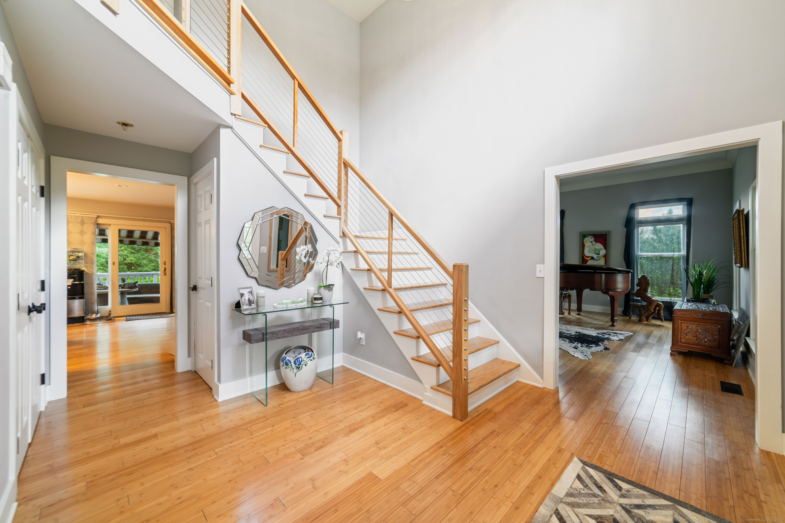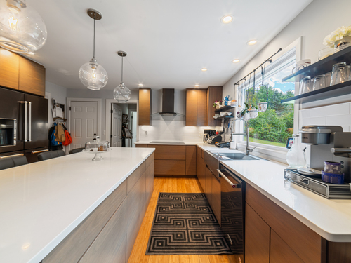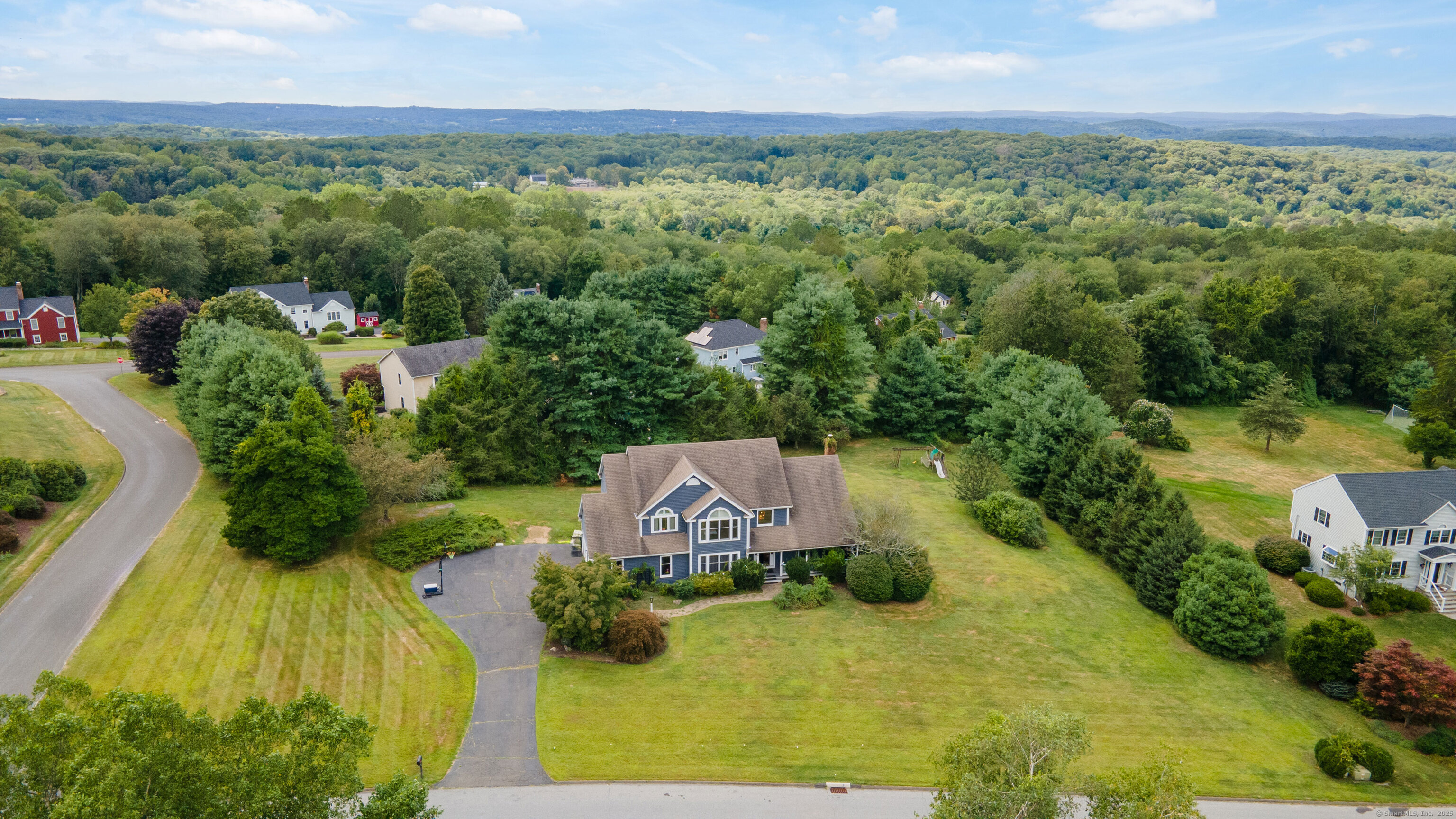 Located in a rural area within Newtown, Connecticut, this colonial home sits on a level, cleared corner lot. Constructed in 1996, the four-bedroom, 2.5-bath residence has been updated with modern aesthetics. The first floor features an open floor plan, with a kitchen equipped with an island, a dining area, a large picture window above the sink, and stainless Kitchen Aide appliances, including a wall oven and microwave. Quartz countertops and contemporary cabinetry are featured in the kitchen. The kitchen flows into the family room. A dining room, and study, are also located on the first floor.The kitchen opens onto a deck with an awning. Bamboo engineered flooring is installed throughout the home first and second floor. A cable-railed stairway with a chandelier lift leads to the second floor. The primary bedroom has ample natural light and includes a walk-in closet, a walk-in shower, and a soaking tub. Three additional bedrooms and a full bath with a walk-in shower are also located on the second floor. Additional features of the property include a dog fence, a generator, a water filtration system, and a propane-fueled continuous water heater. The home also offers a partially finished basement, an electric dog fence and a electric charger for your car in the garage.
