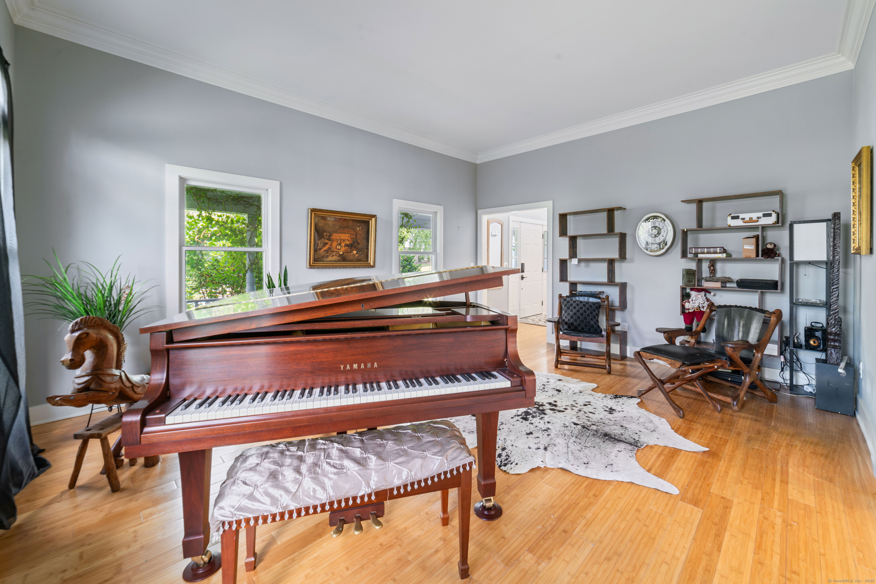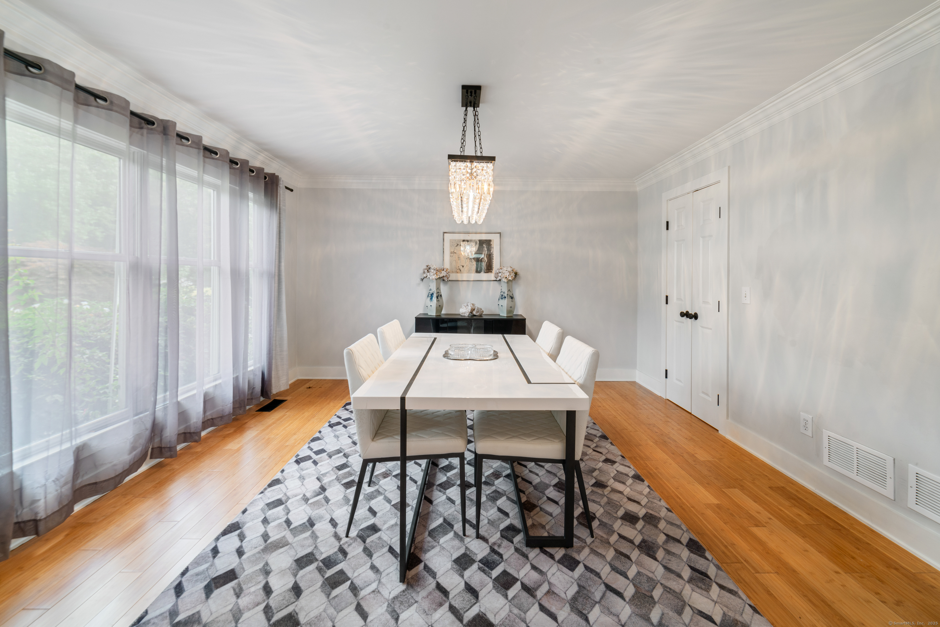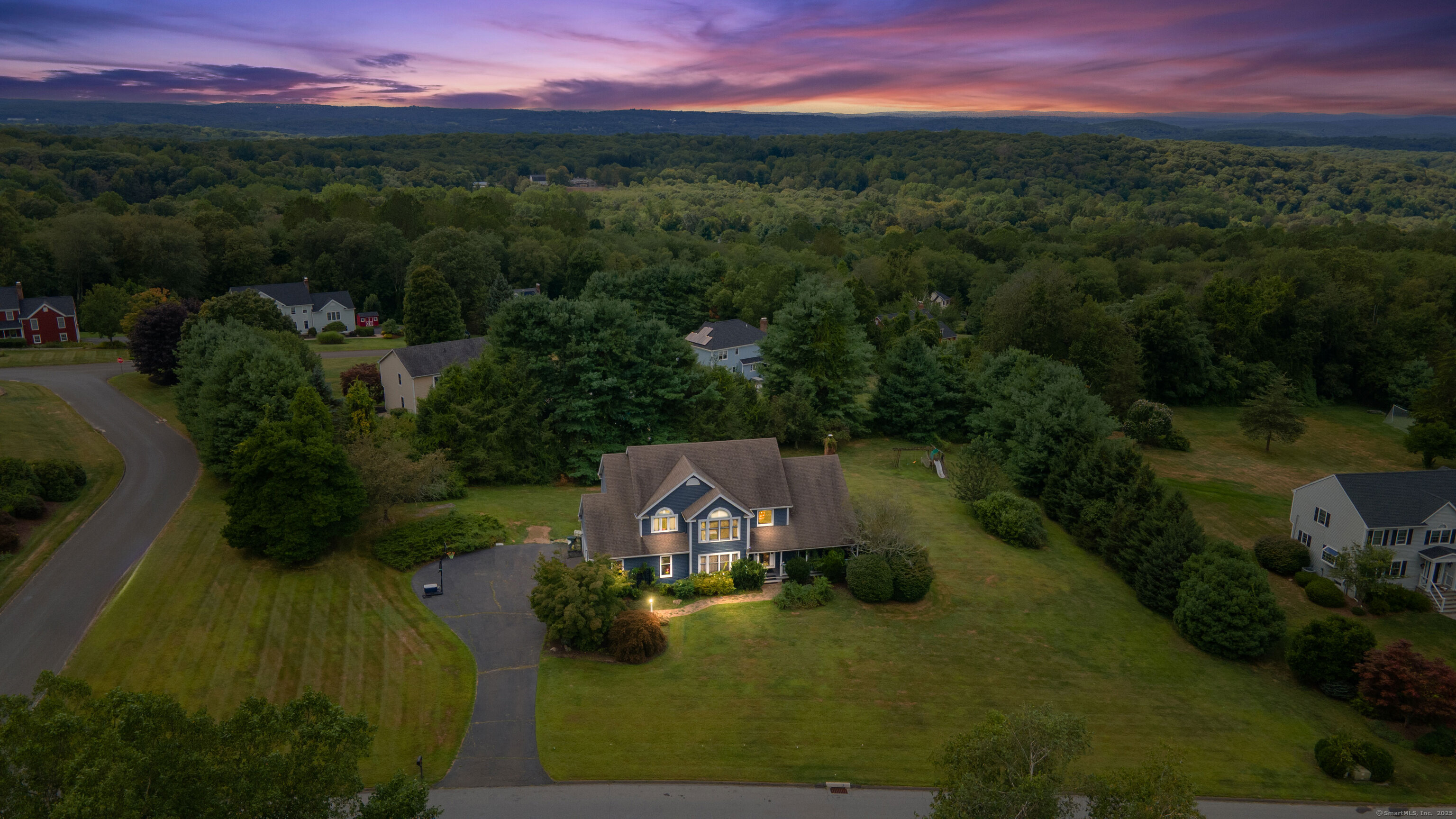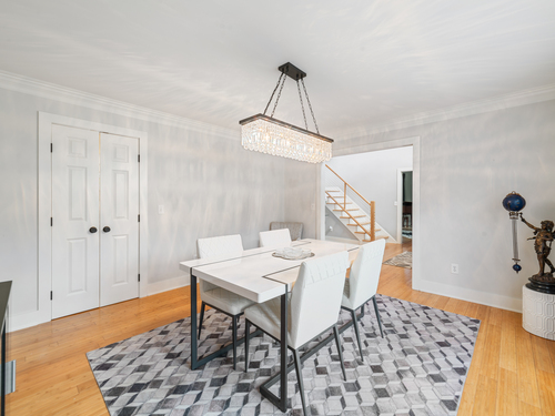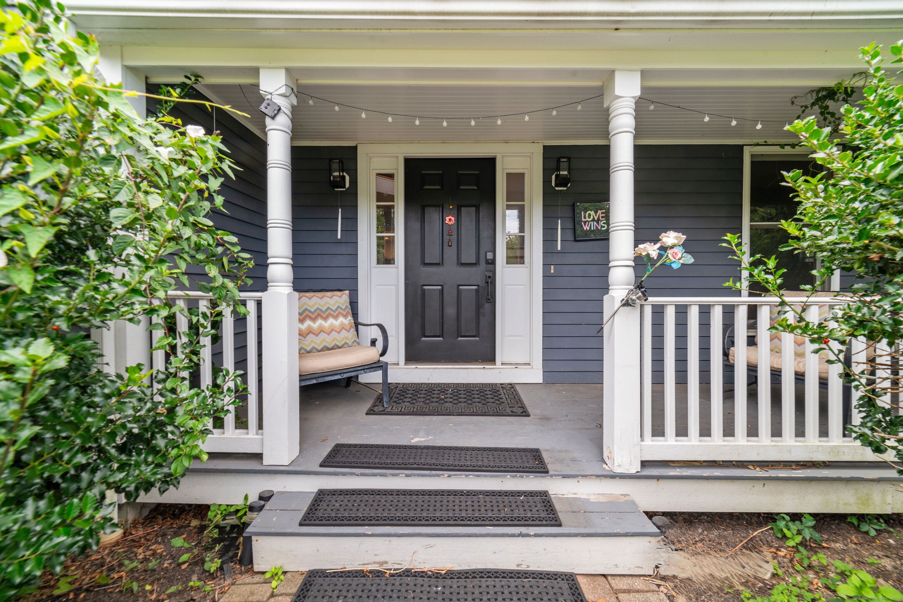 Located in a rural area within Newtown, Connecticut, this colonial home sits on a level, cleared corner lot. Constructed in 1996, the four-bedroom, 2.5-bath residence has been updated with modern aesthetics. The first floor features an open floor plan, with a kitchen equipped with an island, a dining area, a large picture window above the sink, and stainless Kitchen Aide appliances, including a wall oven and microwave. Quartz countertops and contemporary cabinetry are featured in the kitchen. The kitchen flows into the family room. A dining room, and study, are also located on the first floor.The kitchen opens onto a deck with an awning. Bamboo engineered flooring is installed throughout the home first and second floor. A cable-railed stairway with a chandelier lift leads to the second floor. The primary bedroom has ample natural light and includes a walk-in closet, a walk-in shower, and a soaking tub. Three additional bedrooms and a full bath with a walk-in shower are also located on the second floor. Additional features of the property include a dog fence, a generator, a water filtration system, and a propane-fueled continuous water heater. The home also offers a partially finished basement, an electric dog fence and a electric charger for your car in the garage.